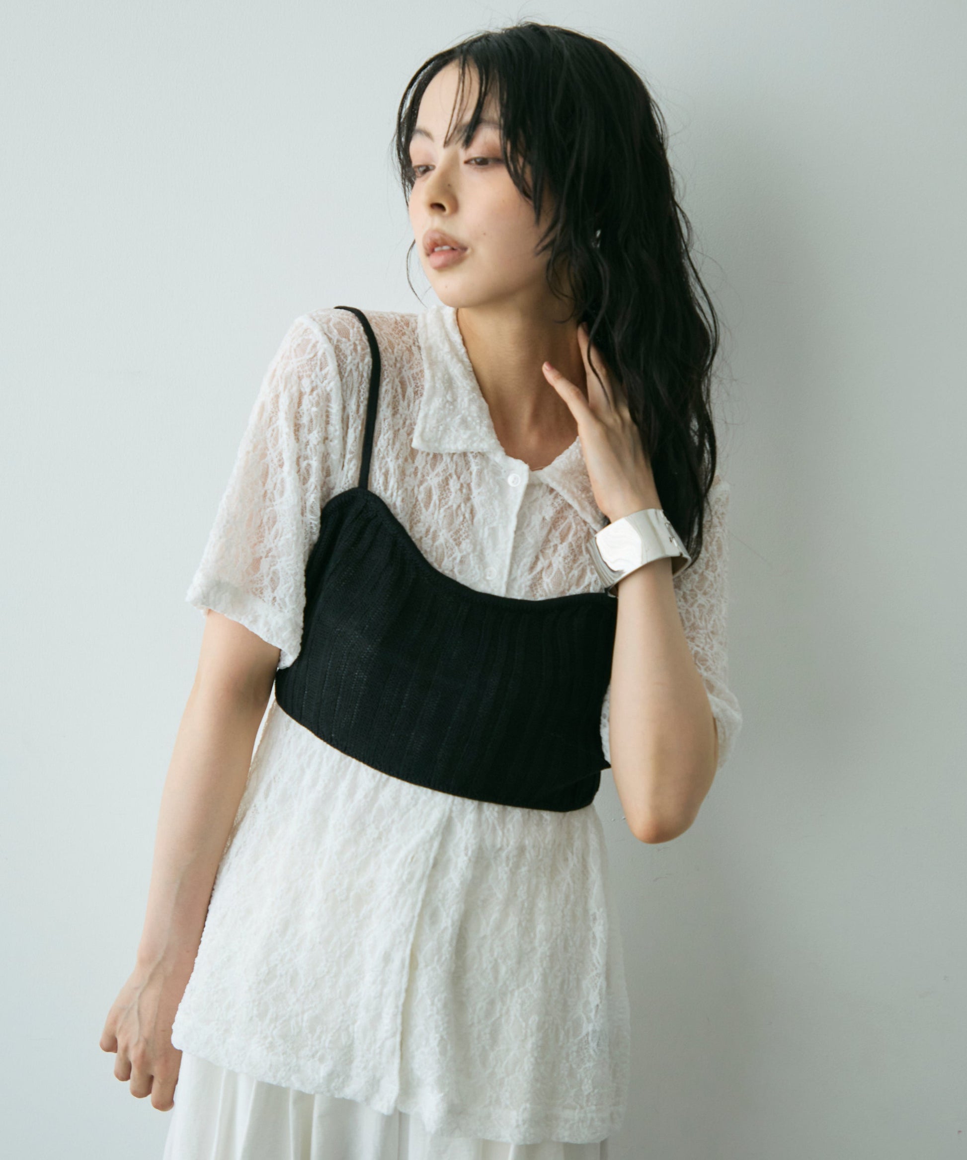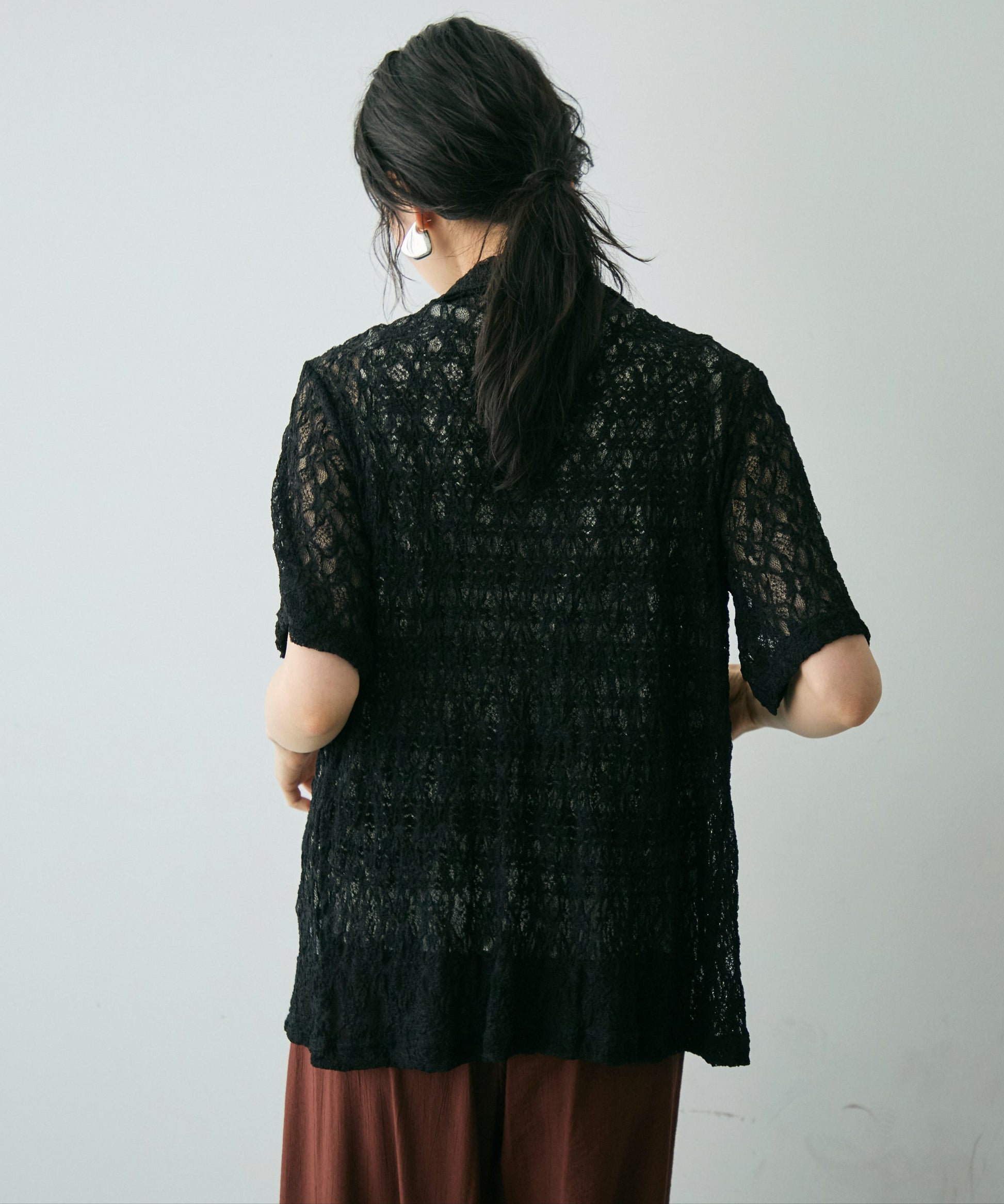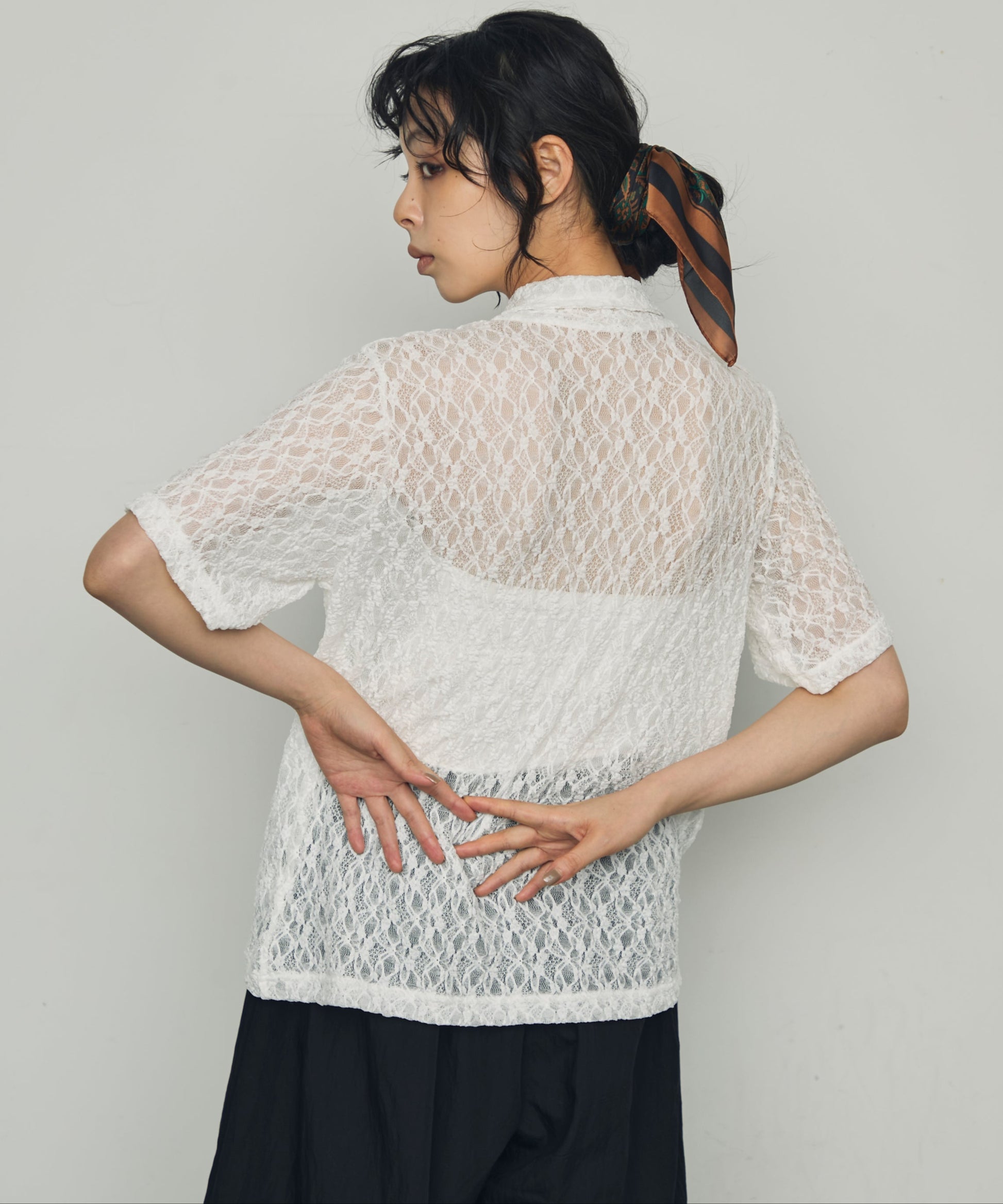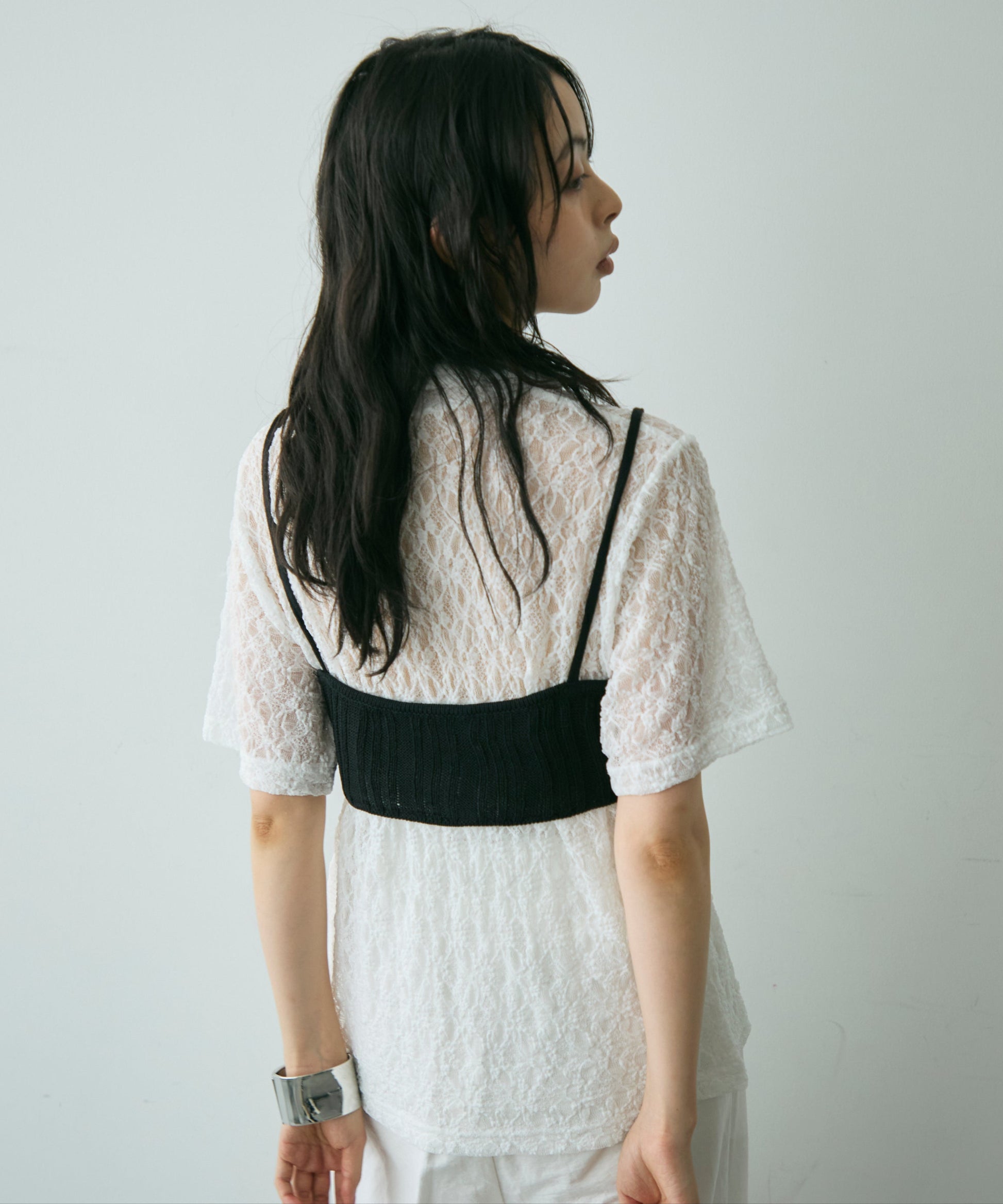 伸縮性のあるレース生地を使用したベーシックシャツ。