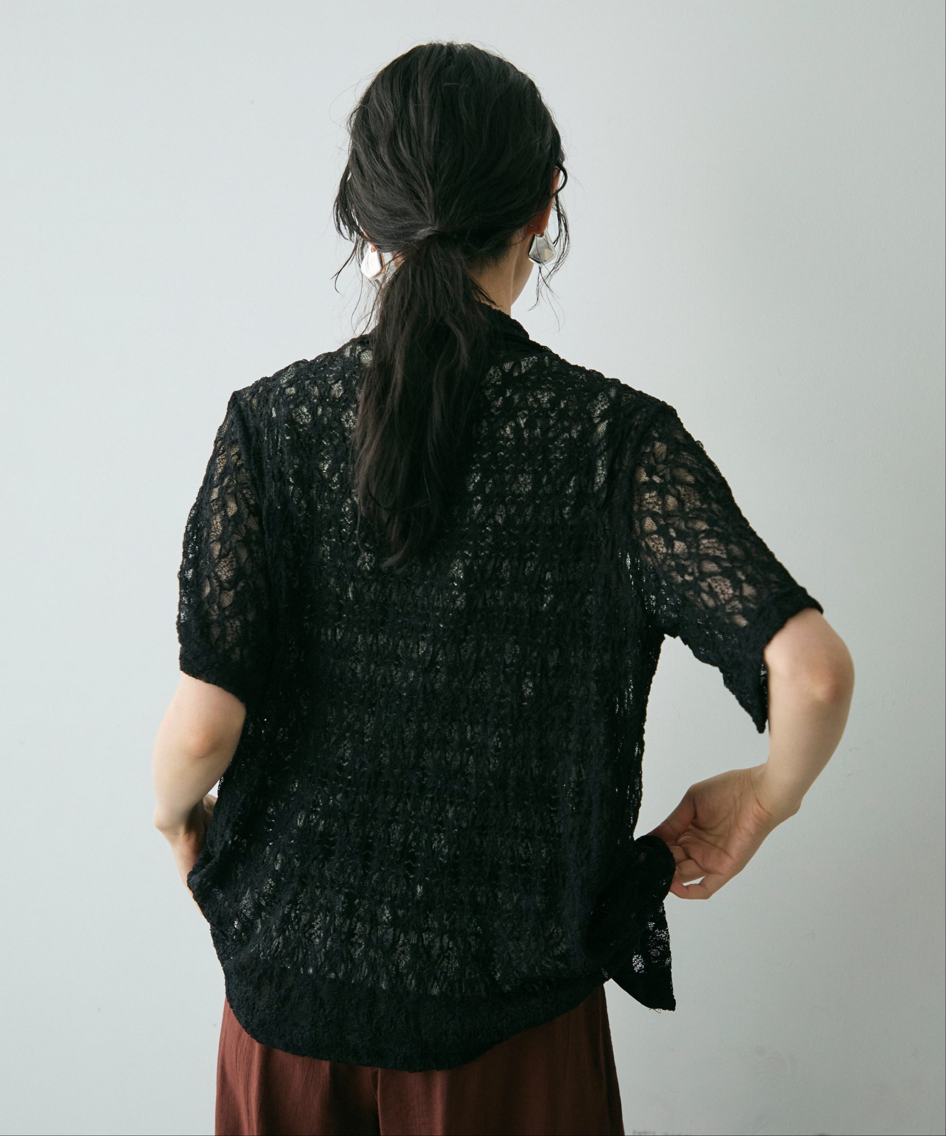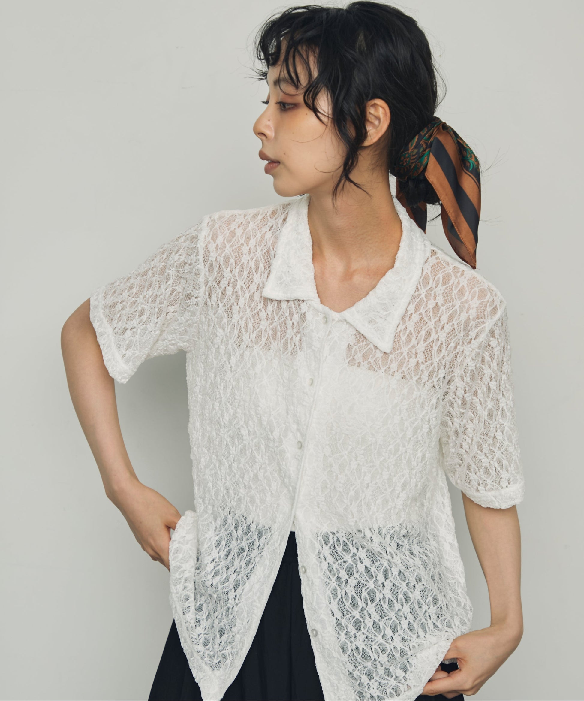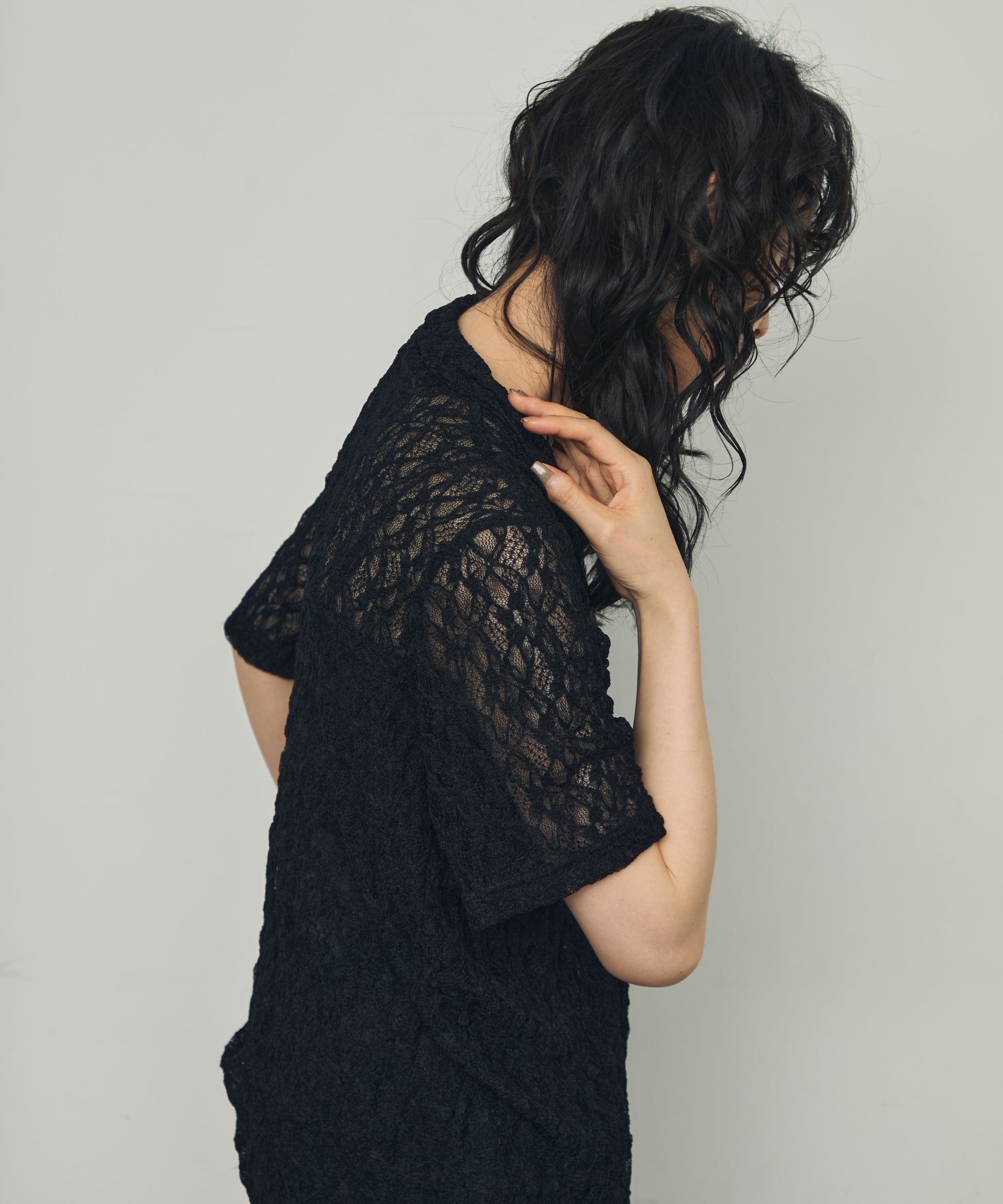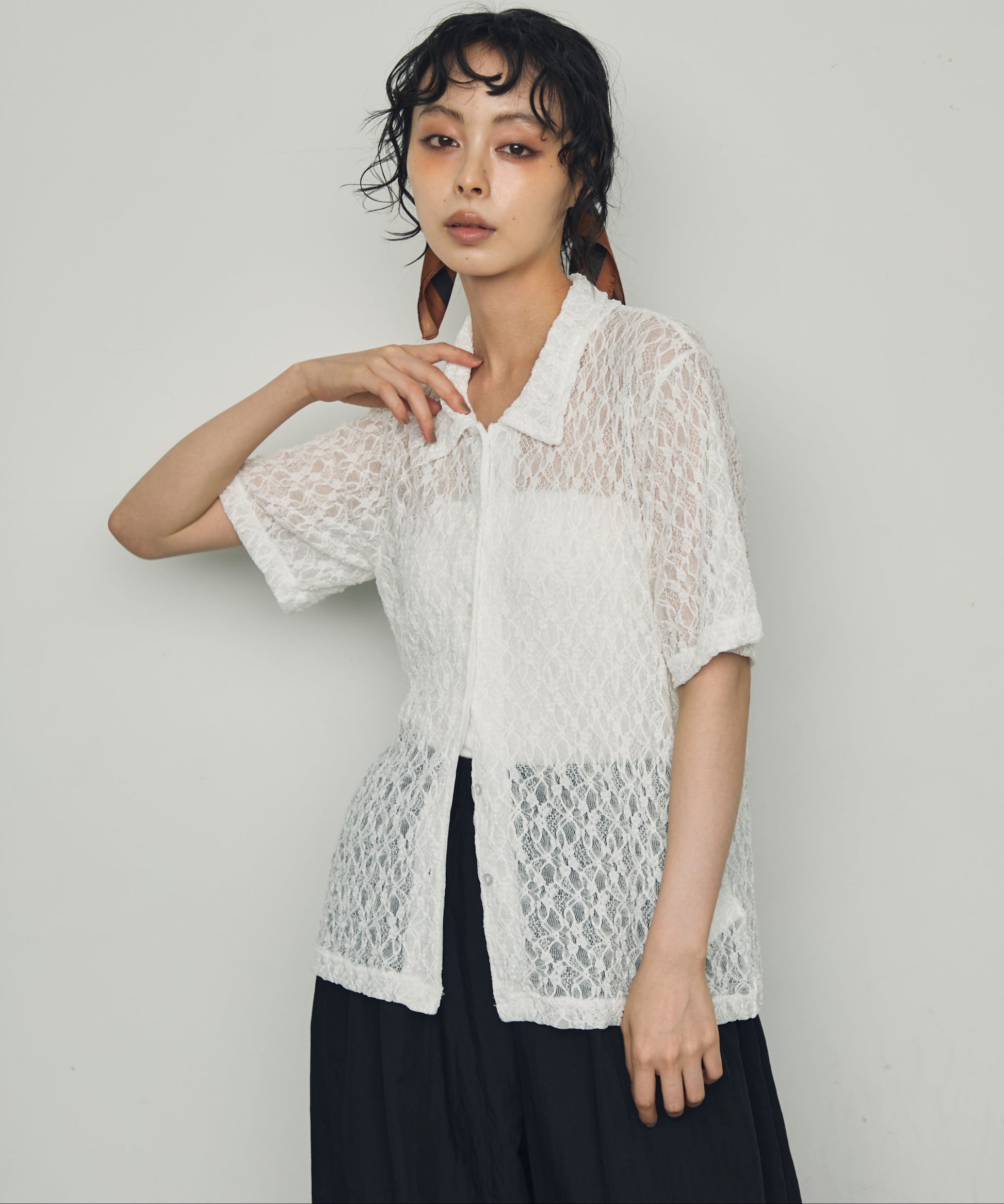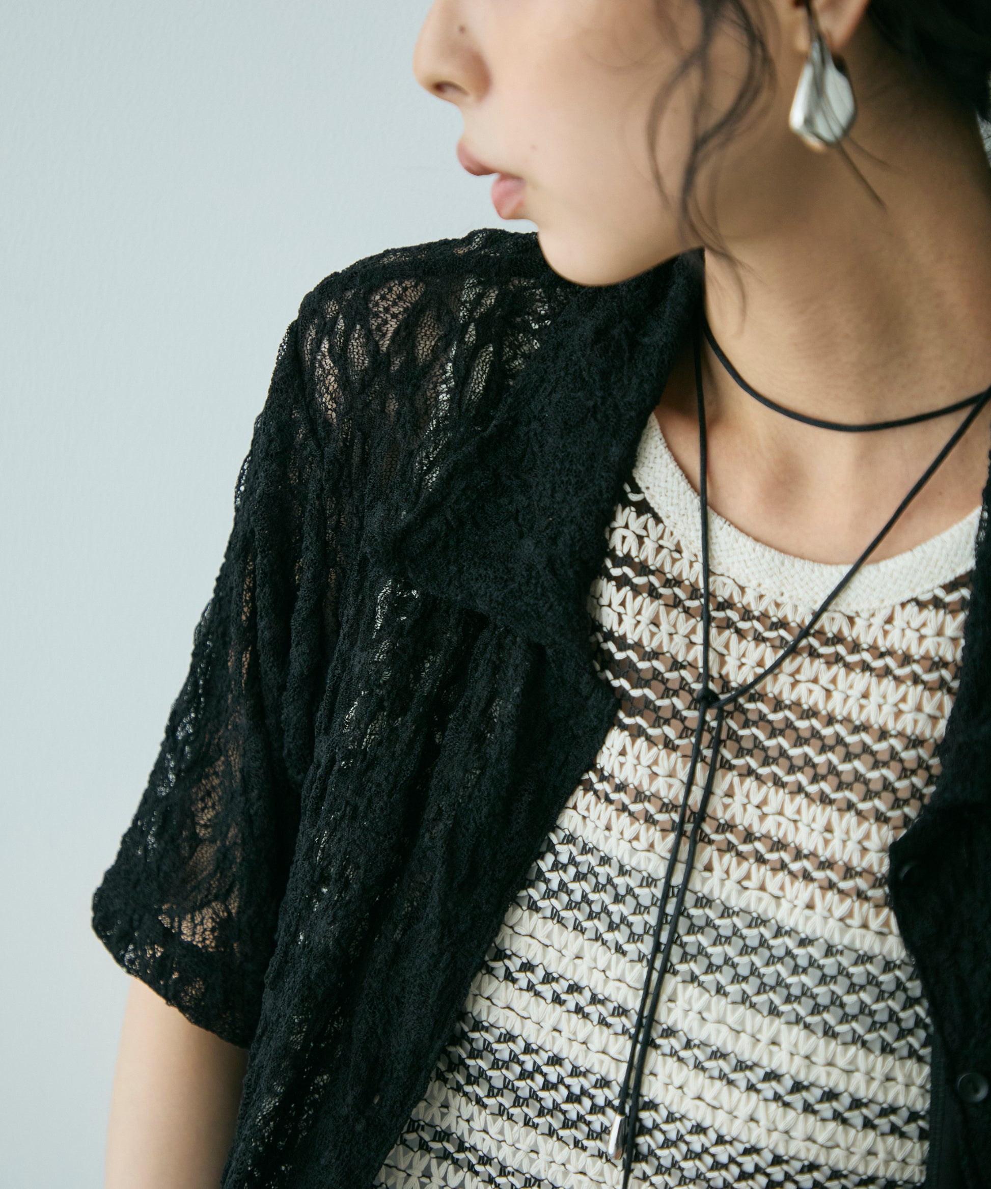 伸縮性のあるレース生地を使用したベーシックシャツ。