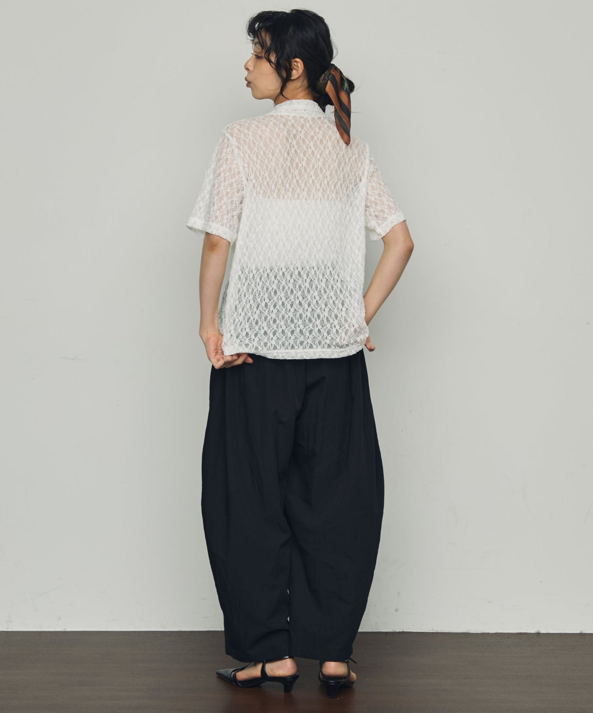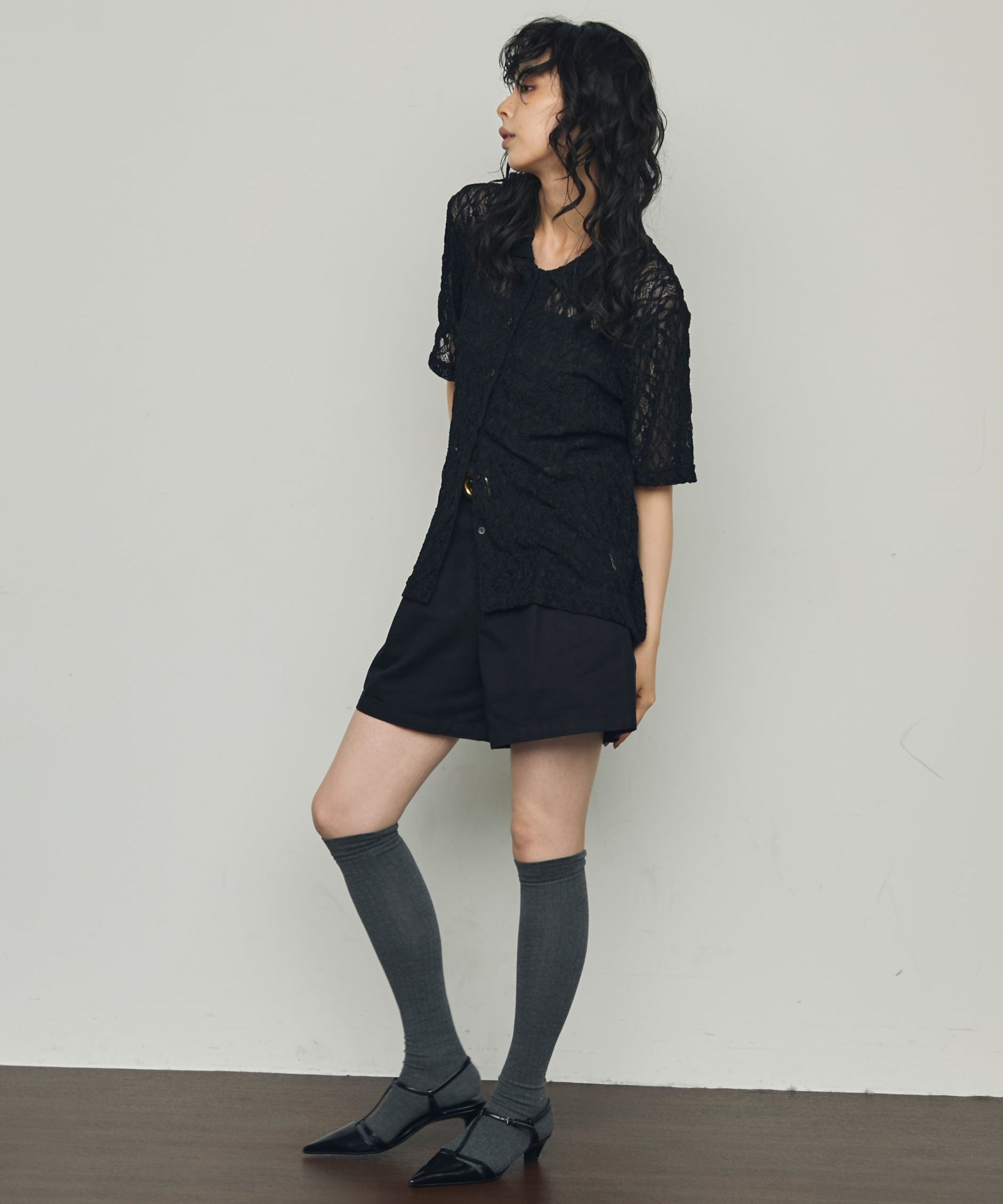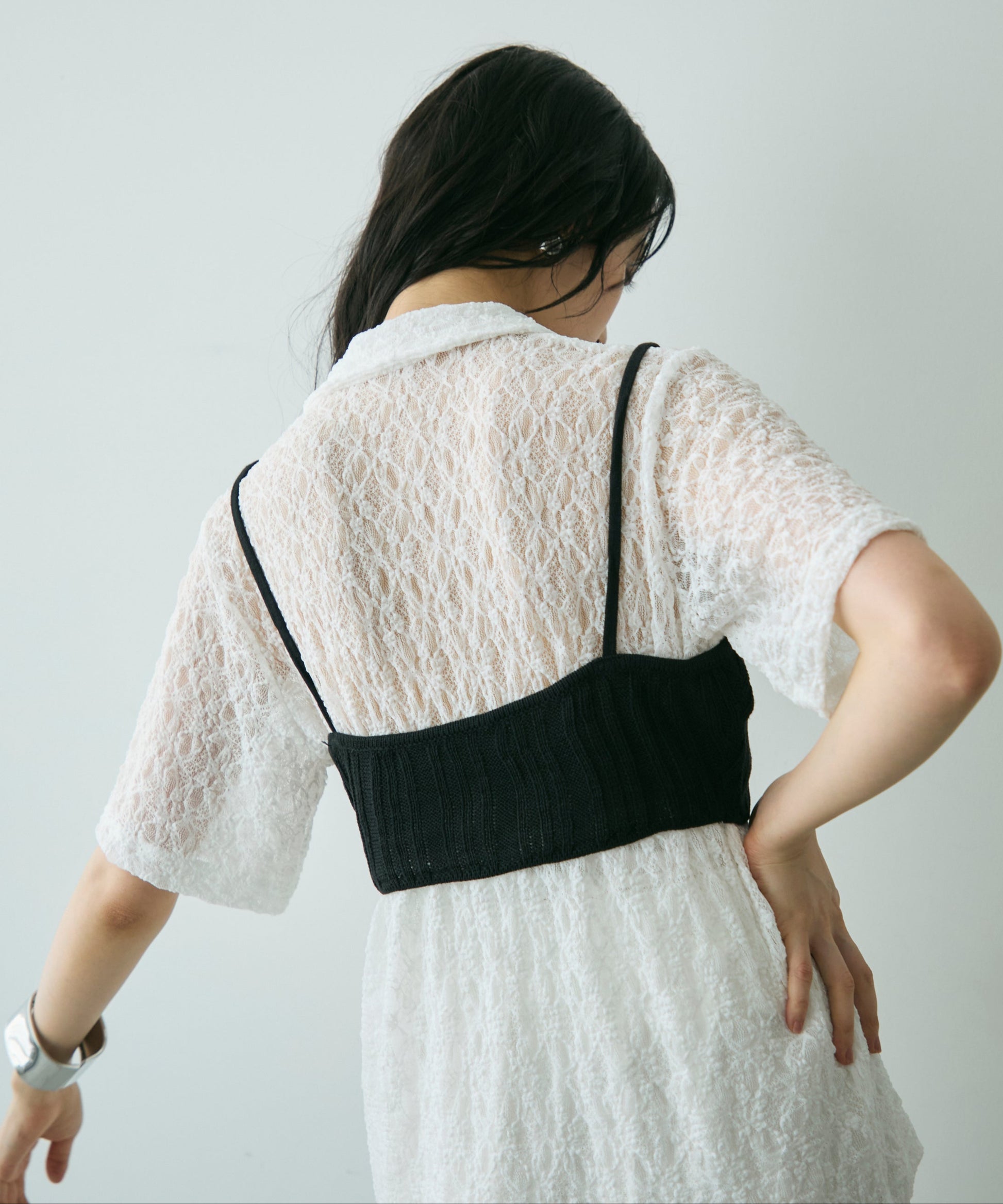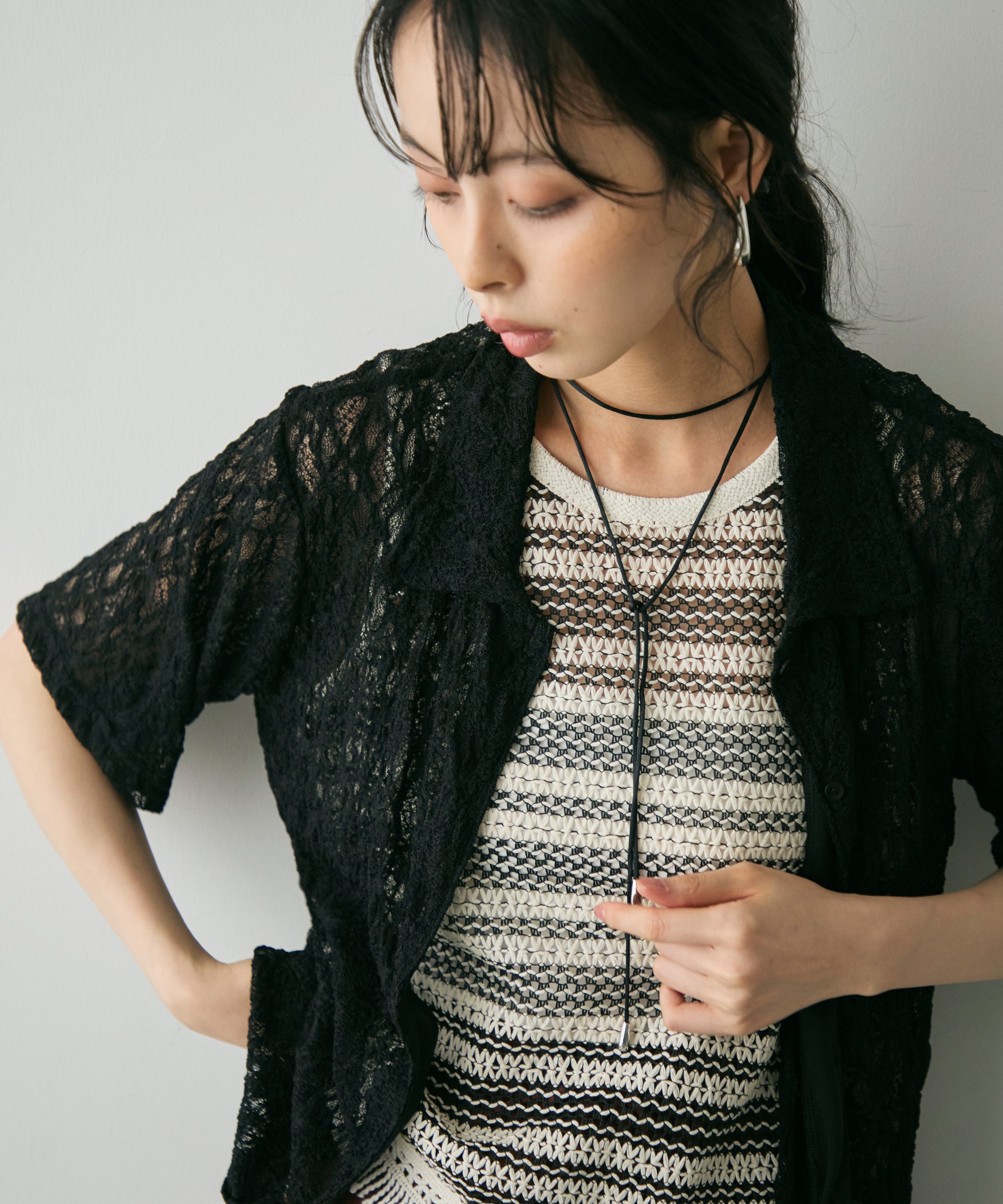 伸縮性のあるレース生地を使用したベーシックシャツ。