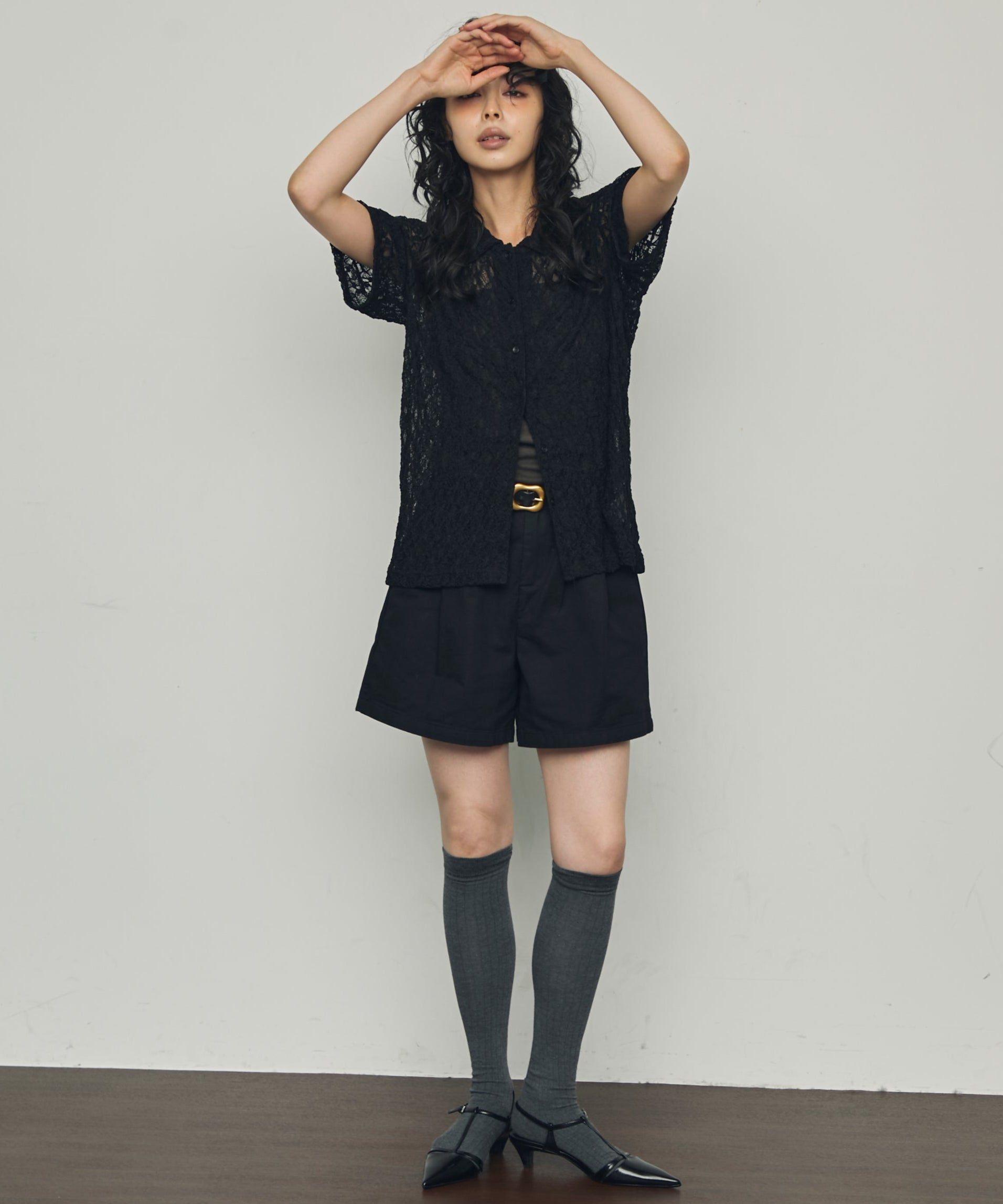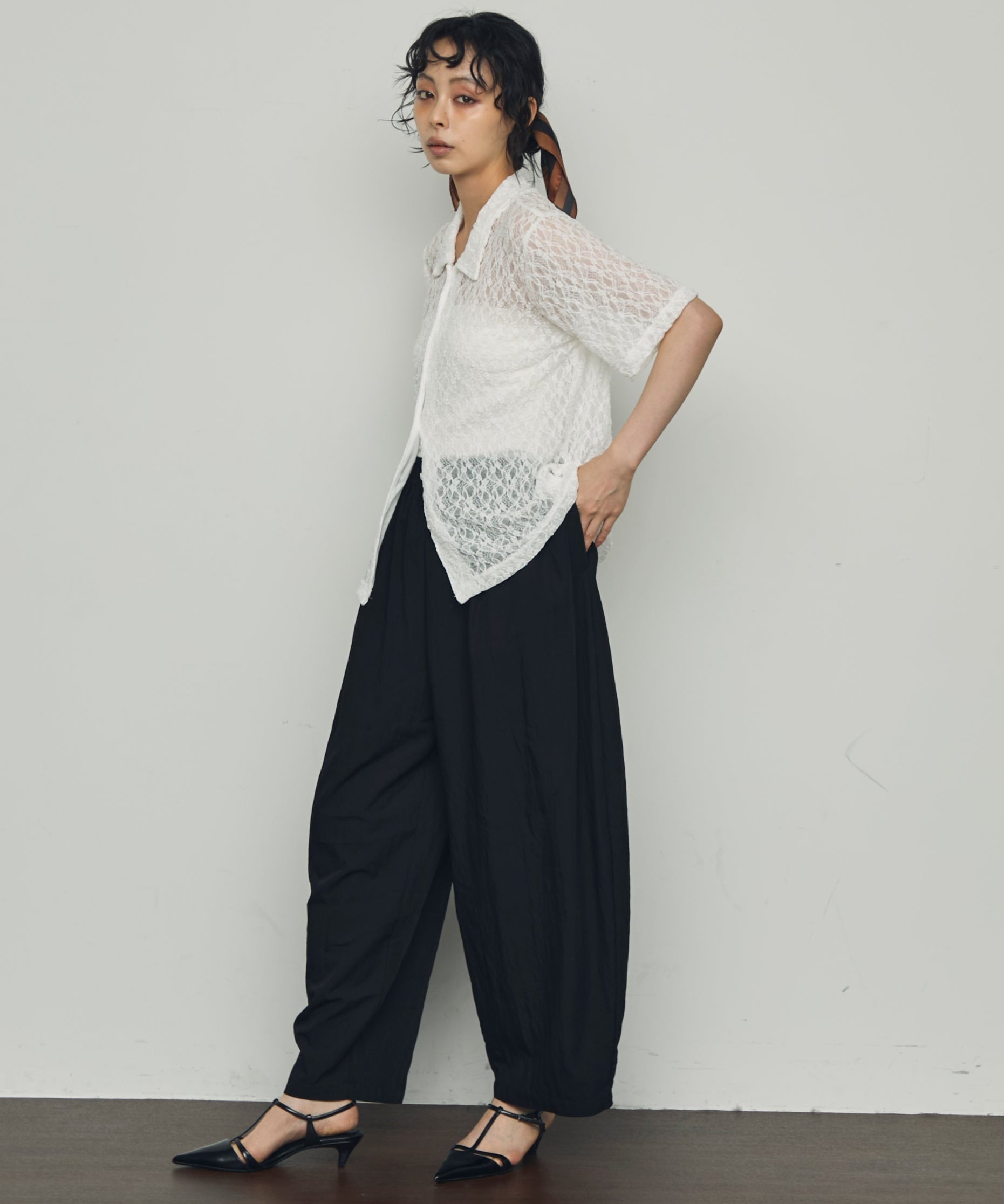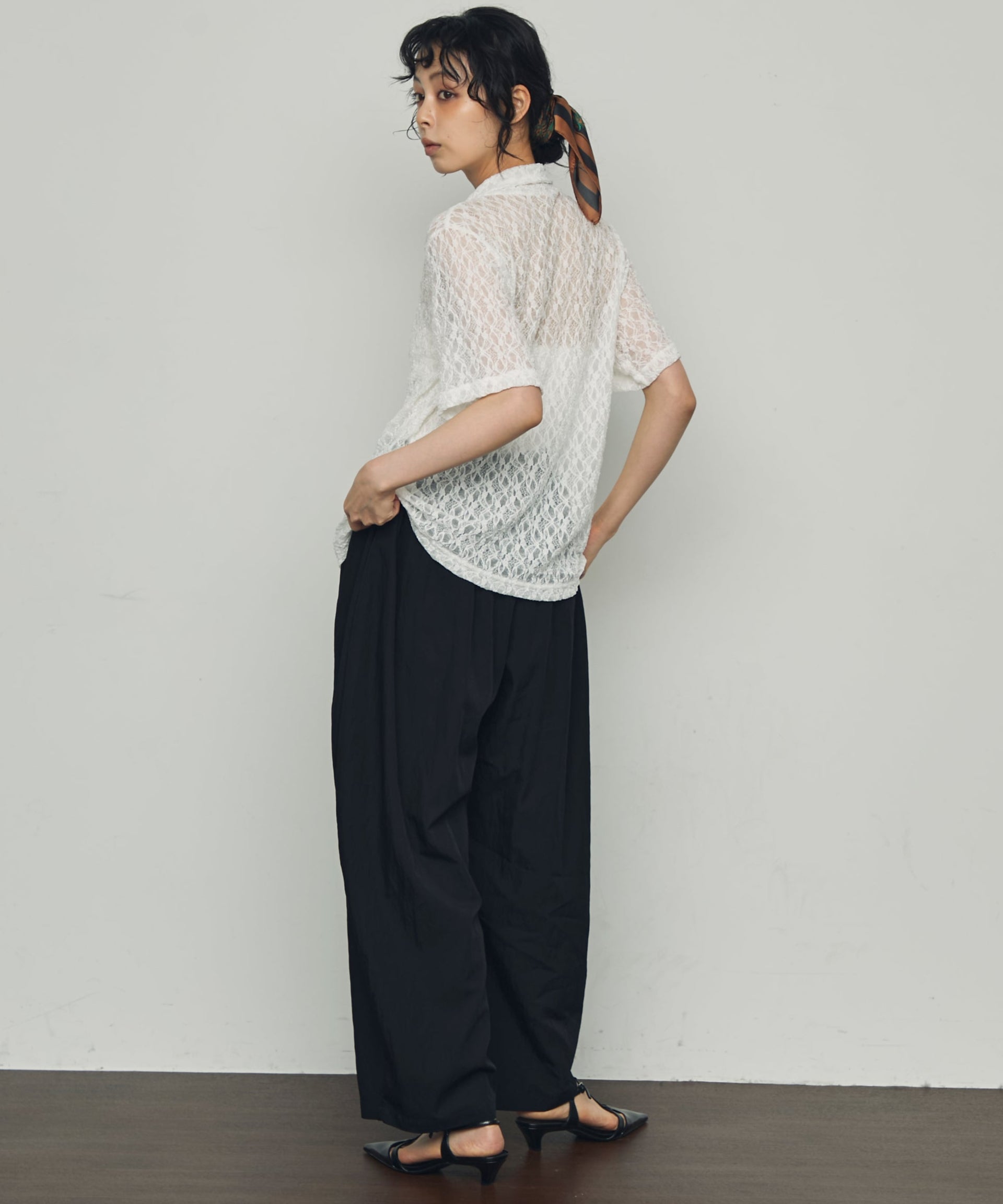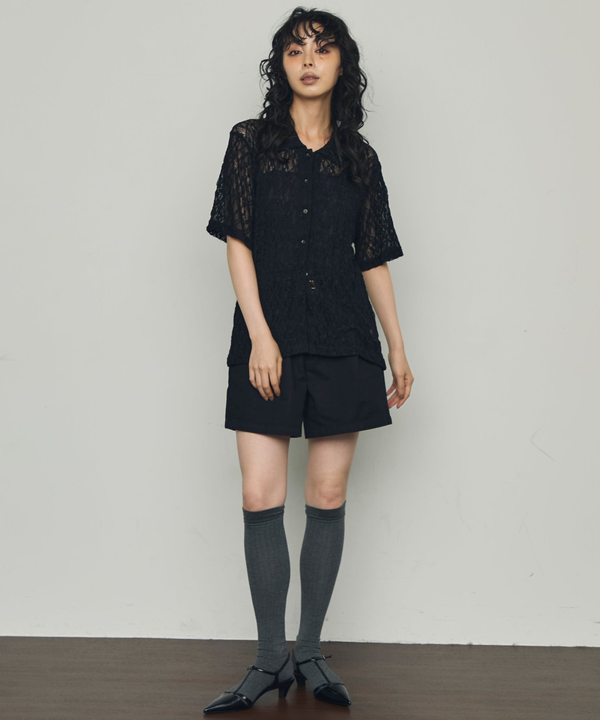 伸縮性のあるレース生地を使用したベーシックシャツ。