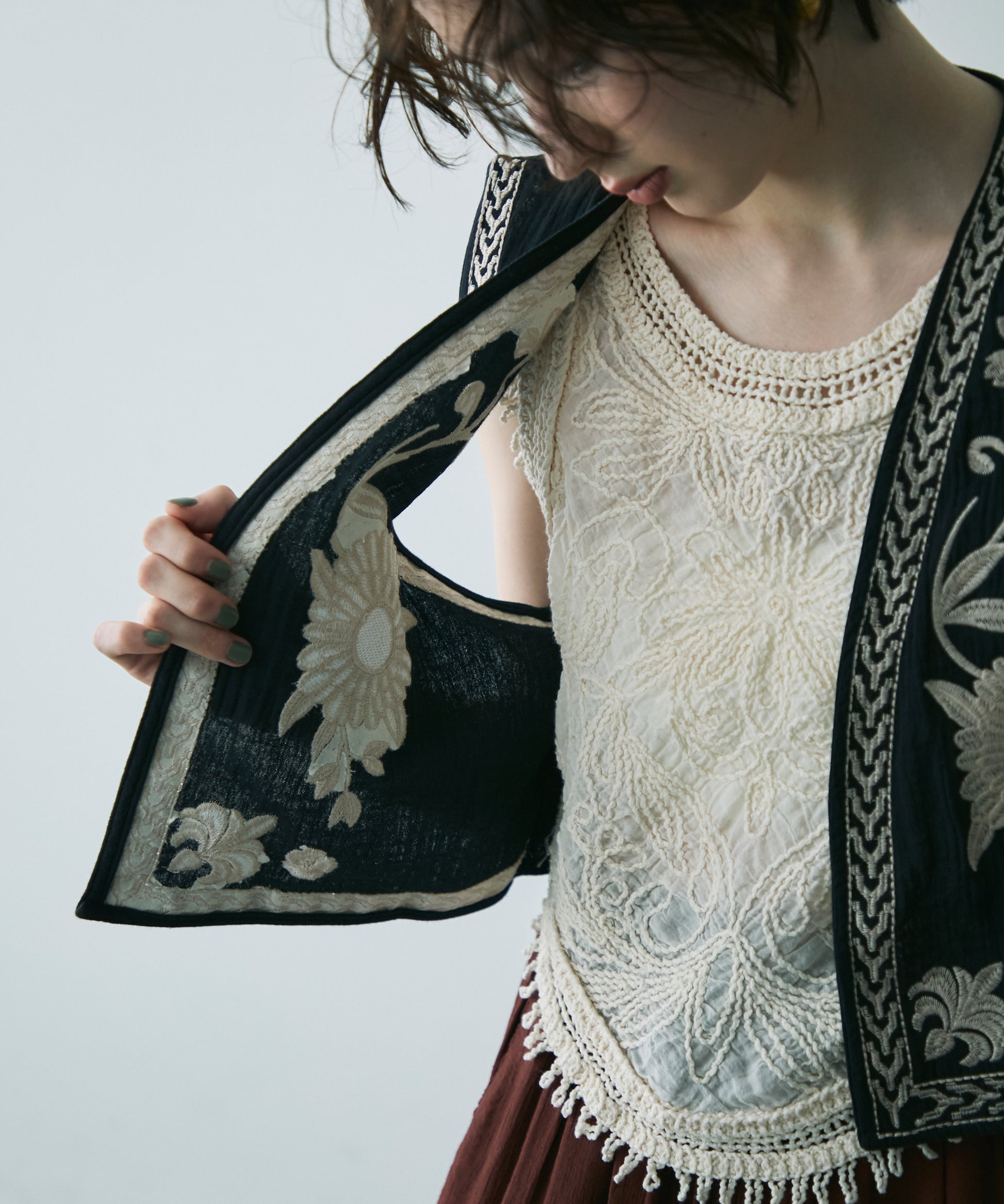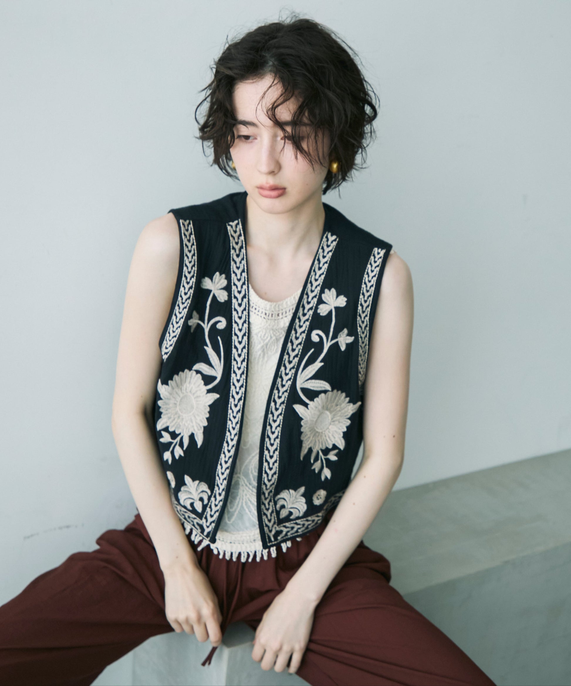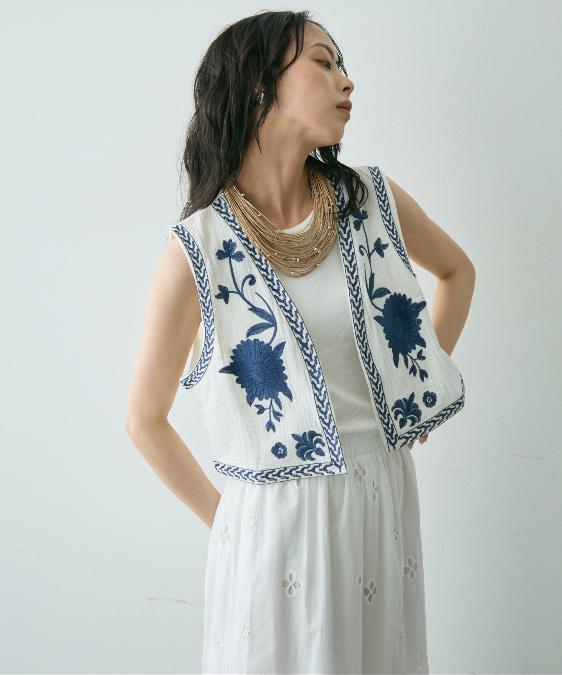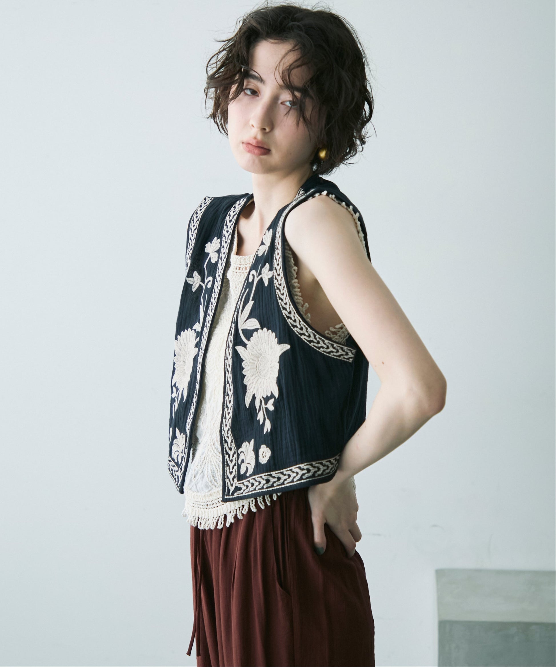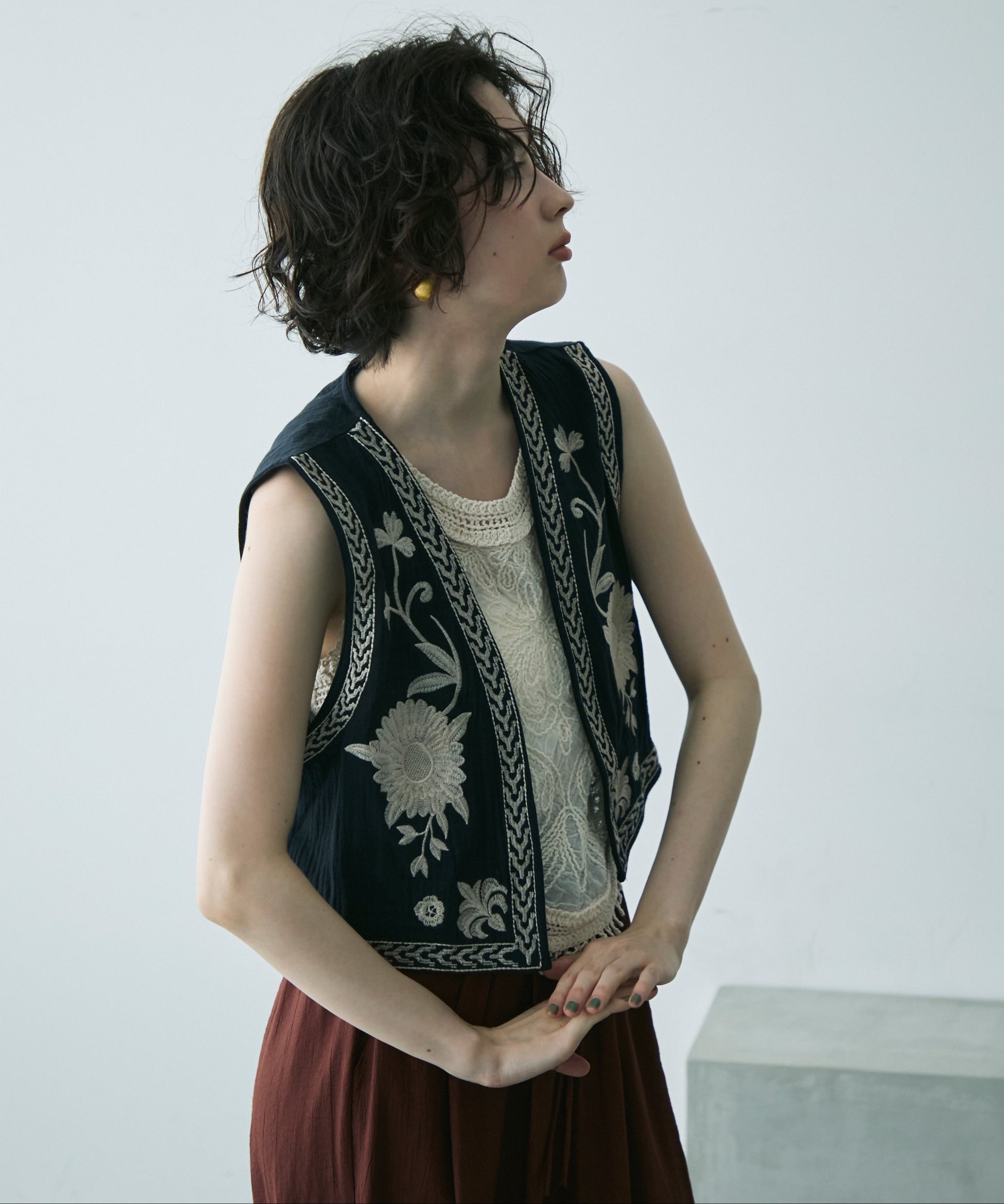 ボタニカルの刺繍が施された、華やかでナチュラルなジレです。