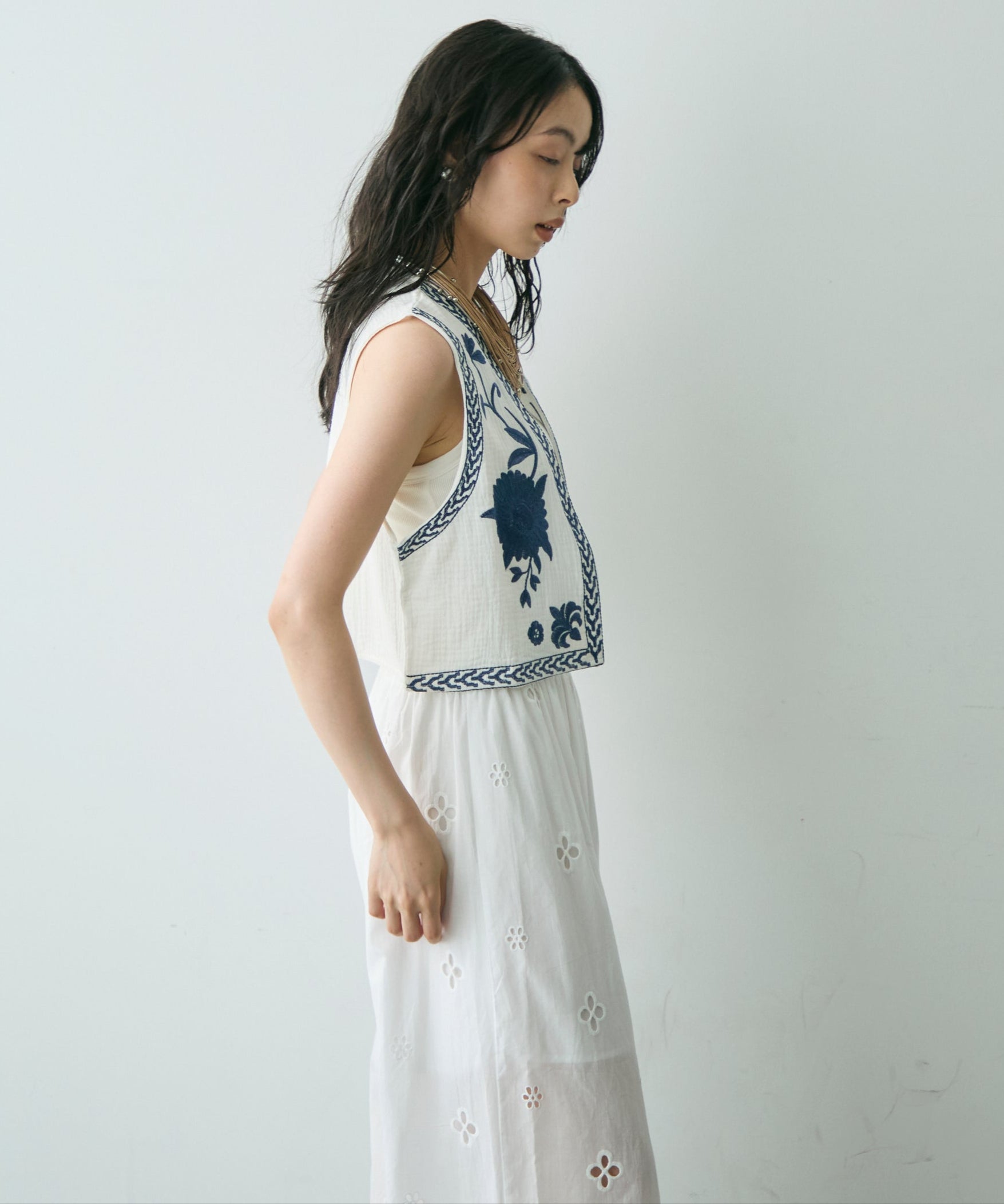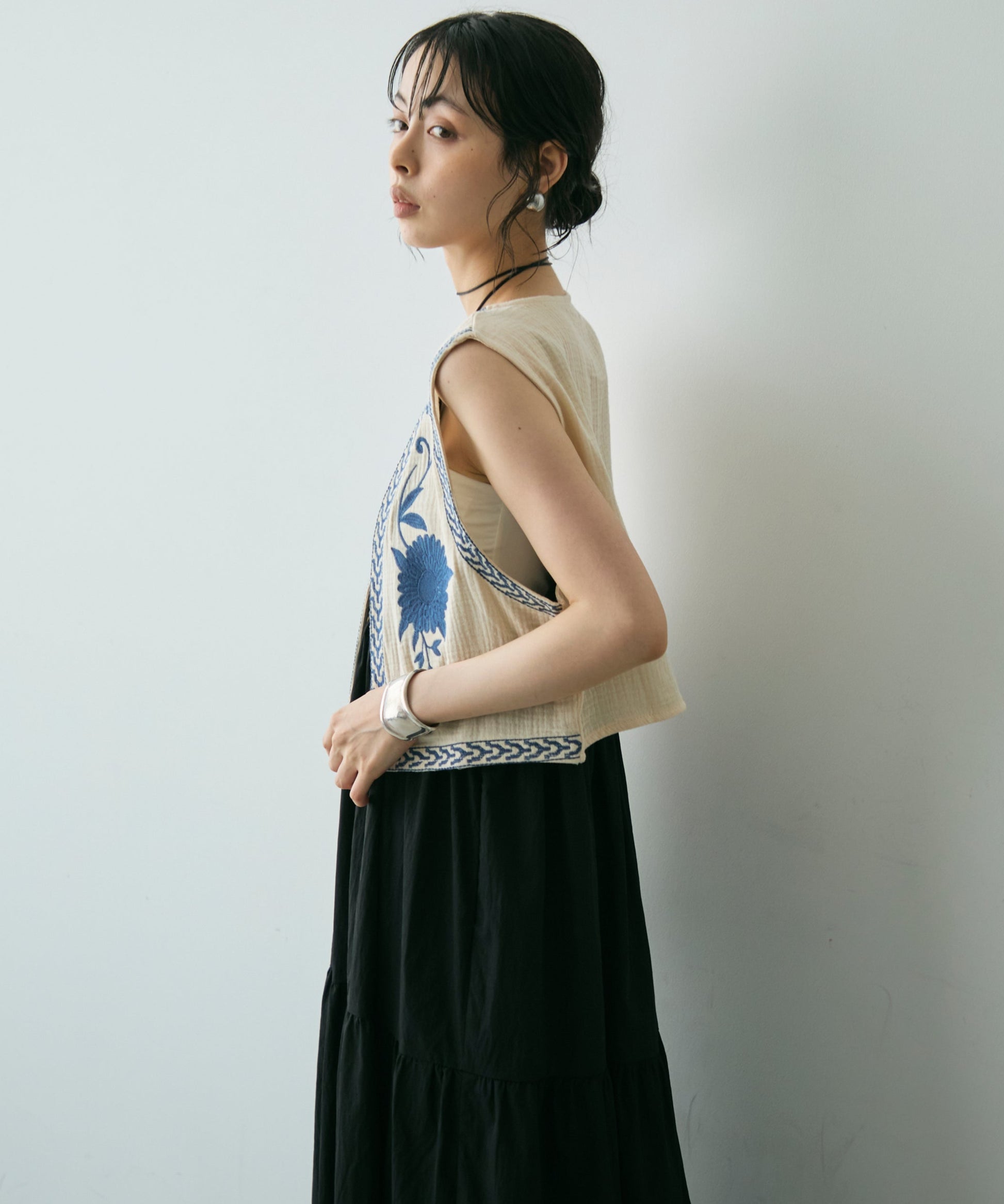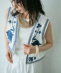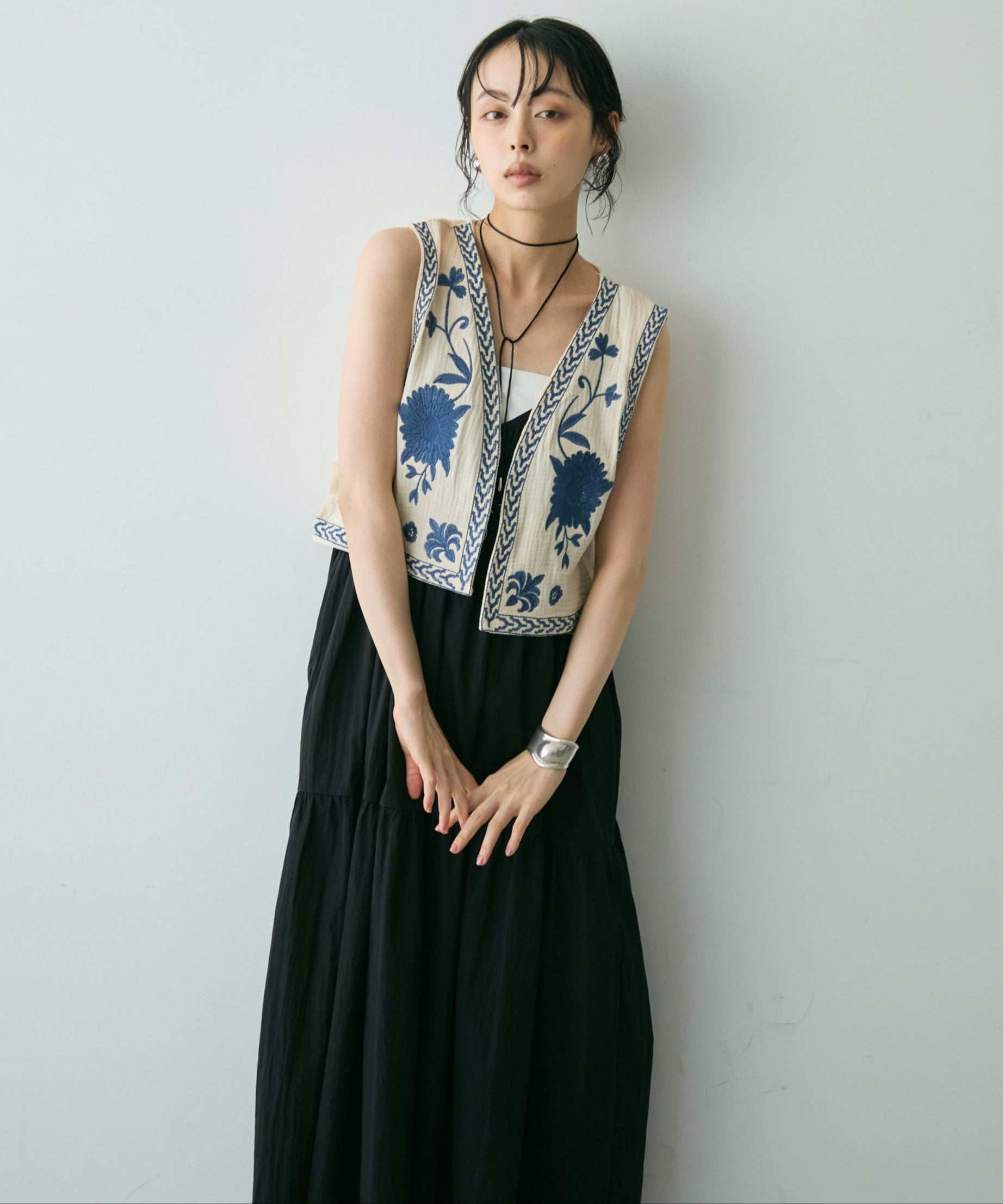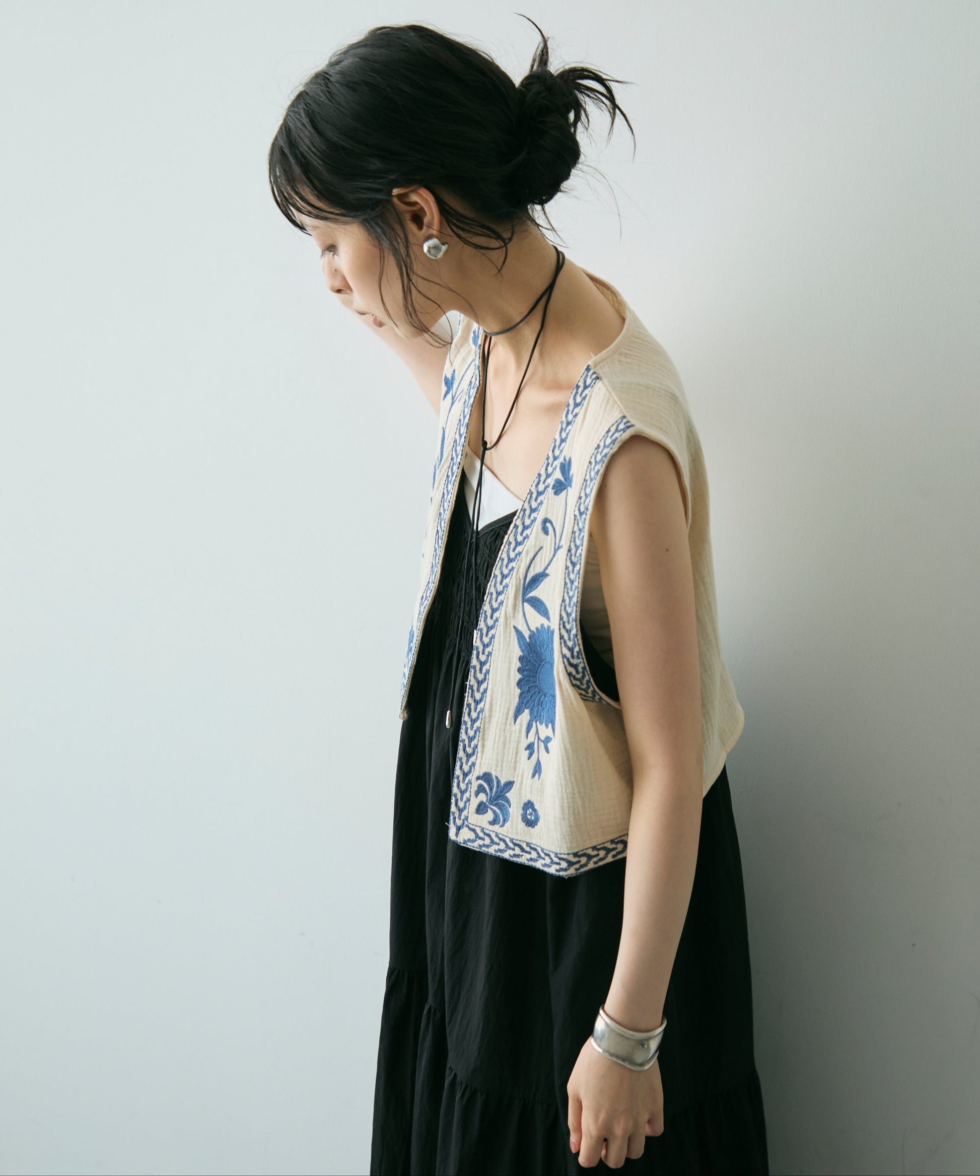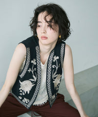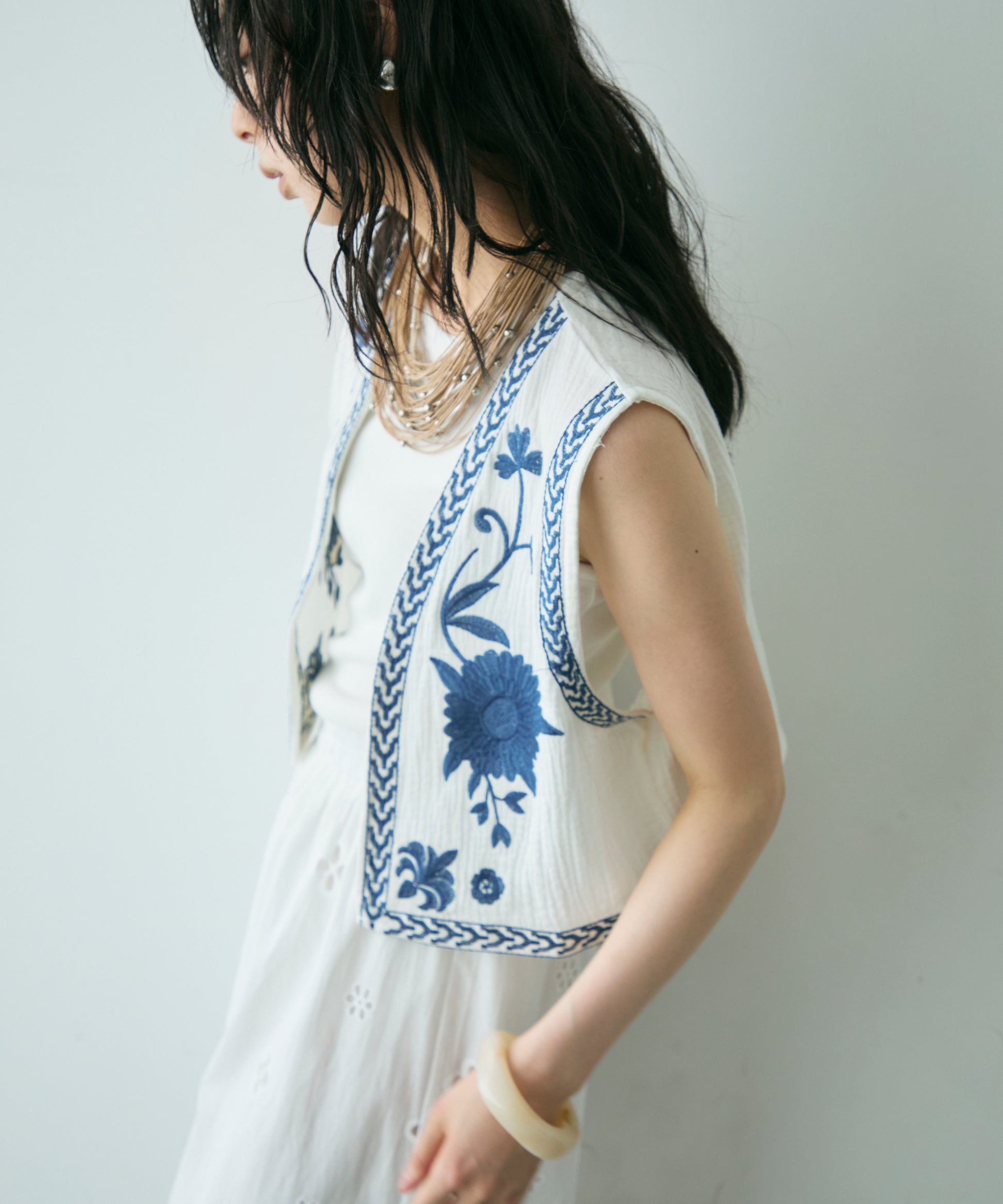 ボタニカルの刺繍が施された、華やかでナチュラルなジレです。