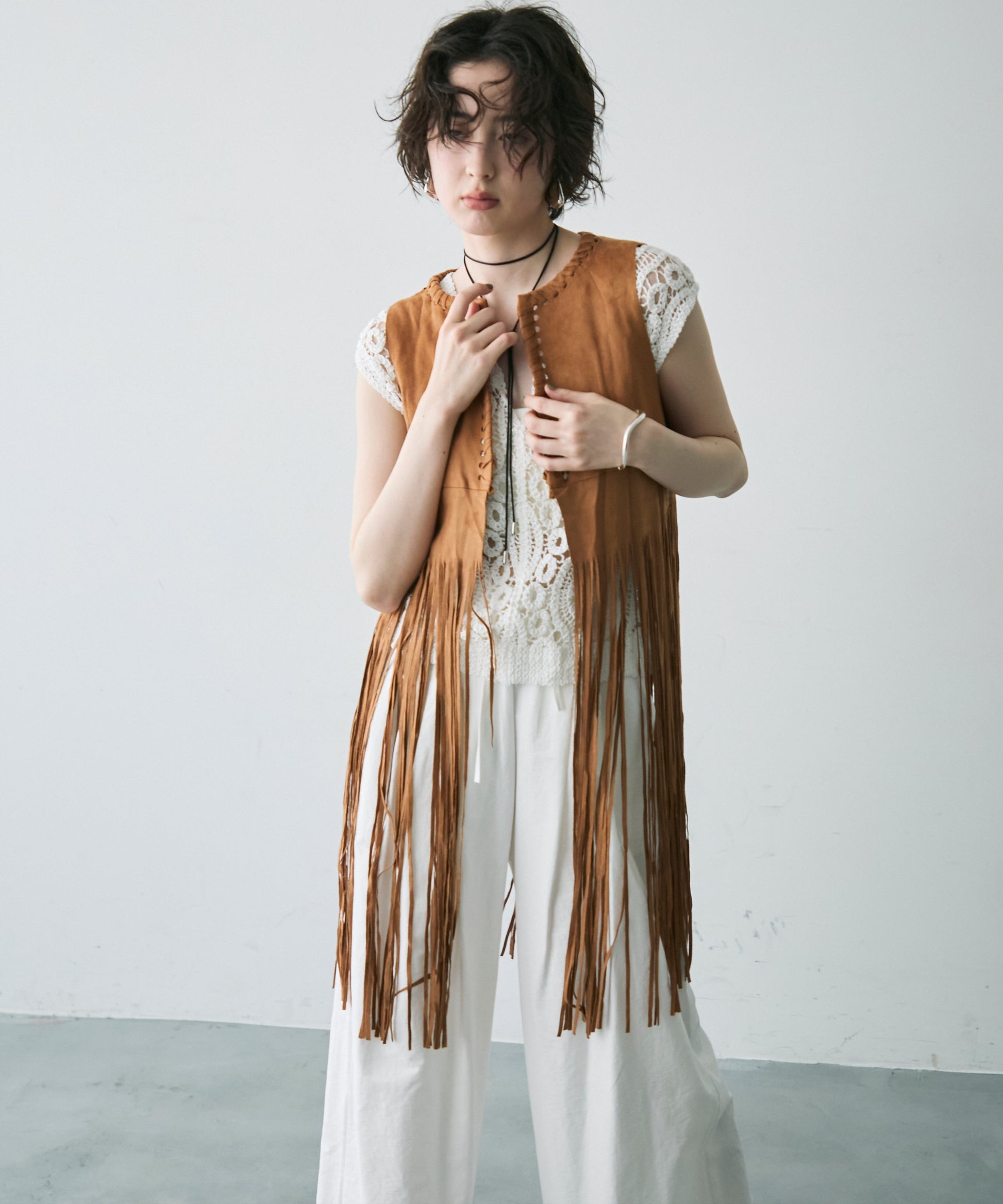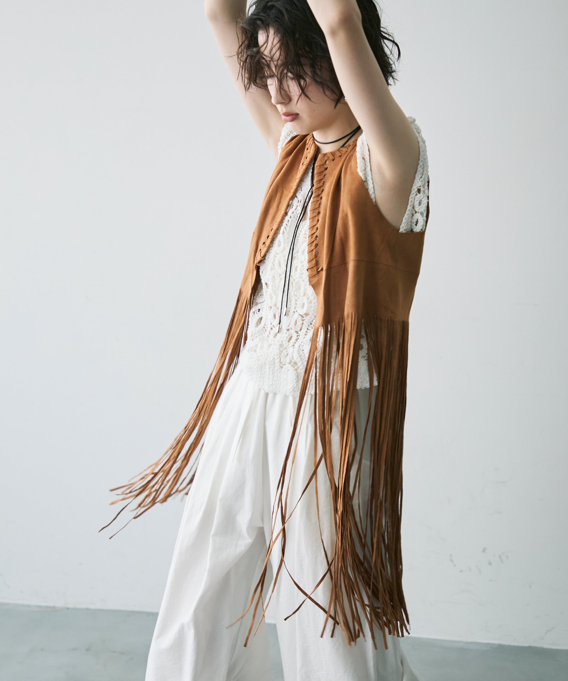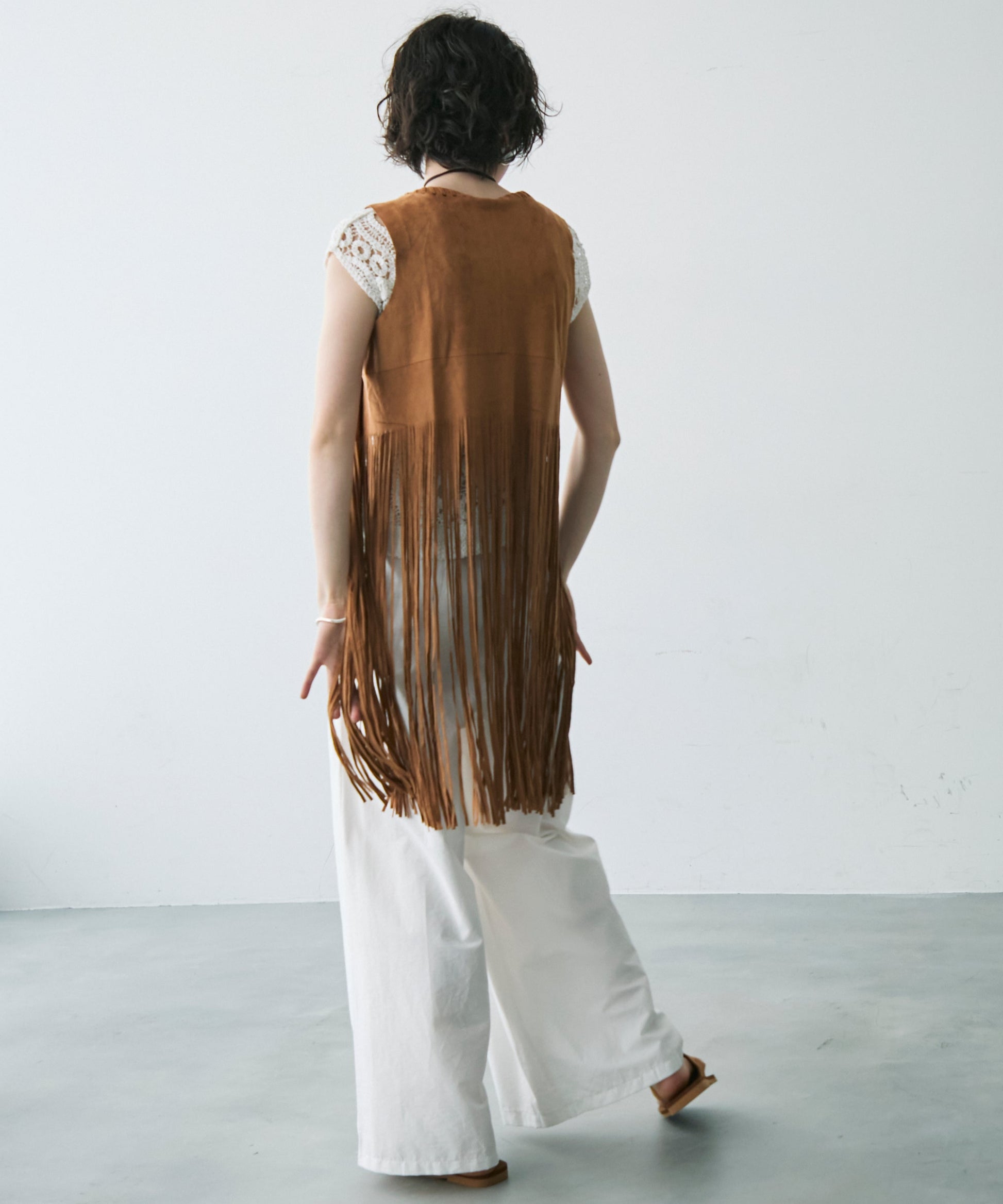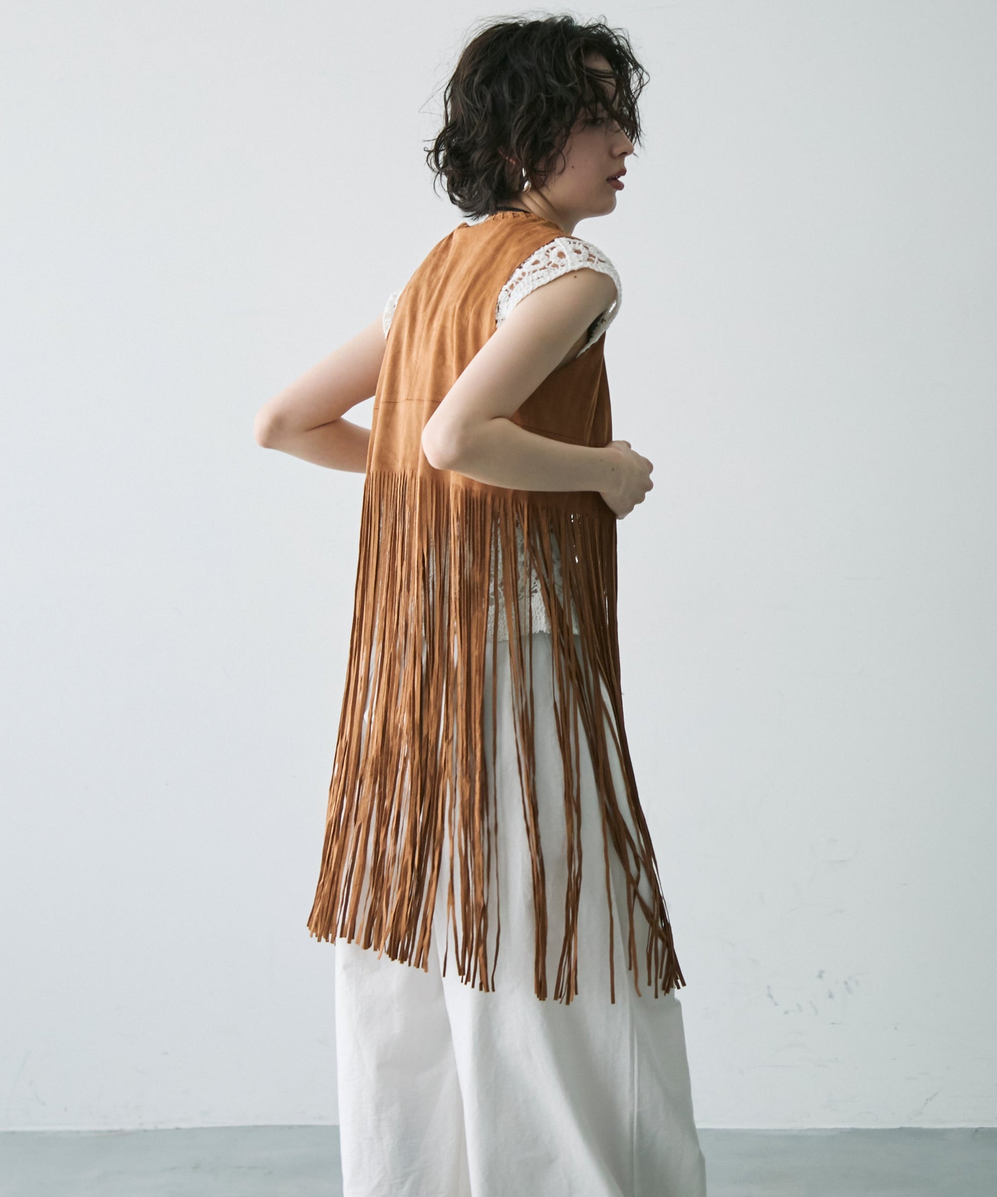 ロングフリンジがたっぷりのスエード調のフリンジジレ。
