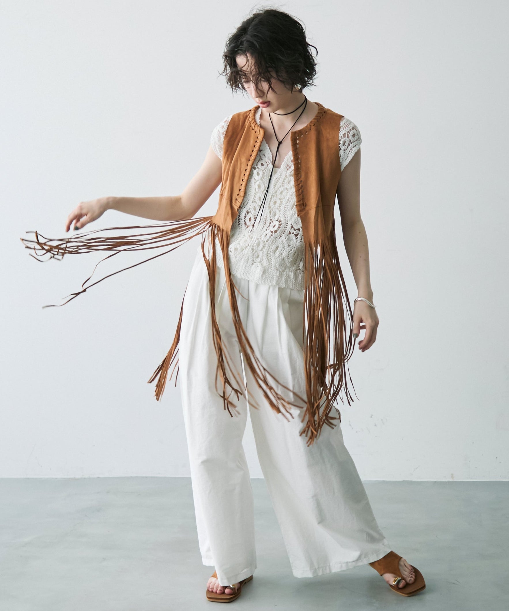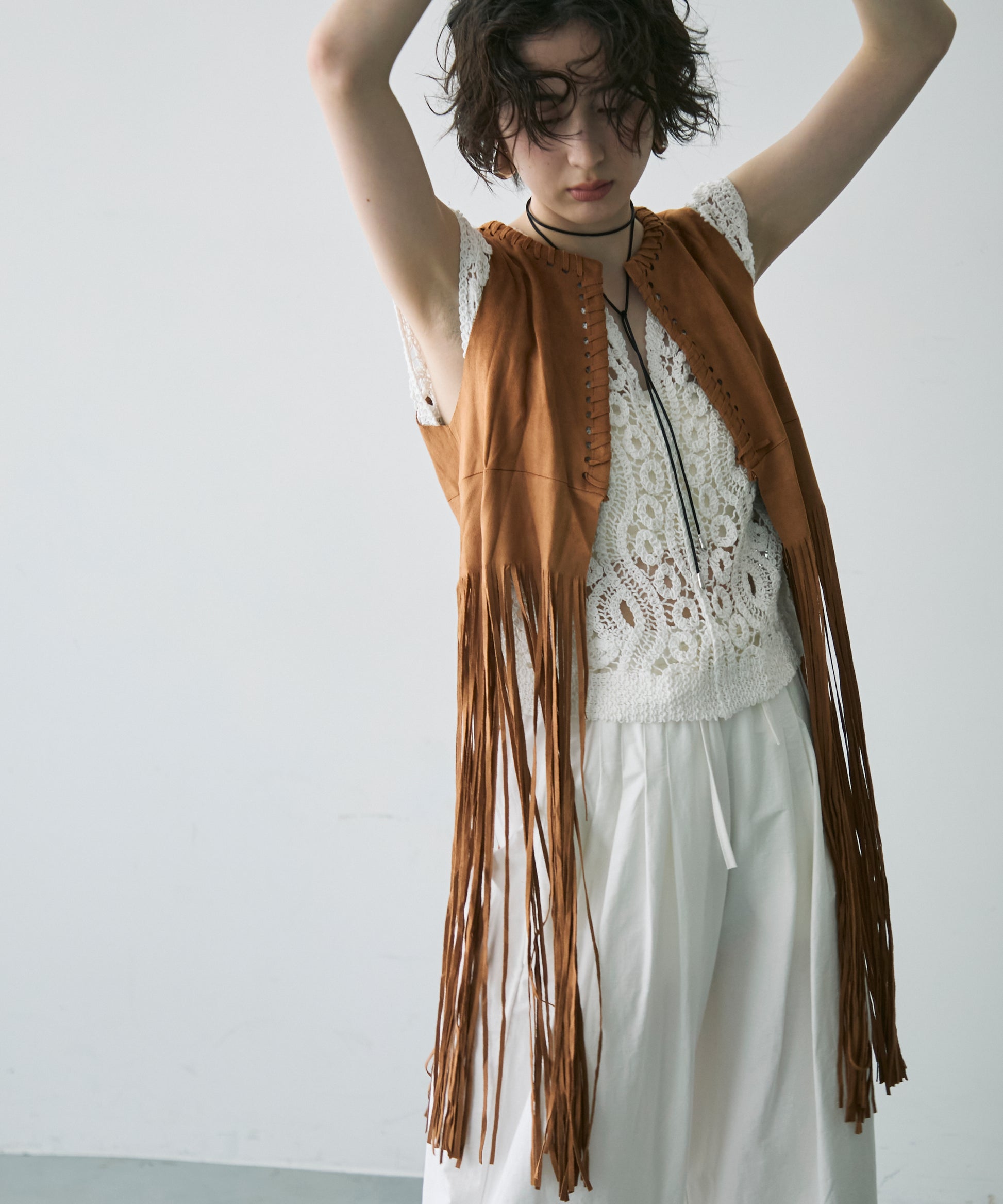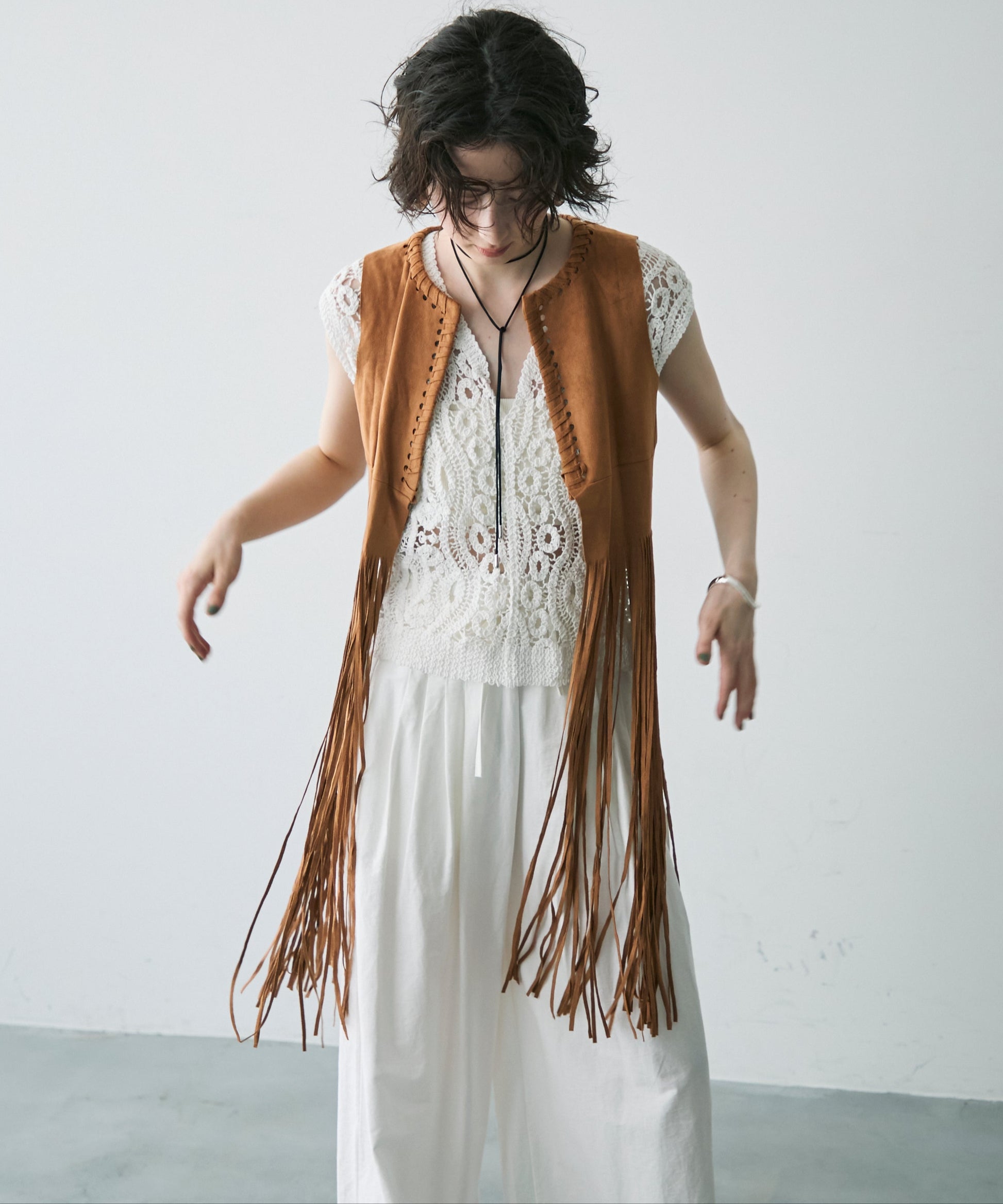 ロングフリンジがたっぷりのスエード調のフリンジジレ。