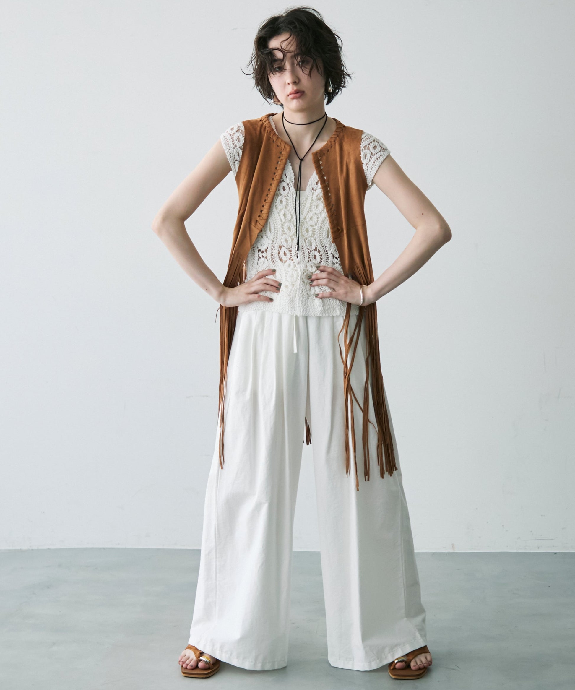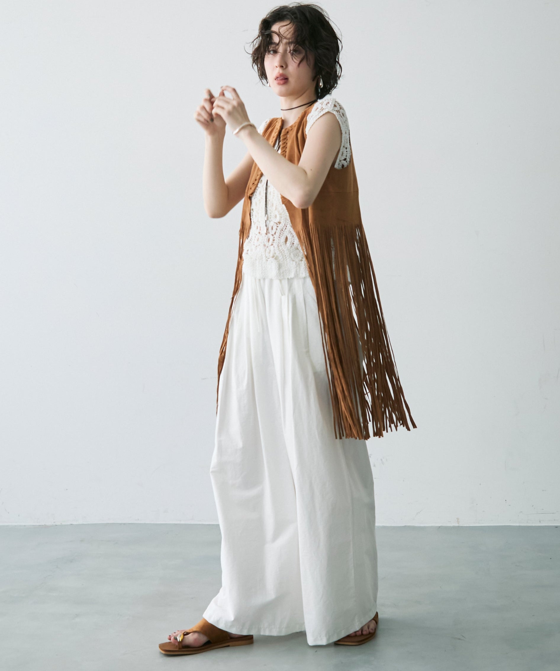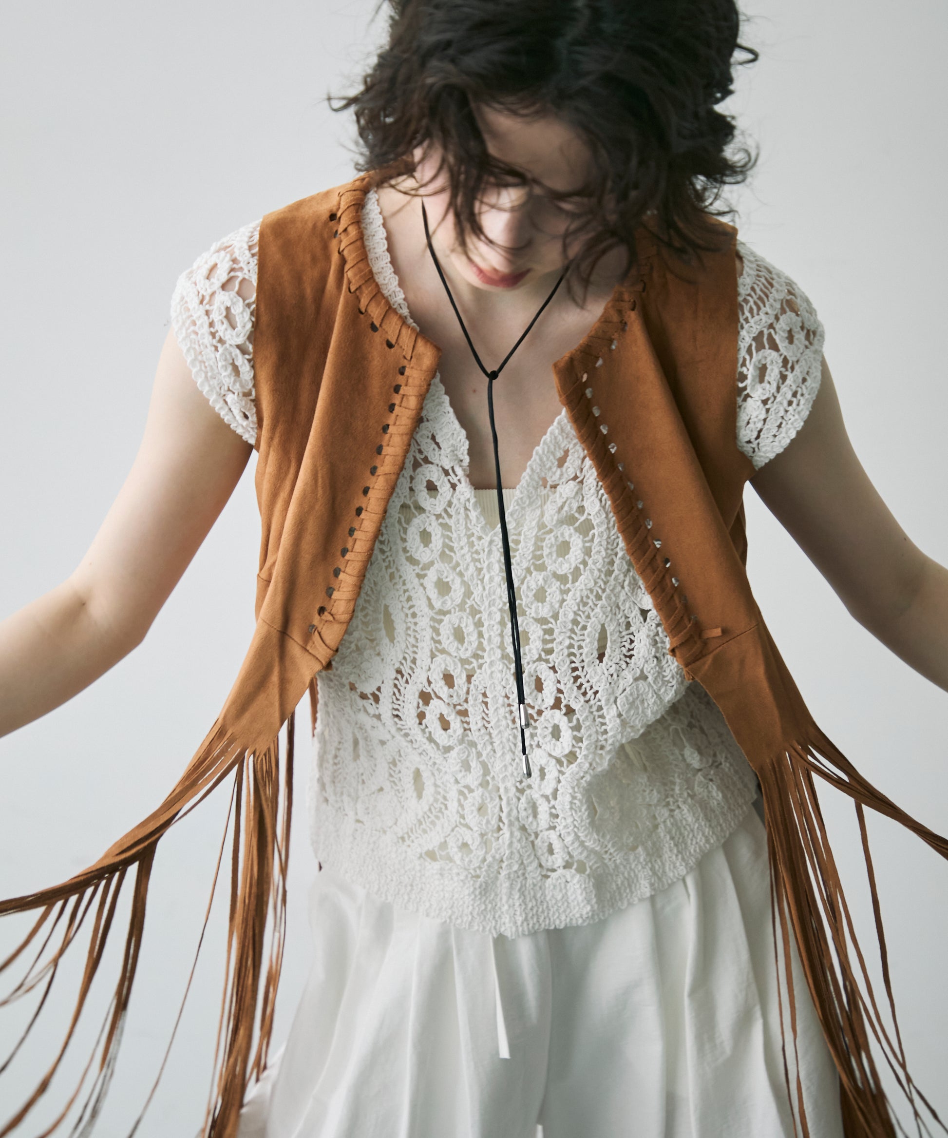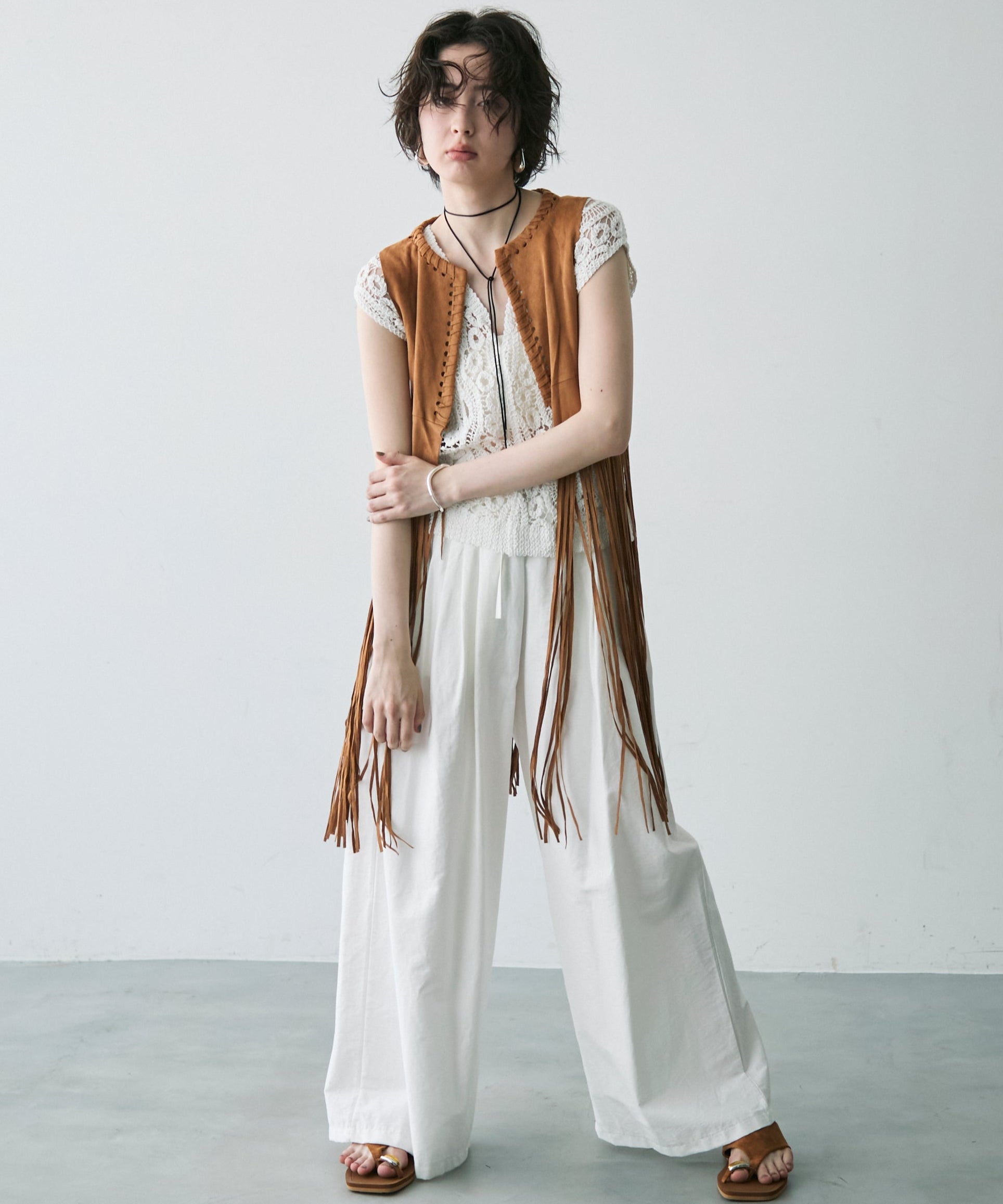ロングフリンジがたっぷりのスエード調のフリンジジレ。