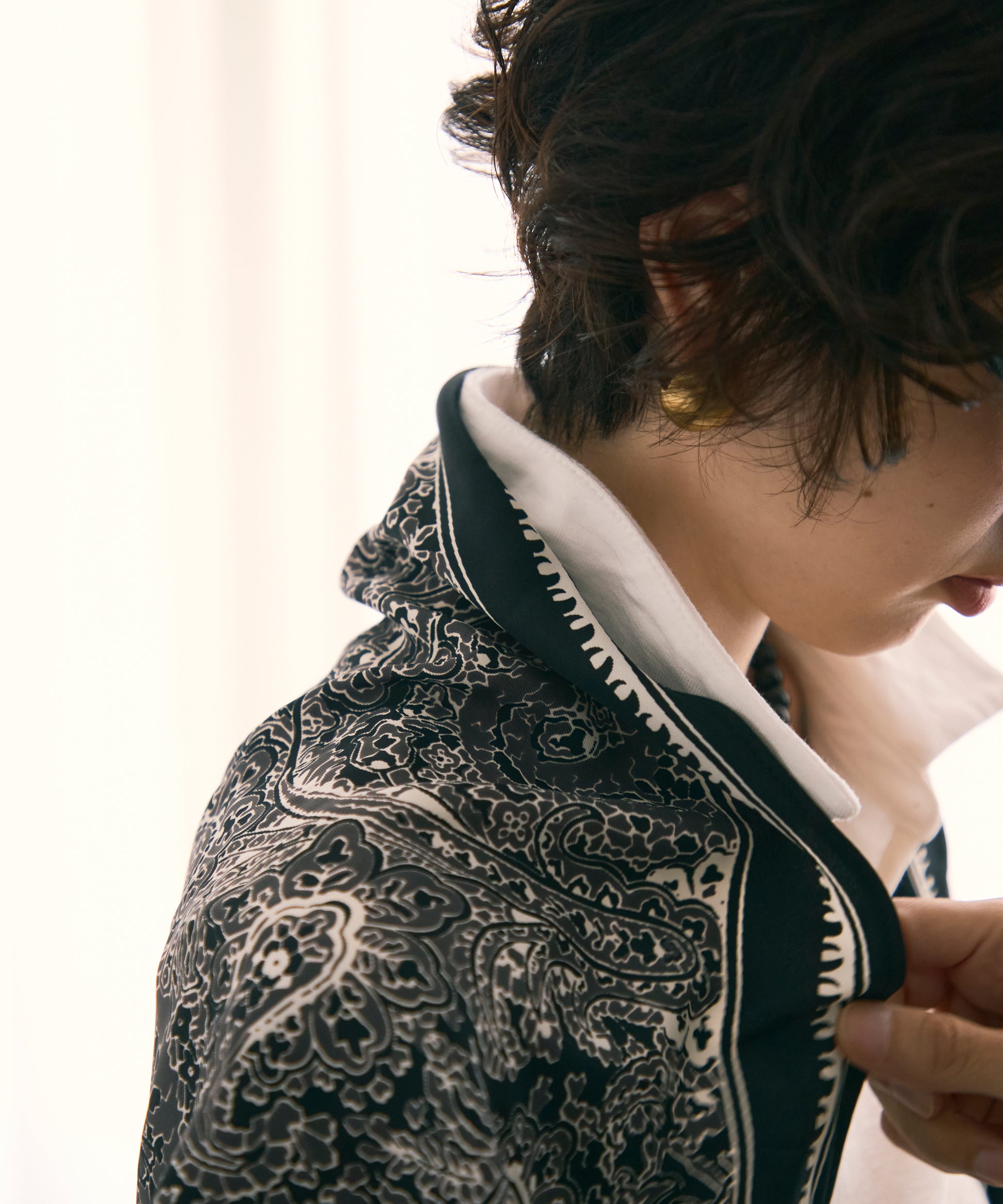 シルクライクな上品な光沢感と落ち感のあるポリエステル素材を使用し、ご自宅での手洗いも可能。程よい厚みとさらりとした生地感なのでシーズンレスで使えるのも嬉しいポイント。