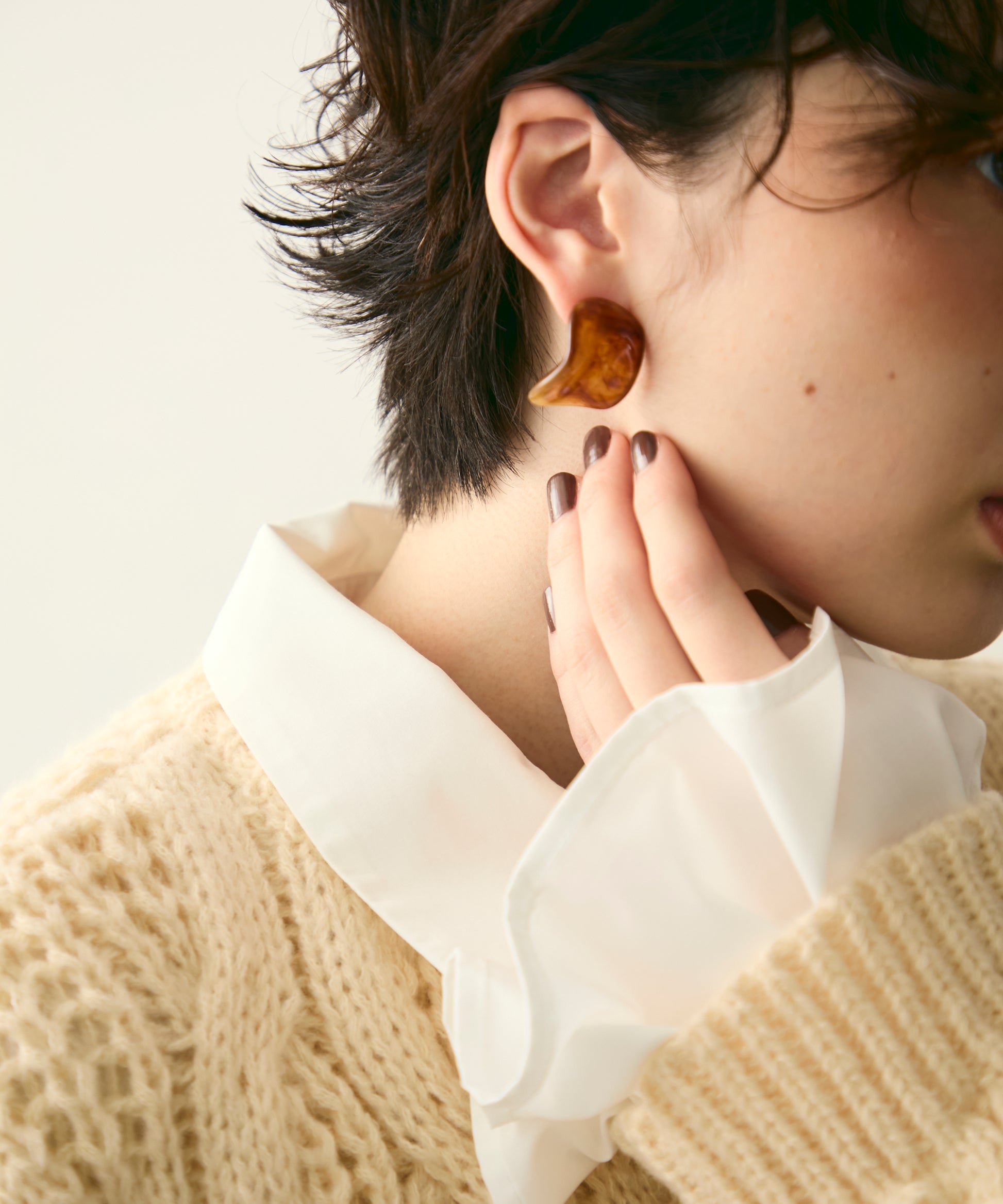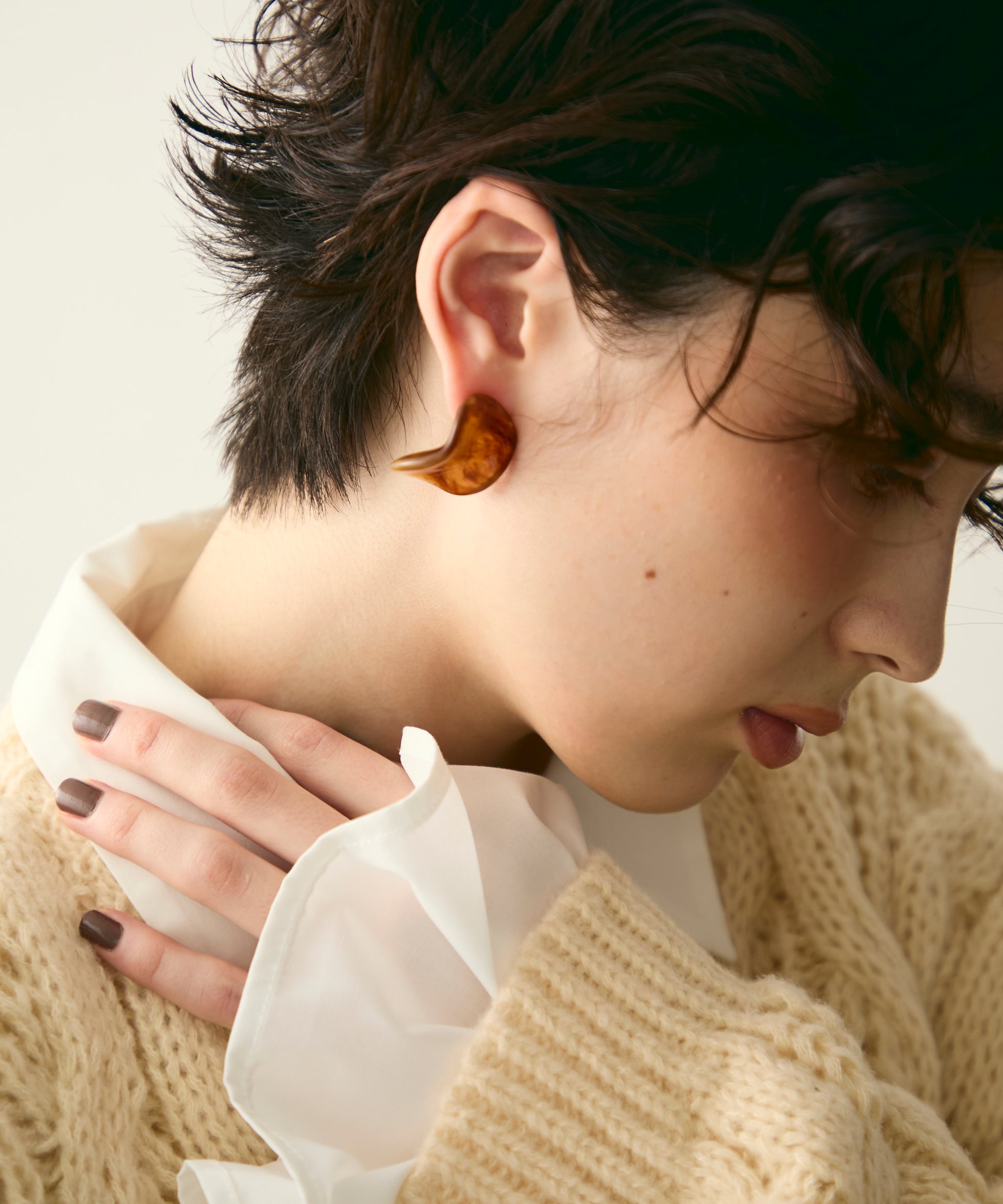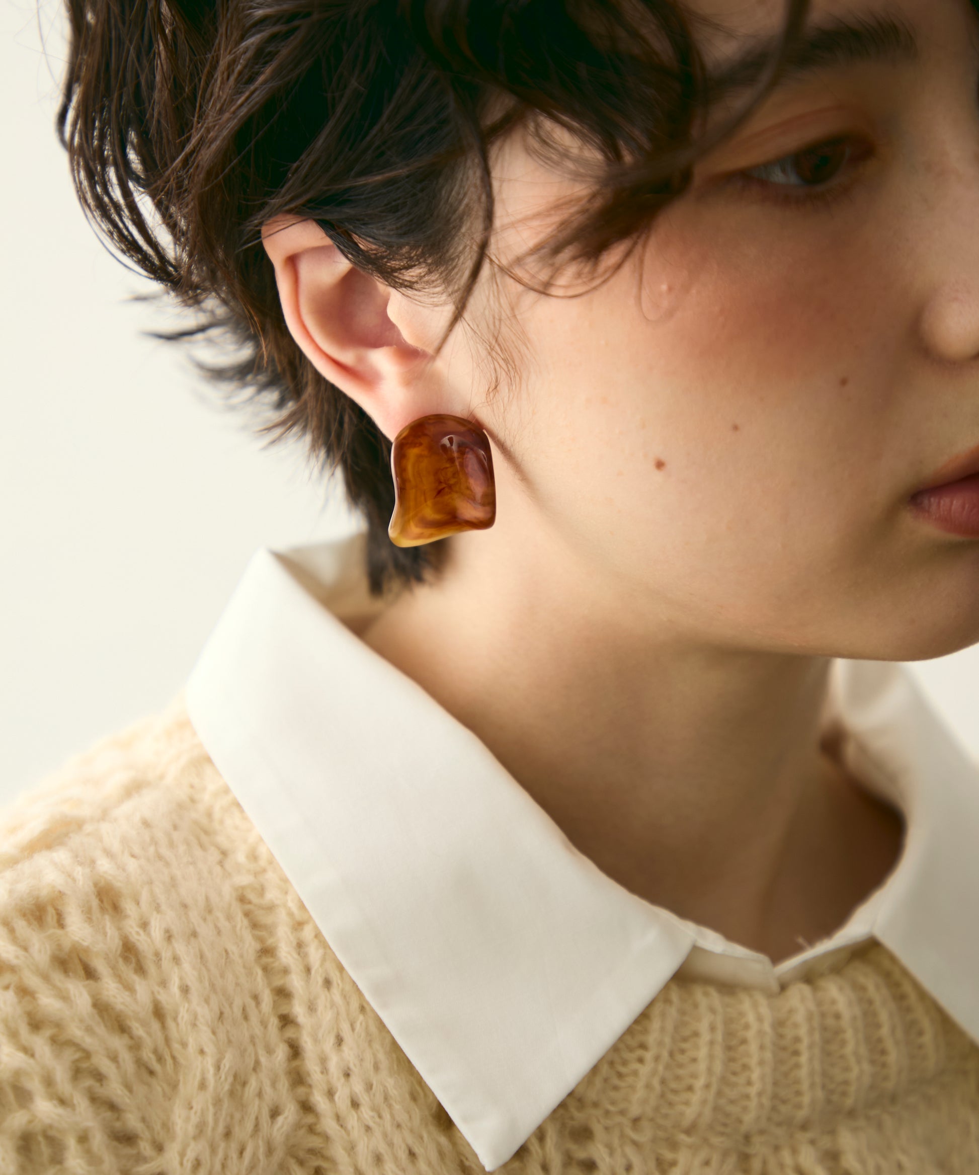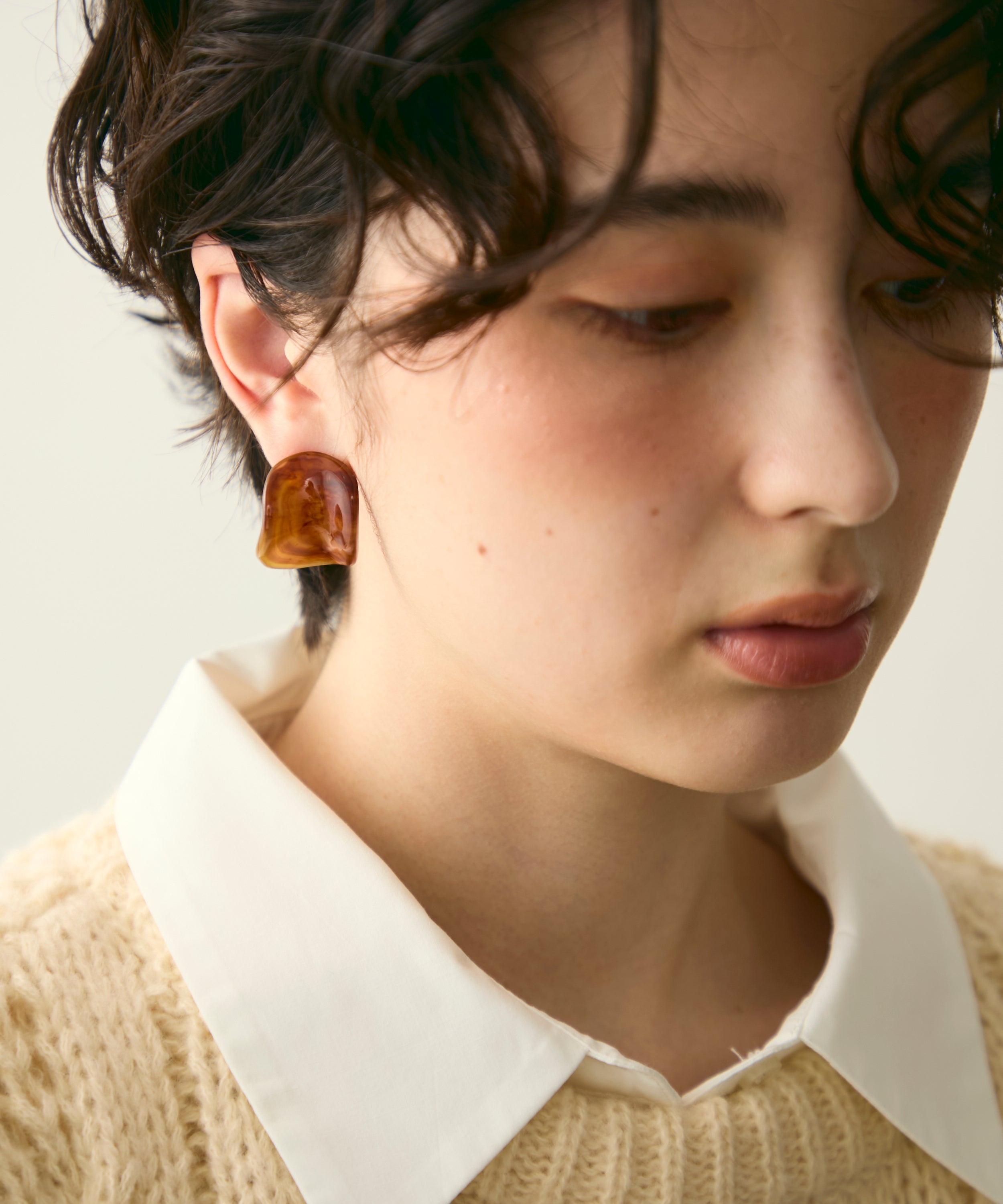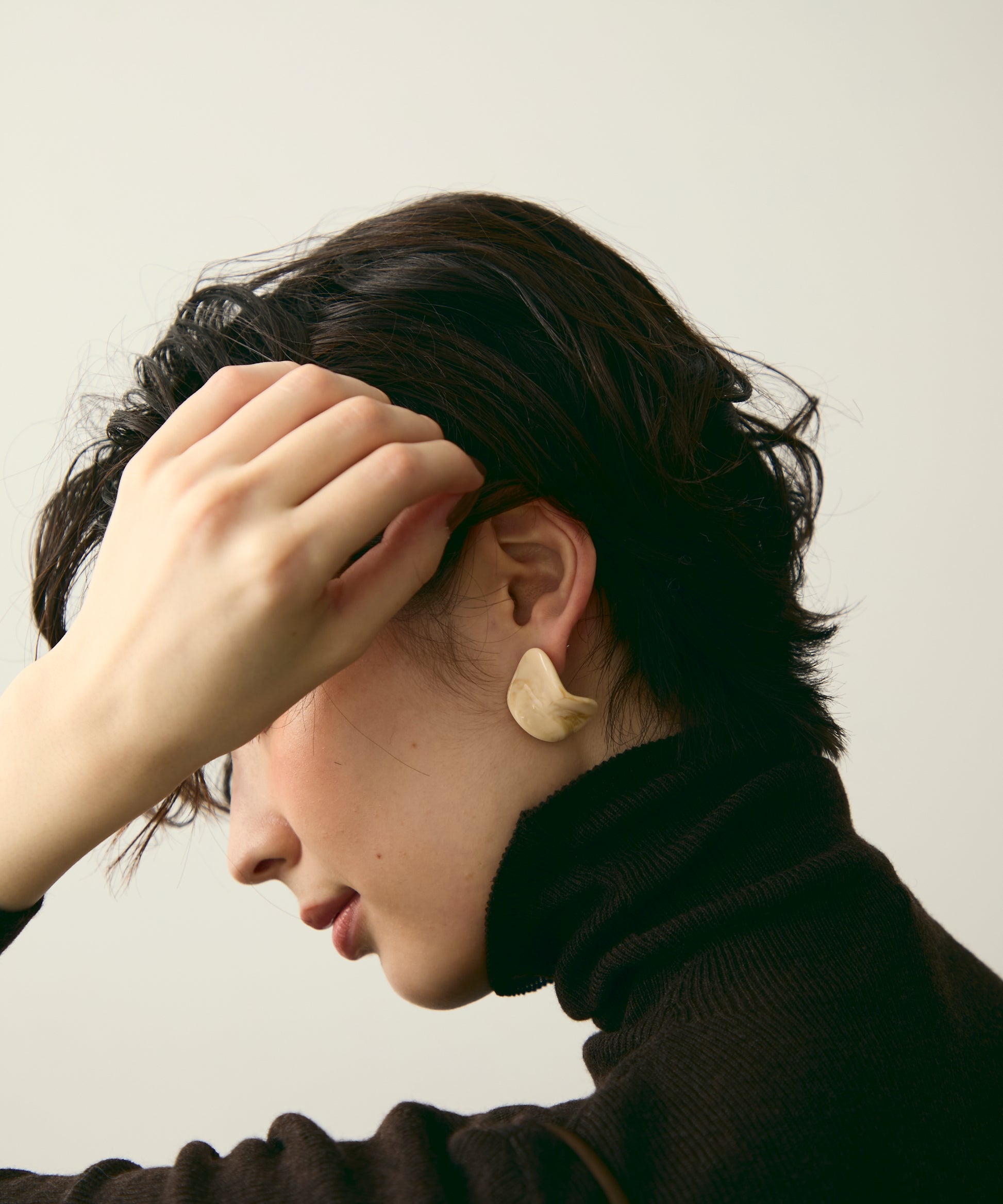 柔らかなウェーブラインが耳元に軽やかな動きを添える、アクリル樹脂製のピアスです。