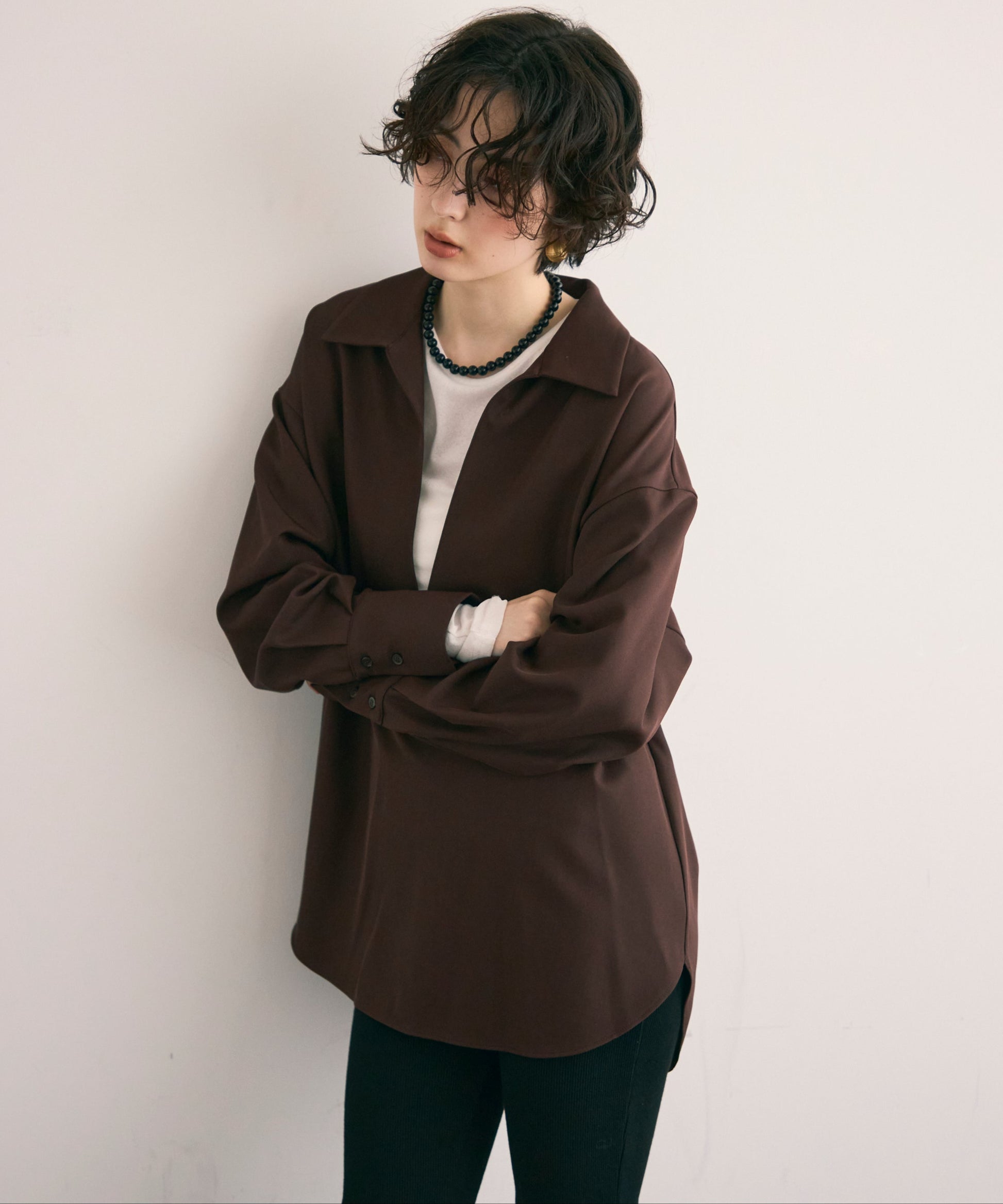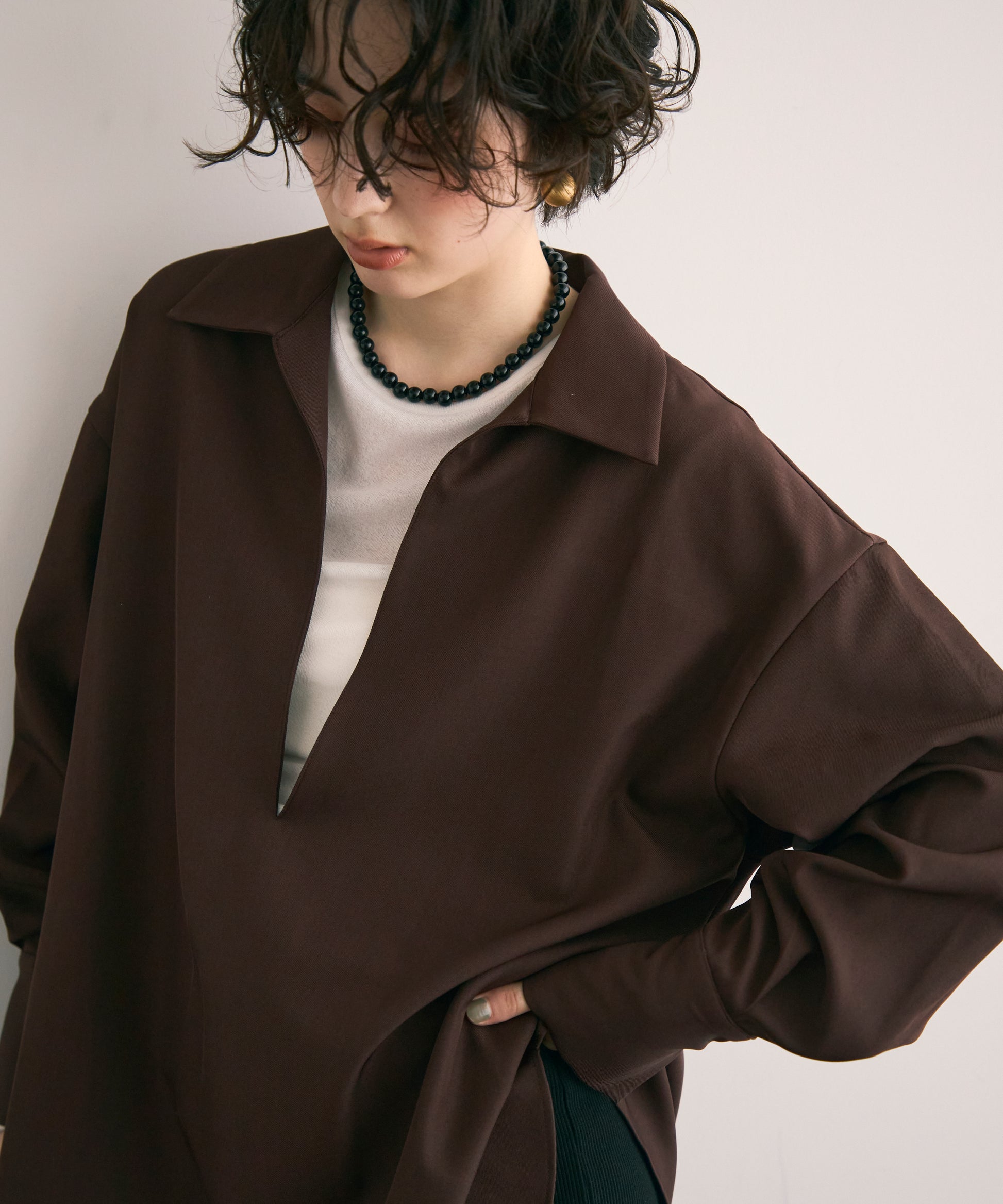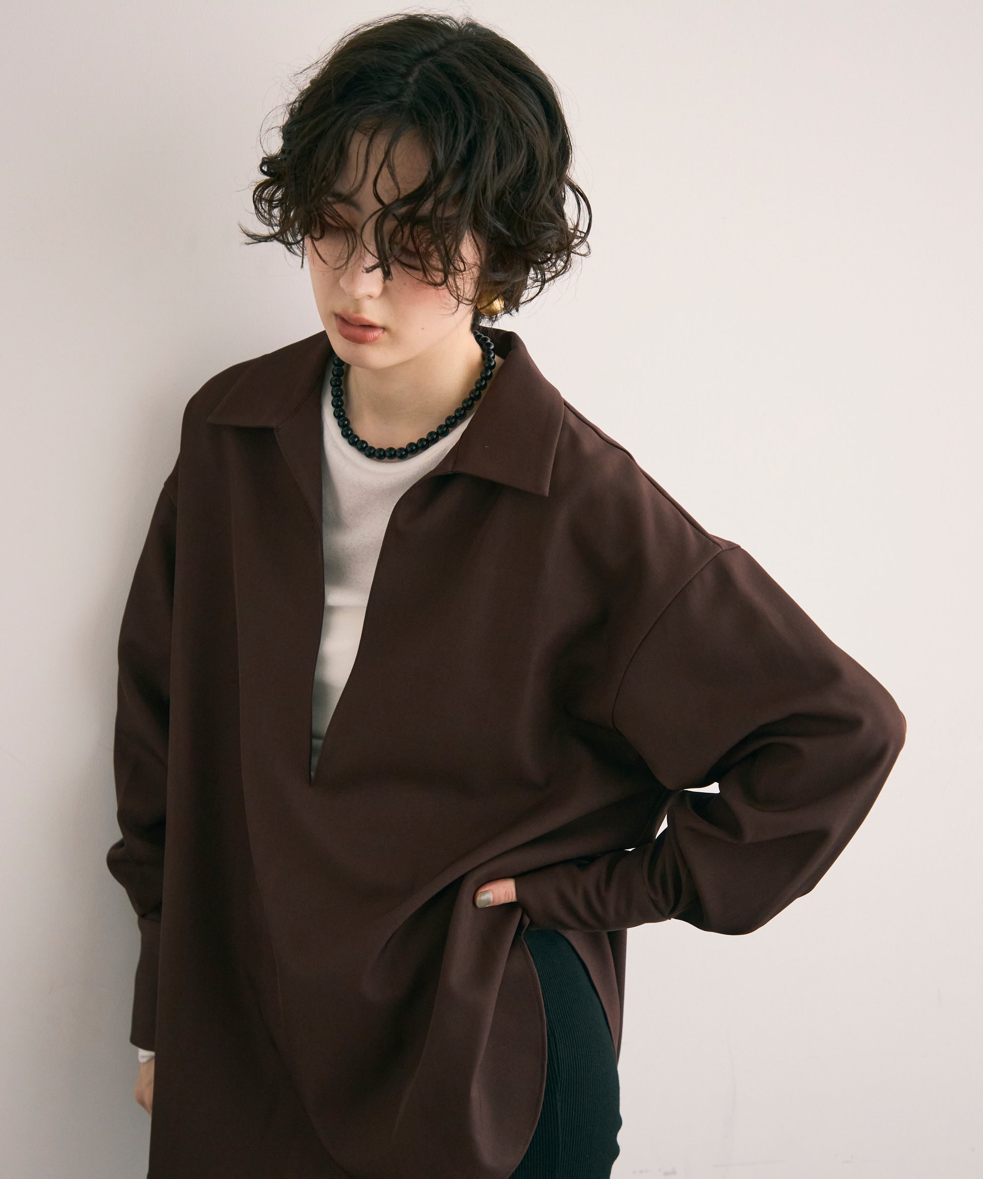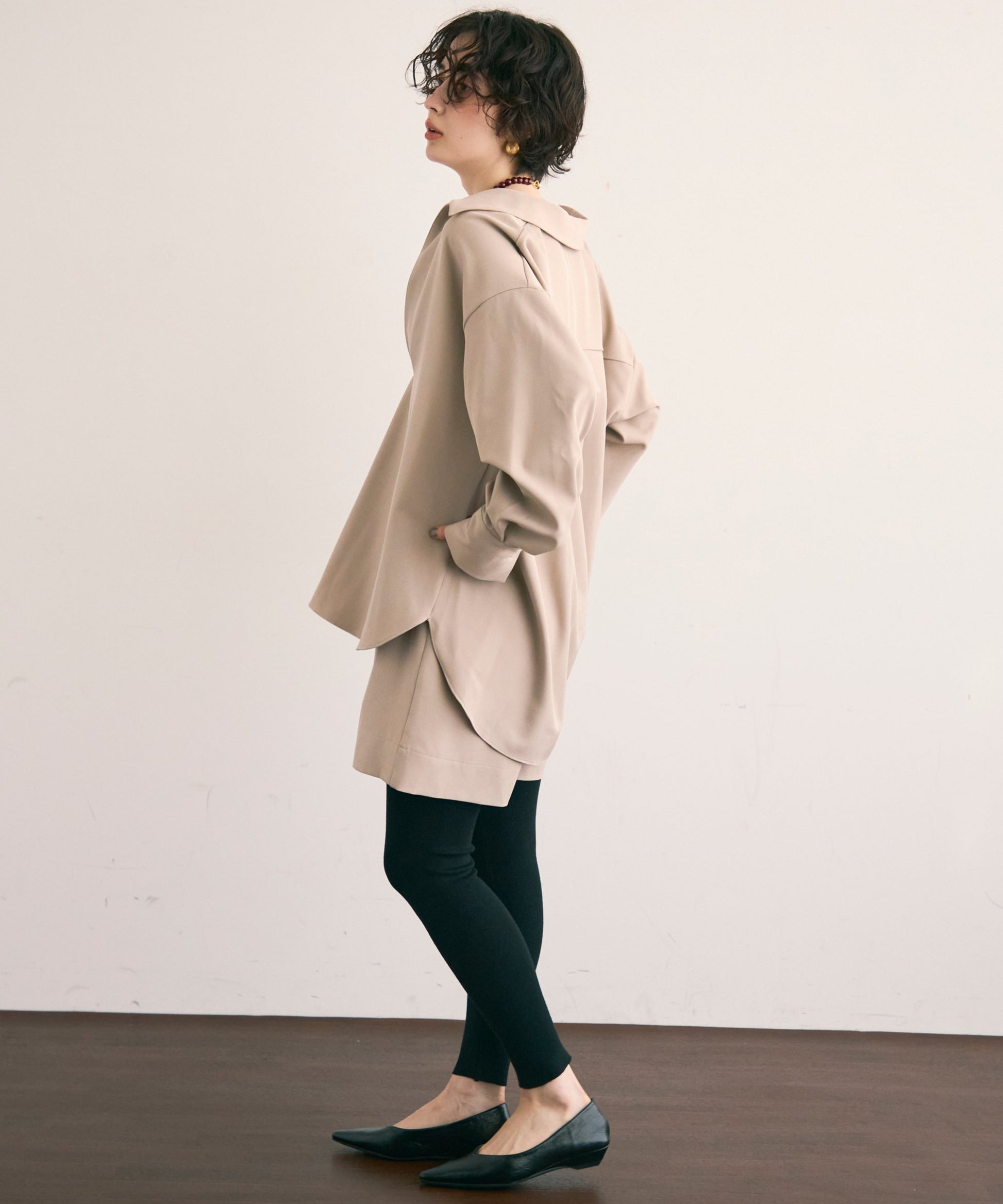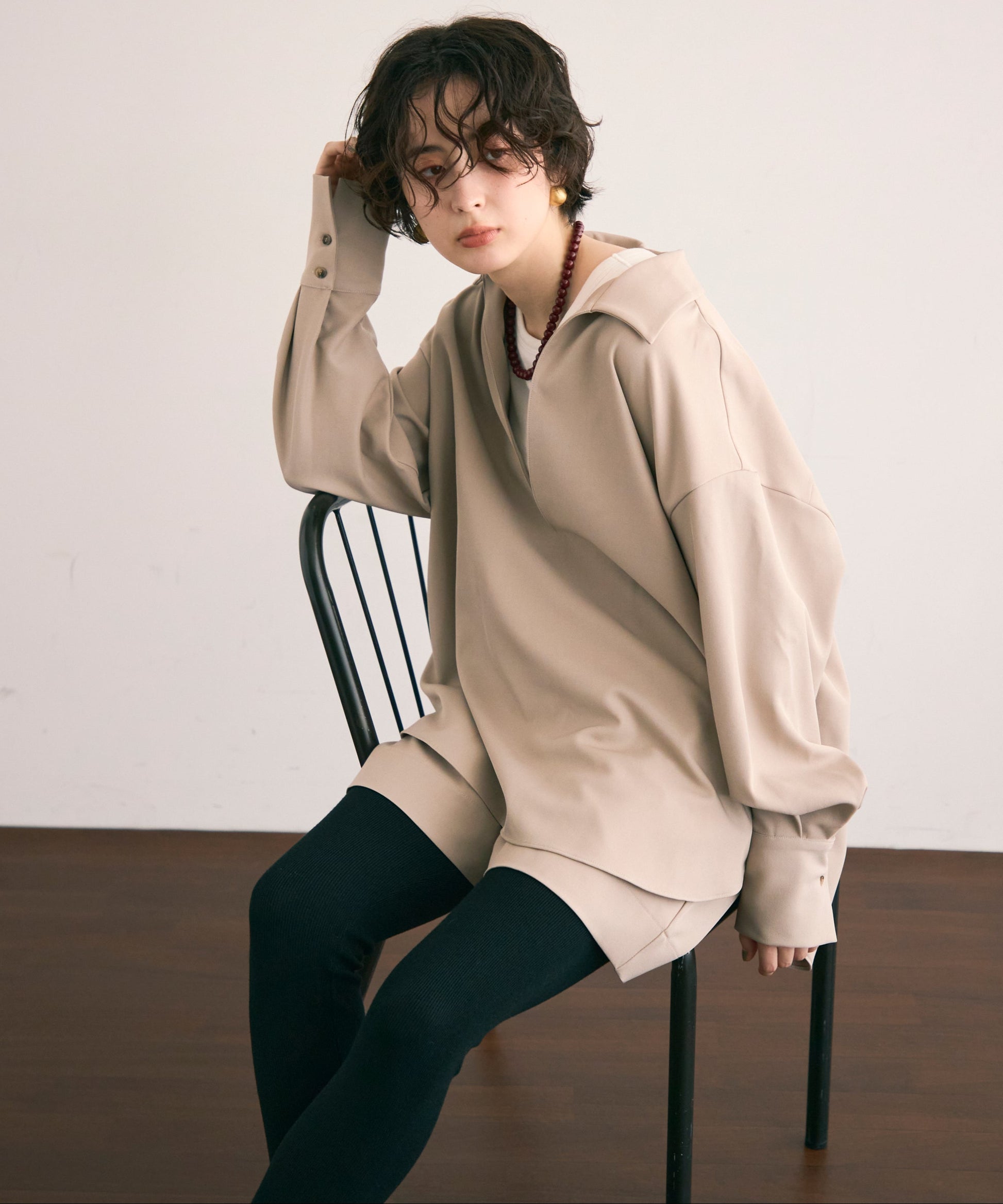 すっきりとしたネックラインが顔まわりをシャープに見せ、大人の抜け感を演出します。
