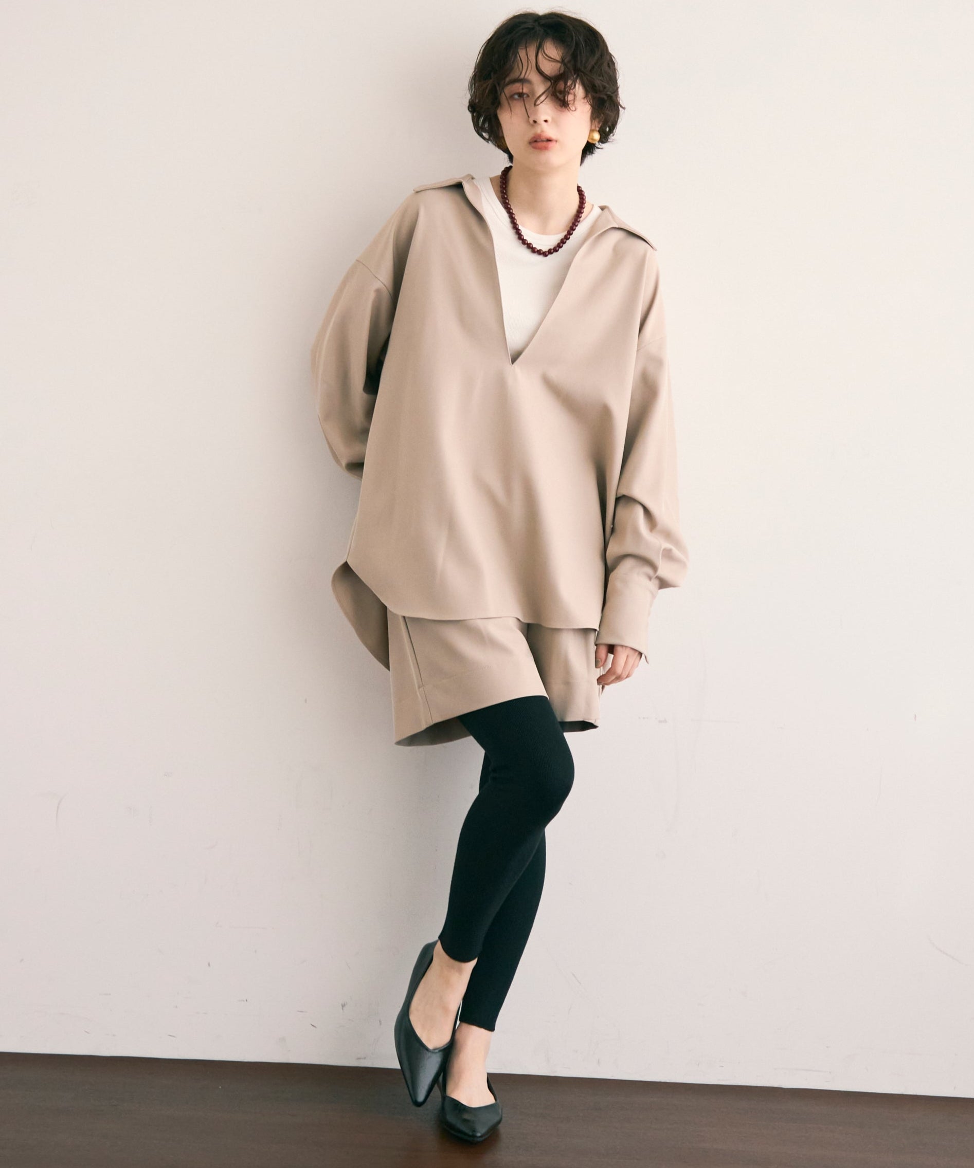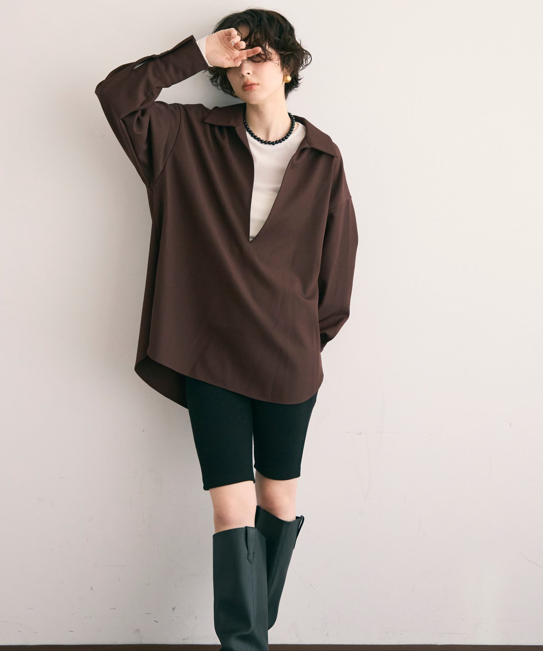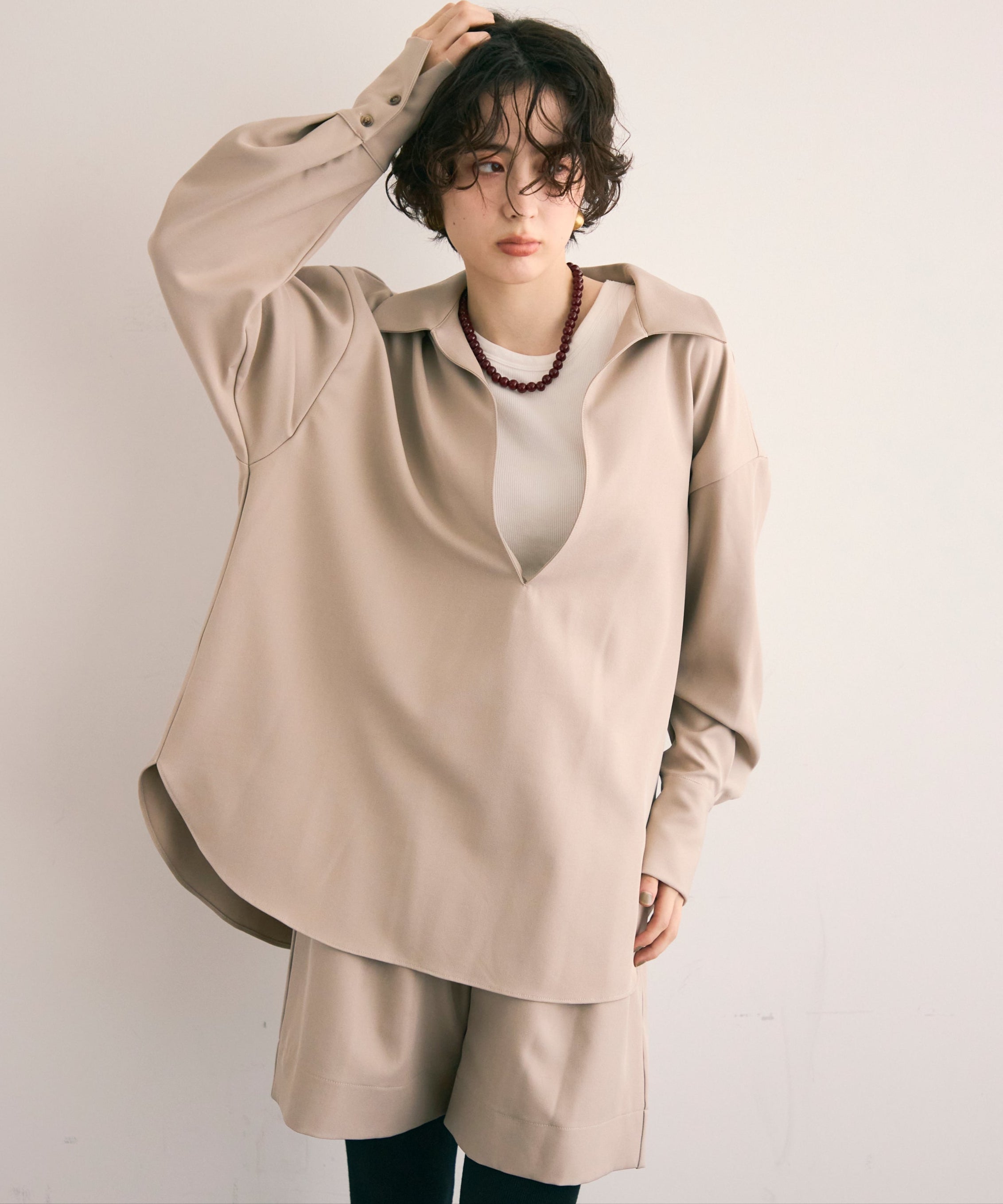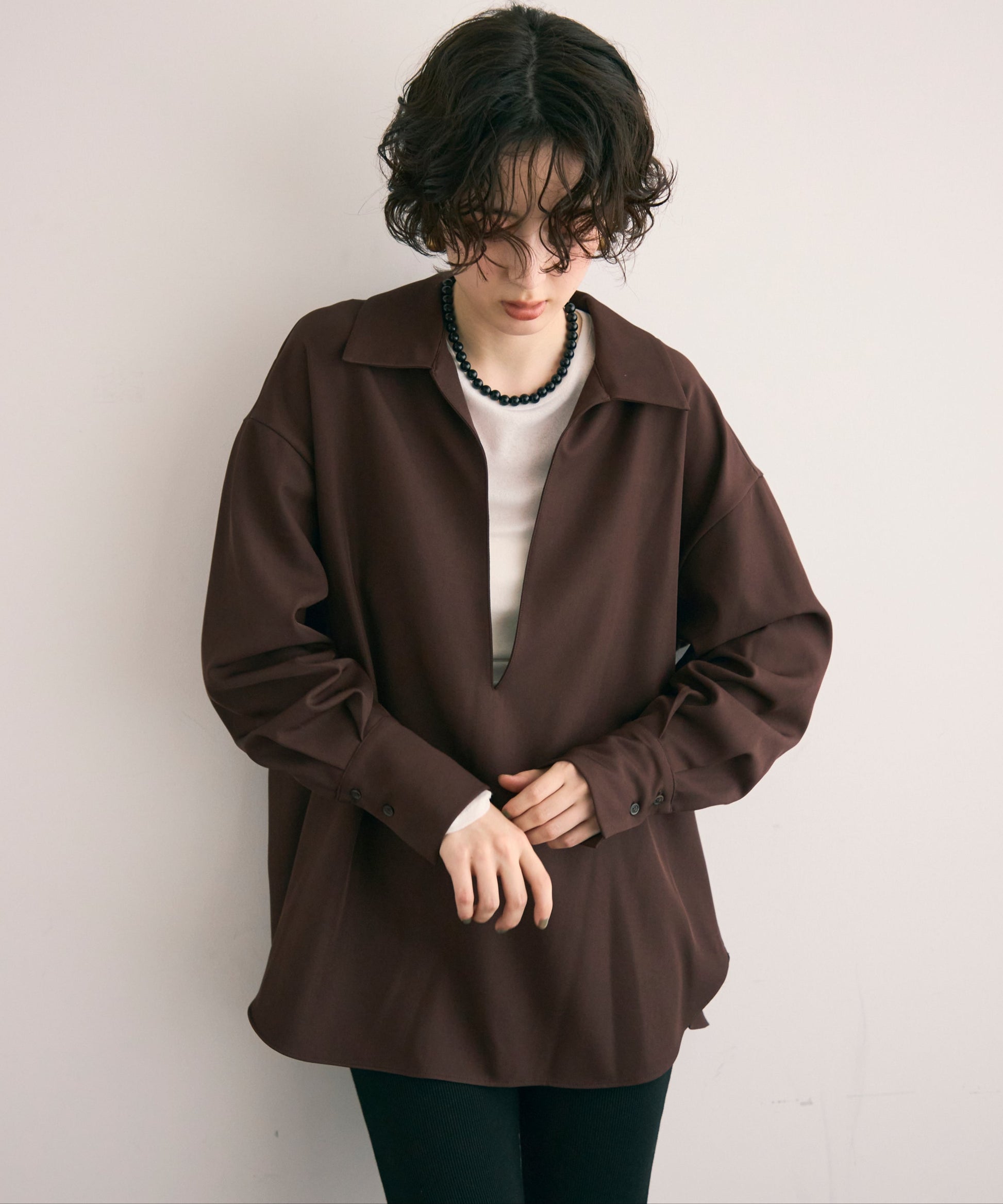 すっきりとしたネックラインが顔まわりをシャープに見せ、大人の抜け感を演出します。