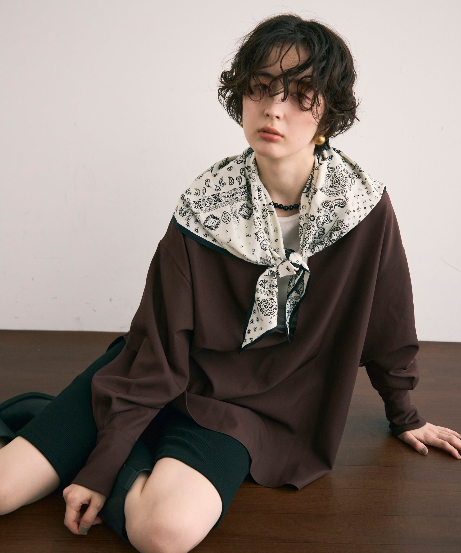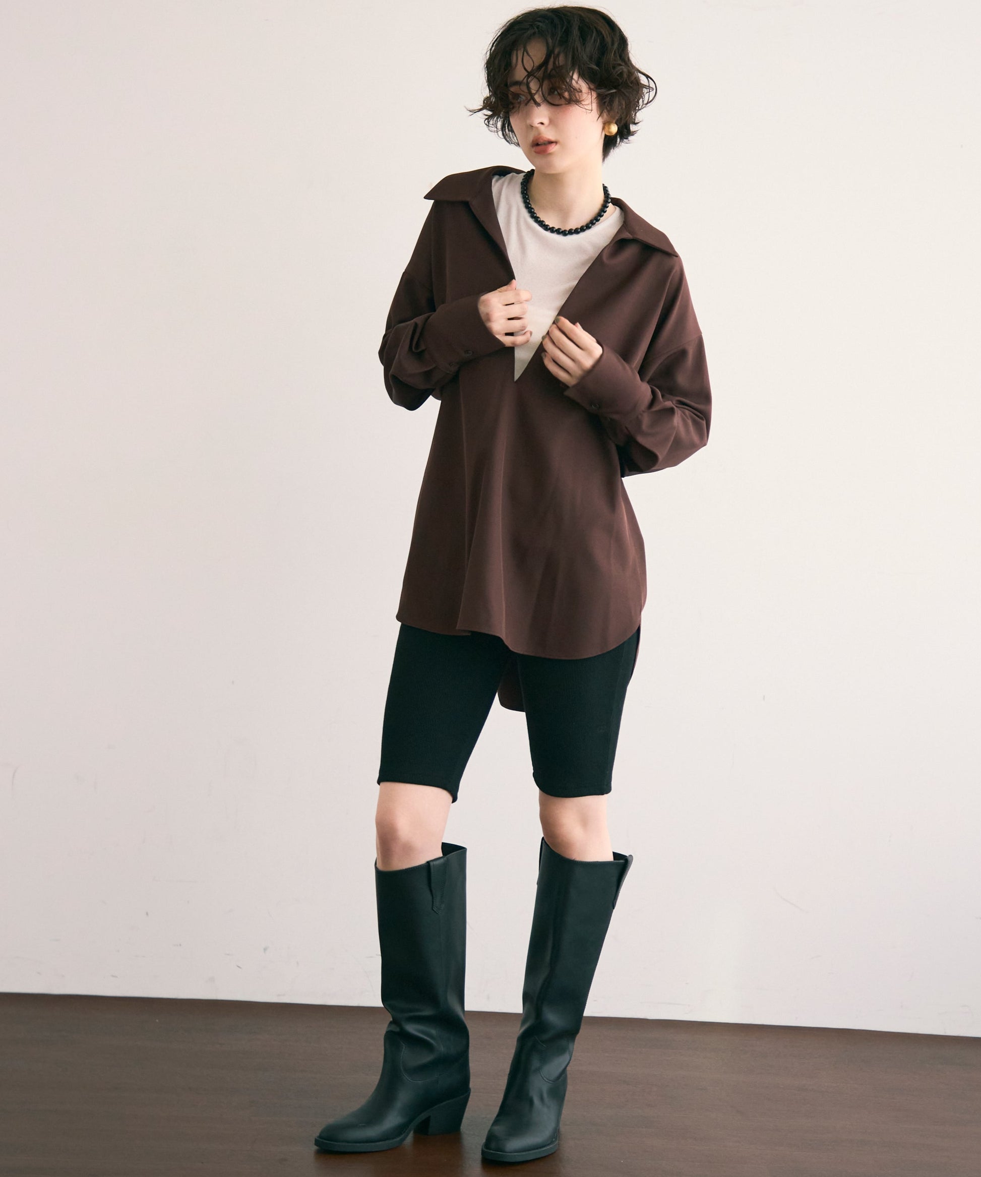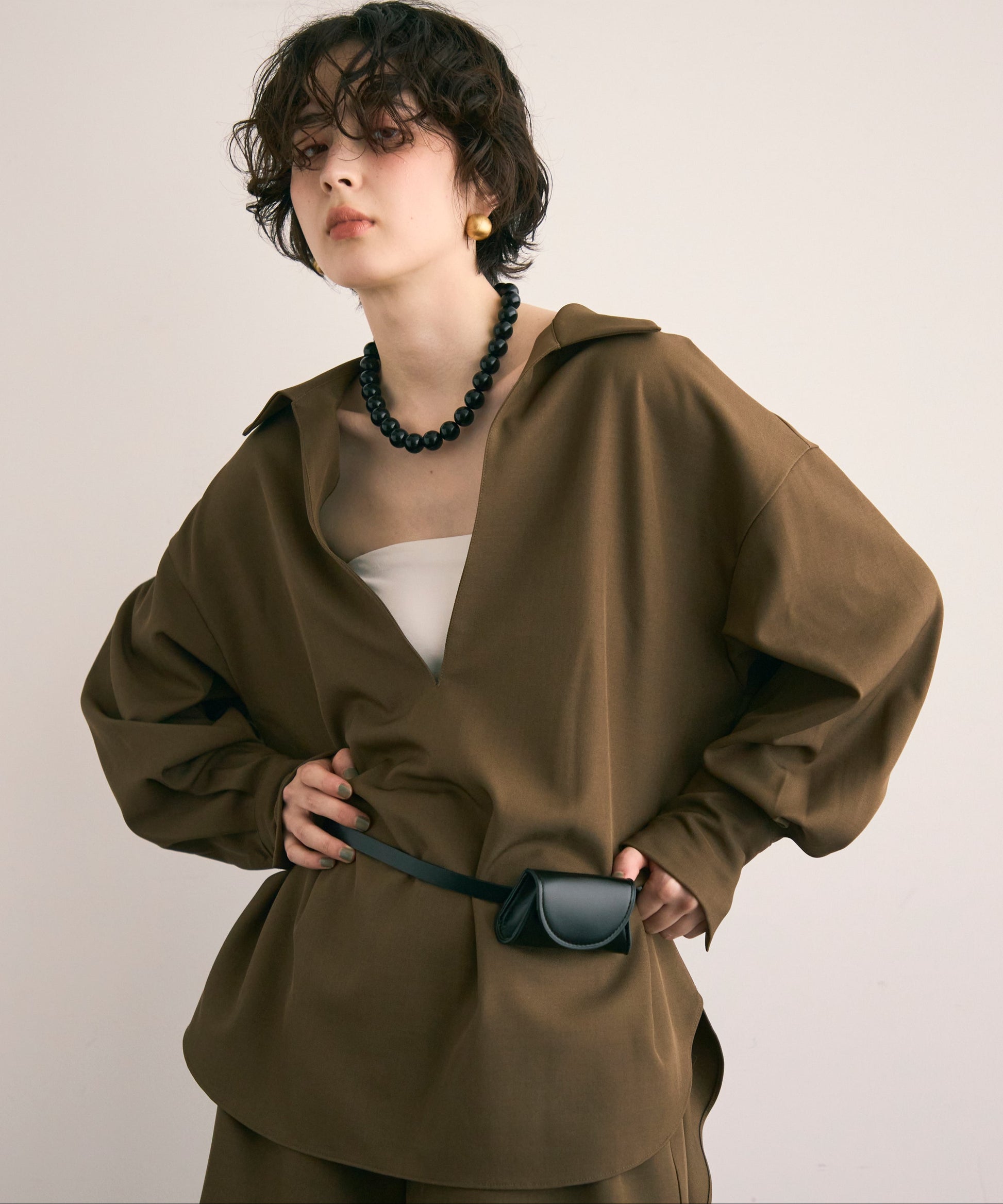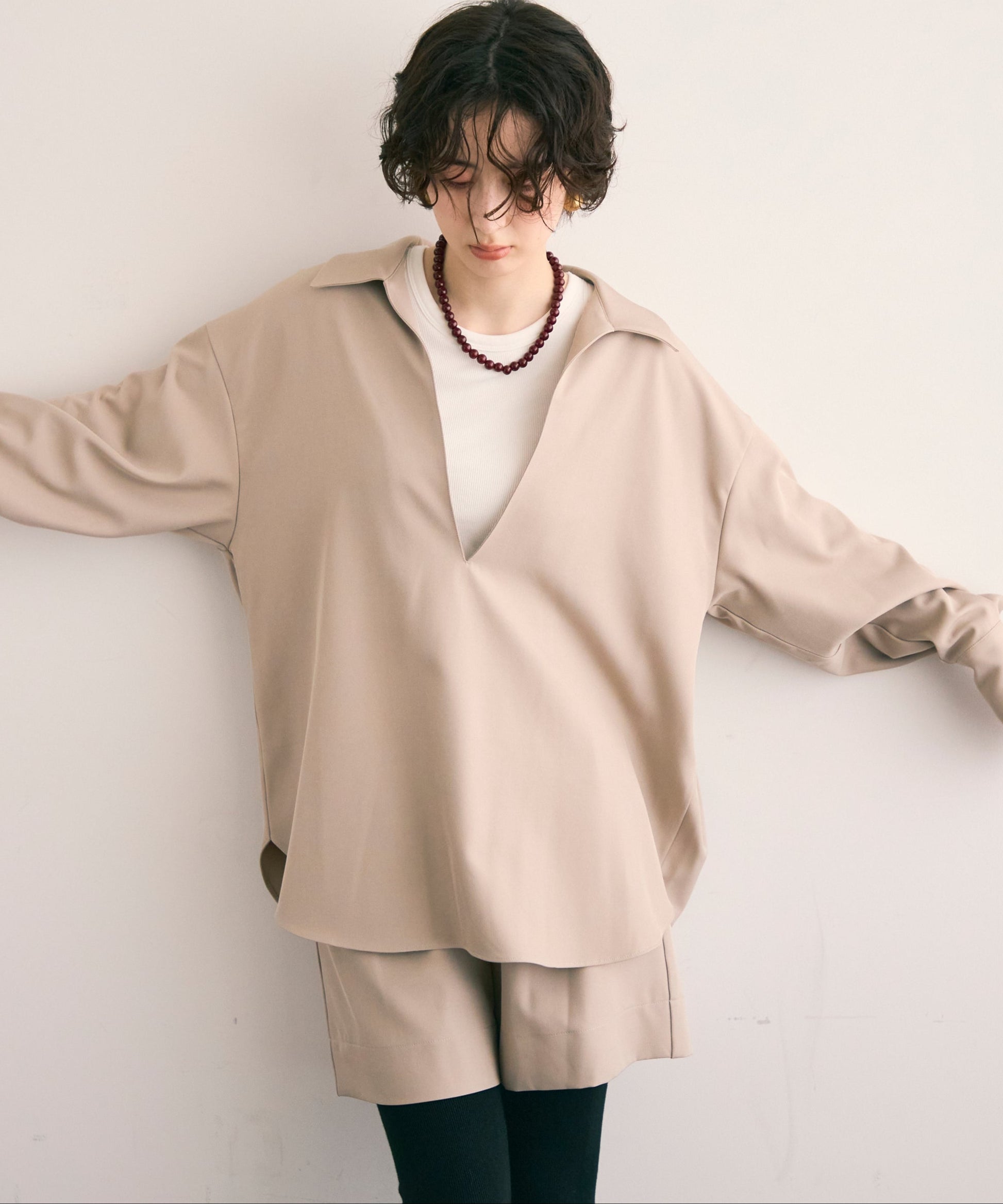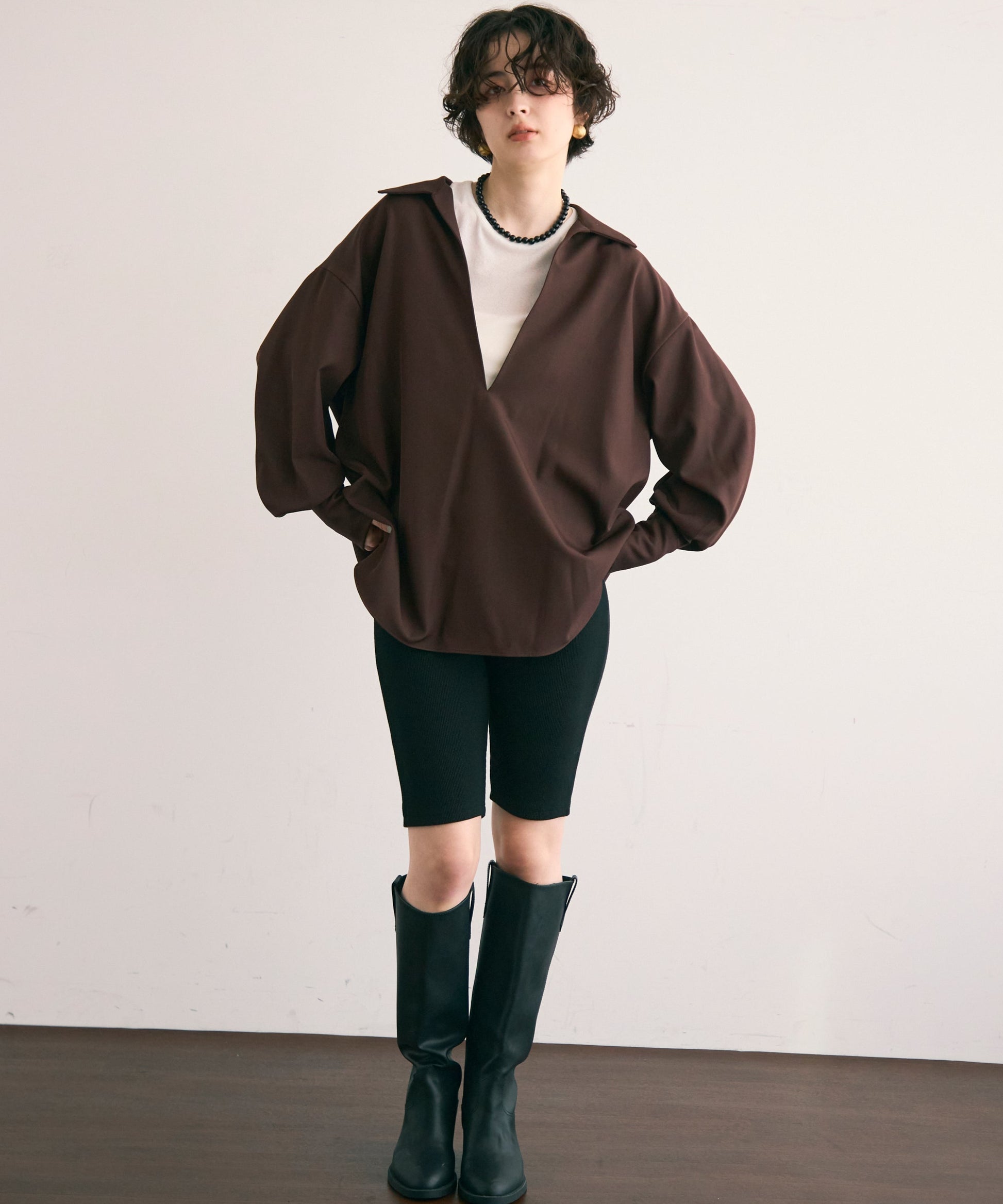 すっきりとしたネックラインが顔まわりをシャープに見せ、大人の抜け感を演出します。