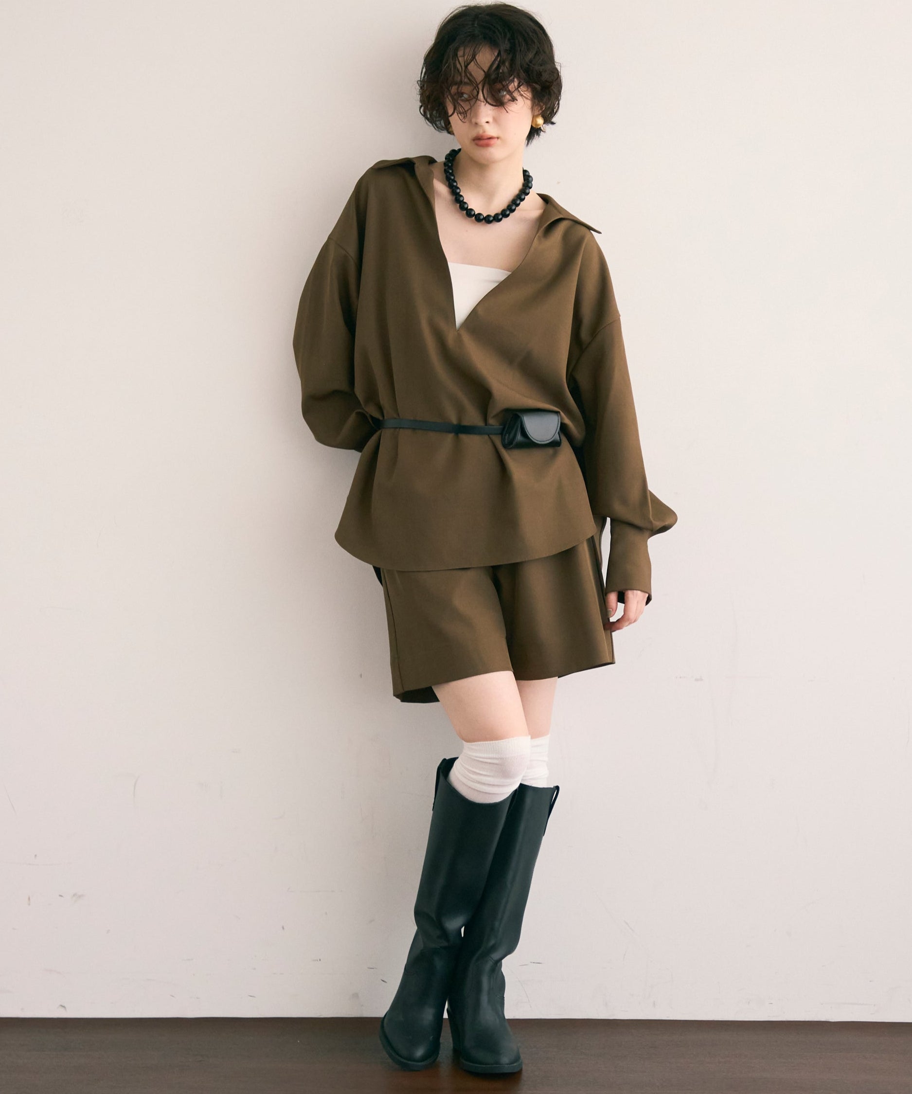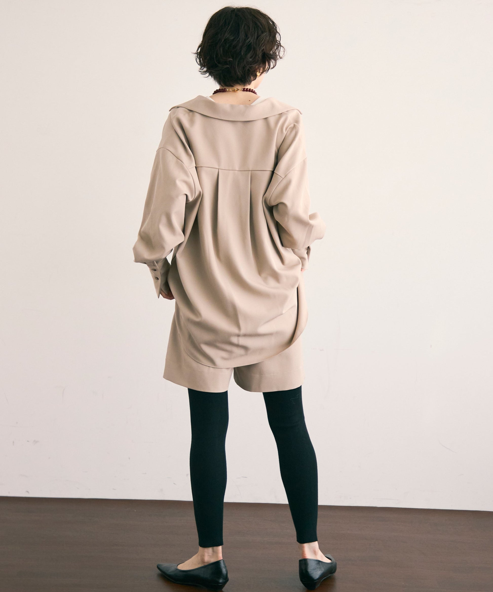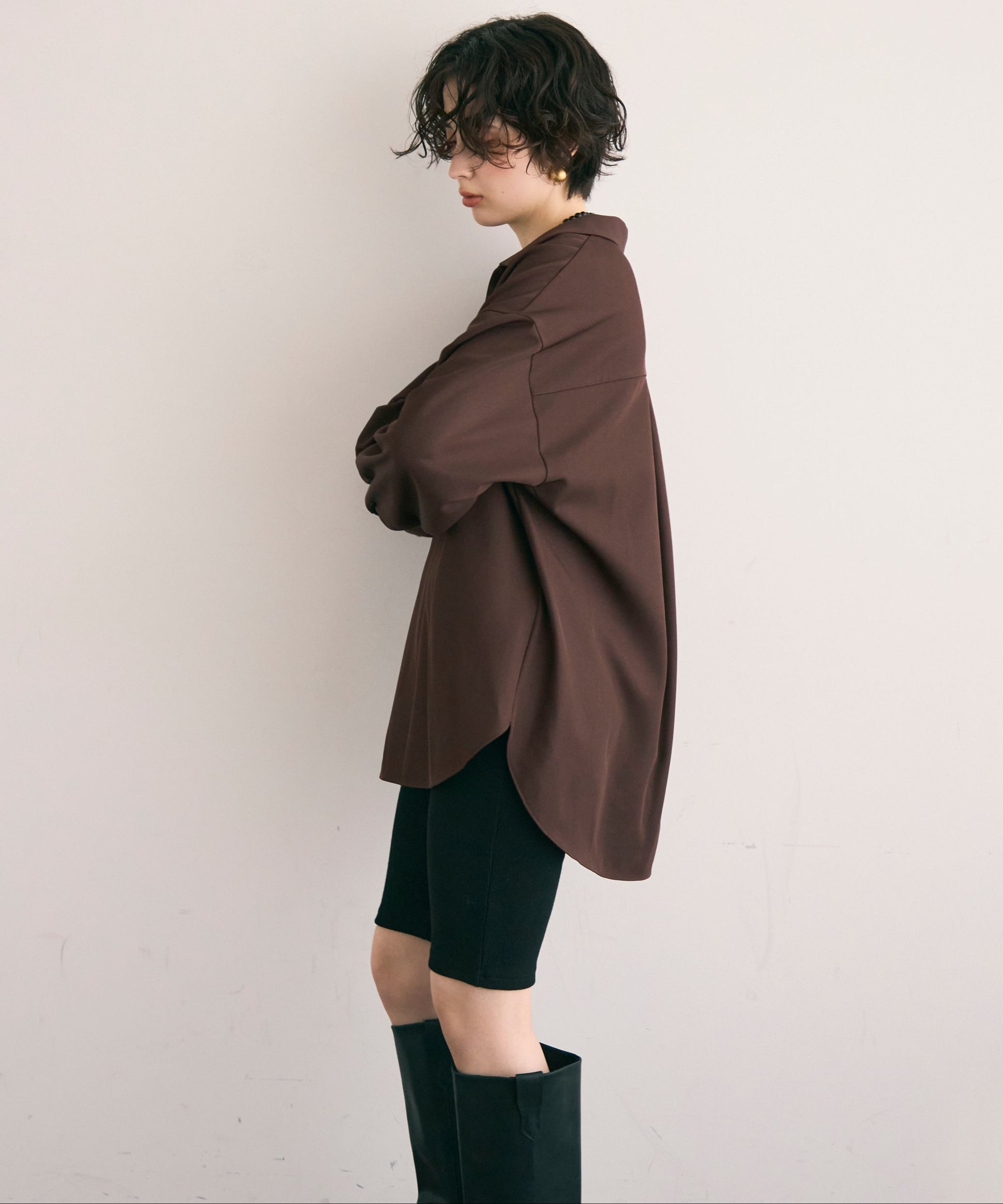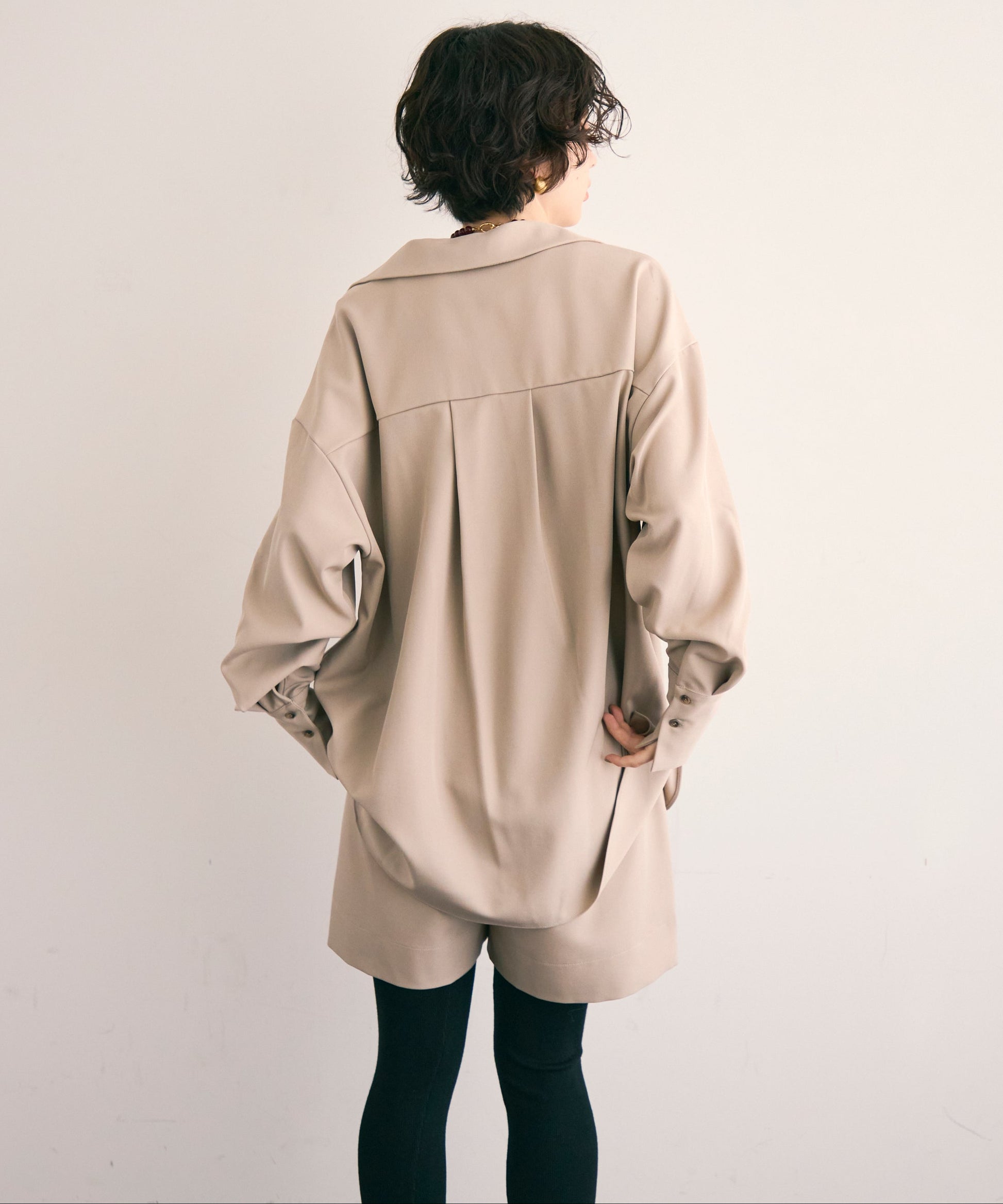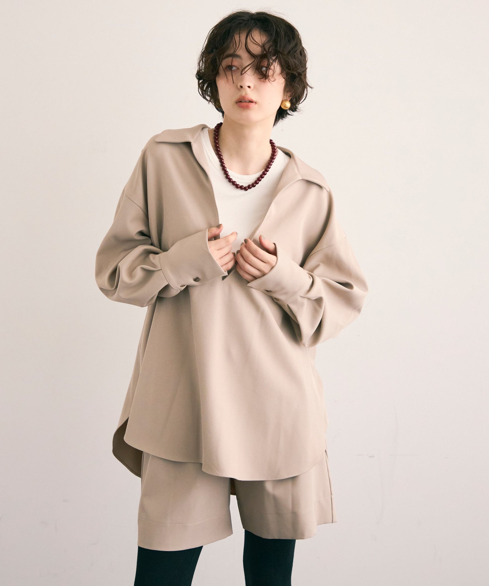 パンツ合わせでスタイリッシュに、スカート合わせでフェミニンにも着こなせる万能アイテムです。同素材のショートパンツとSETUP出来ます。