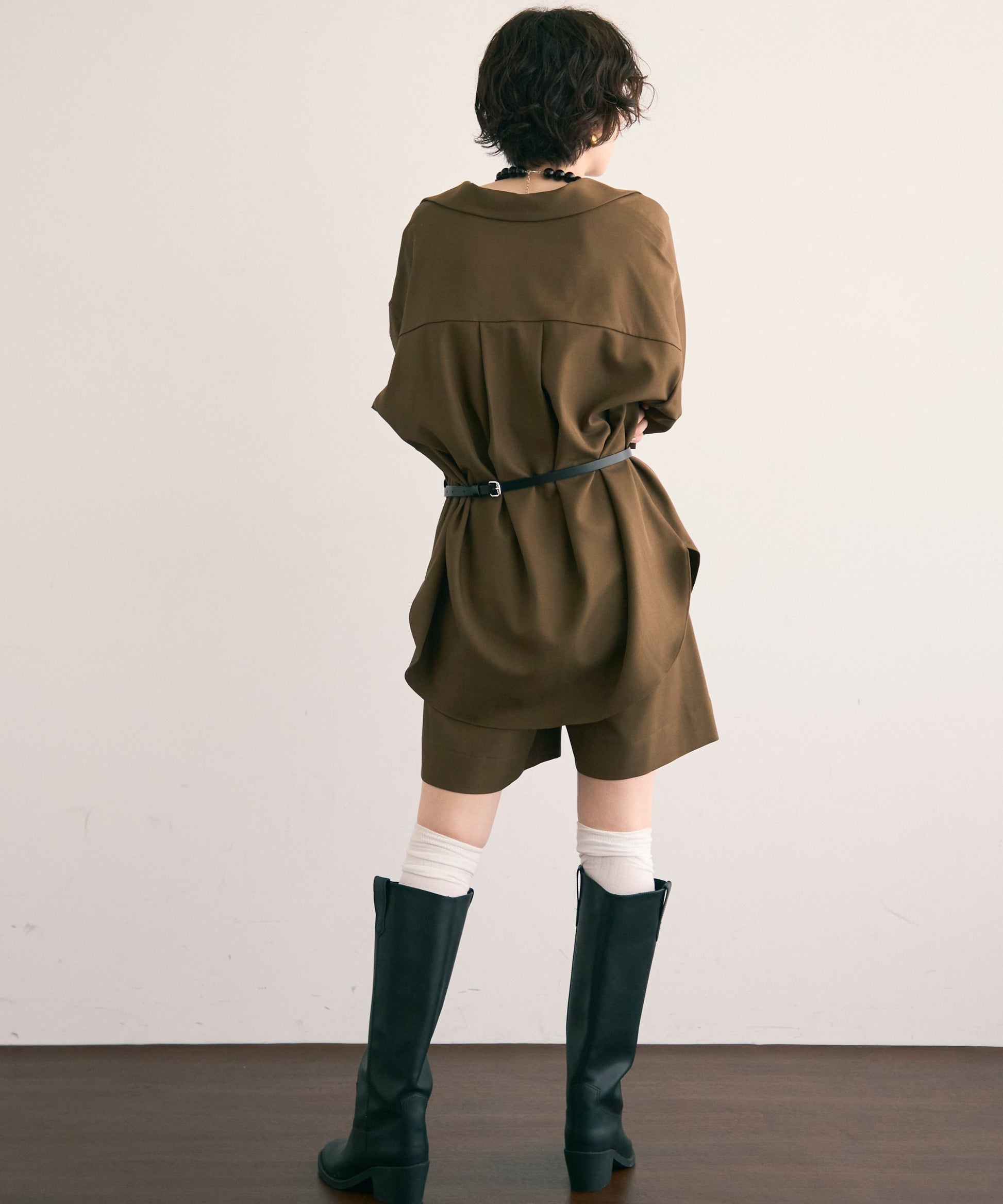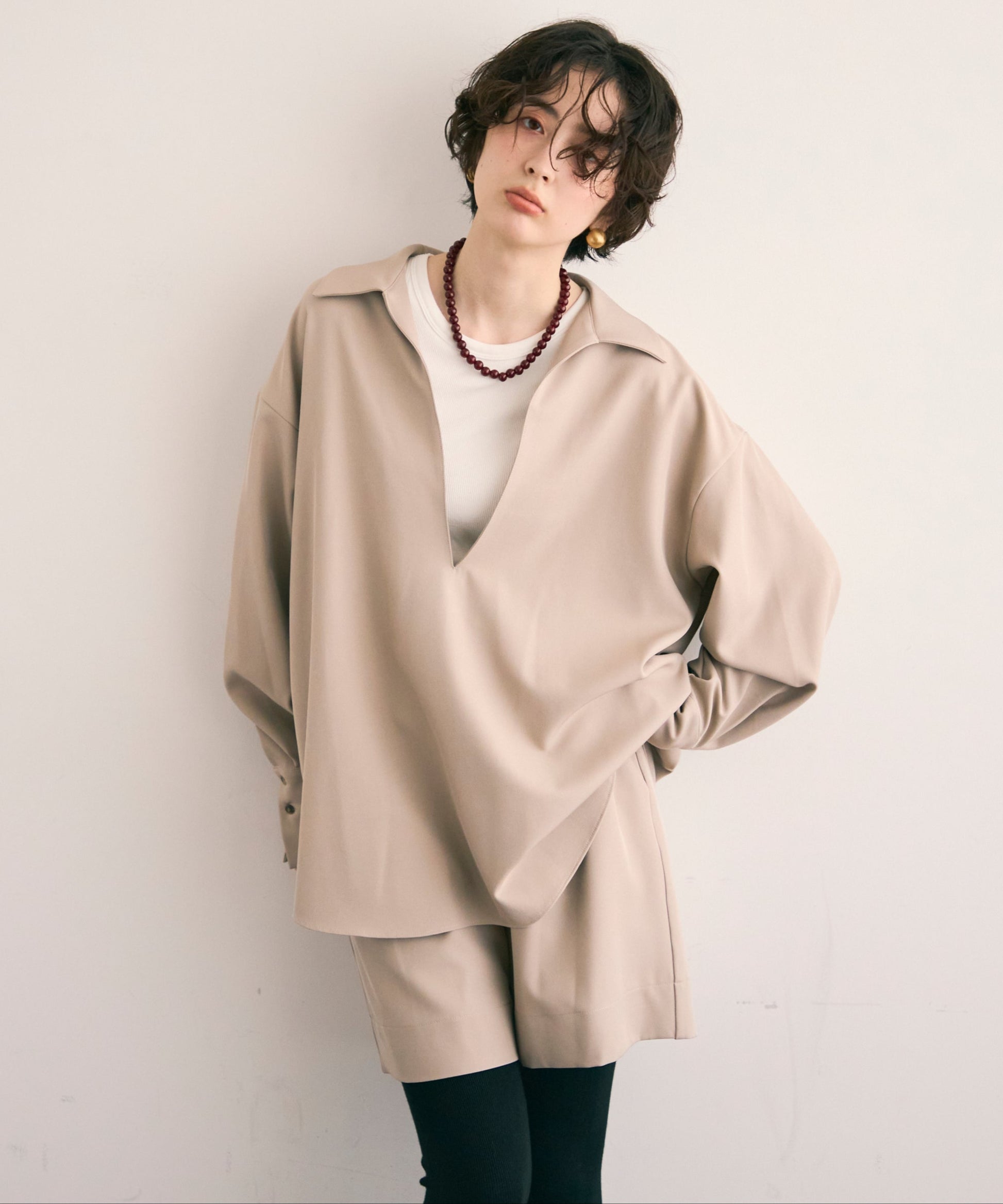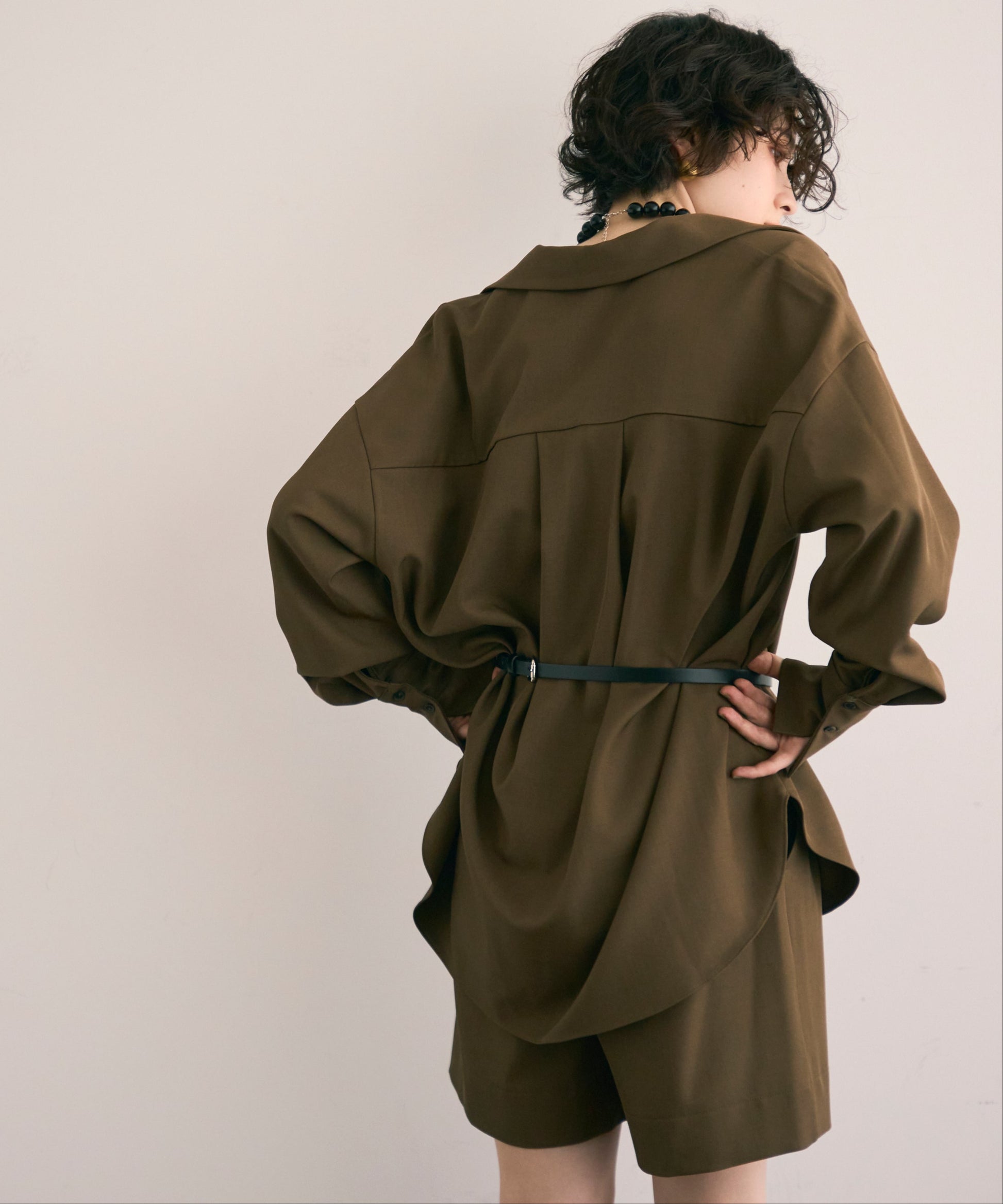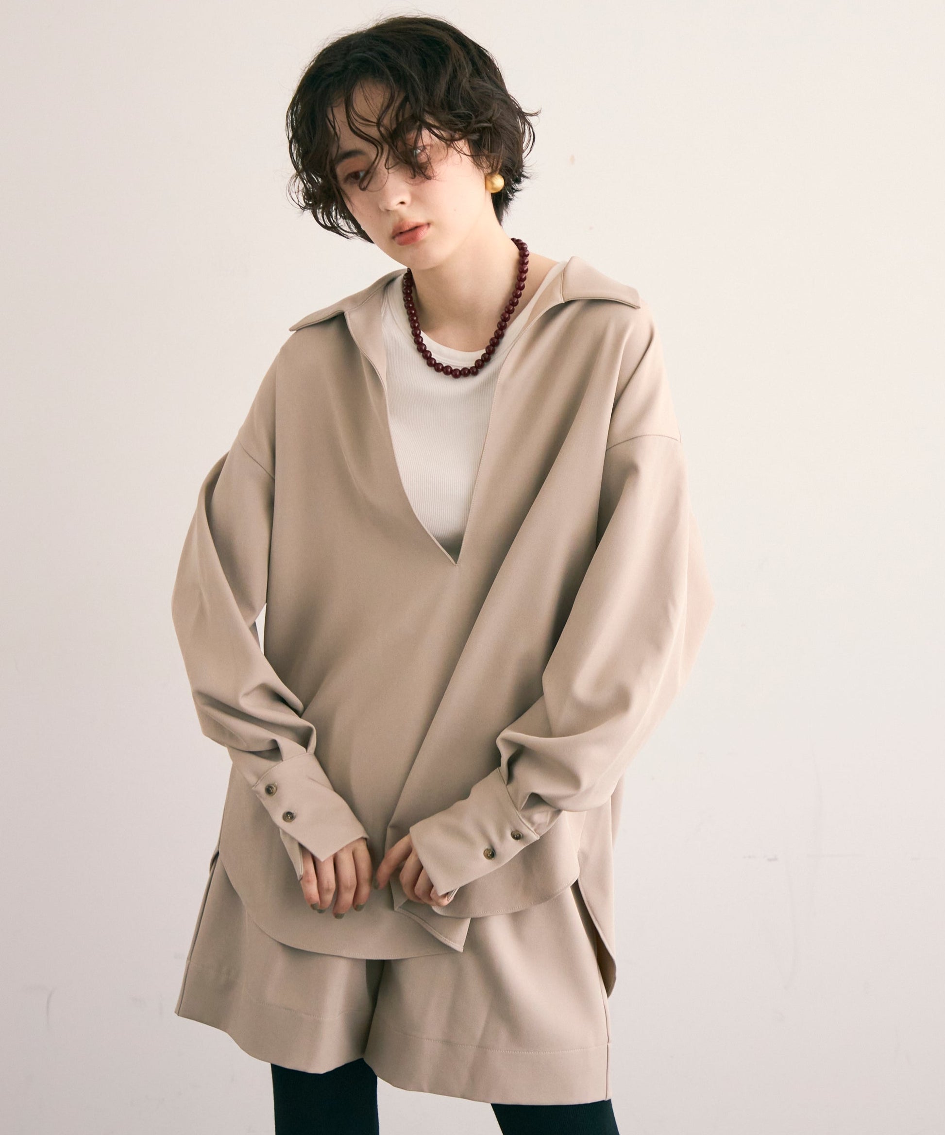 パンツ合わせでスタイリッシュに、スカート合わせでフェミニンにも着こなせる万能アイテムです。同素材のショートパンツとSETUP出来ます。
