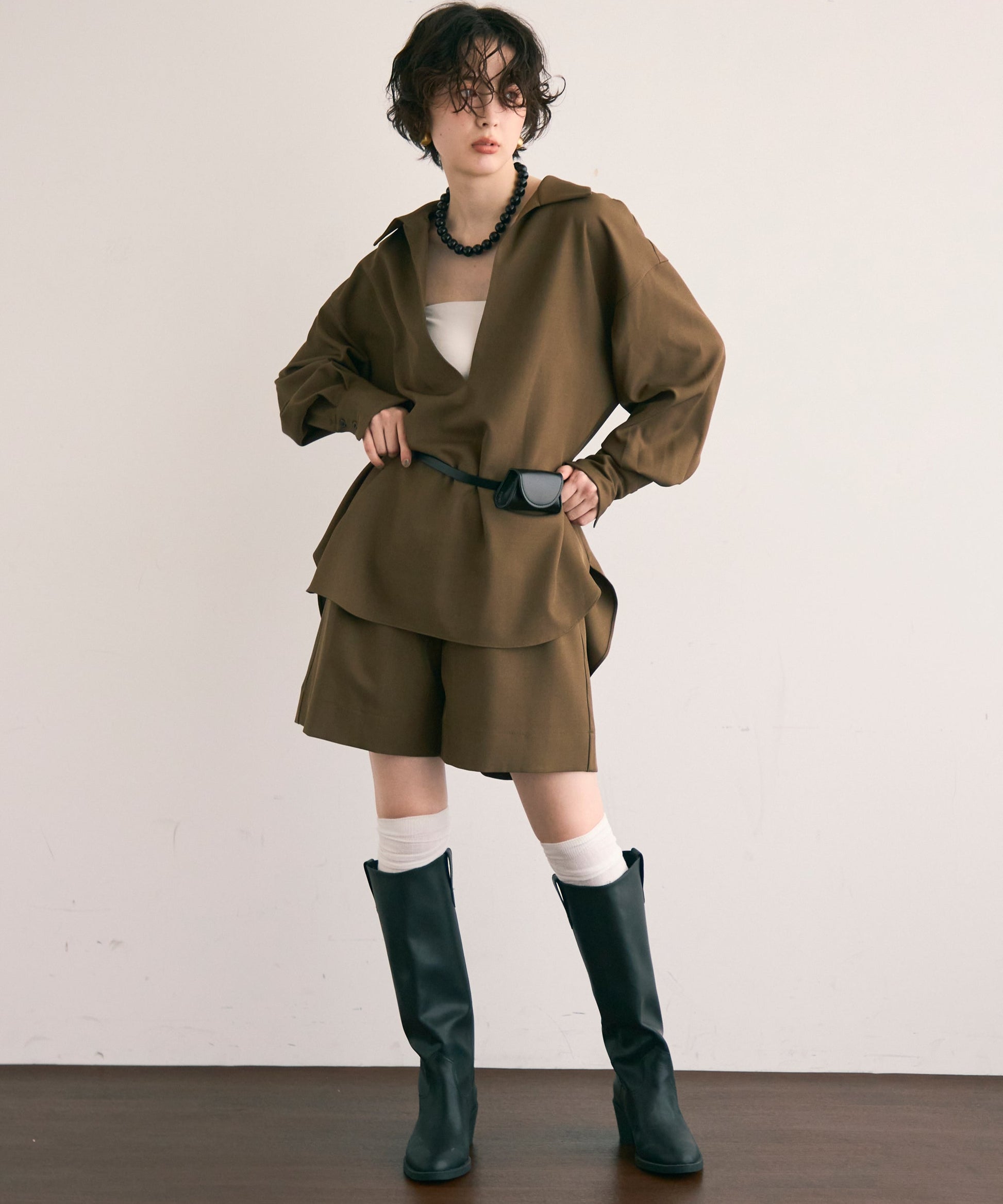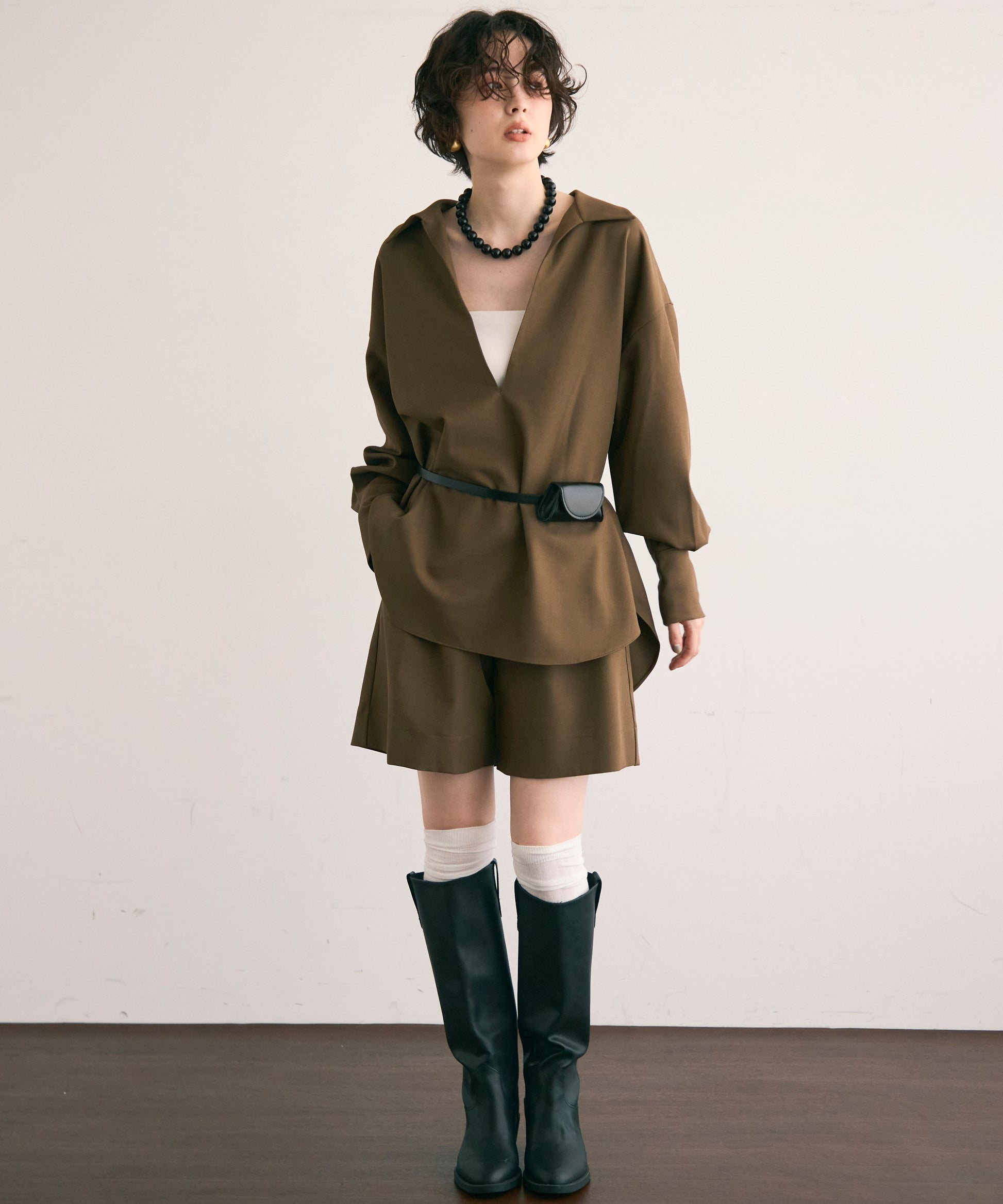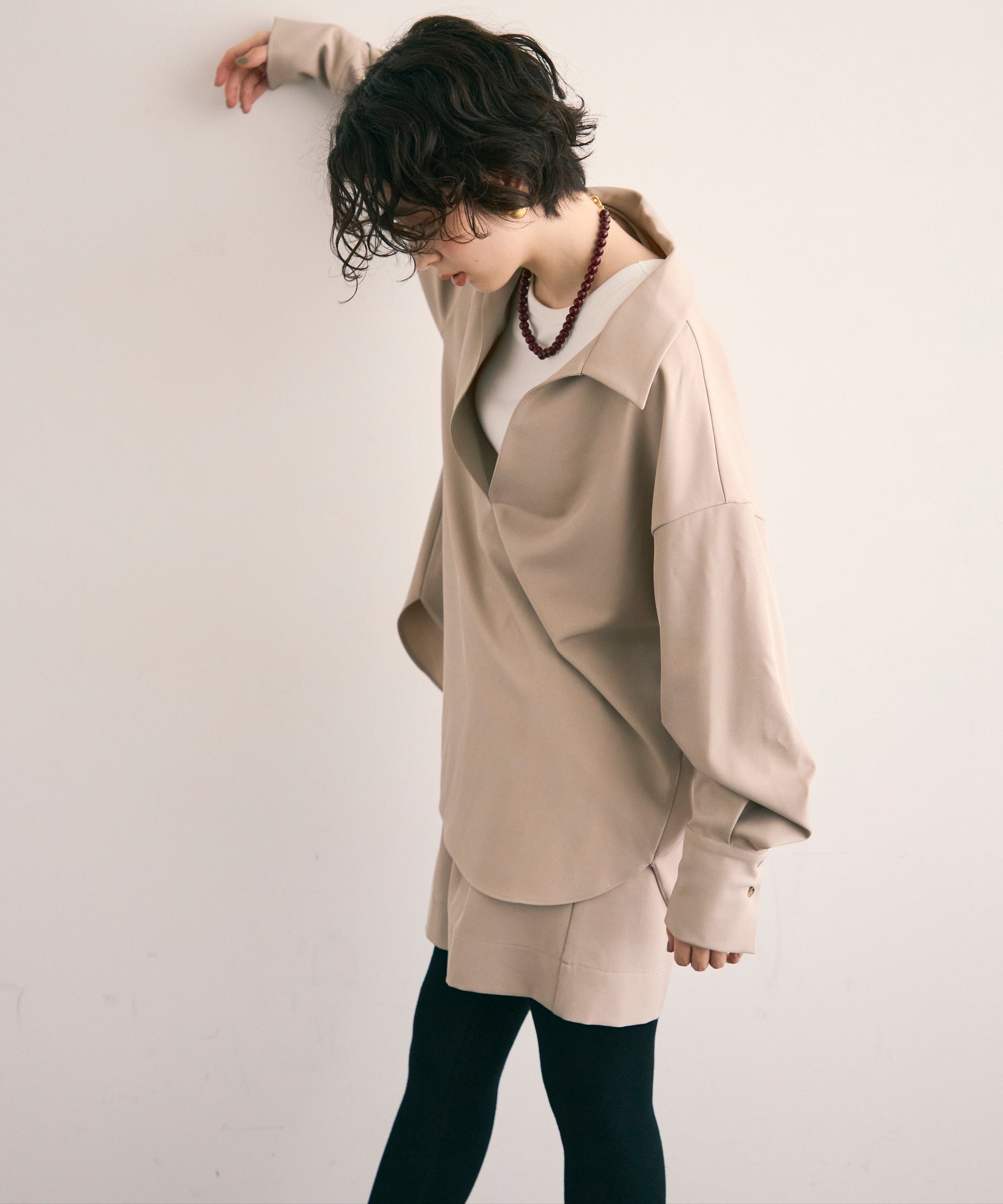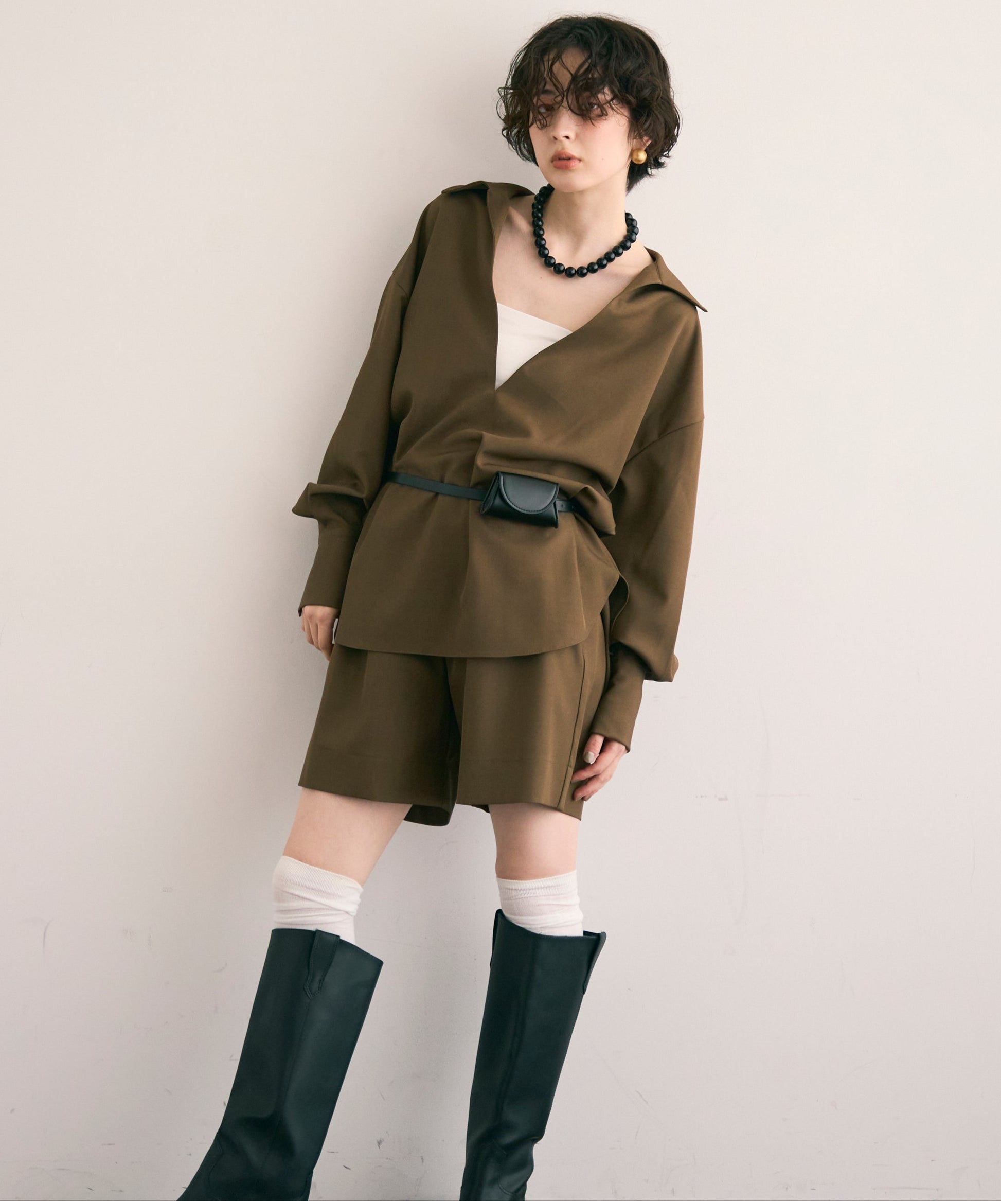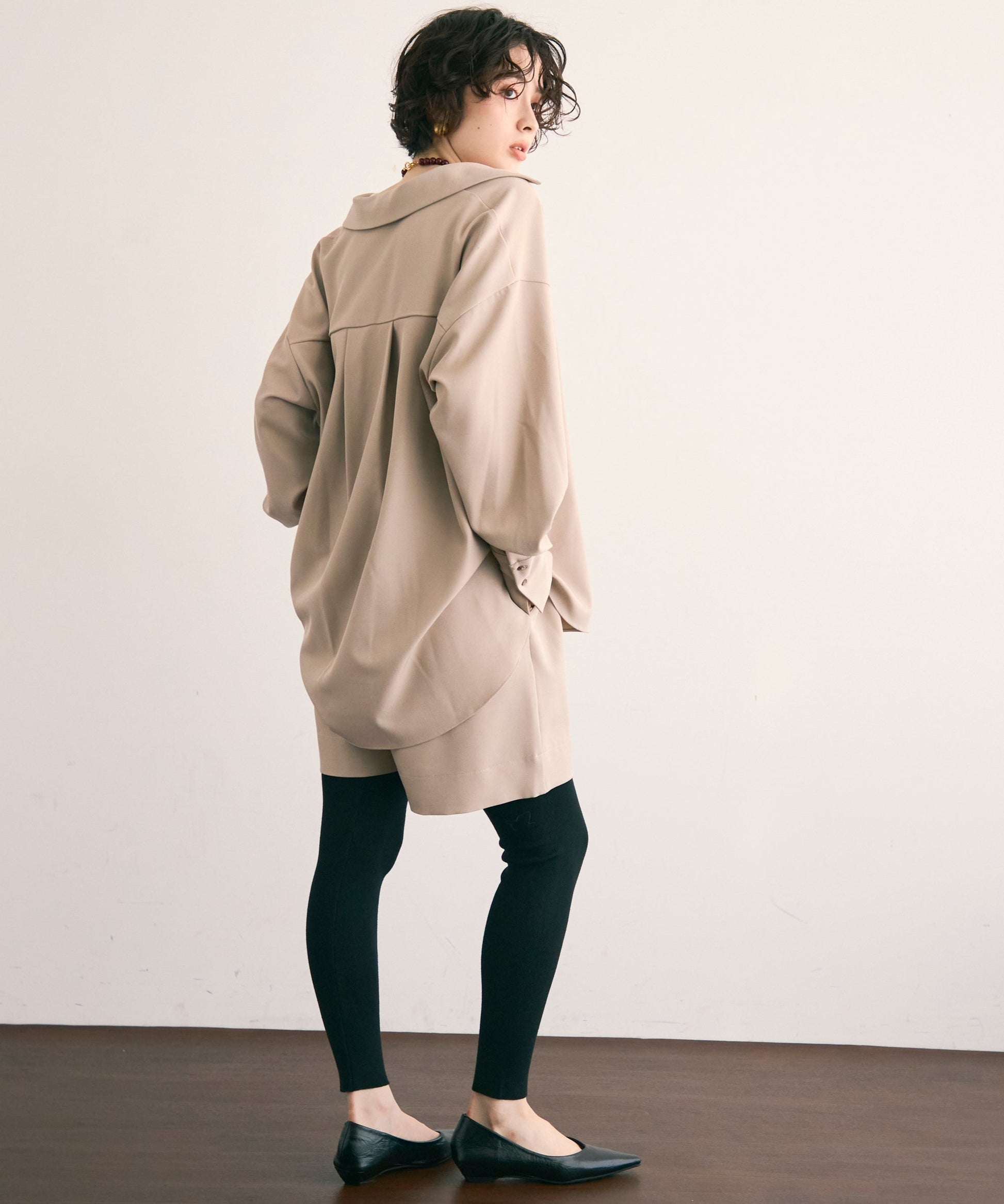 パンツ合わせでスタイリッシュに、スカート合わせでフェミニンにも着こなせる万能アイテムです。同素材のショートパンツとSETUP出来ます。