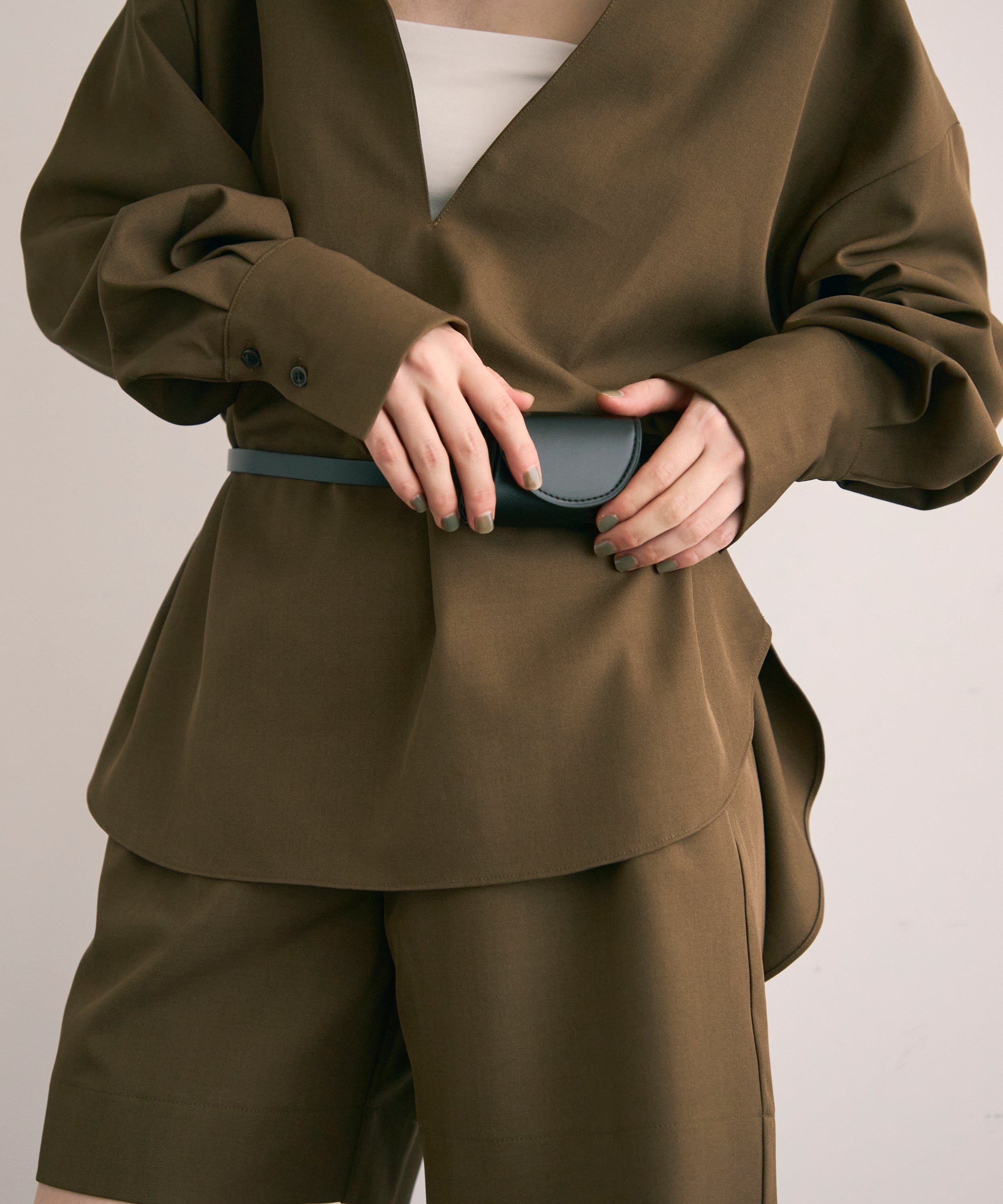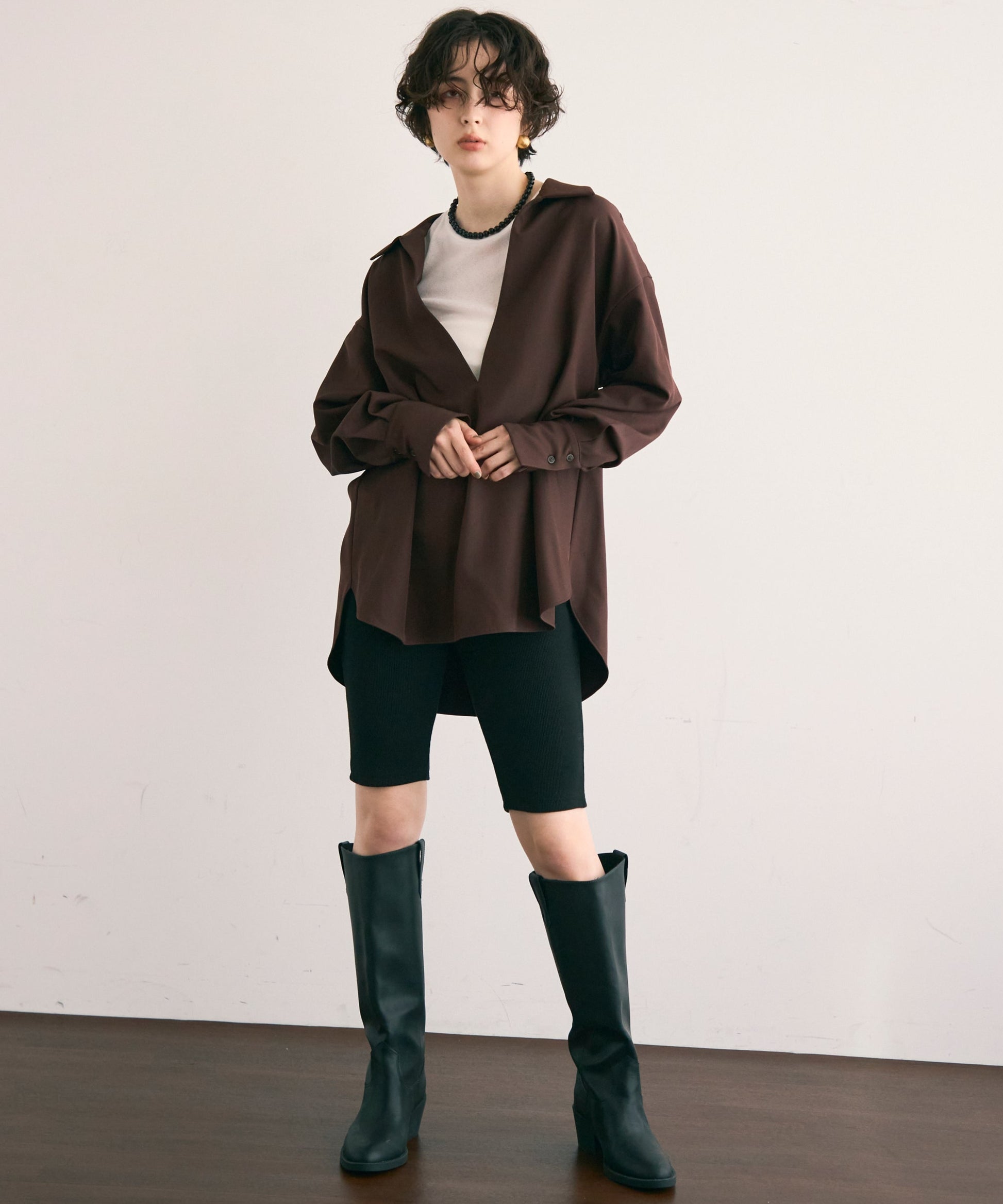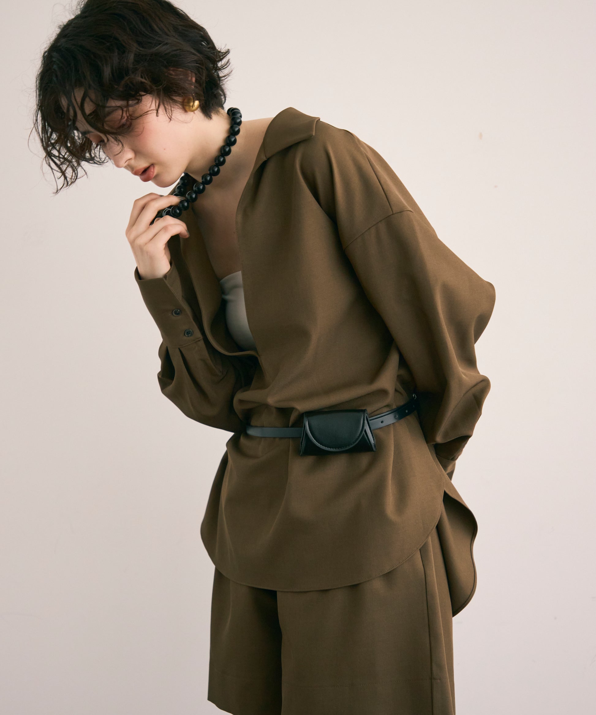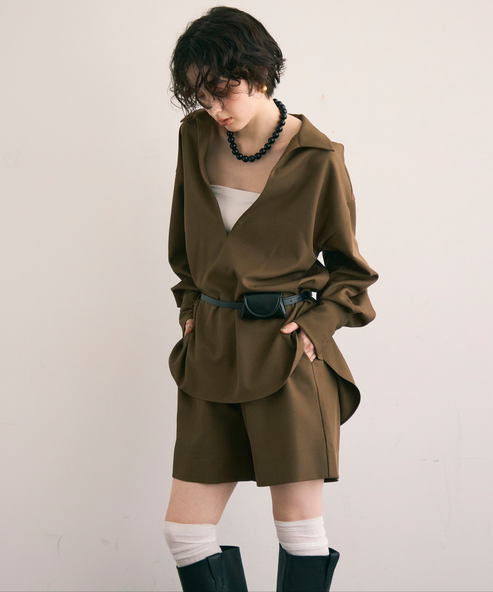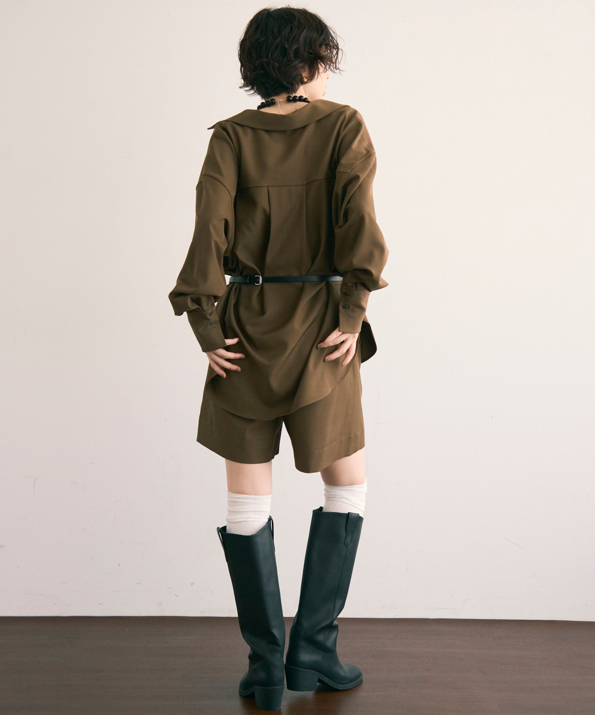パンツ合わせでスタイリッシュに、スカート合わせでフェミニンにも着こなせる万能アイテムです。同素材のショートパンツとSETUP出来ます。