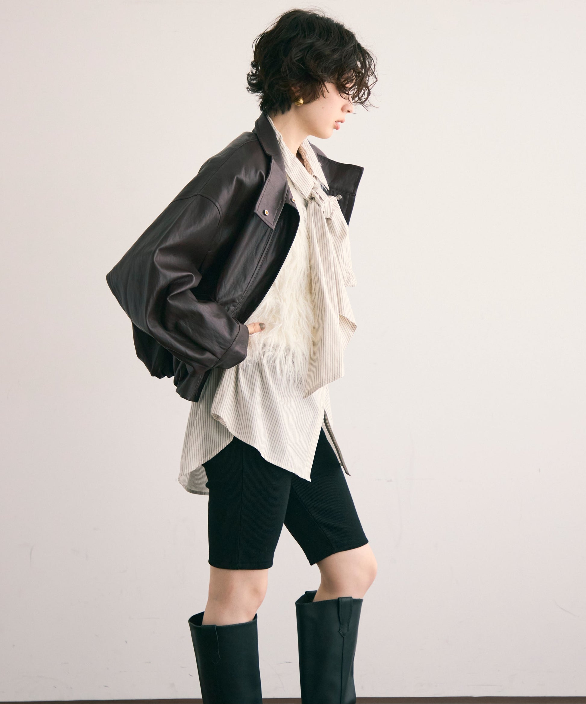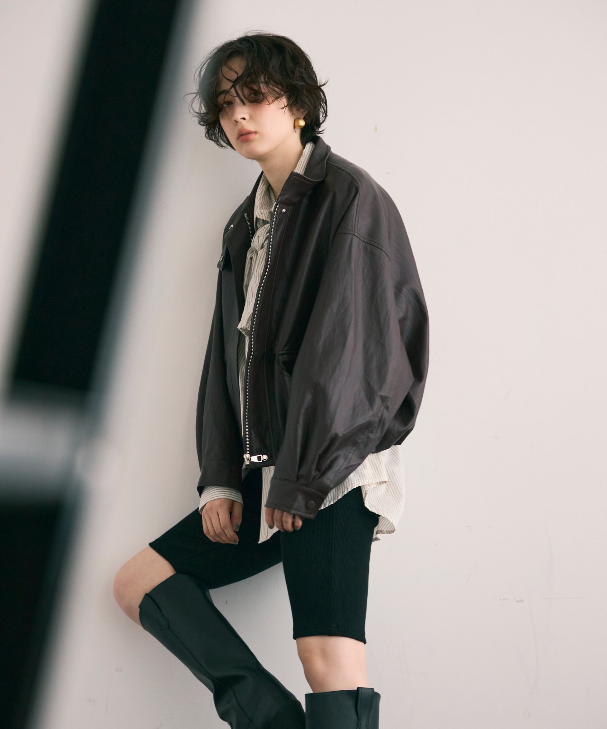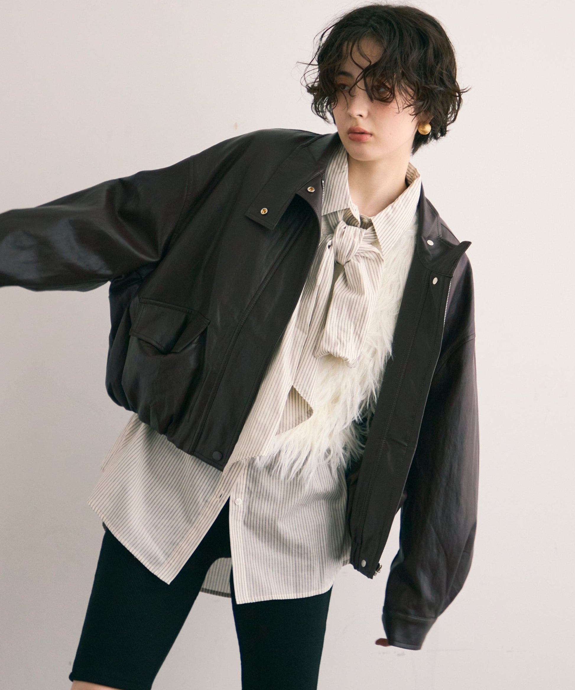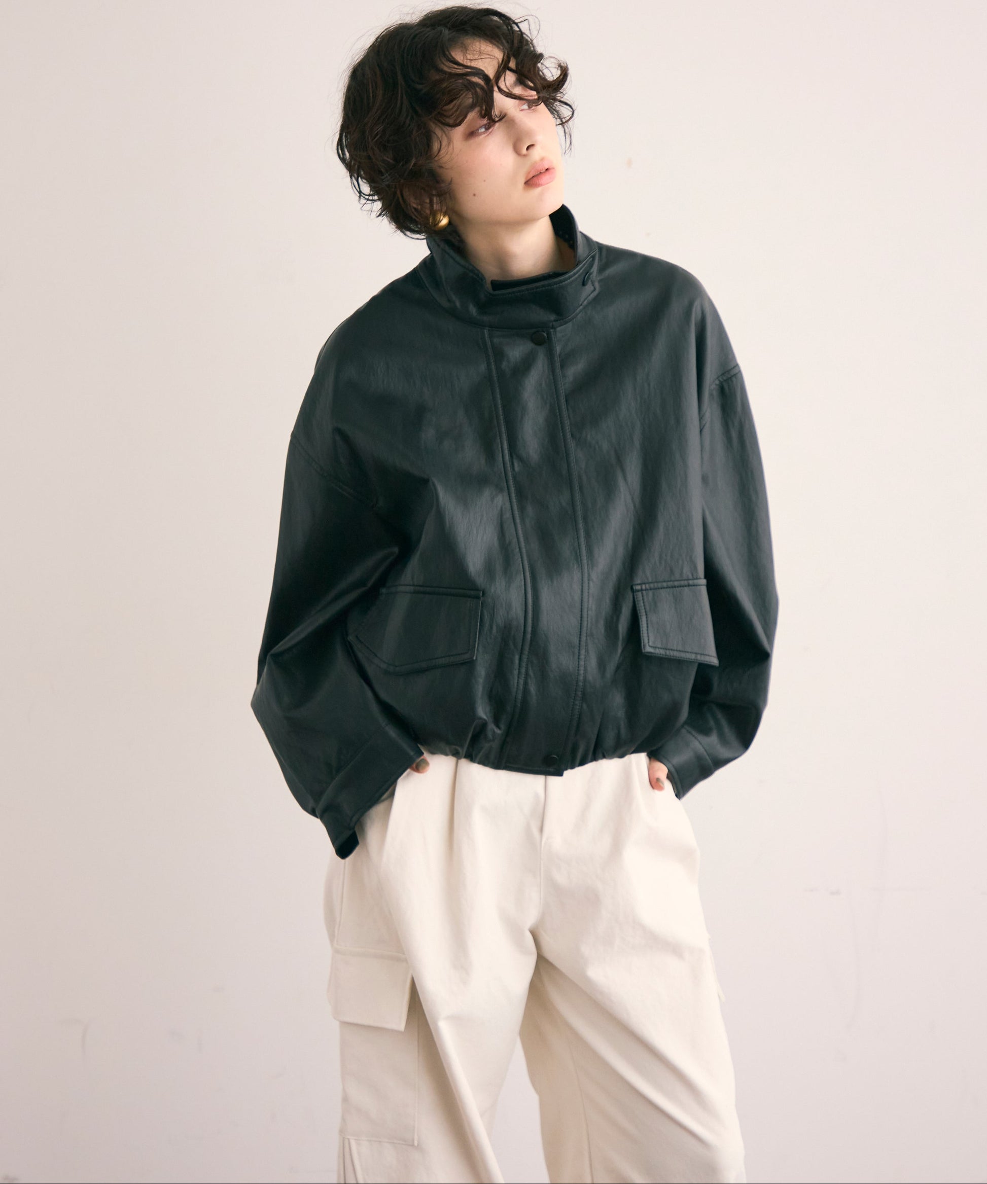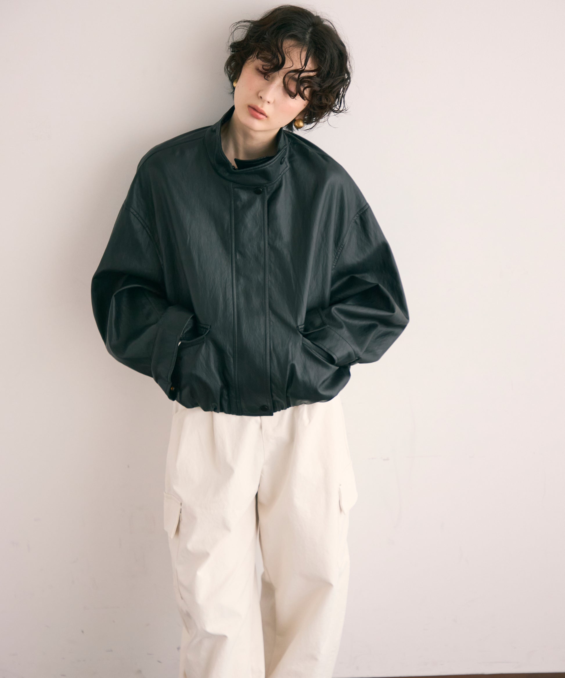 しなやかな風合いのソフトヴィーガンレザーを使用した、トレンド感漂うミドル丈ブルゾン。