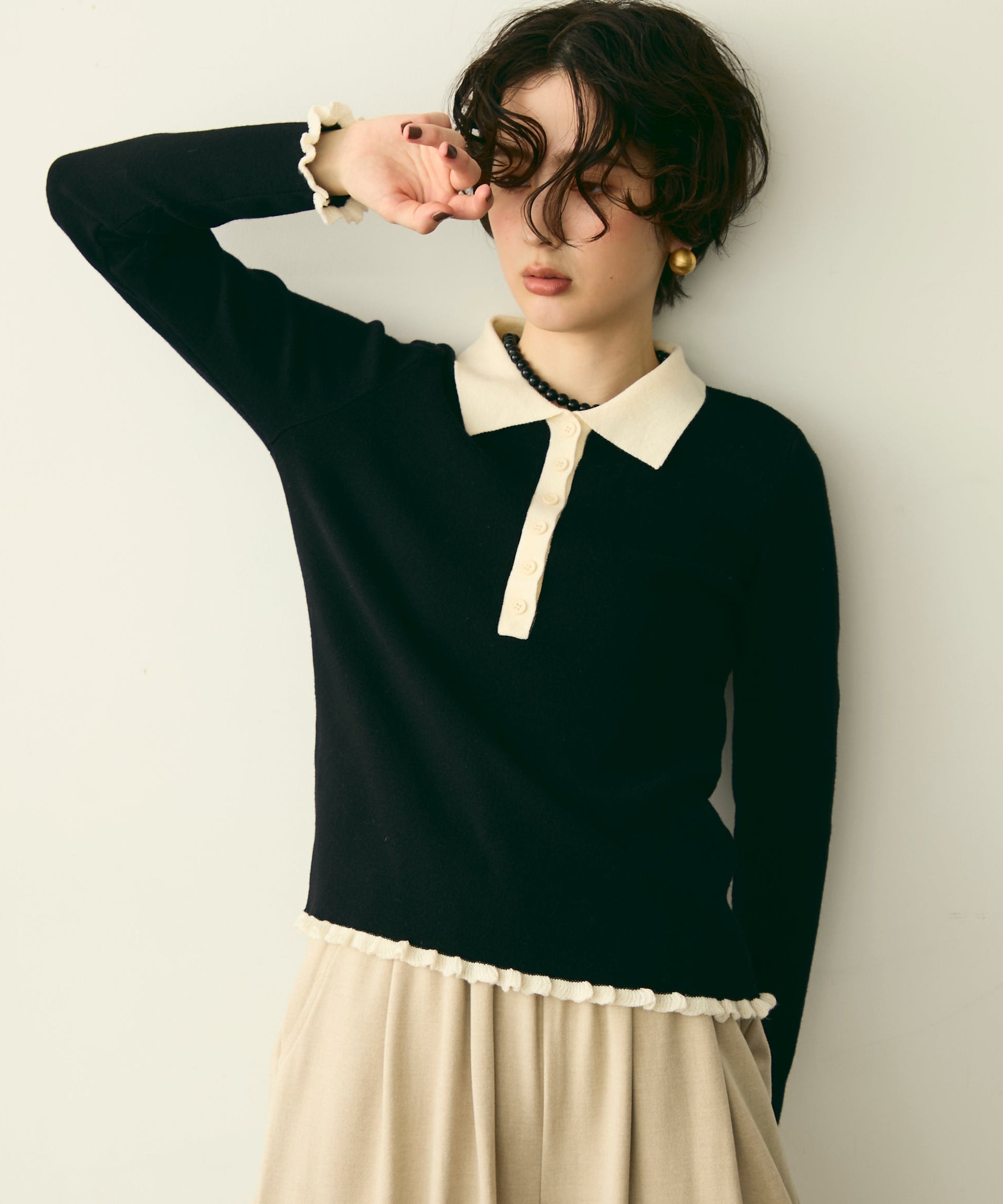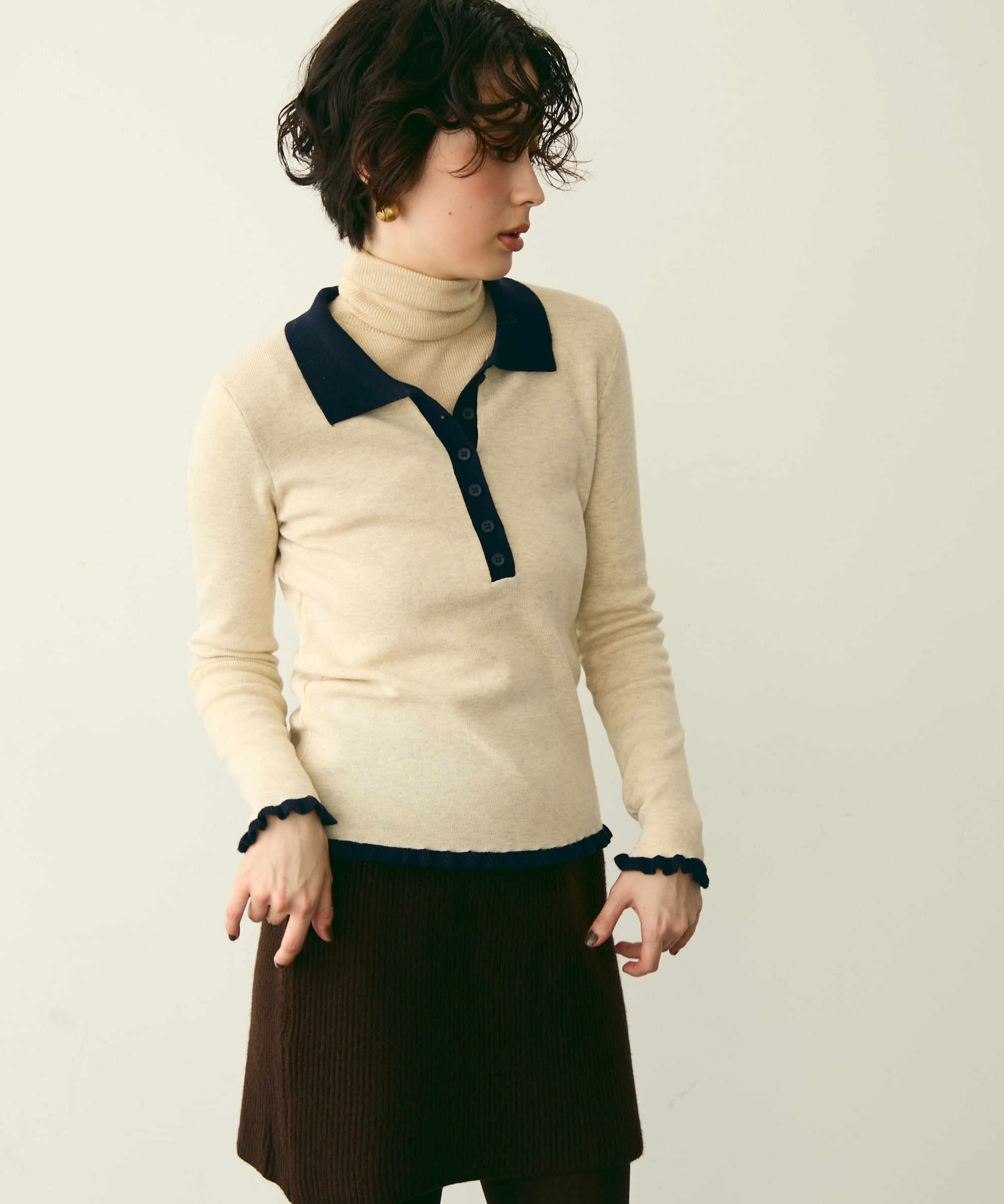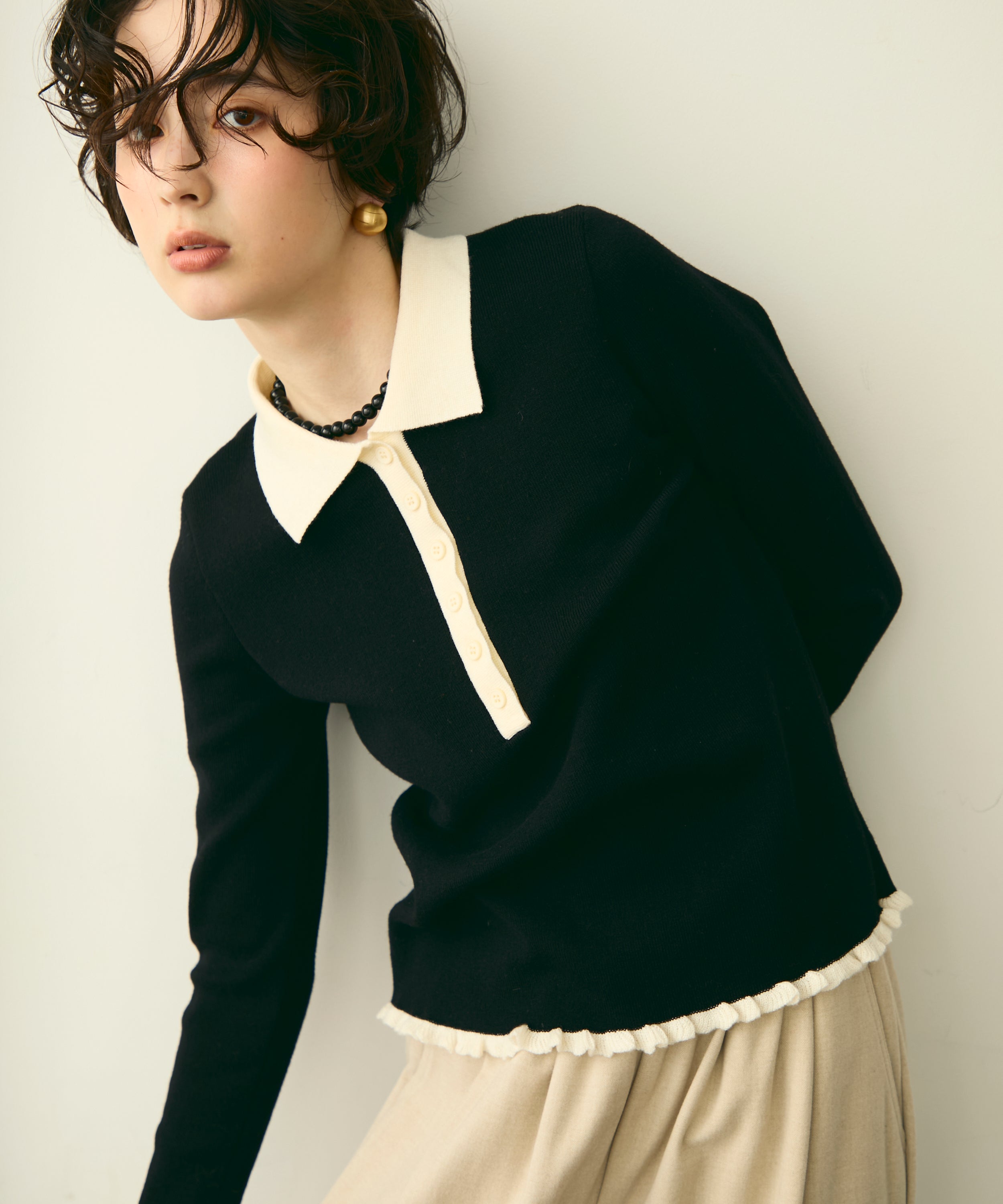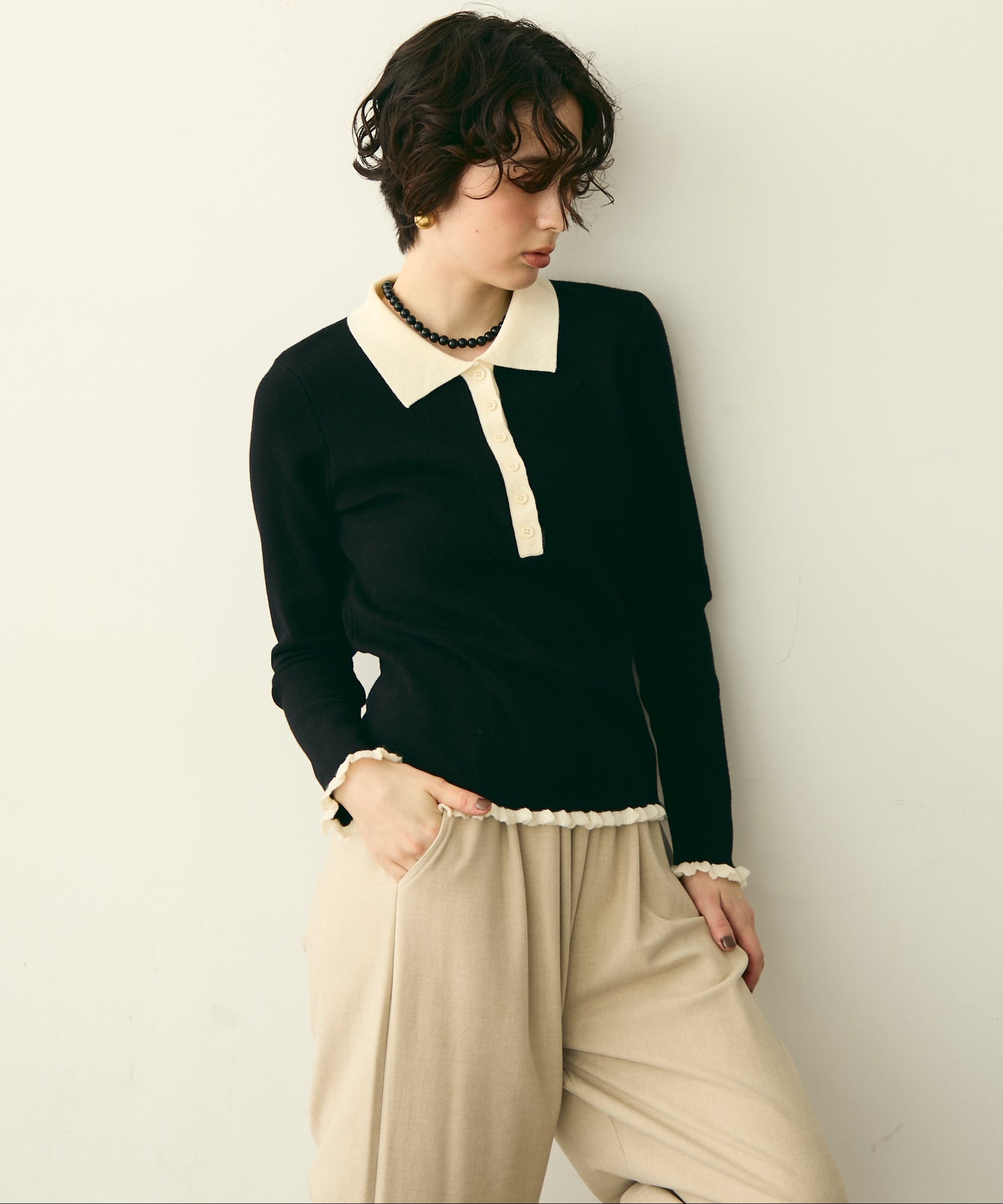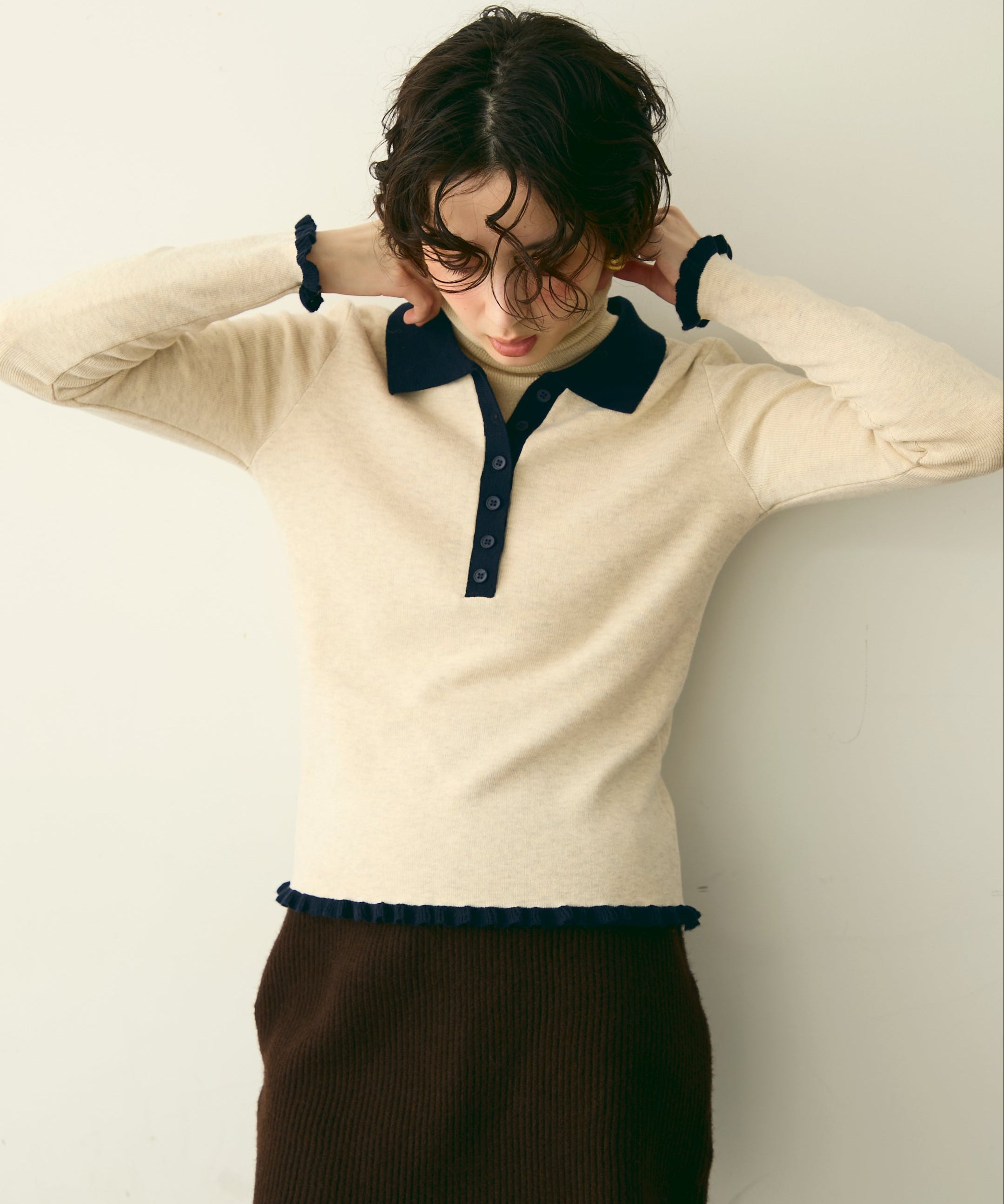 バイカラーポロ襟フリルヘムニットプルオーバー