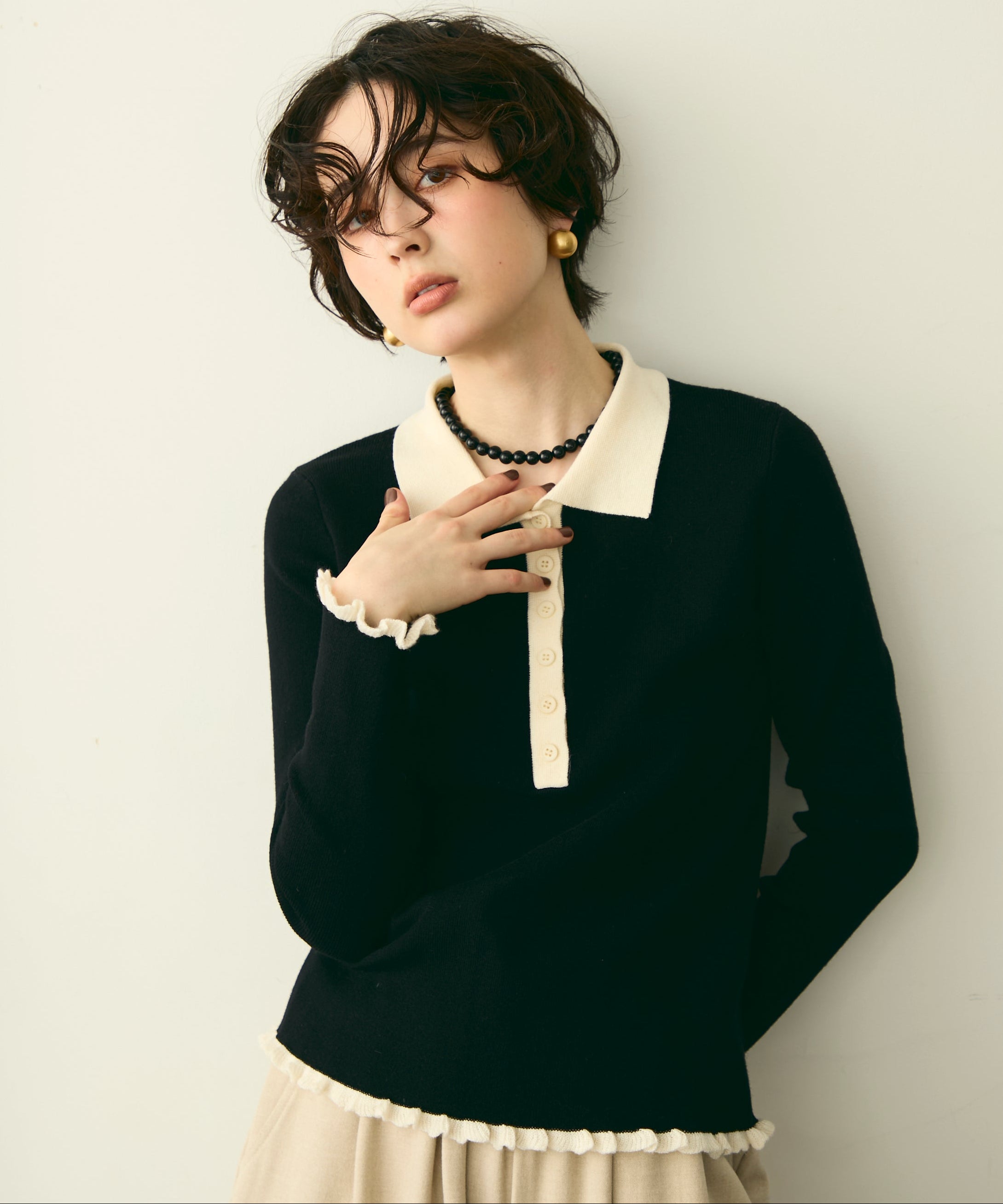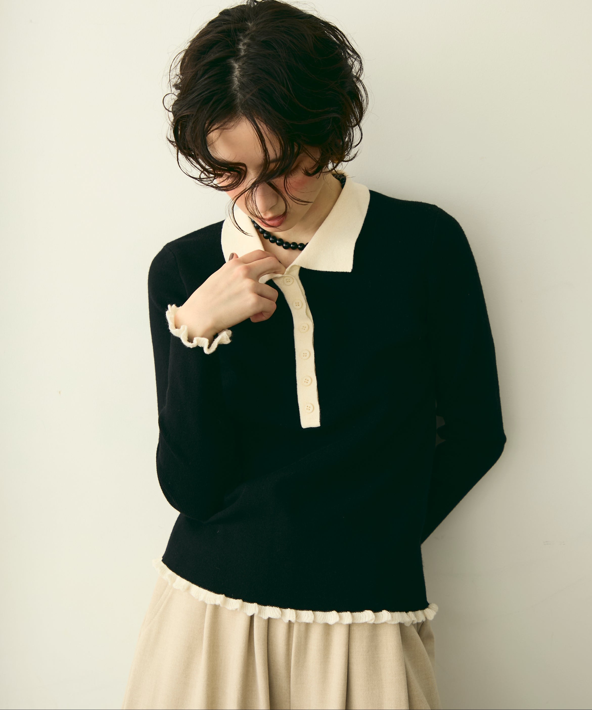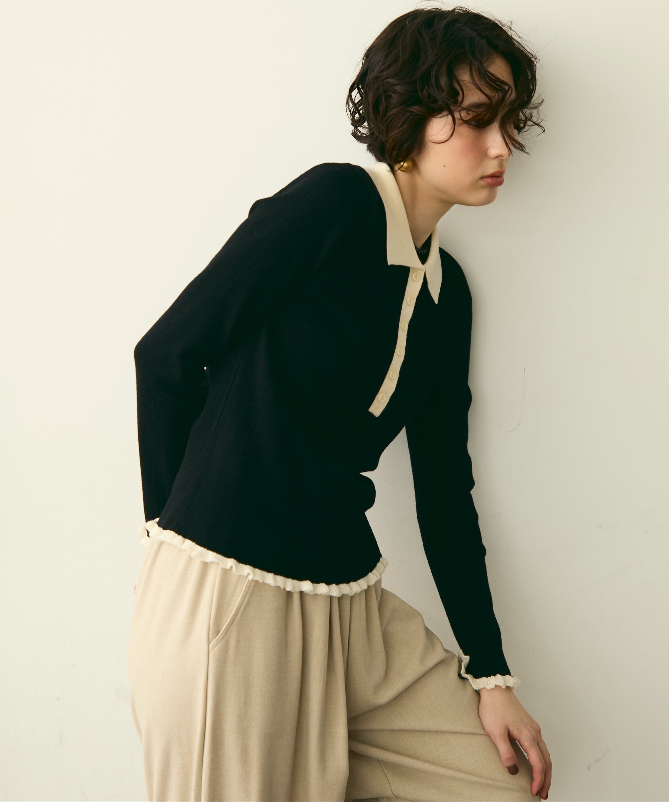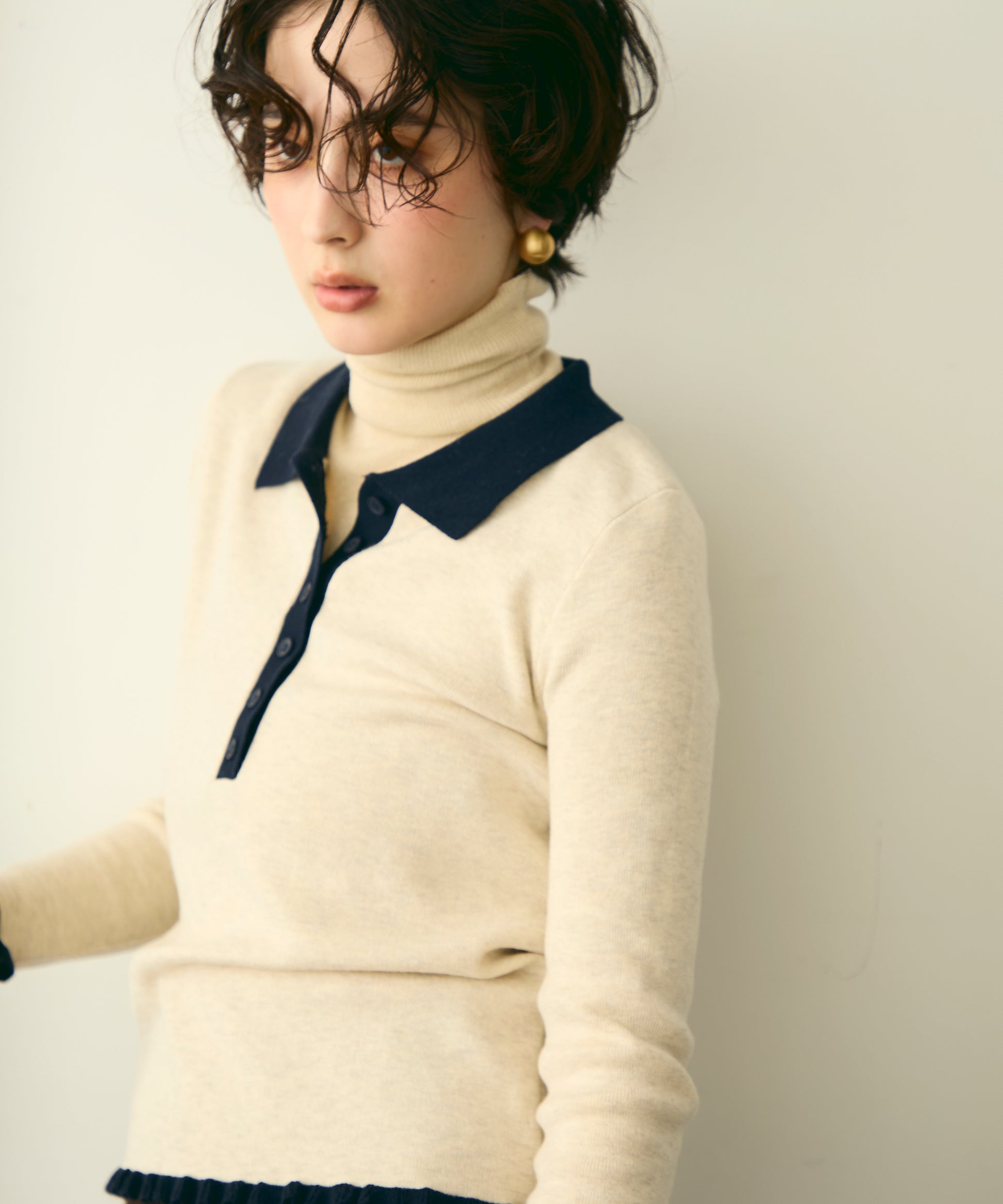 バイカラーポロ襟フリルヘムニットプルオーバー