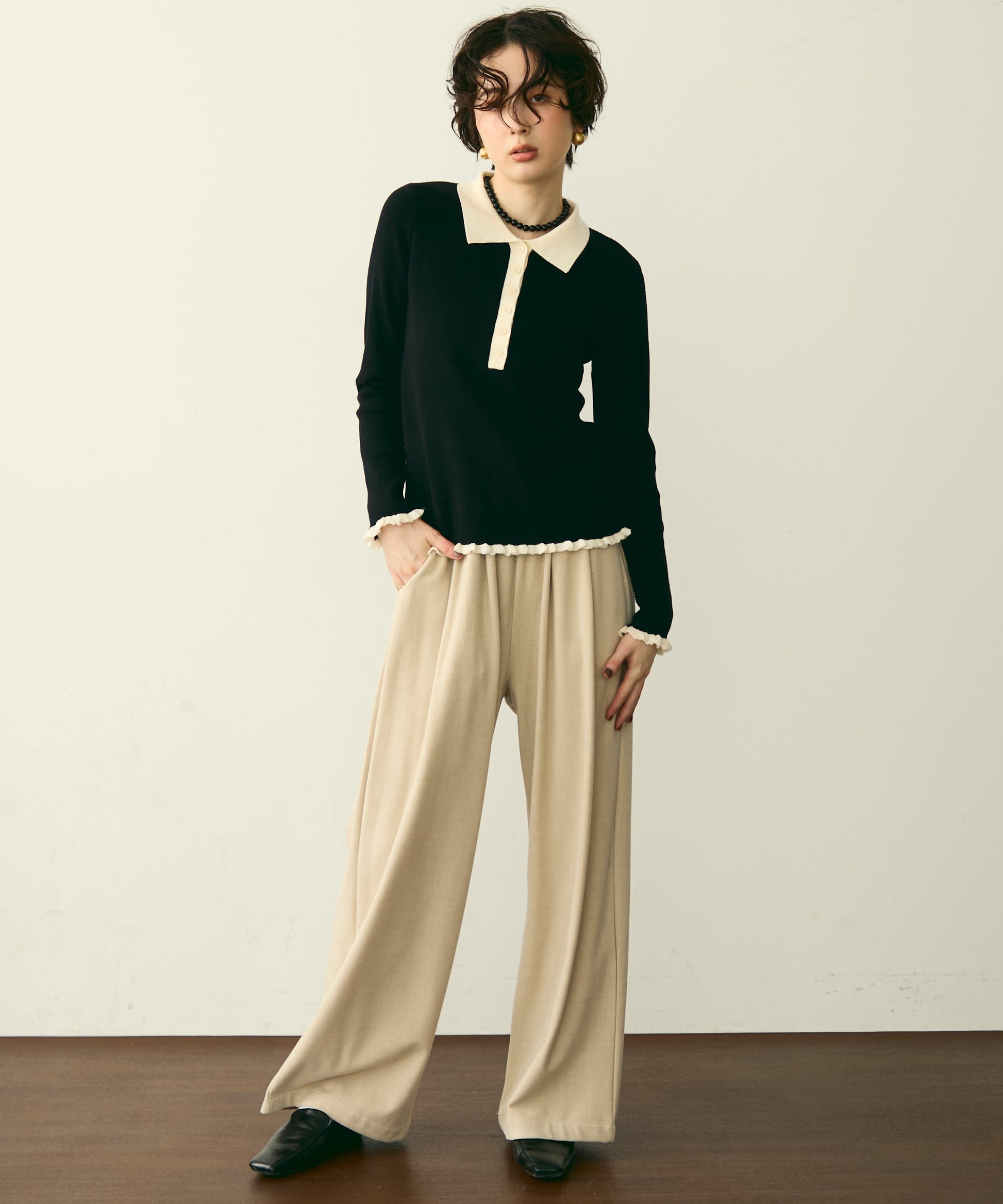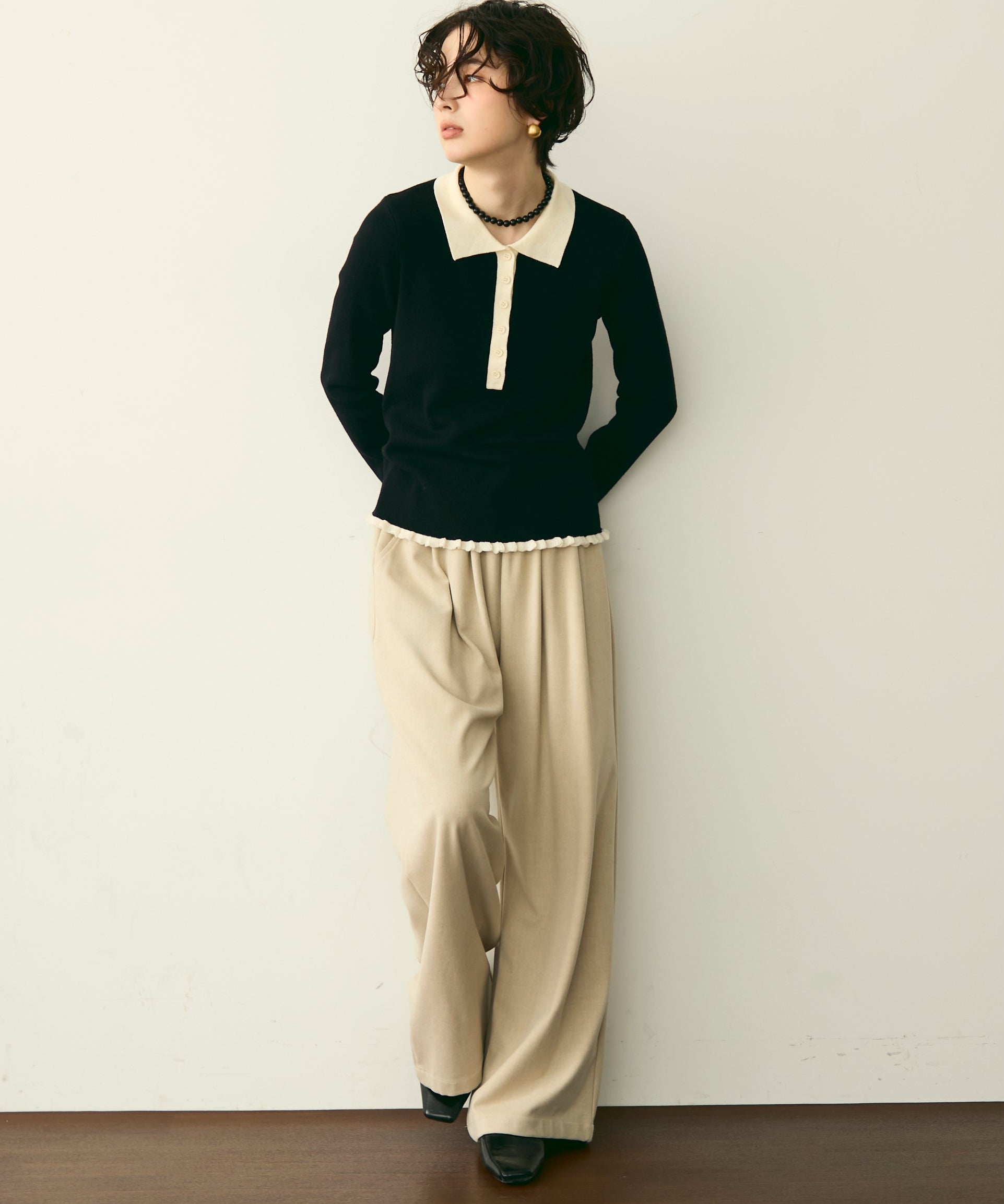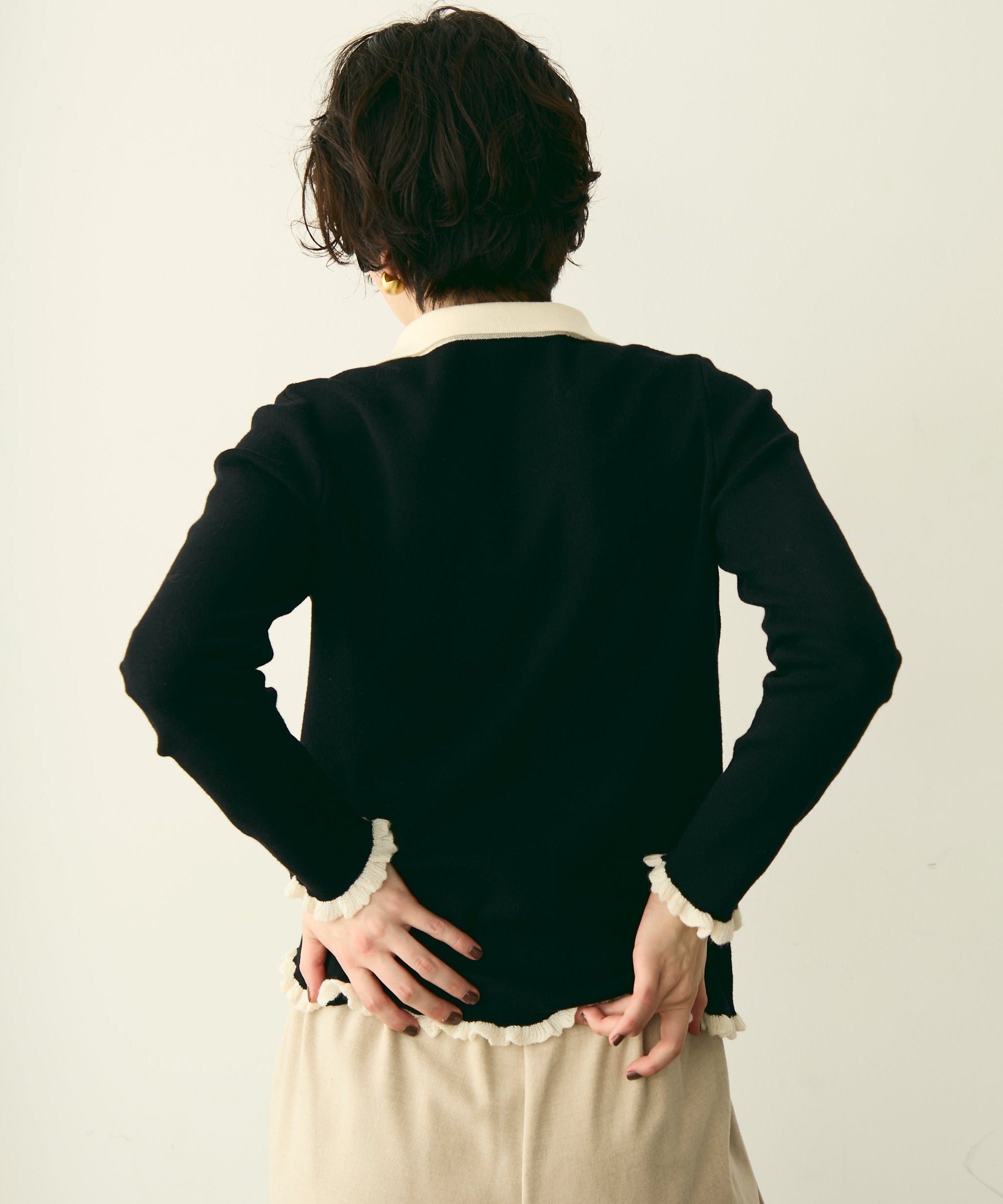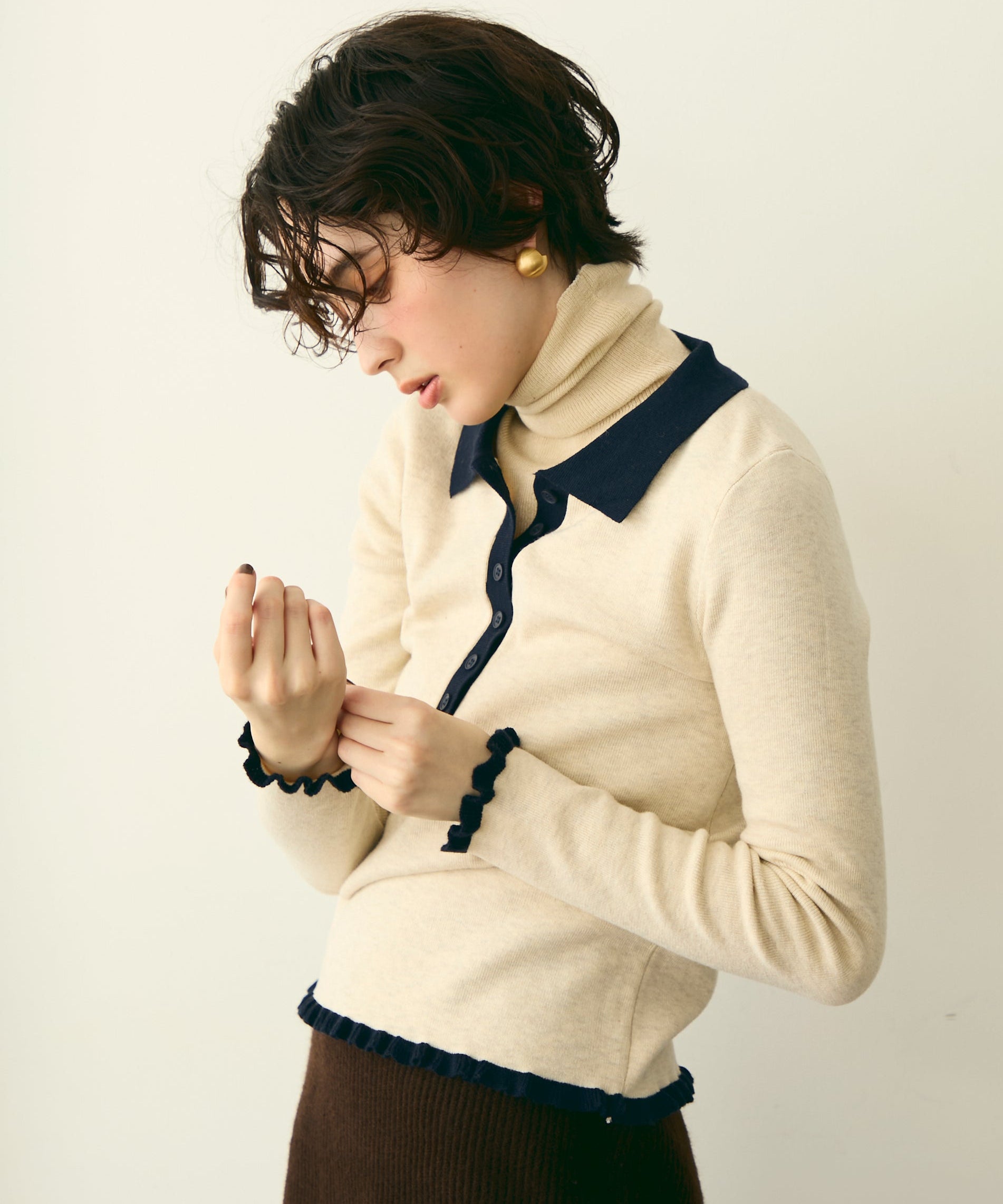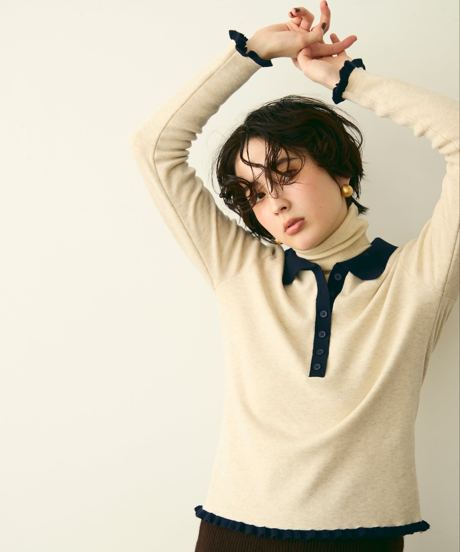 バイカラーポロ襟フリルヘムニットプルオーバー