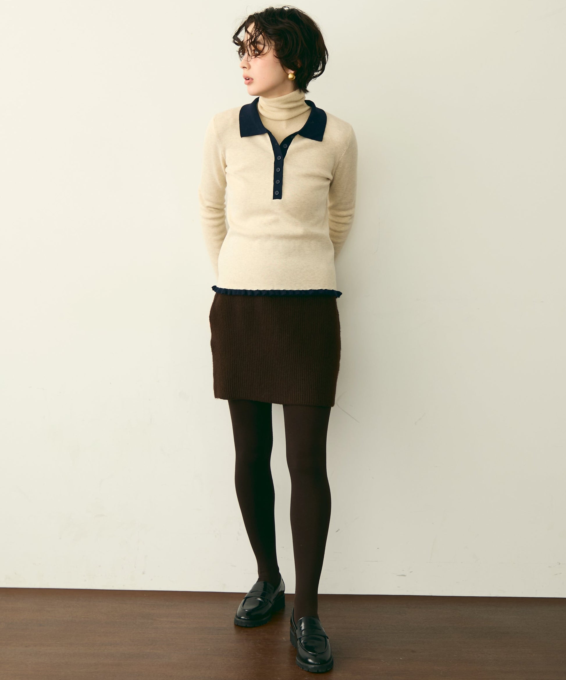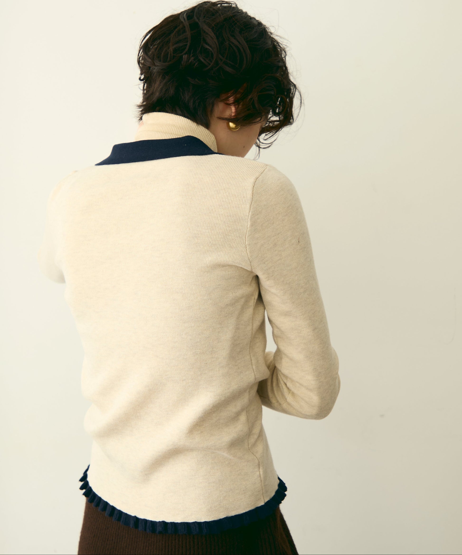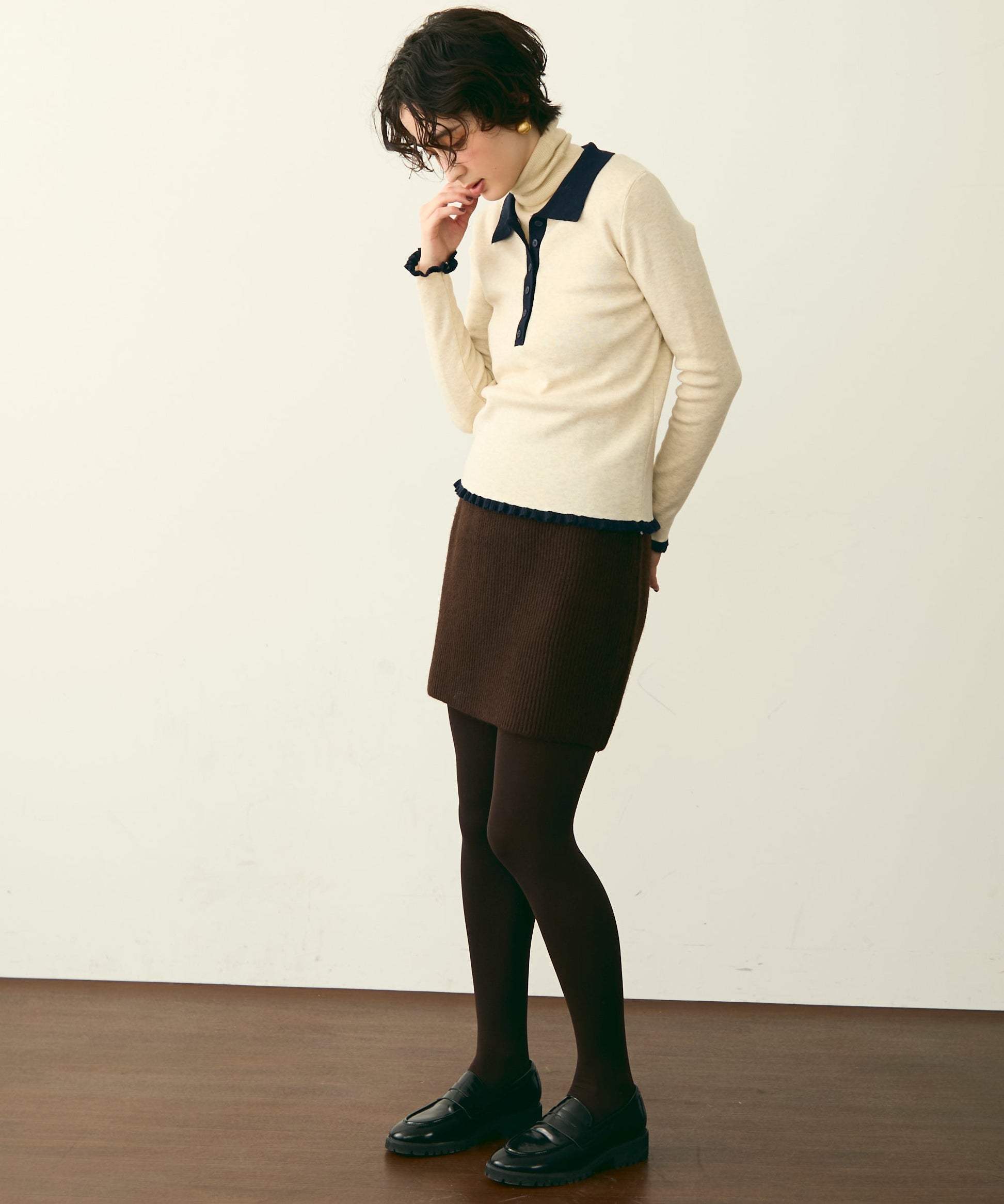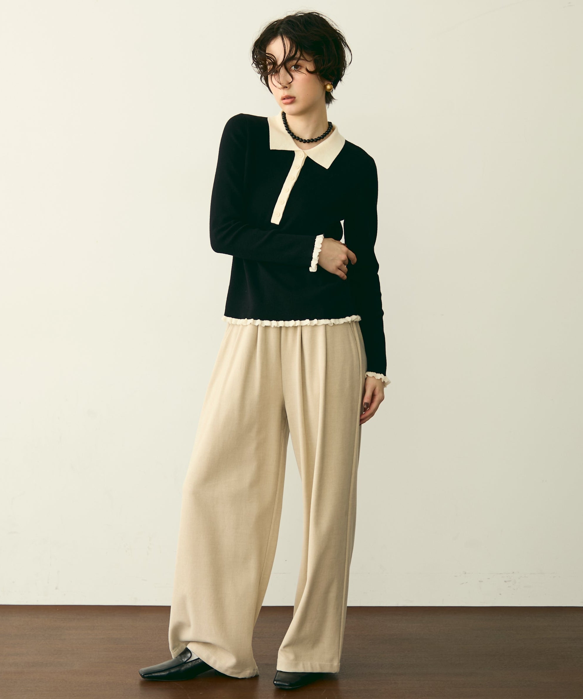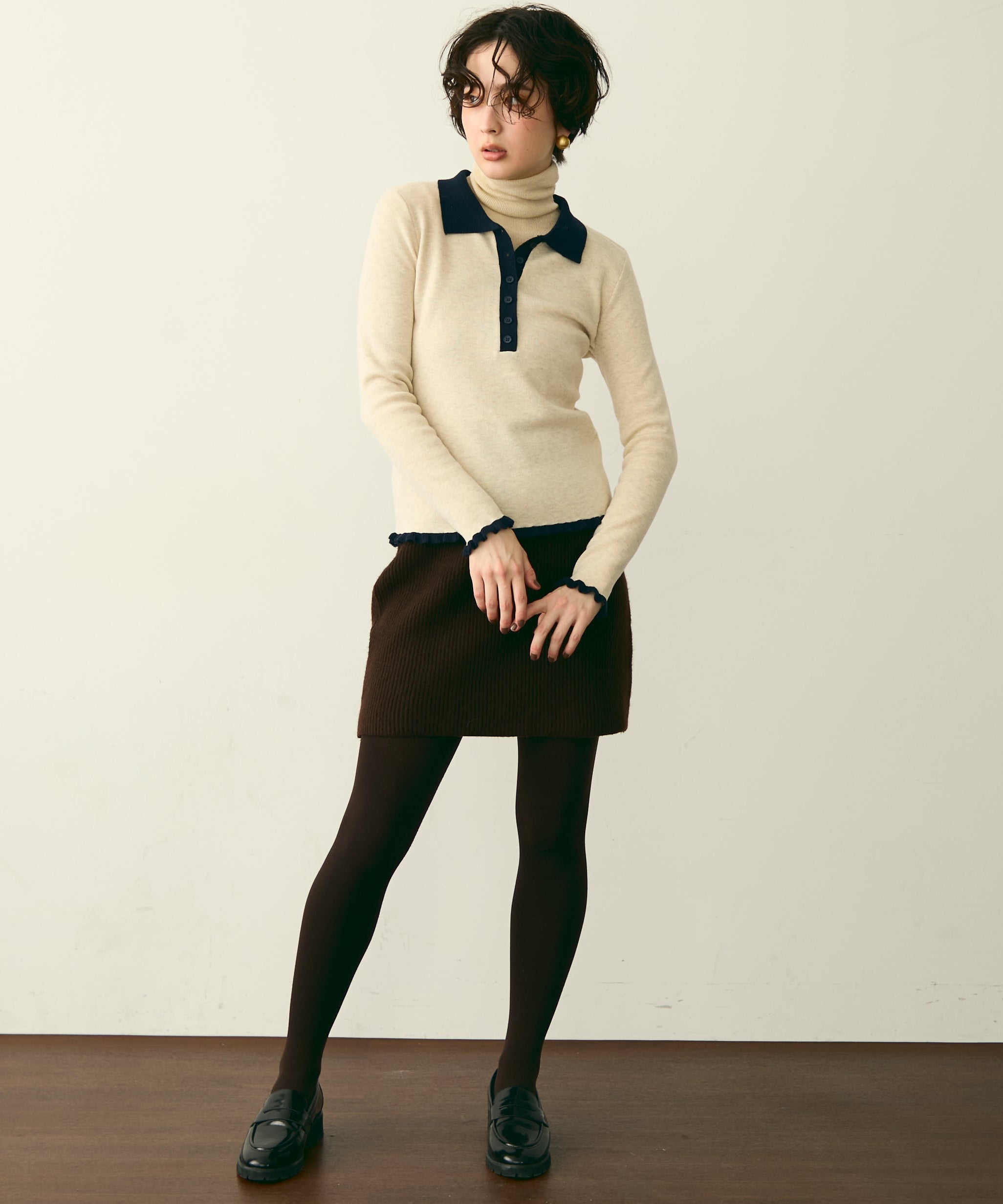 バイカラーポロ襟フリルヘムニットプルオーバー