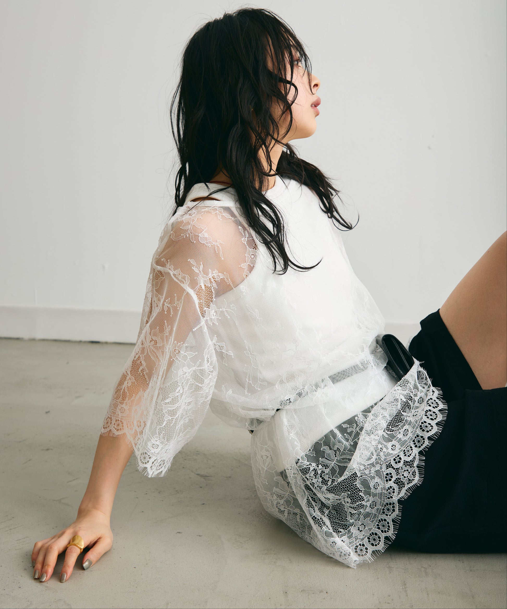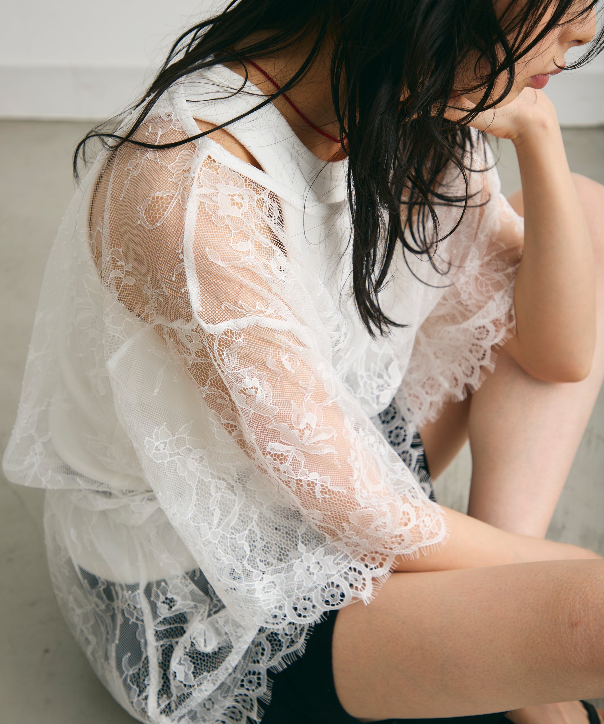 繊細な総レースが華やかさを引き立てるオーバーTシャツ。??