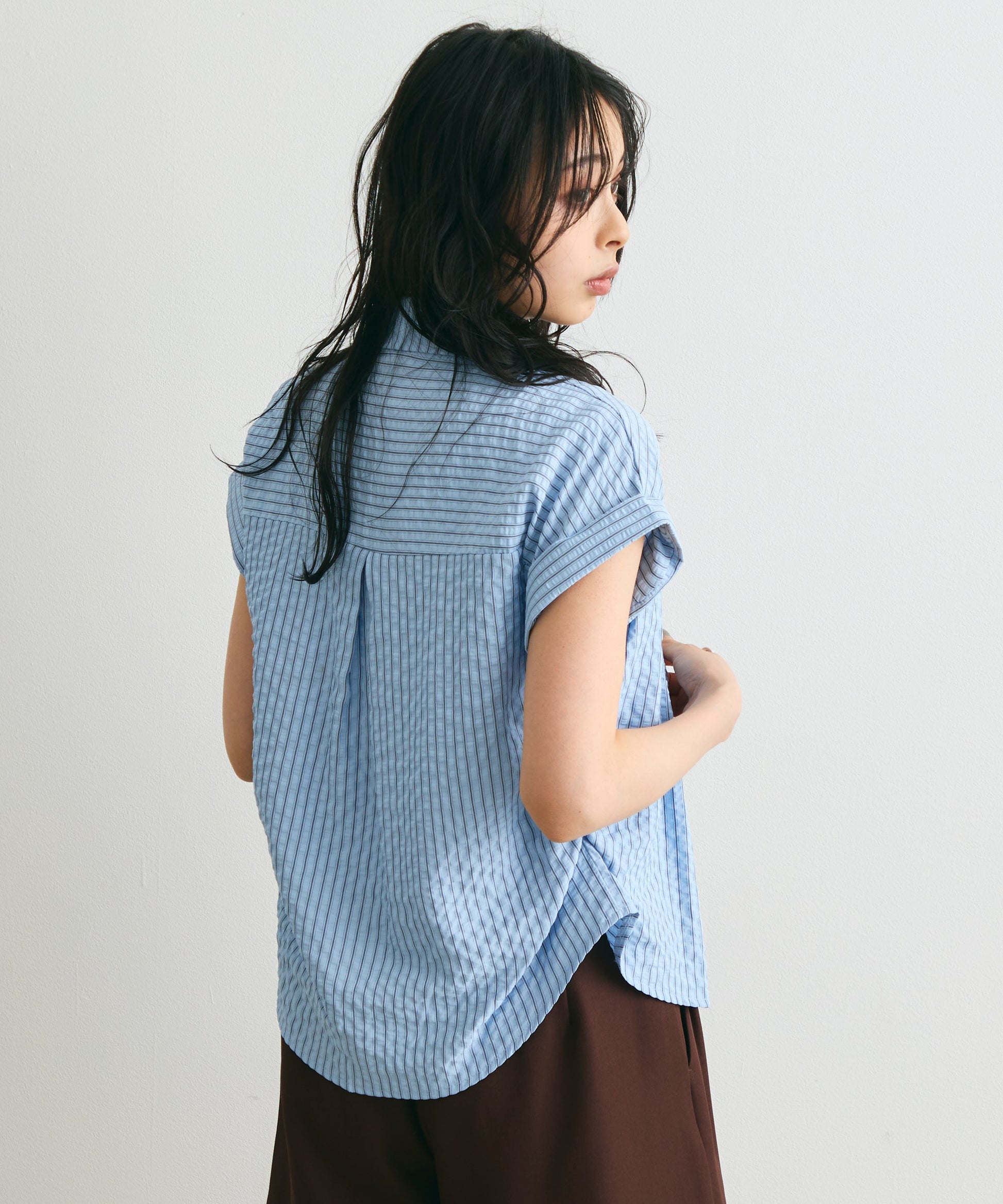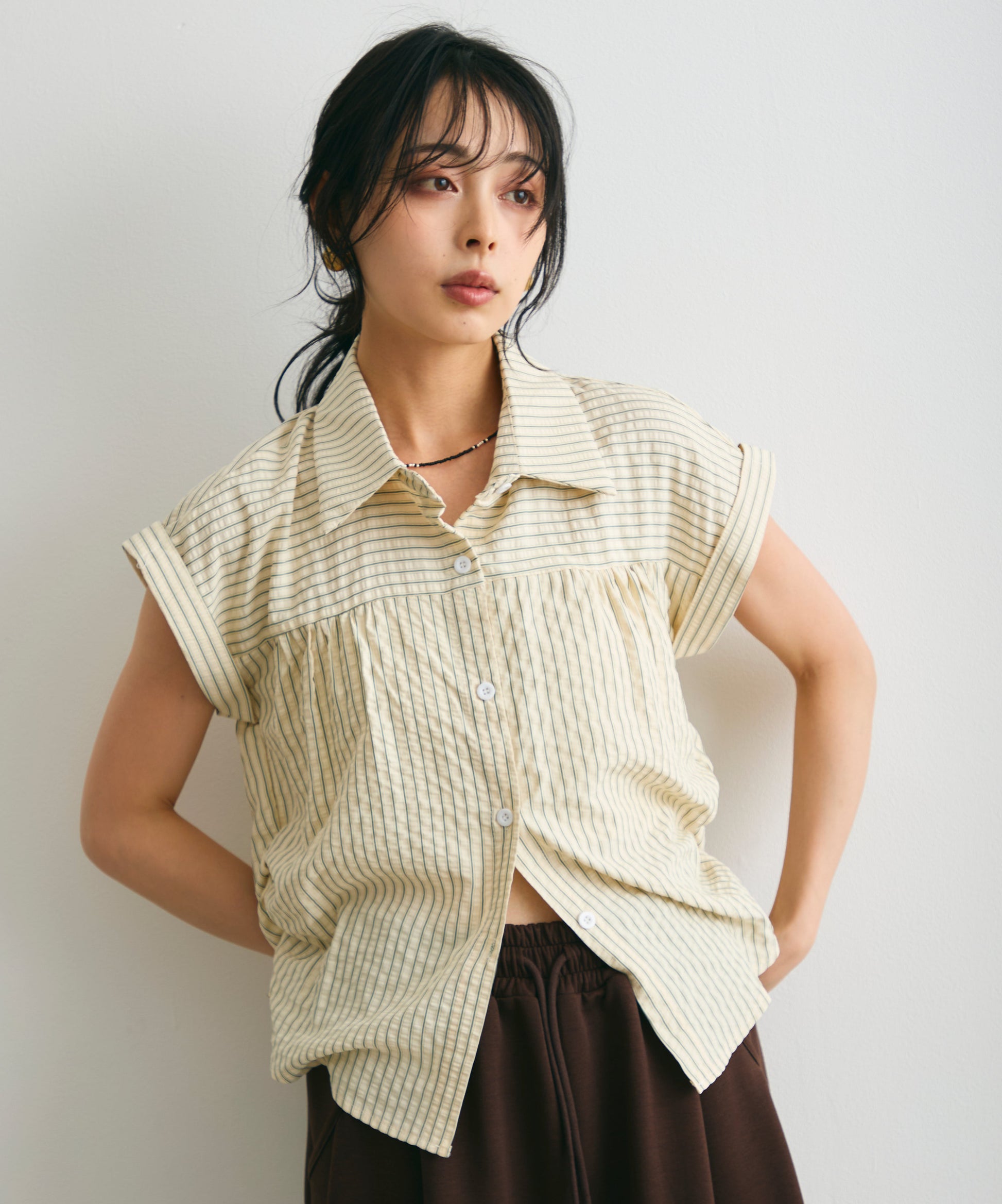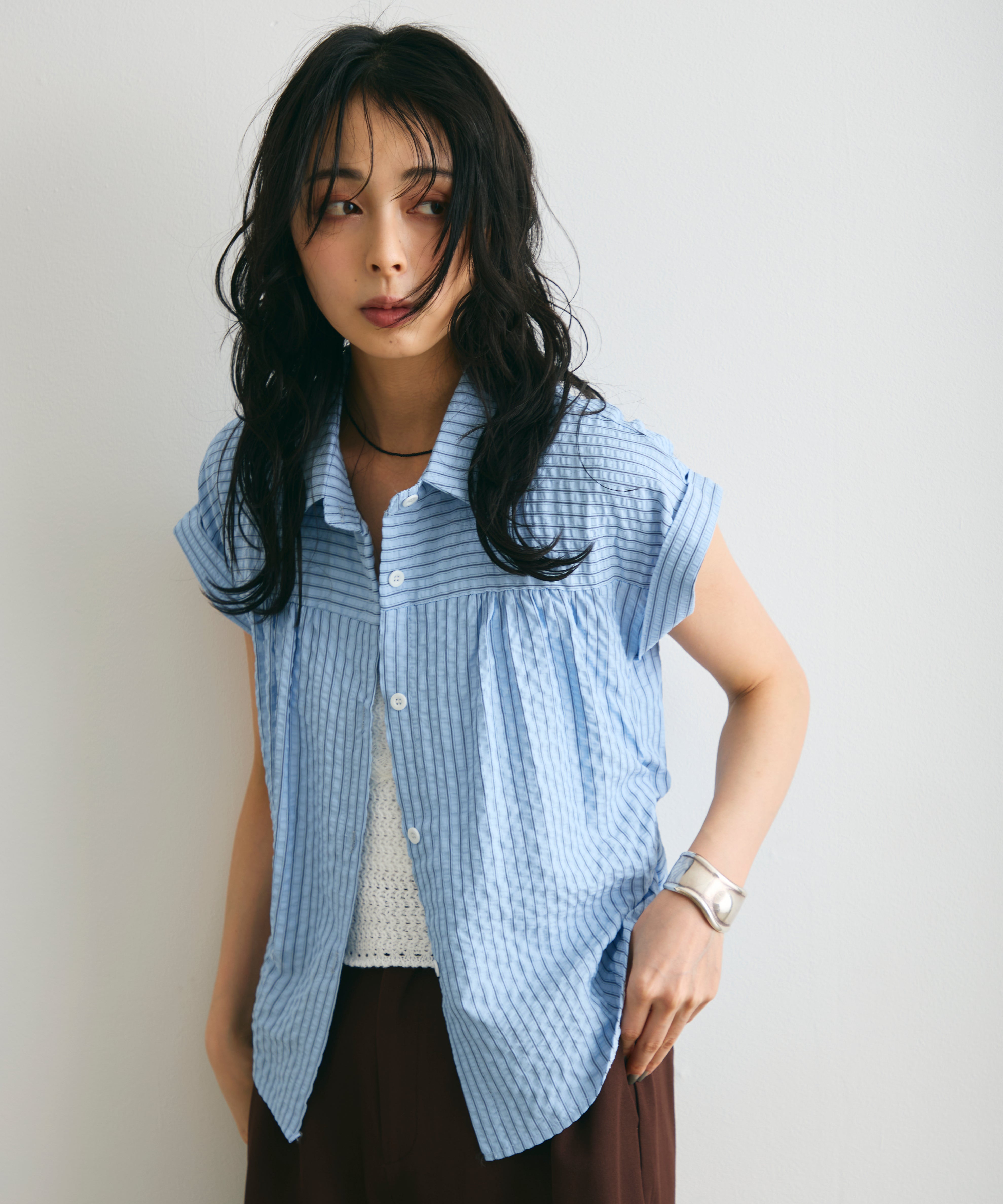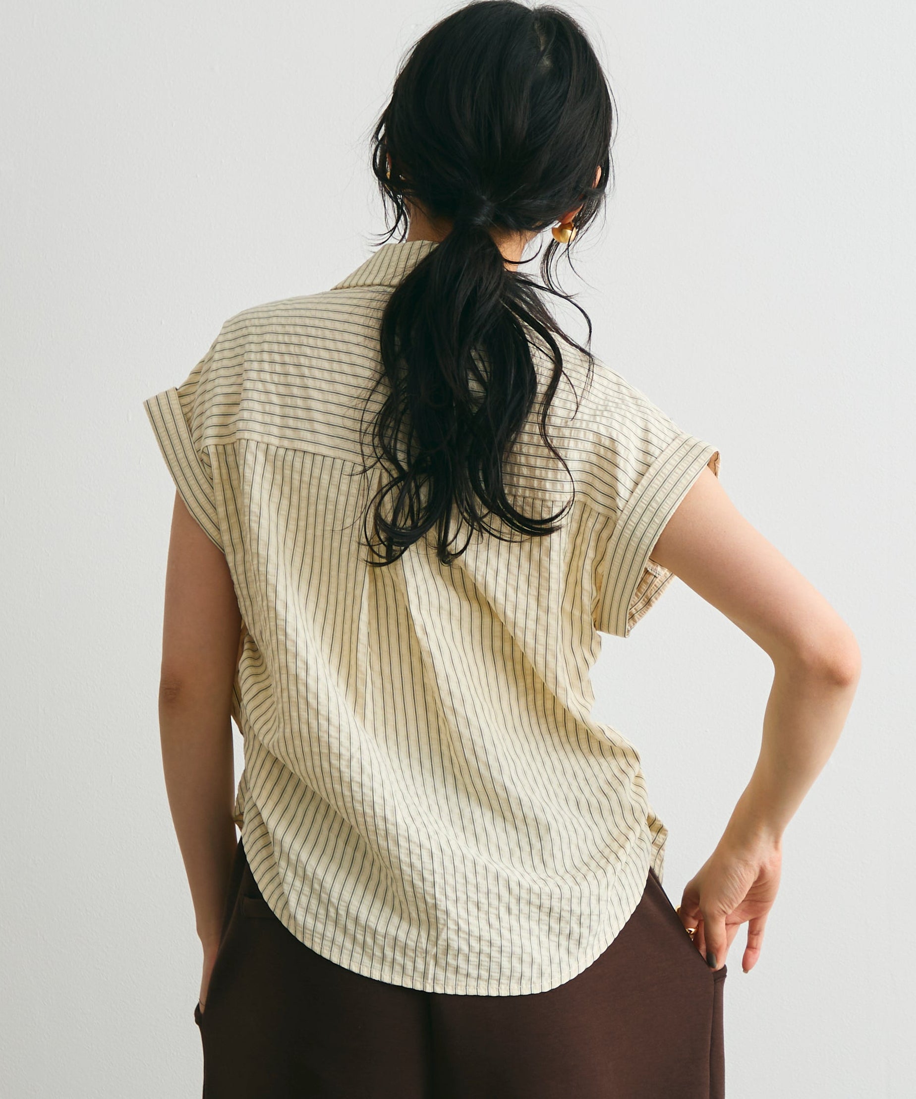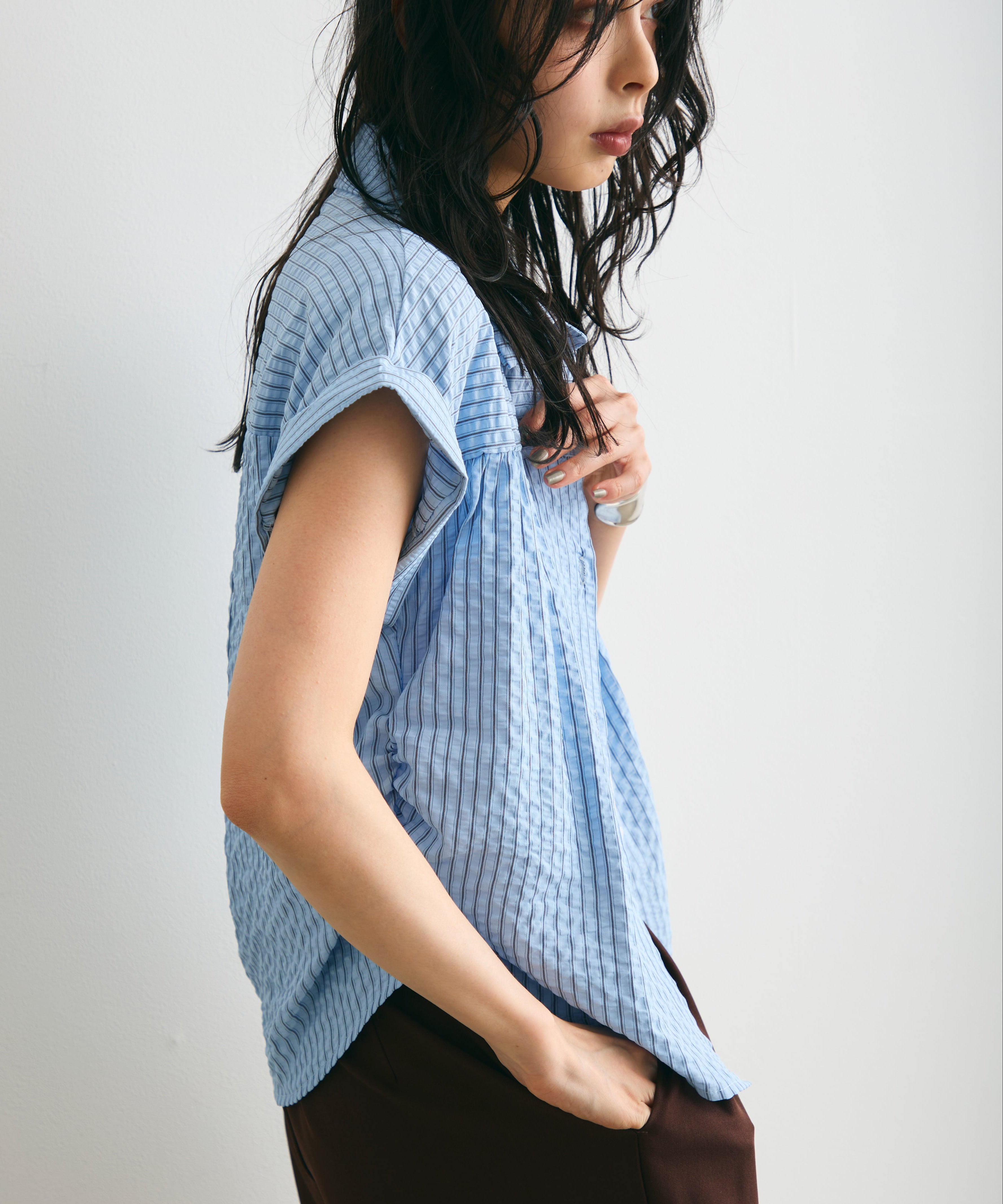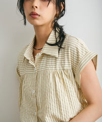 軽やかなサッカー素材にストライプ柄をのせたフレンチスリーブシャツ。