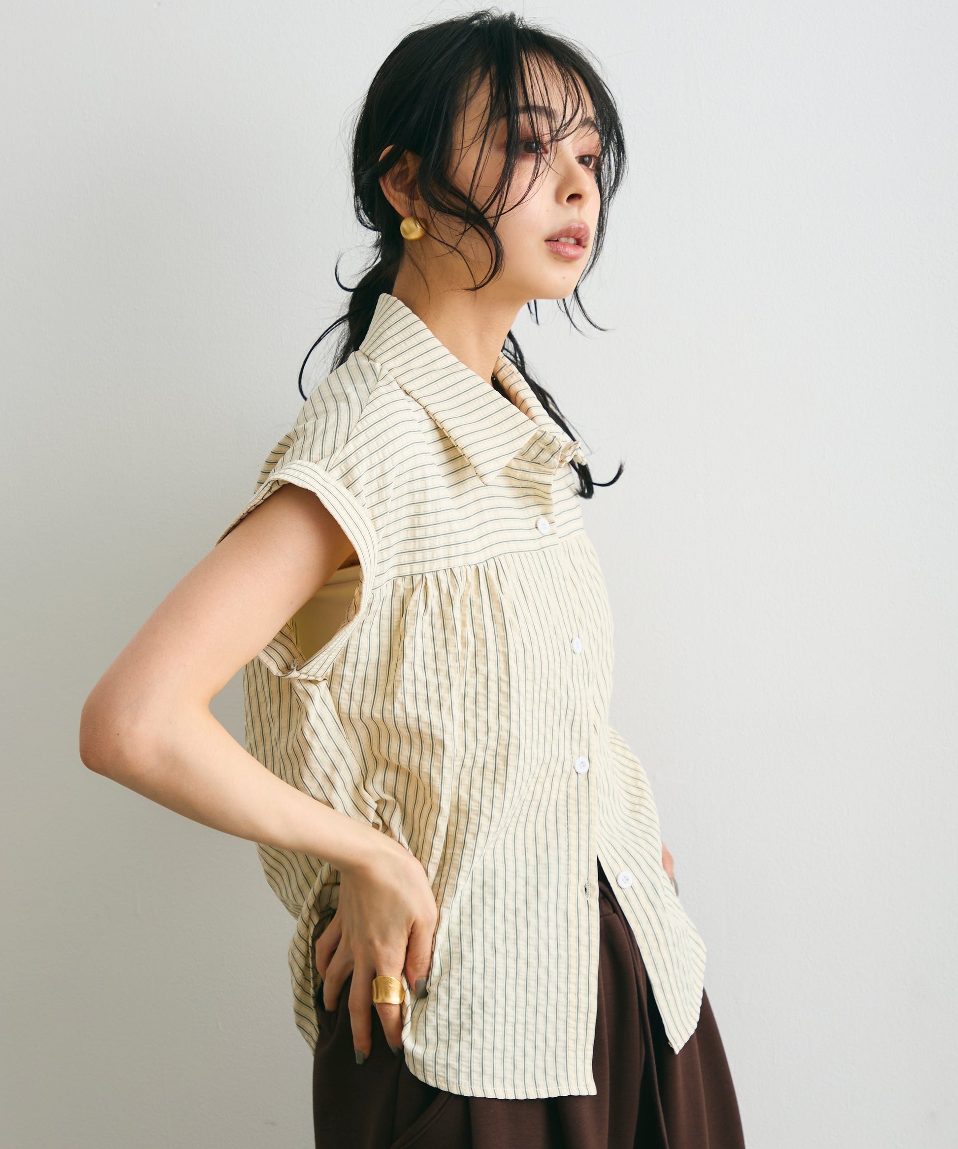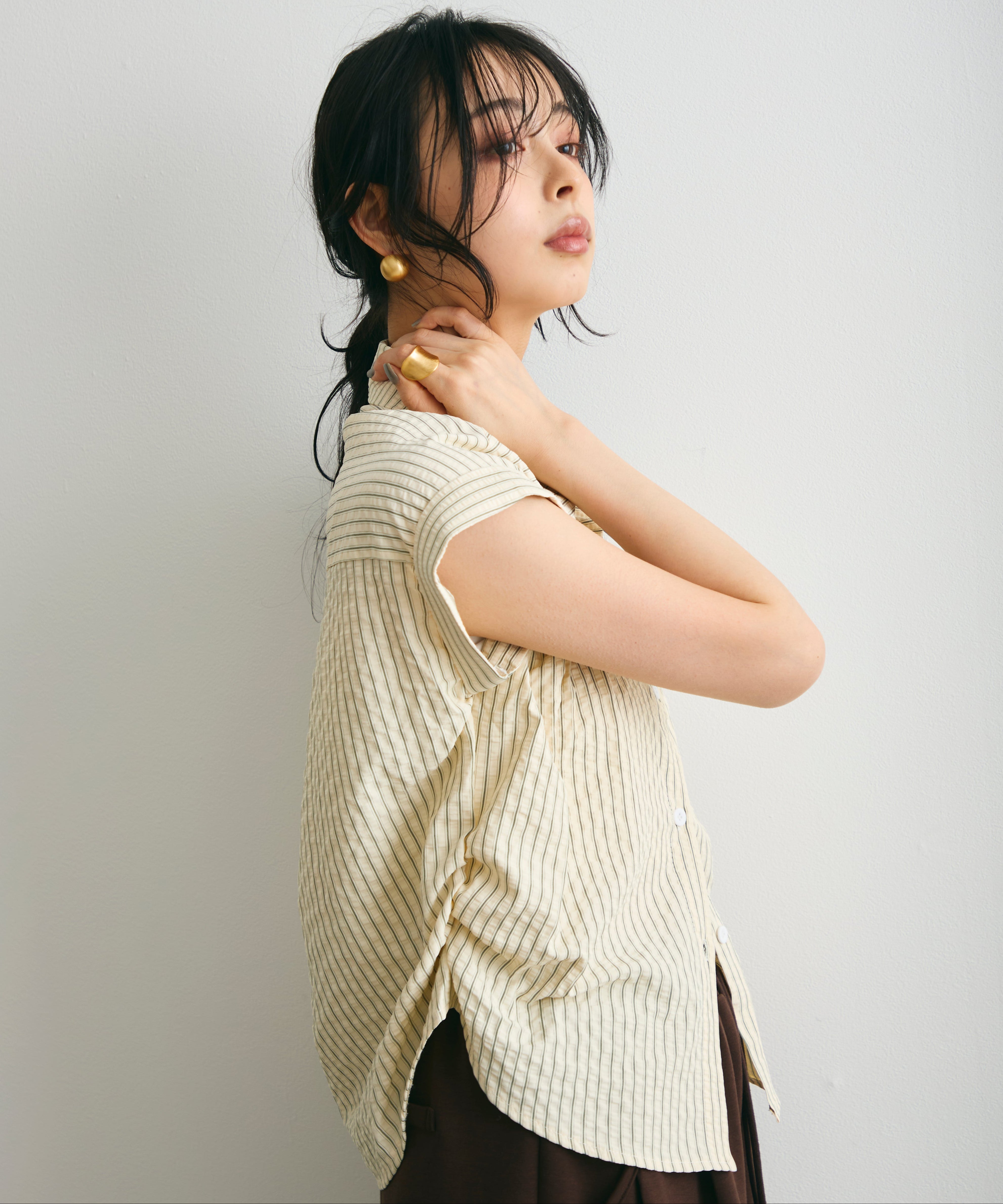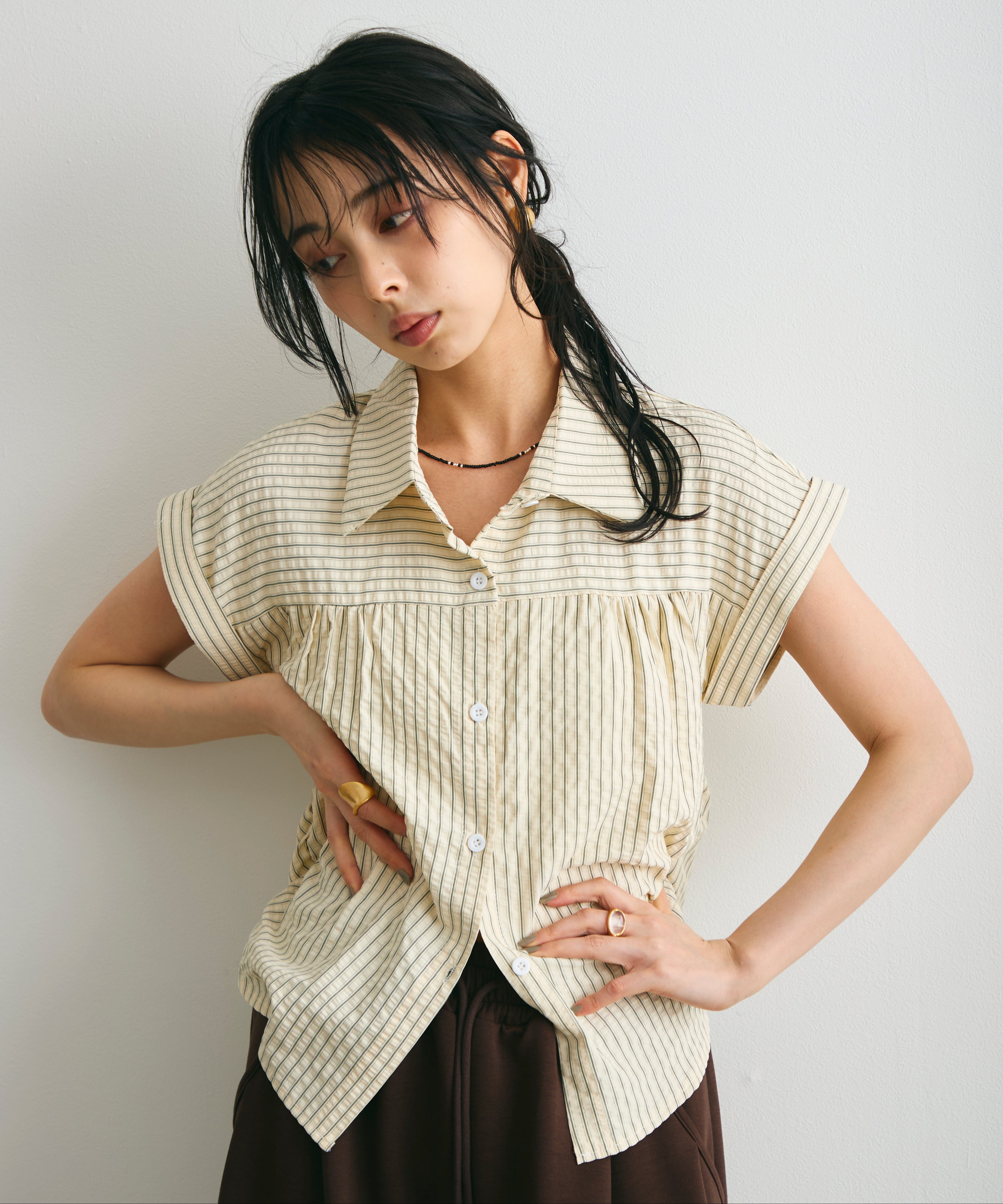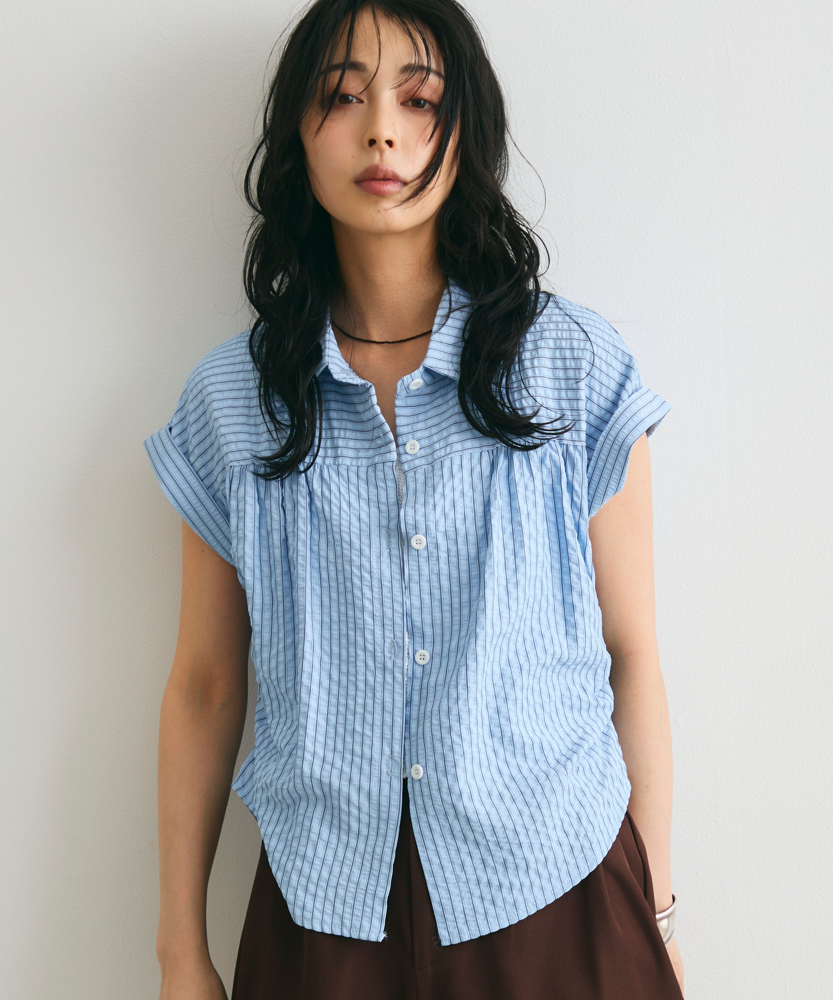 軽やかなサッカー素材にストライプ柄をのせたフレンチスリーブシャツ。