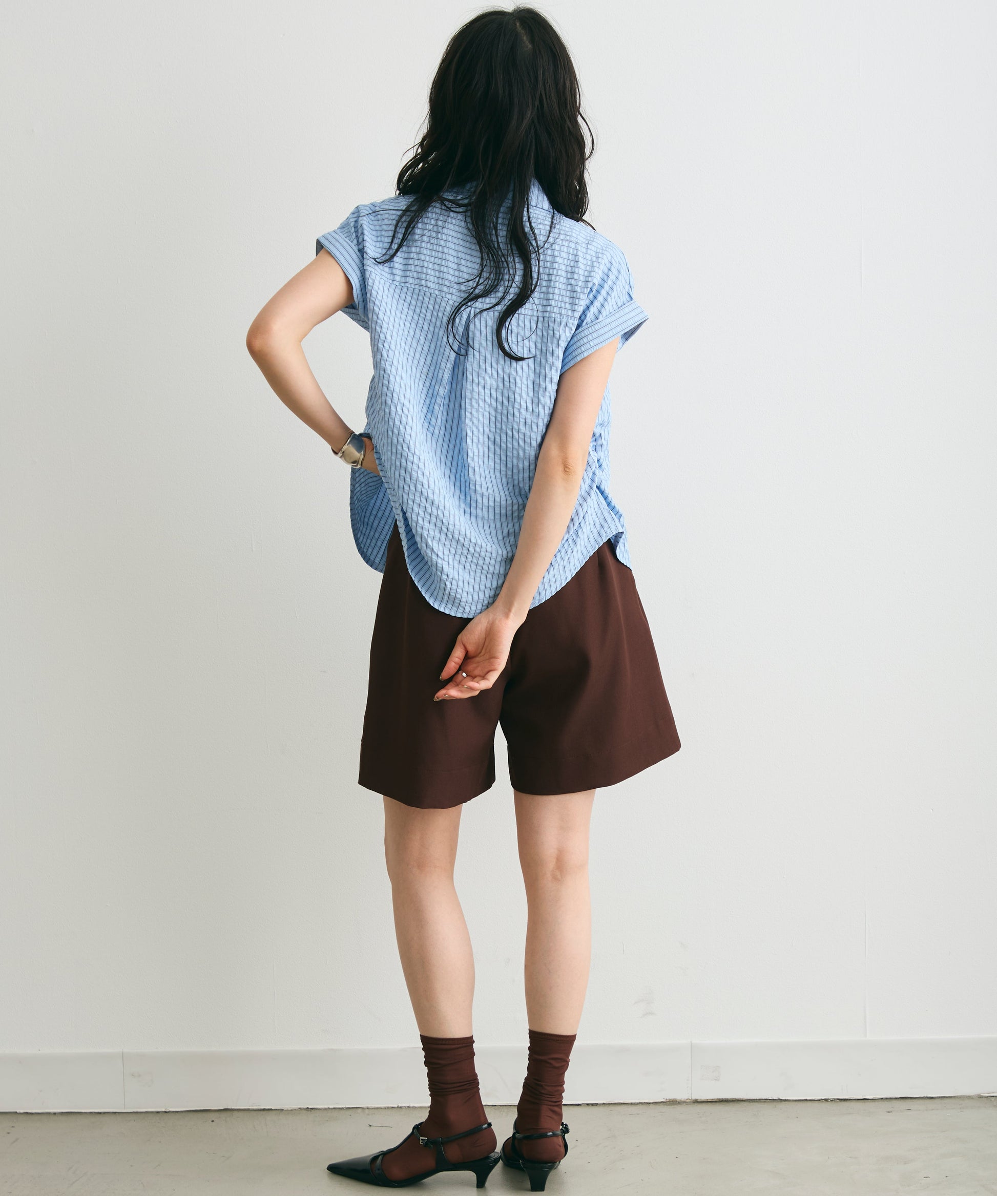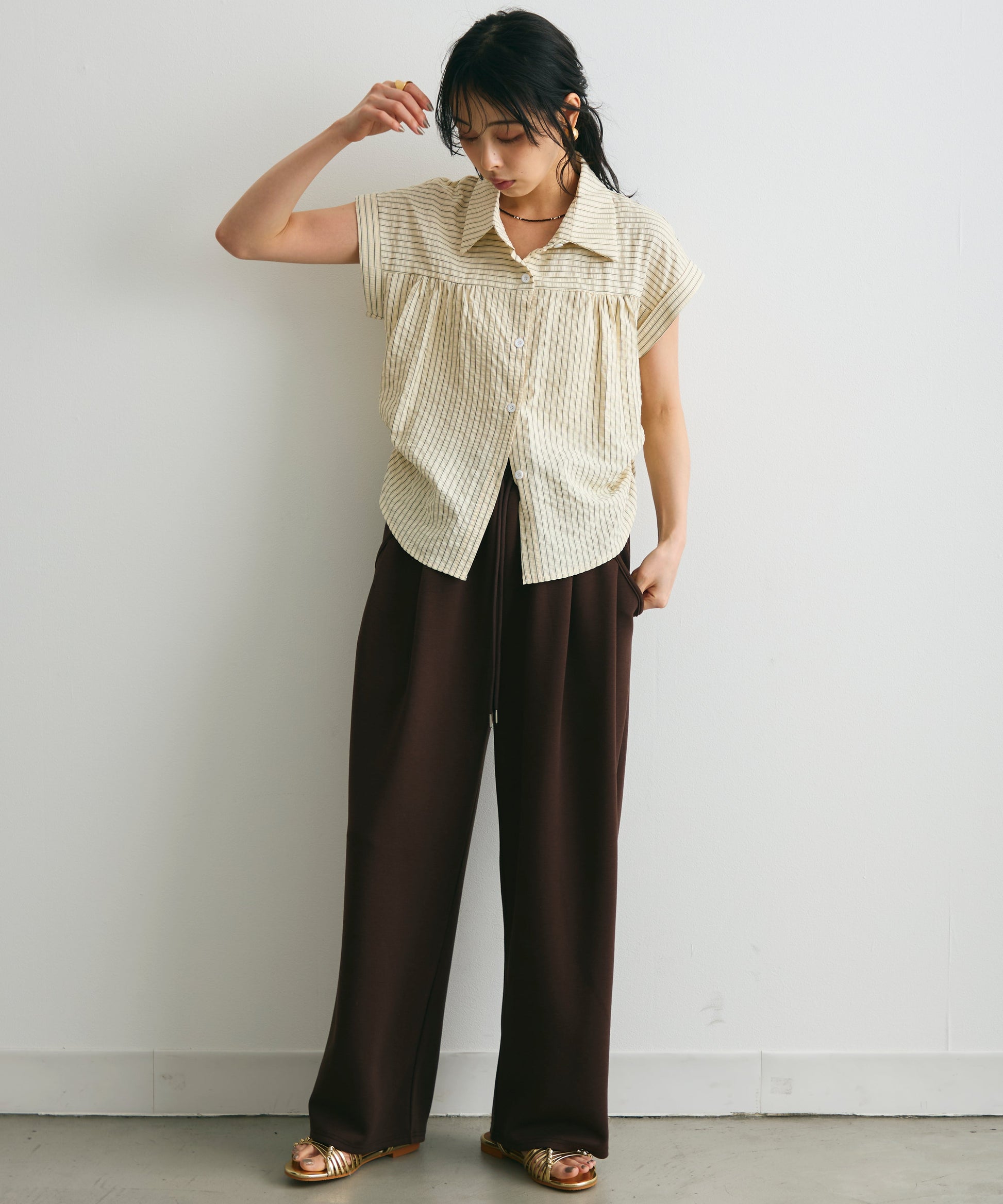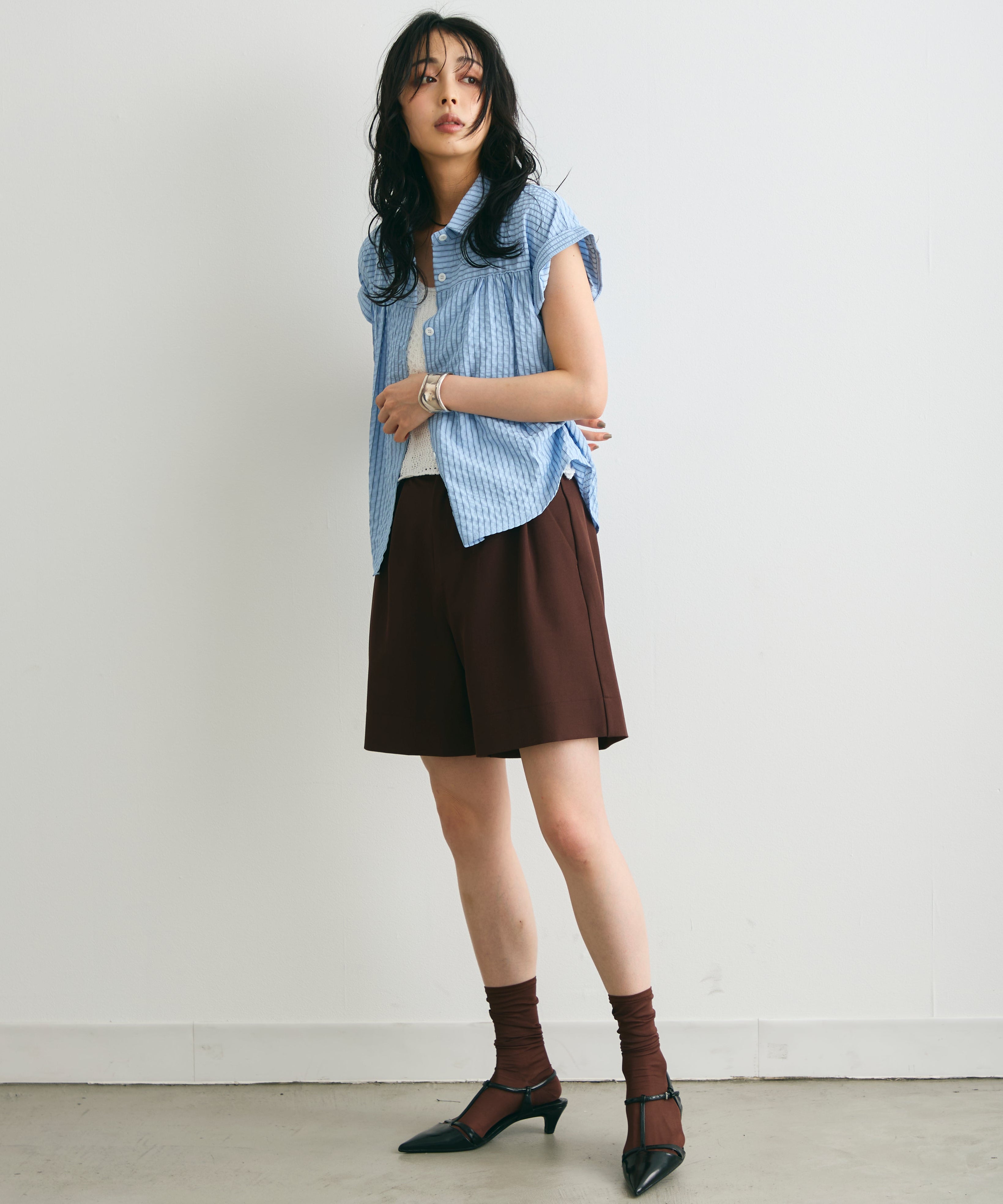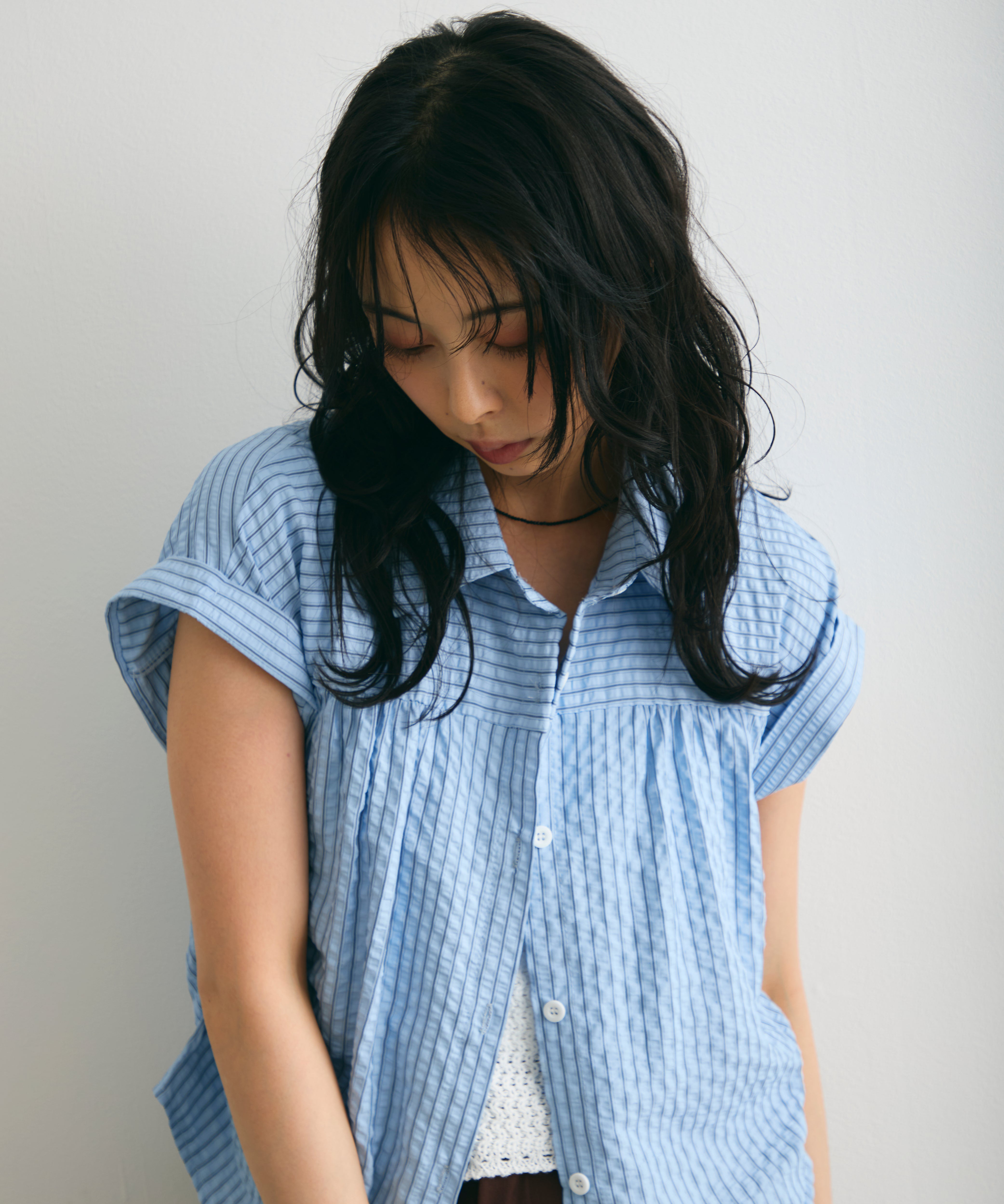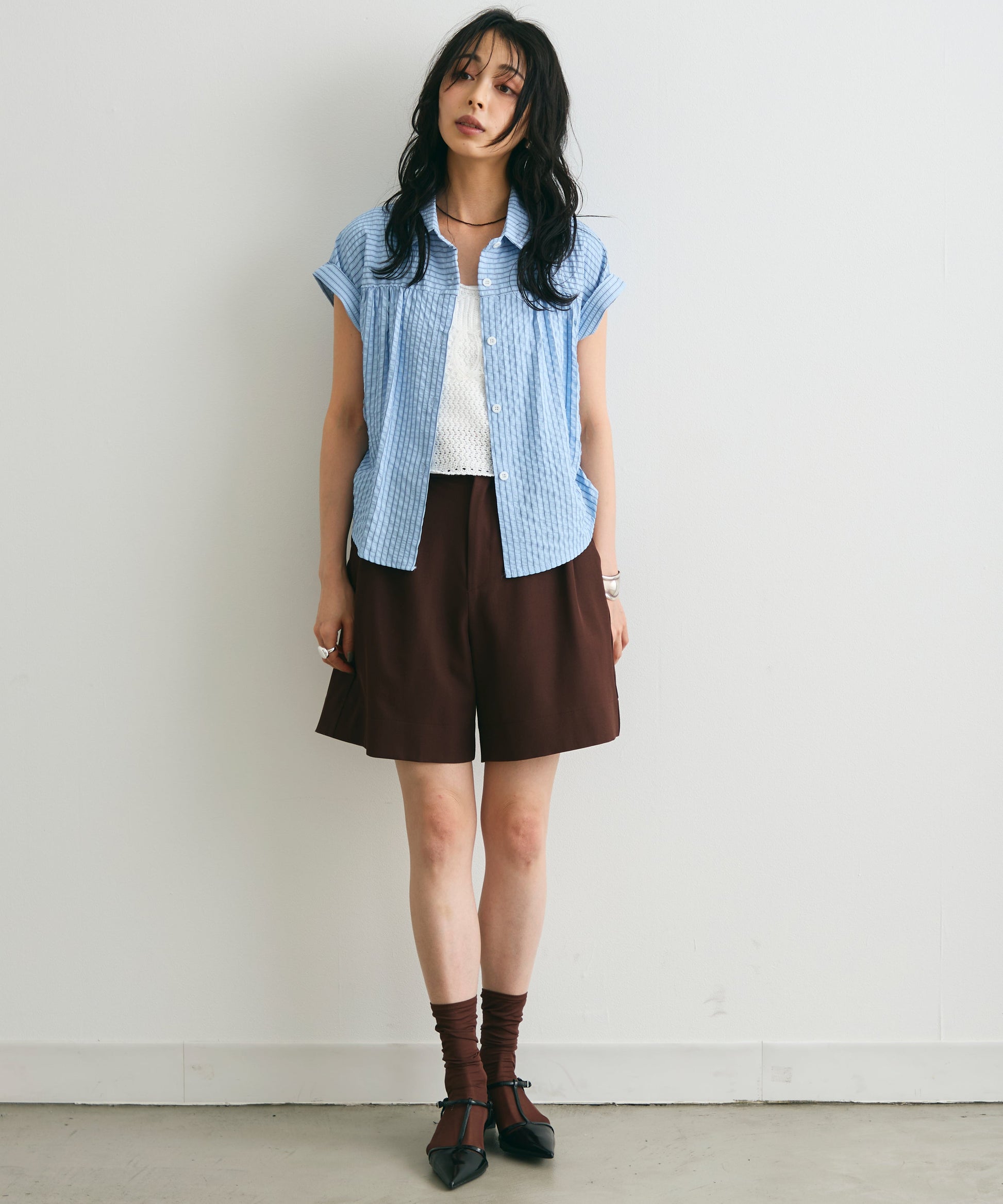 軽やかなサッカー素材にストライプ柄をのせたフレンチスリーブシャツ。