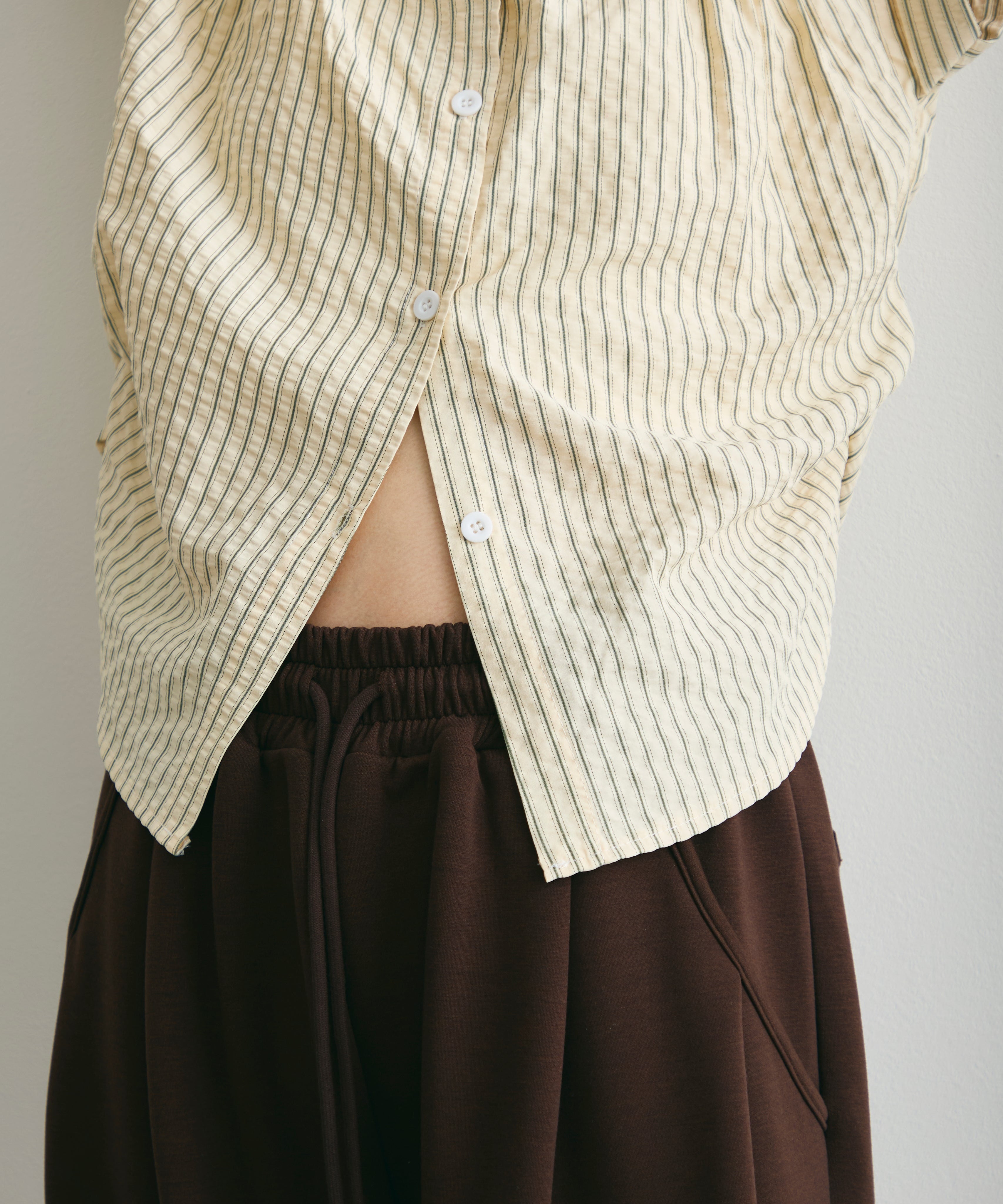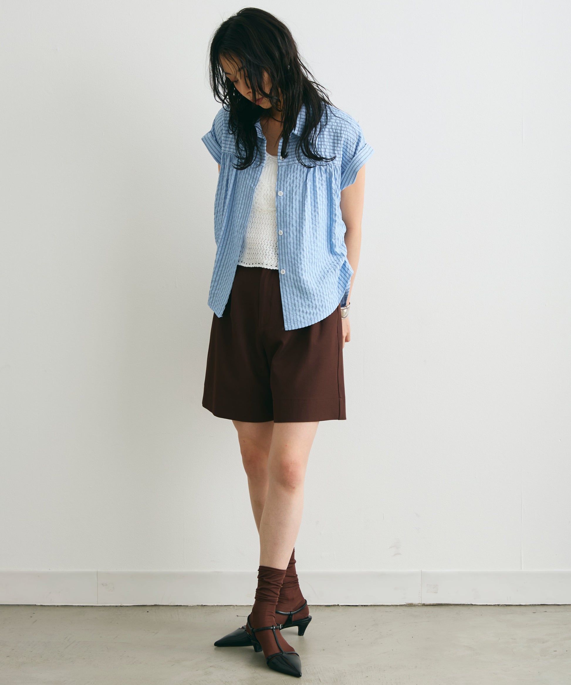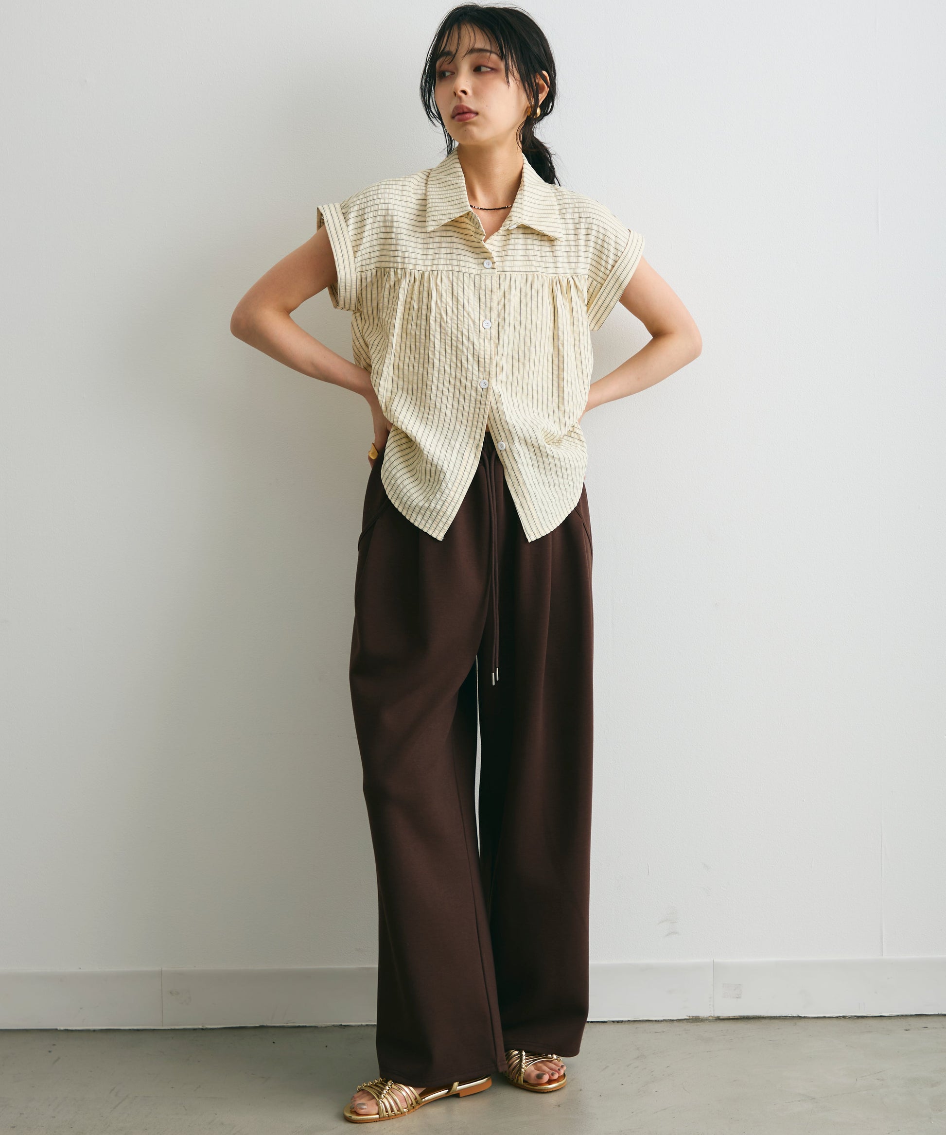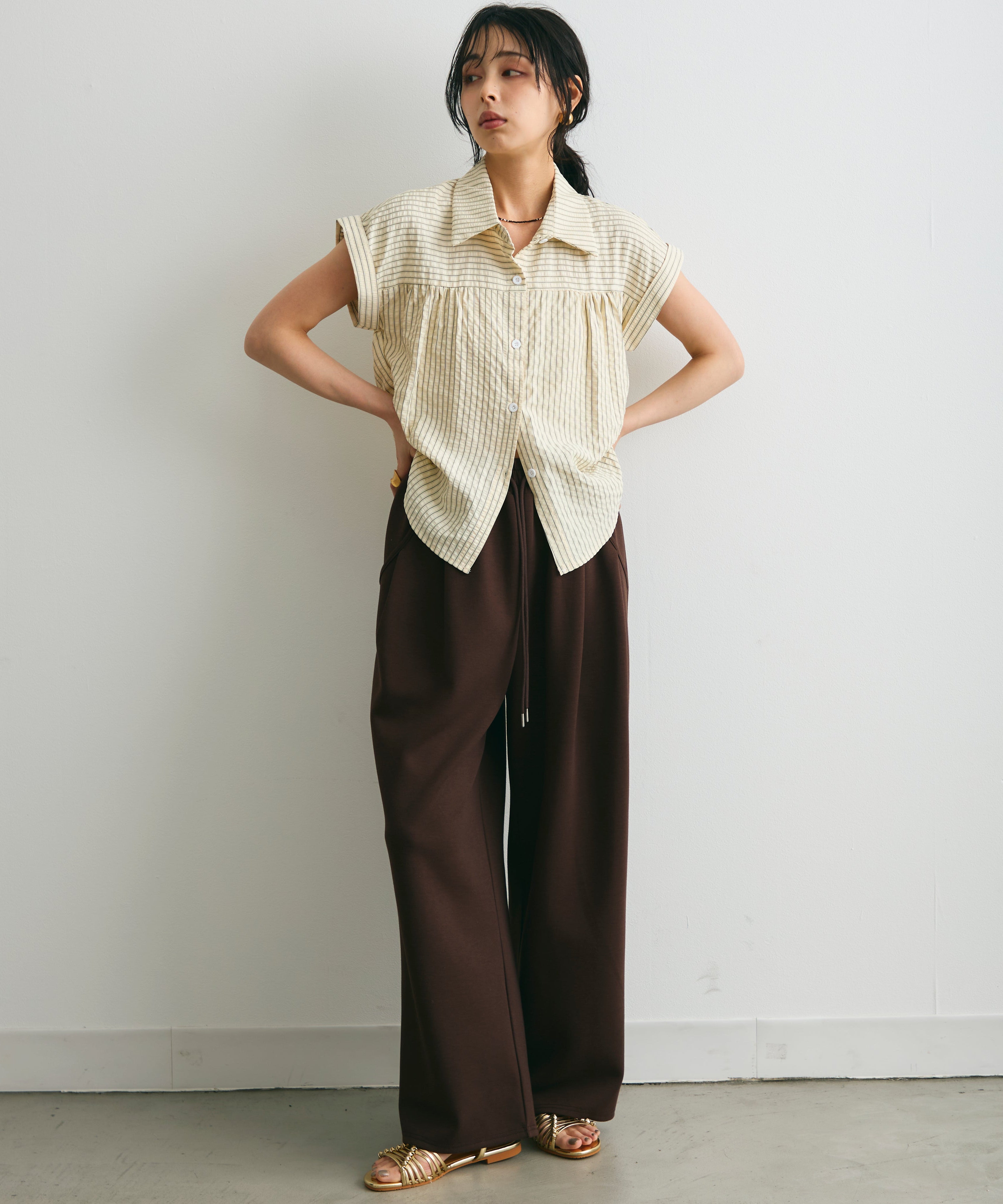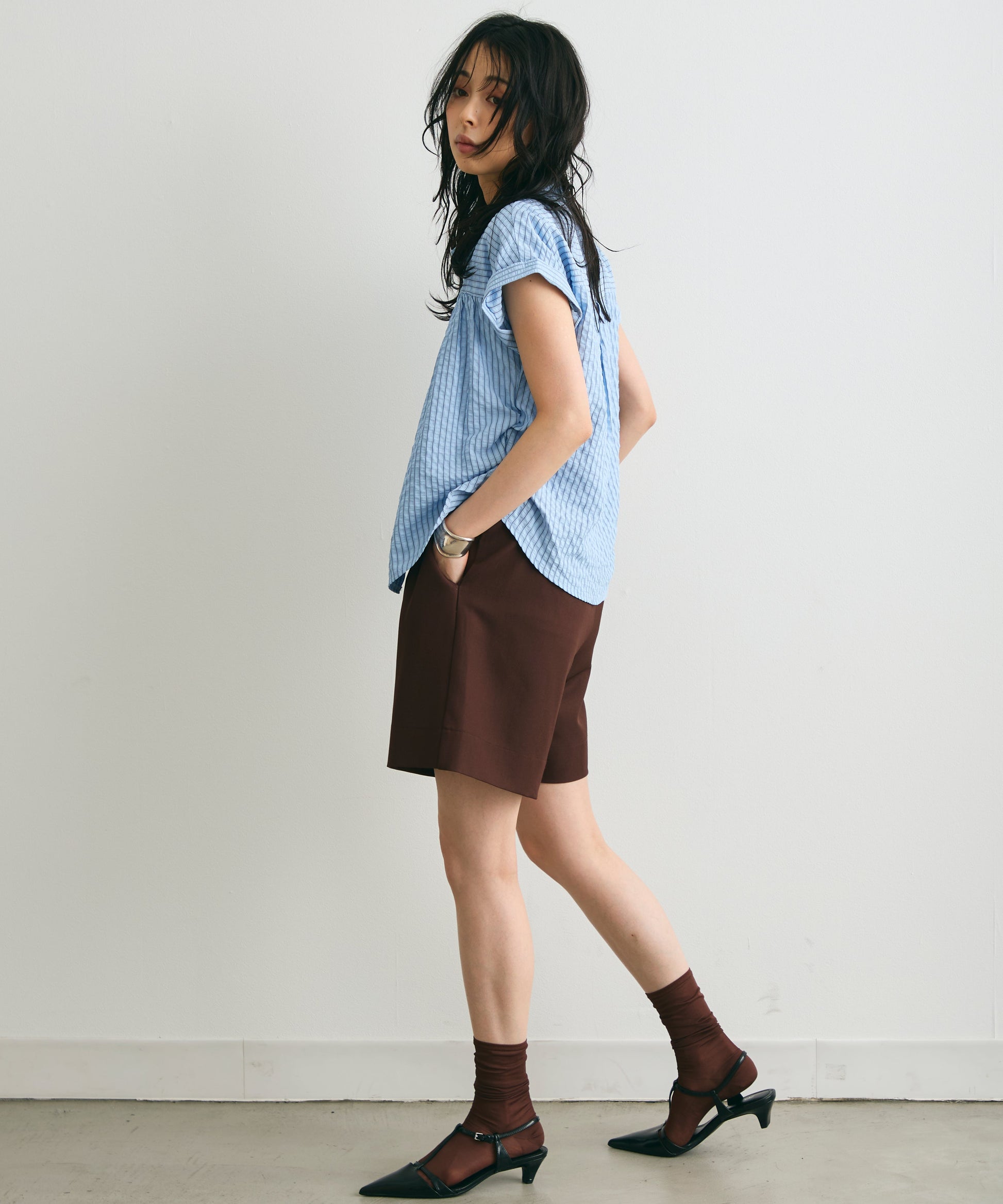 軽やかなサッカー素材にストライプ柄をのせたフレンチスリーブシャツ。