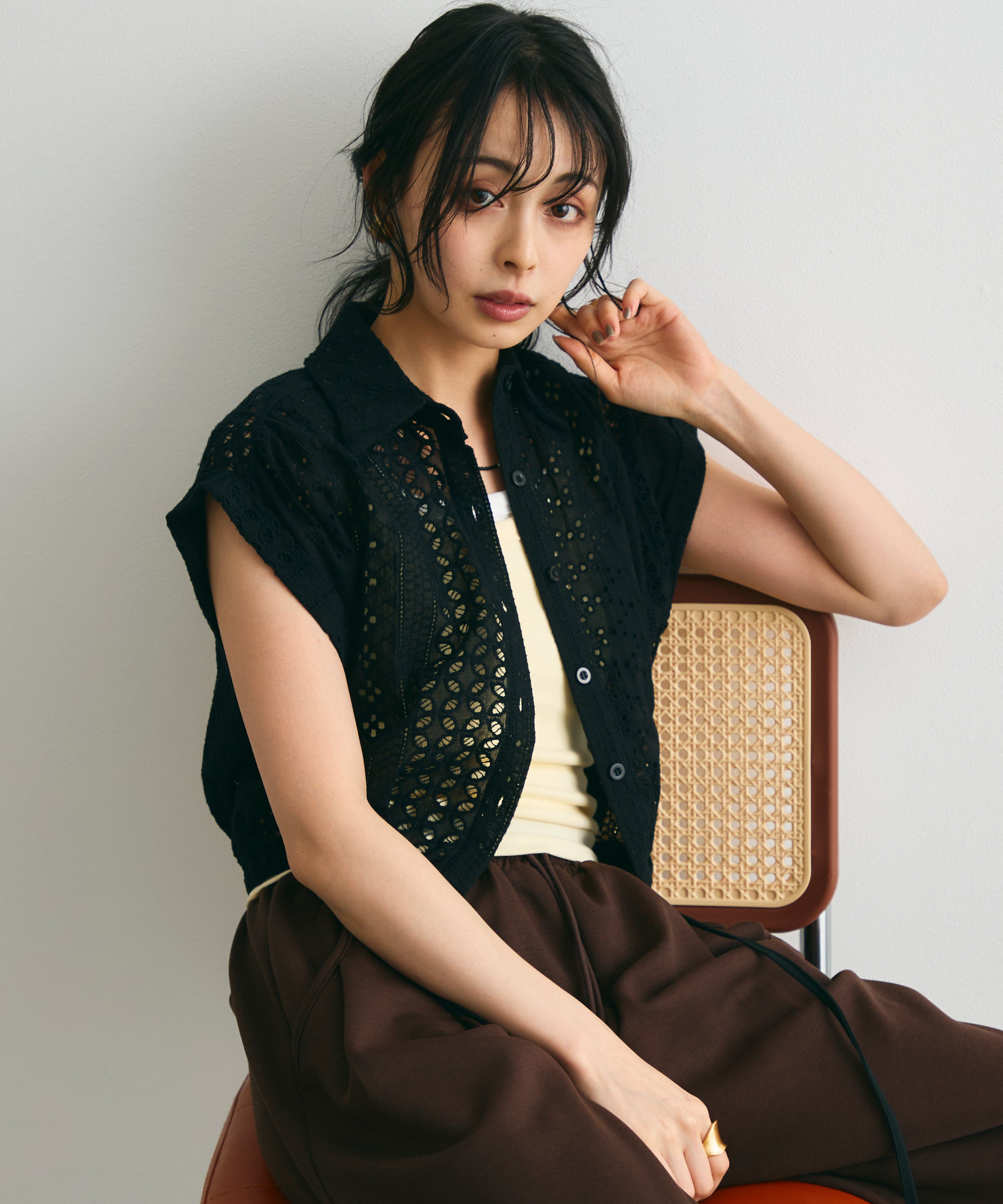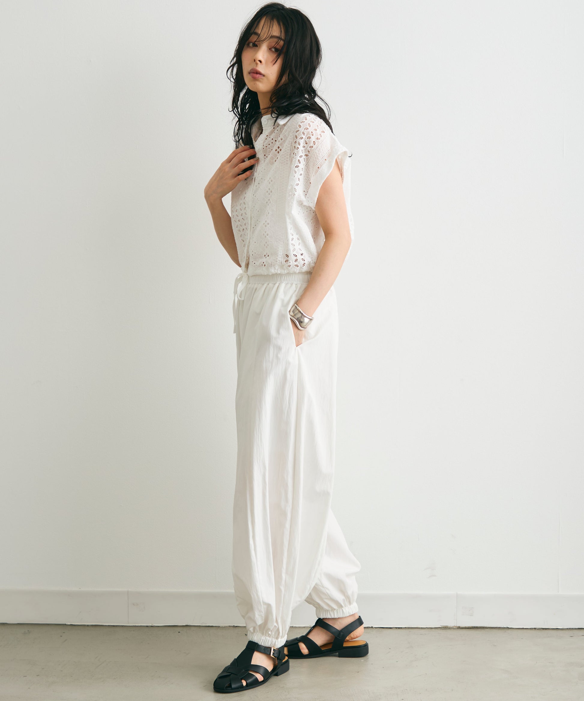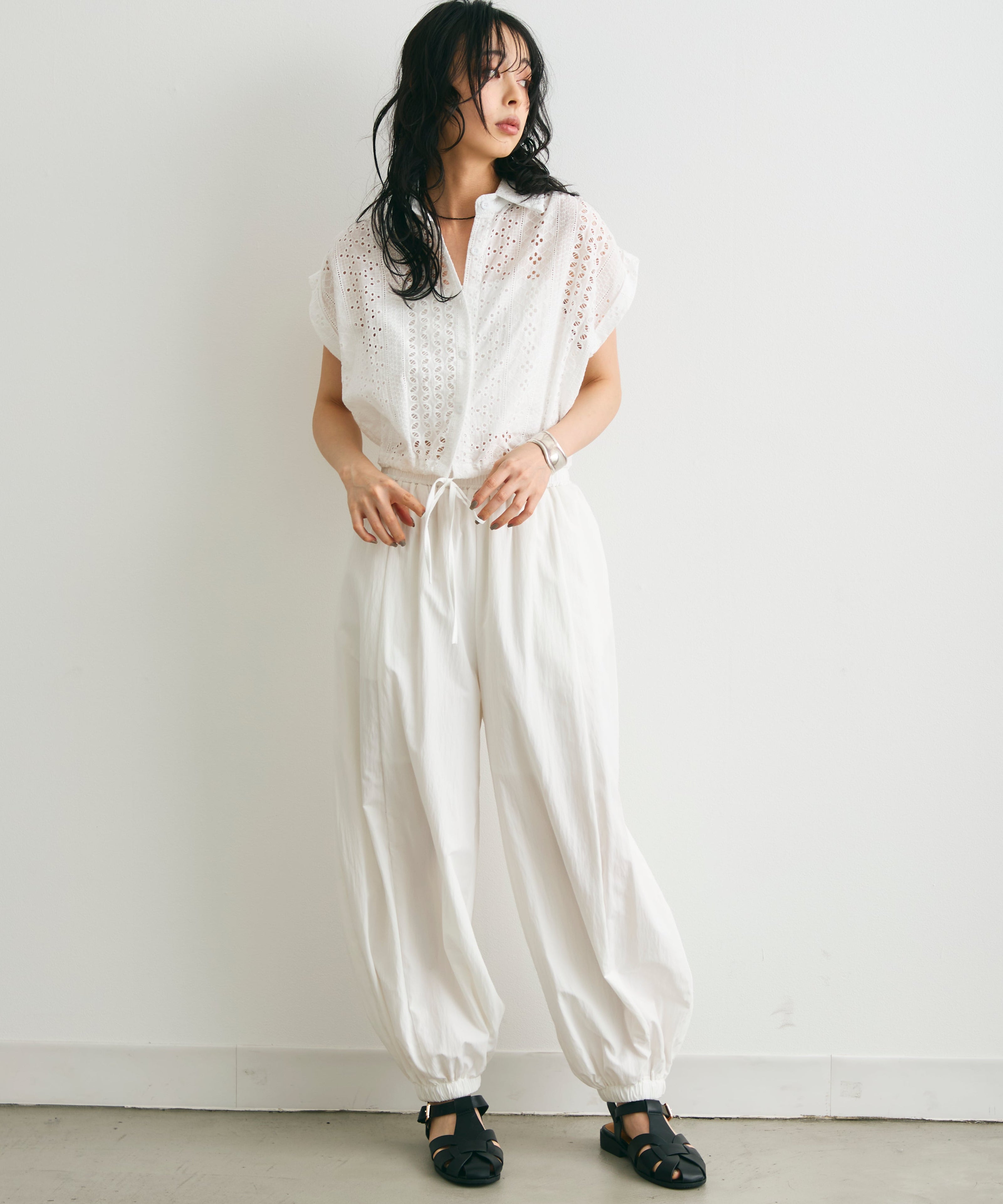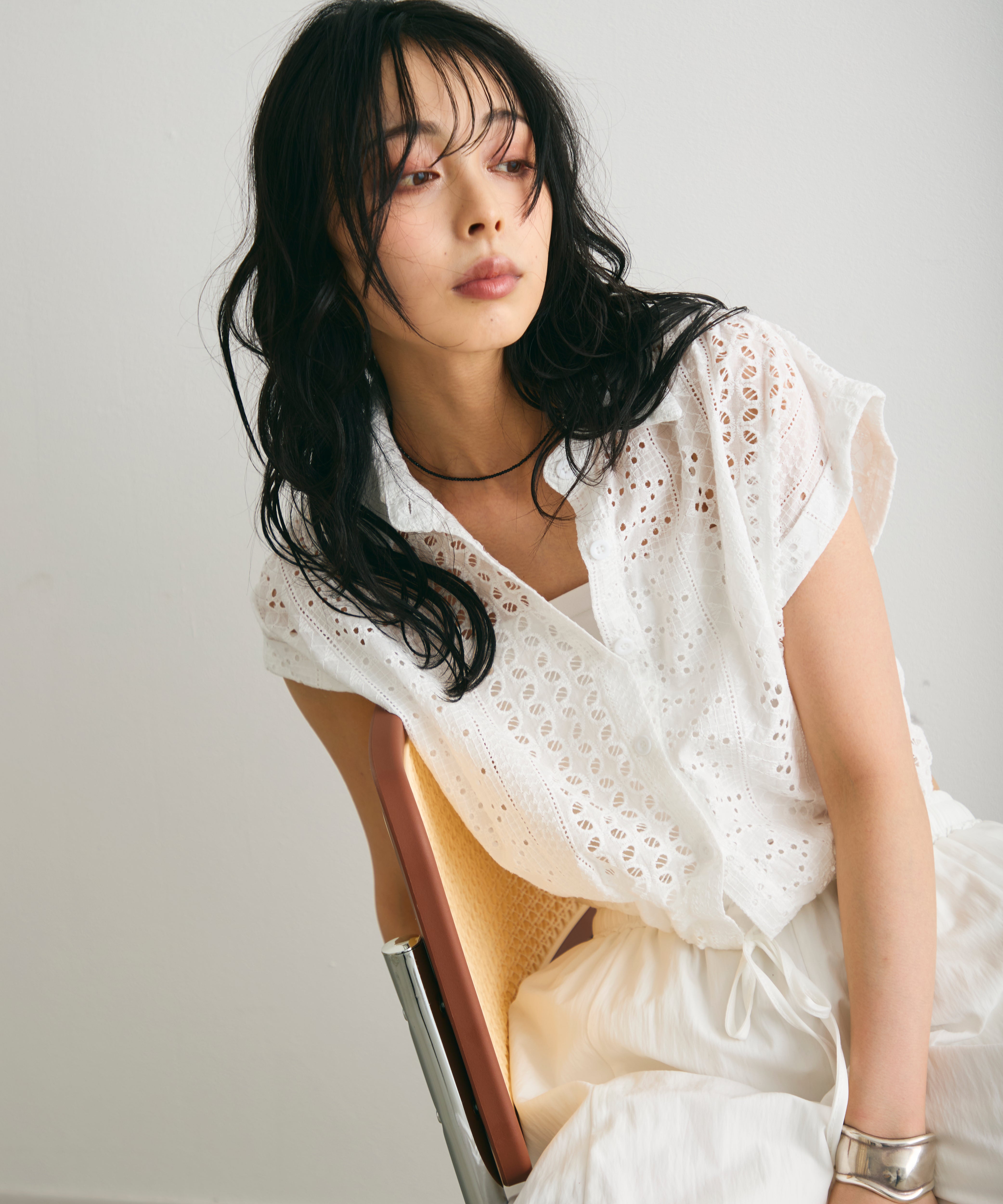 軽やかな素材感と上品な透け感が、夏のスタイリングを涼しげに演出します。