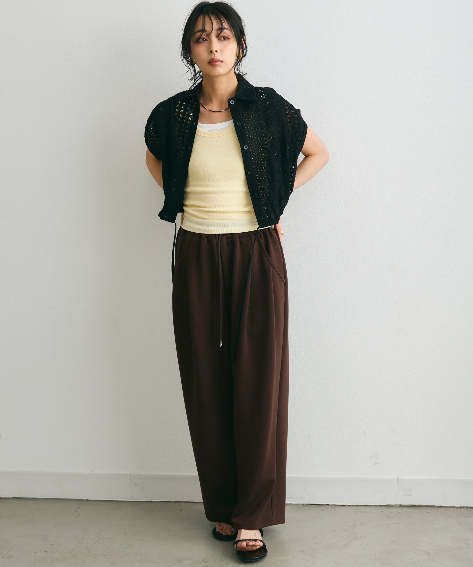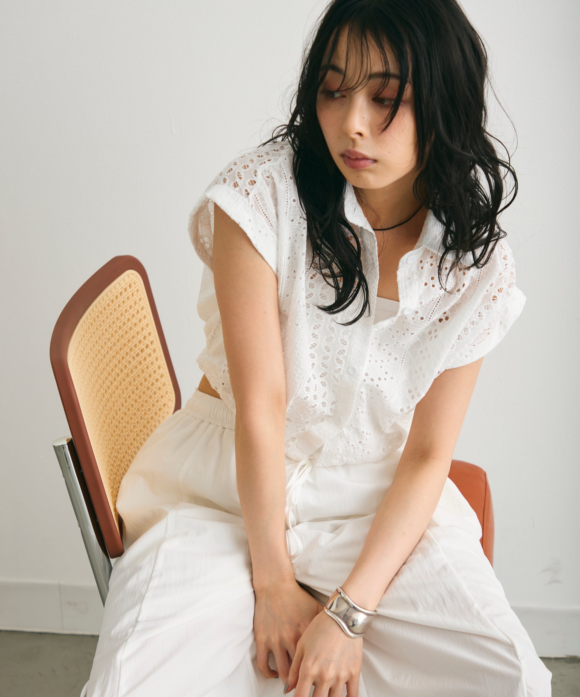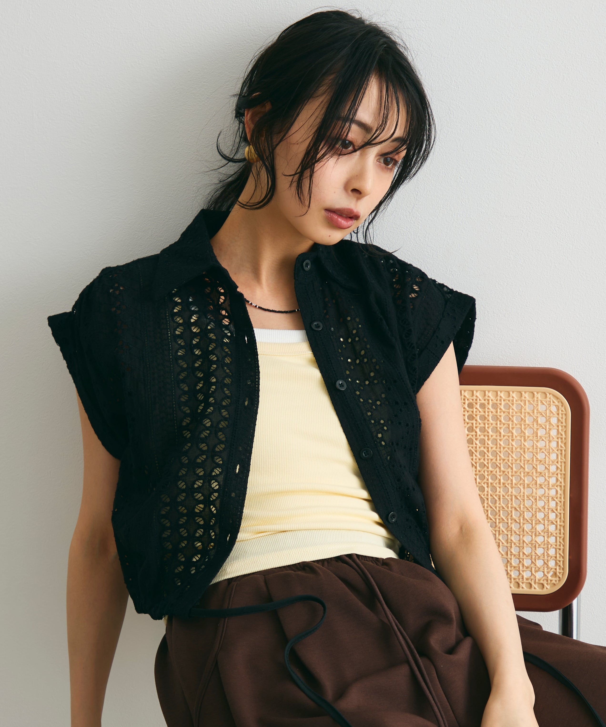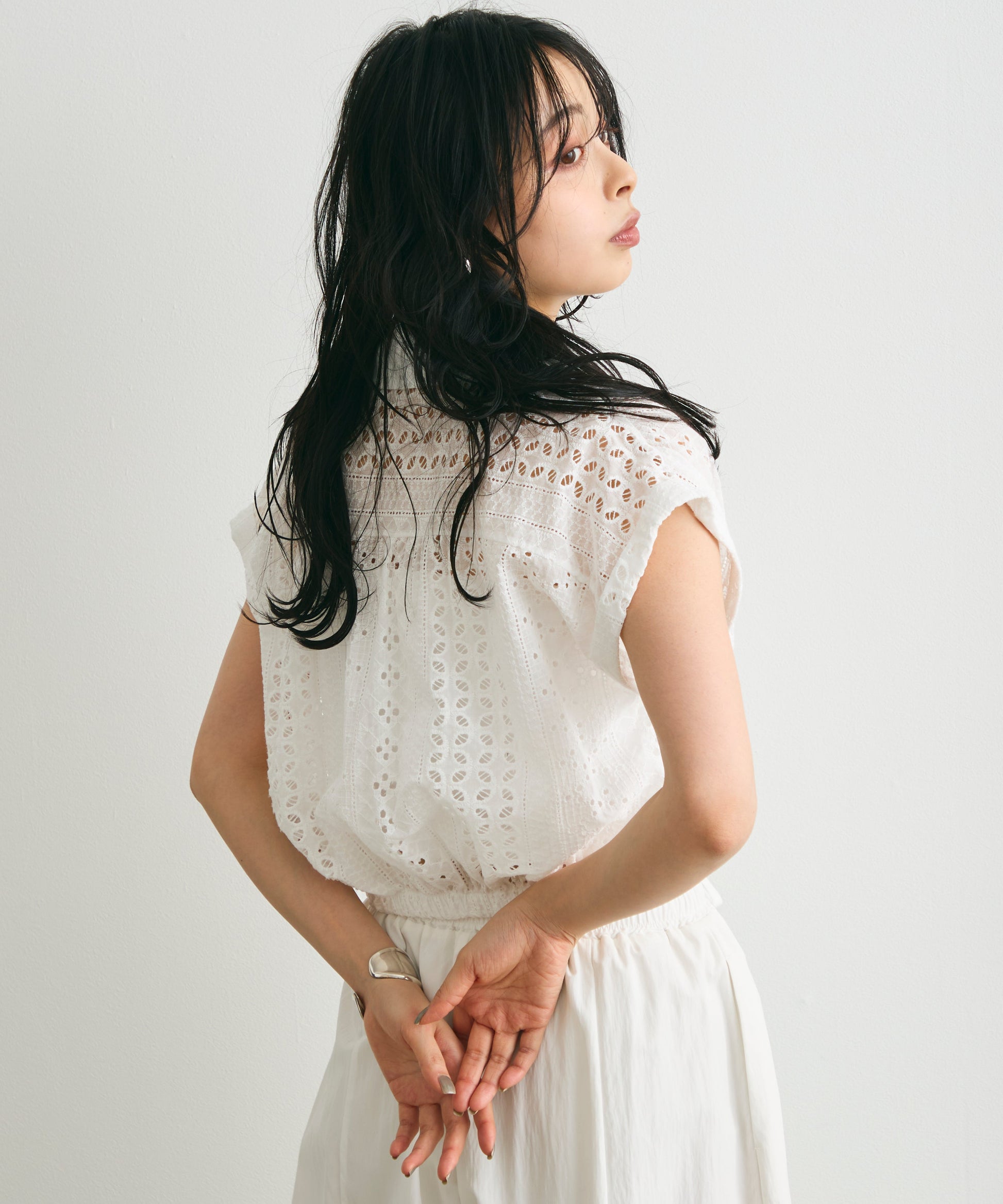 軽やかな素材感と上品な透け感が、夏のスタイリングを涼しげに演出します。
