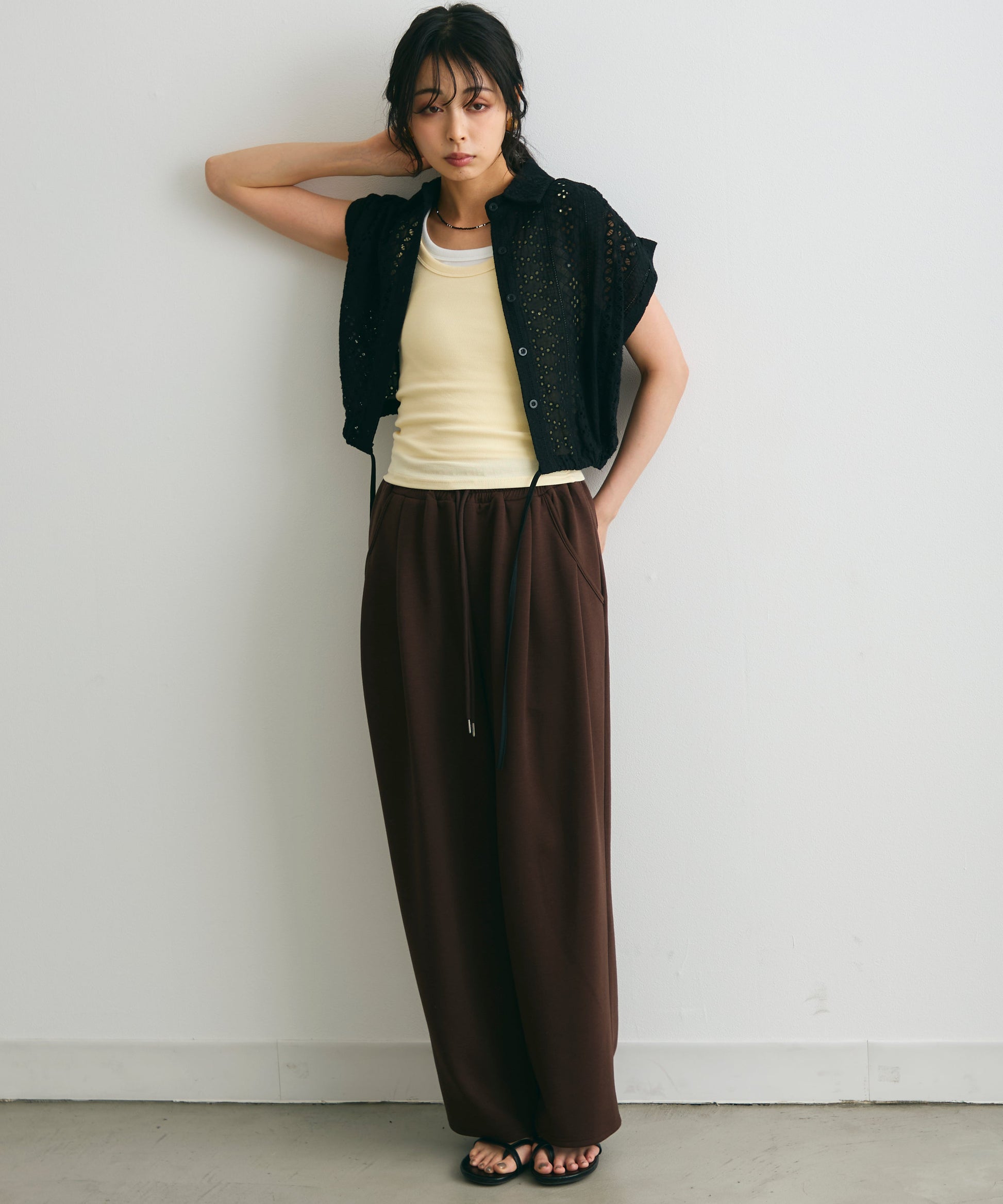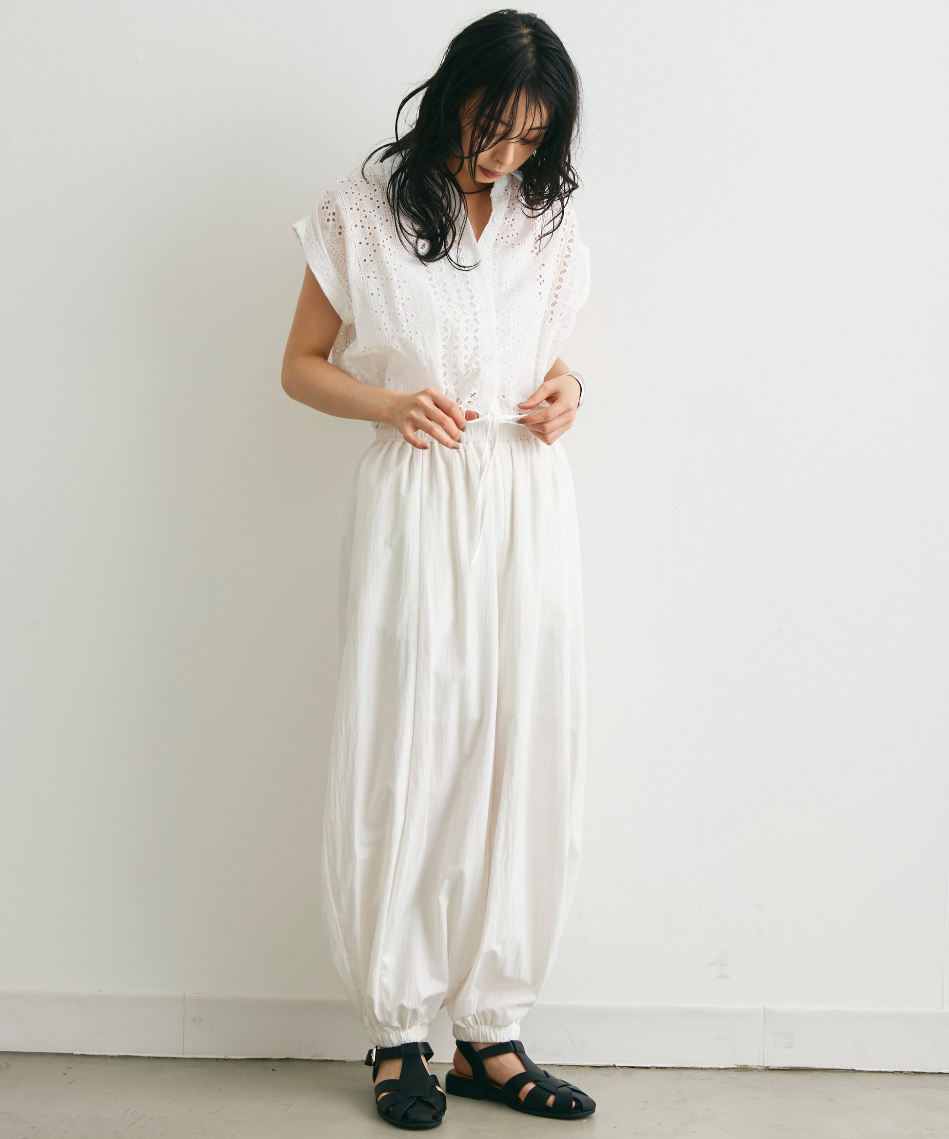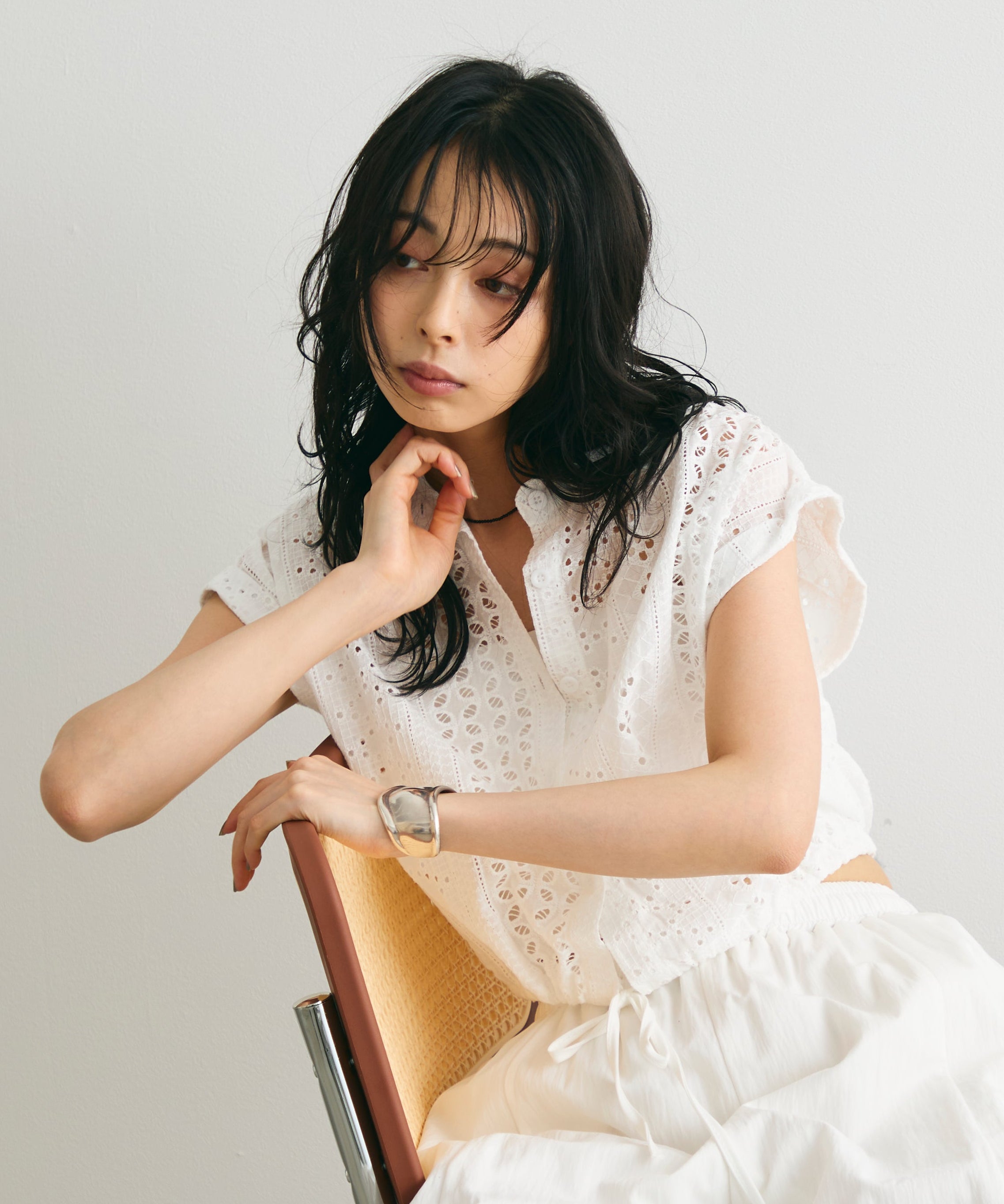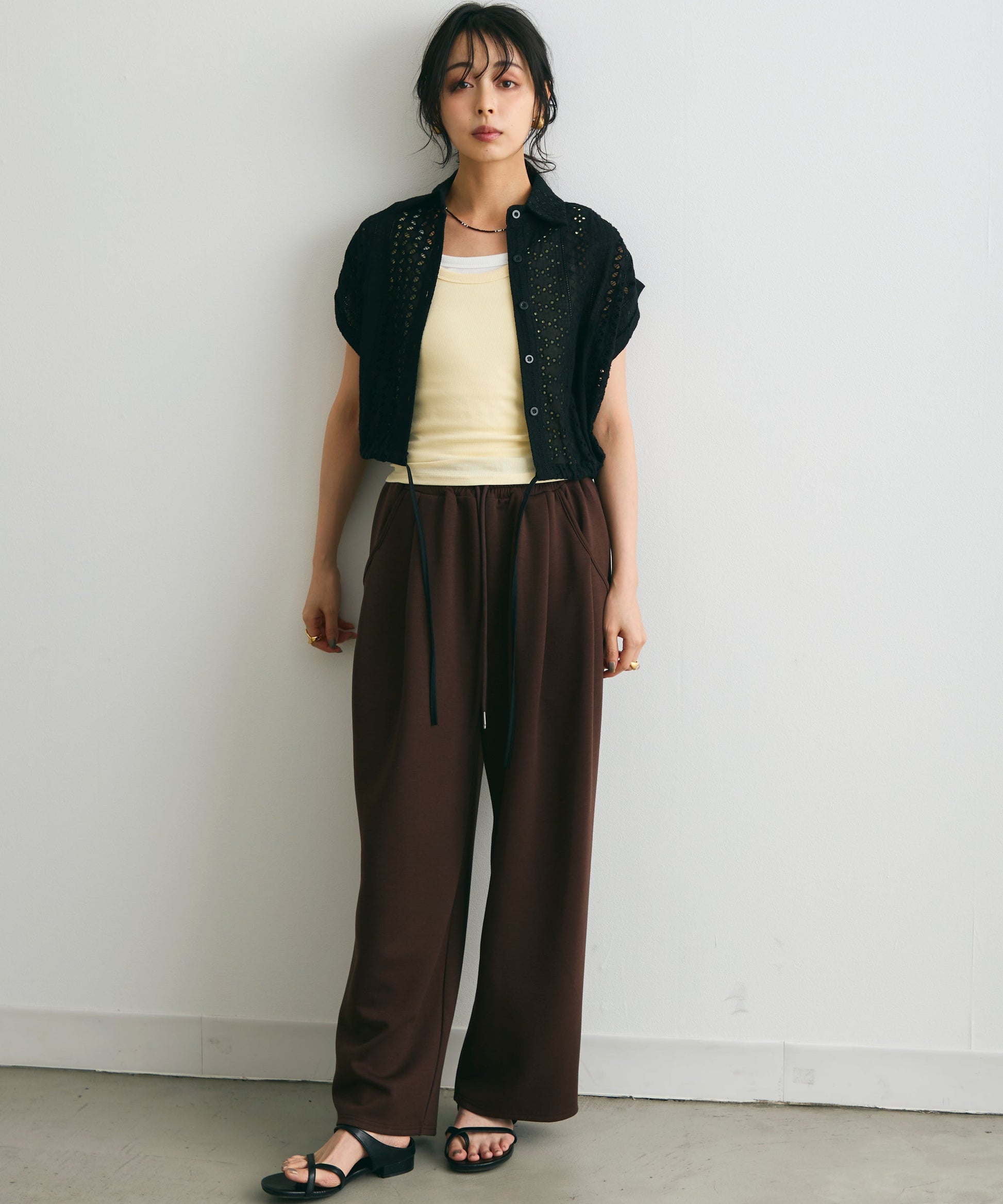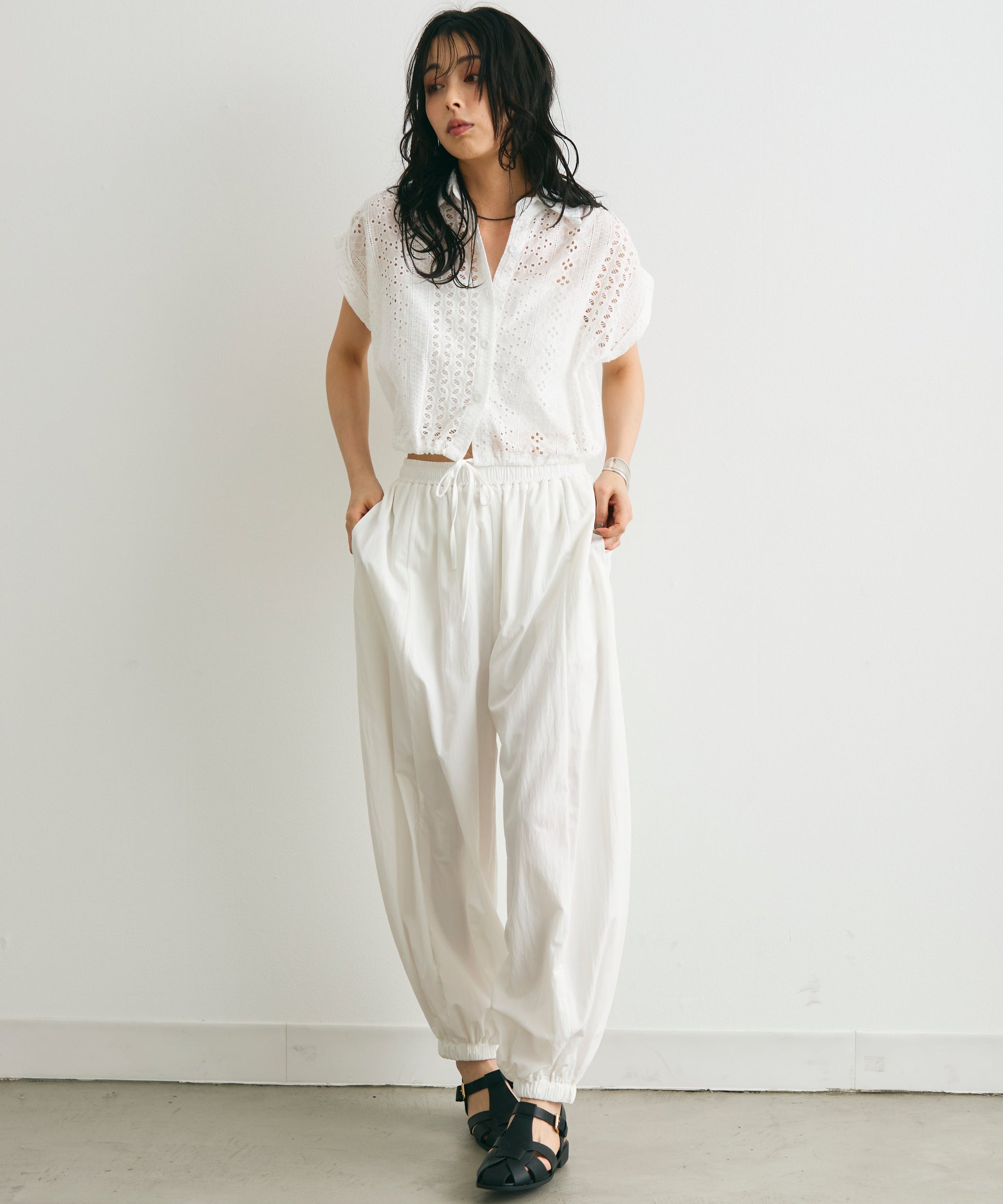 軽やかな素材感と上品な透け感が、夏のスタイリングを涼しげに演出します。