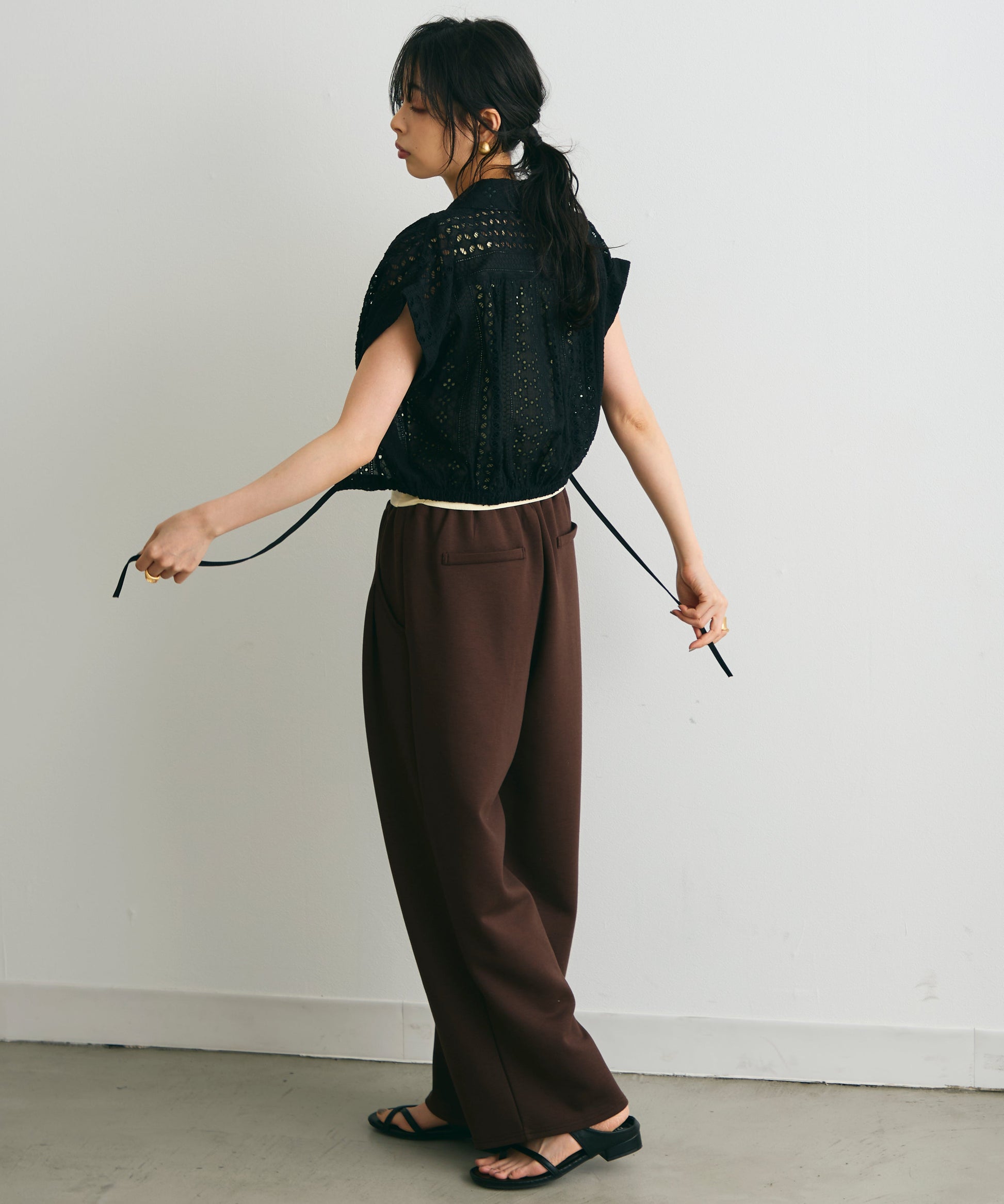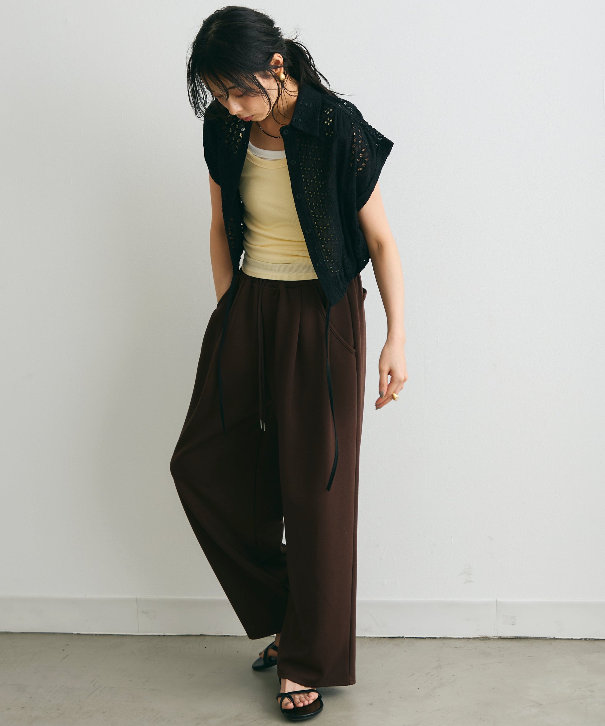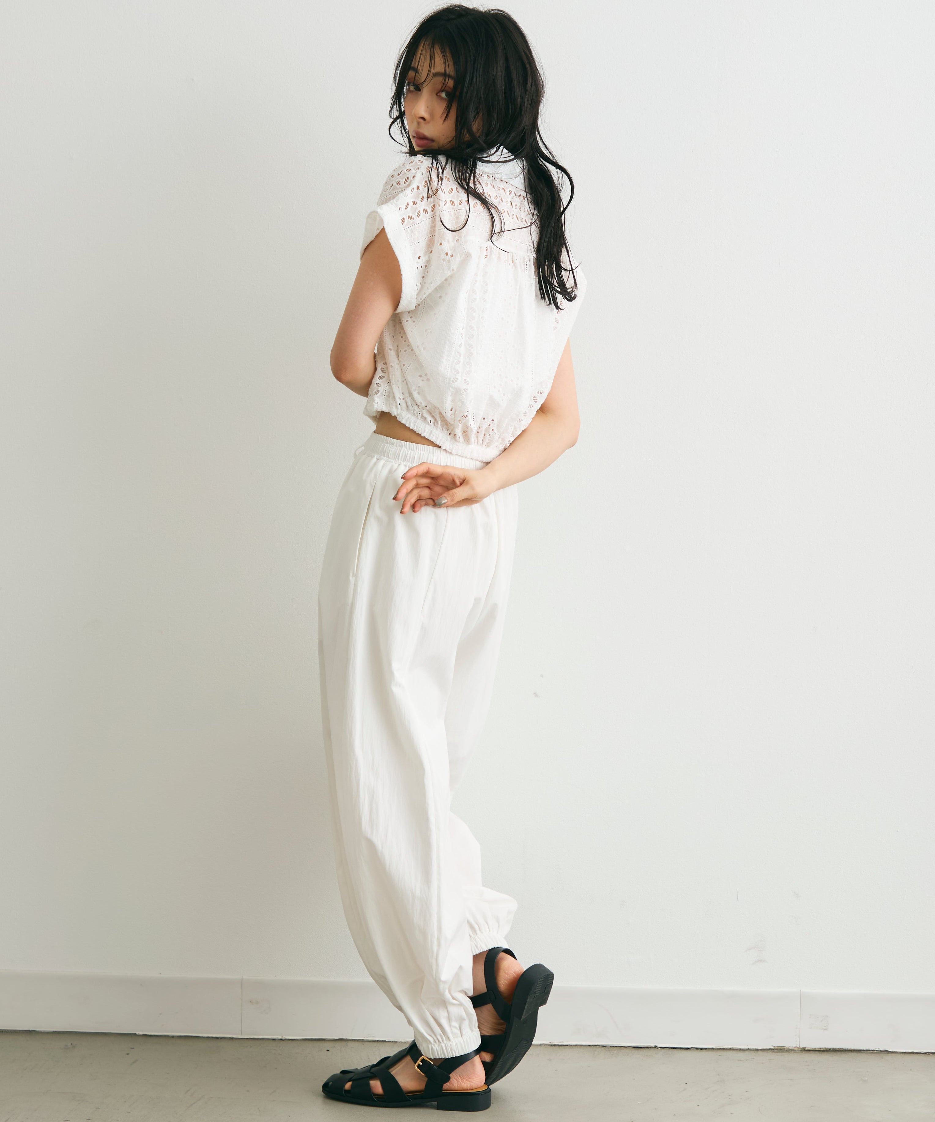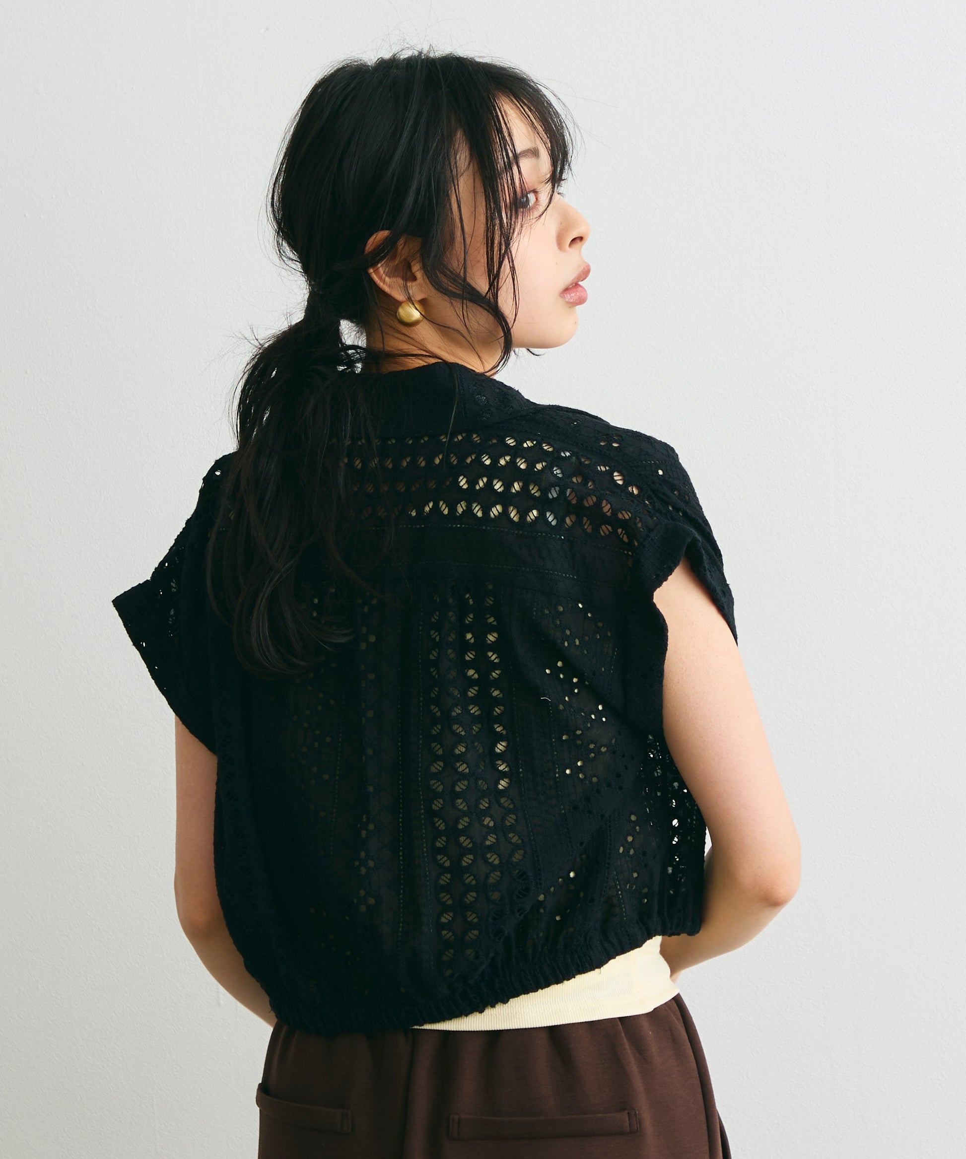 軽やかな素材感と上品な透け感が、夏のスタイリングを涼しげに演出します。