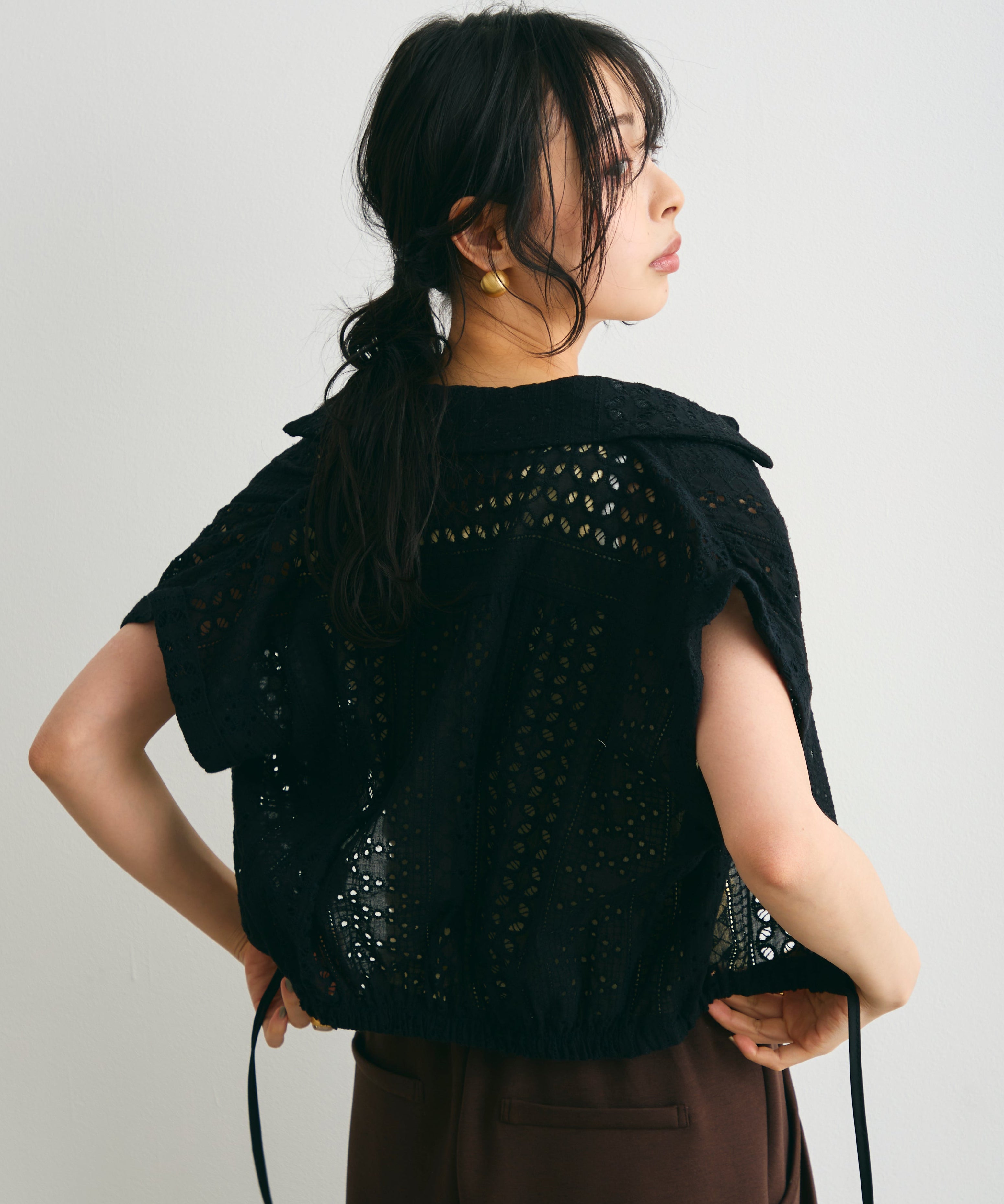 繊細なエンブロイダリーレースが華やかさを添えるフレンチスリーブの開襟シャツ。