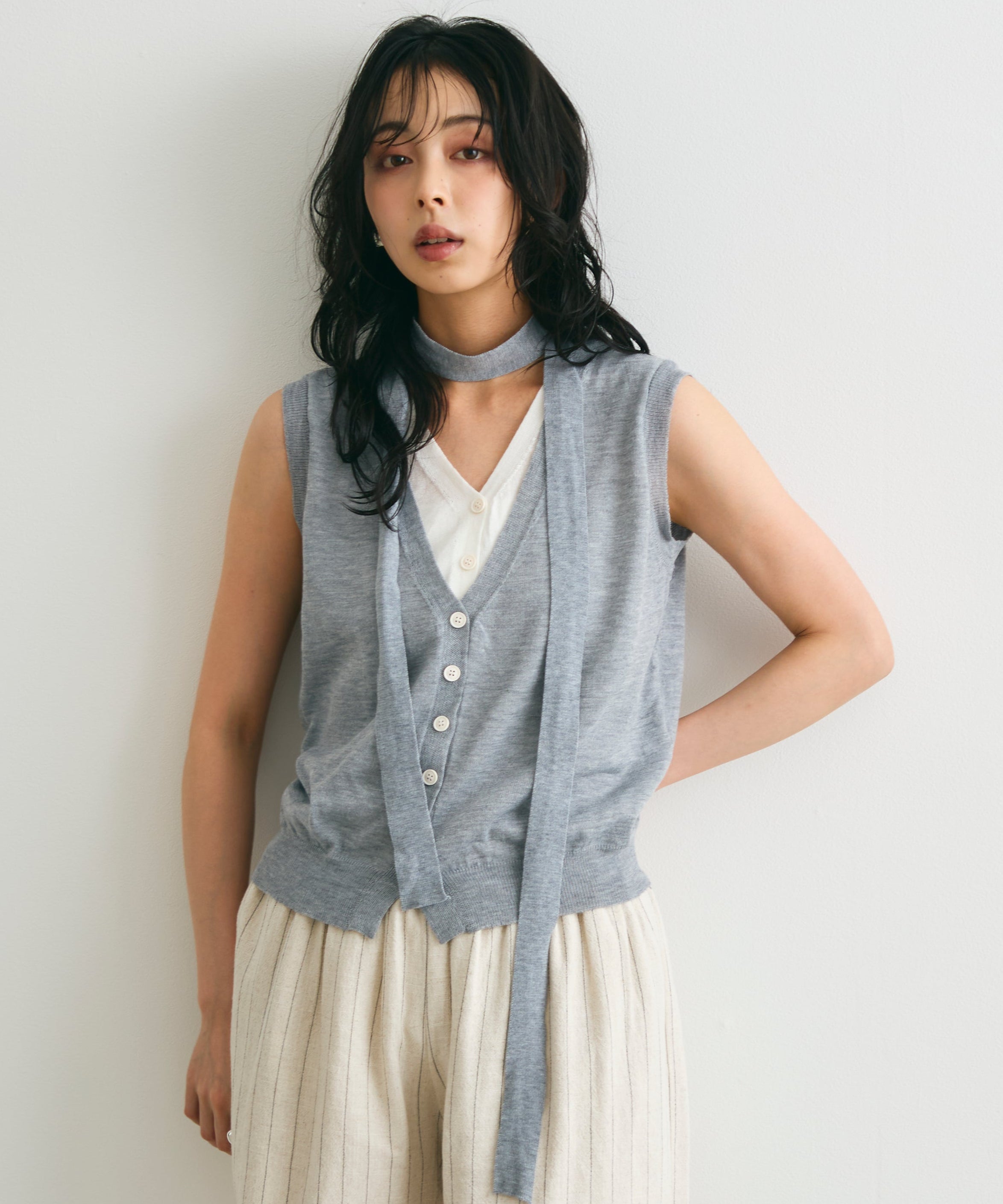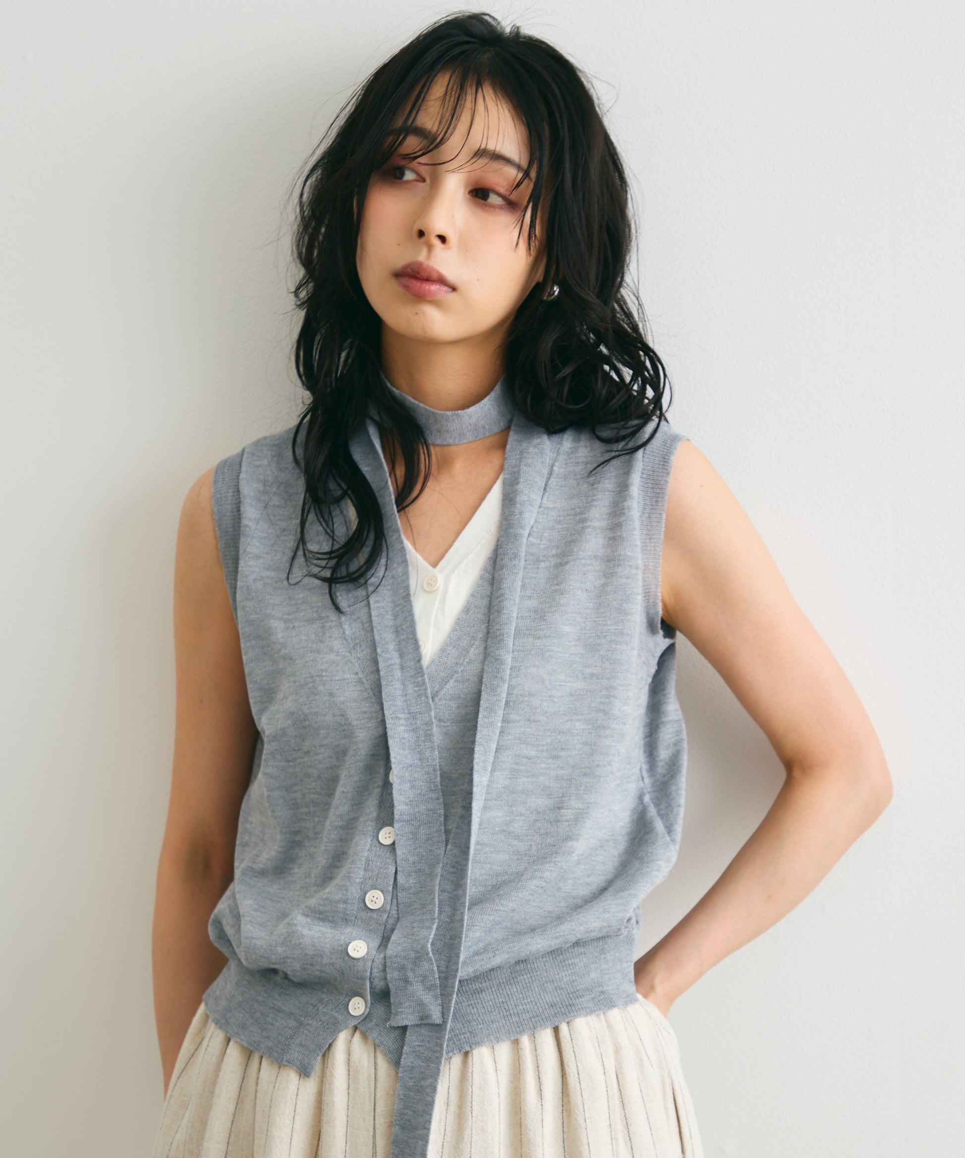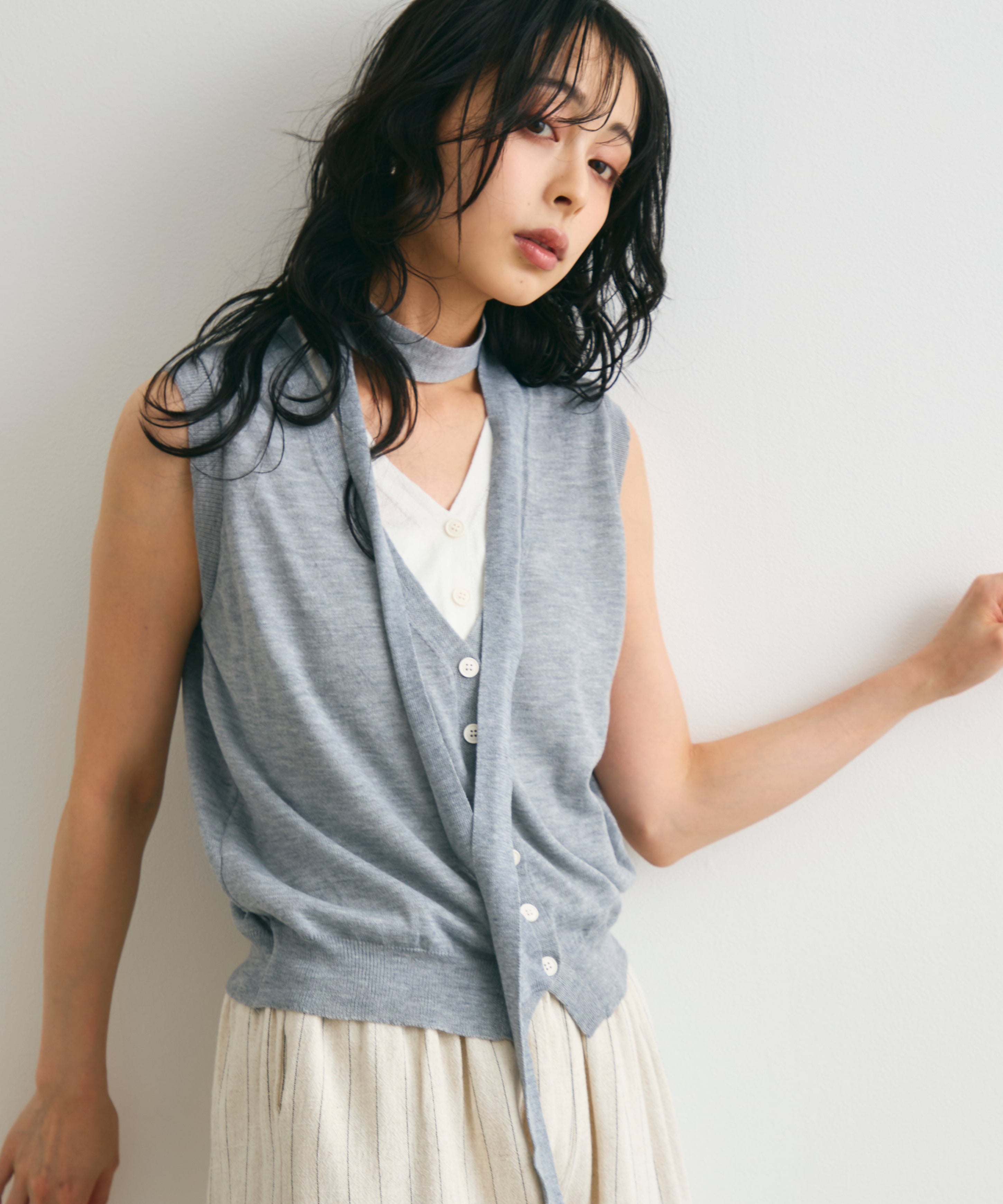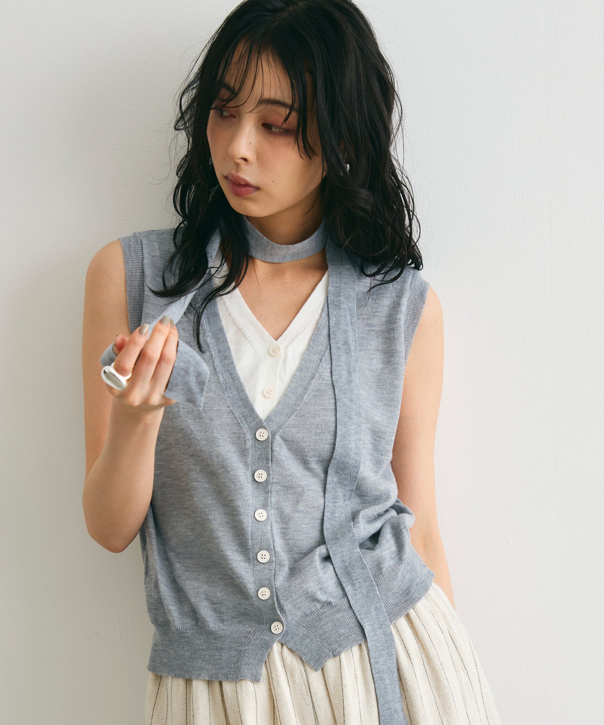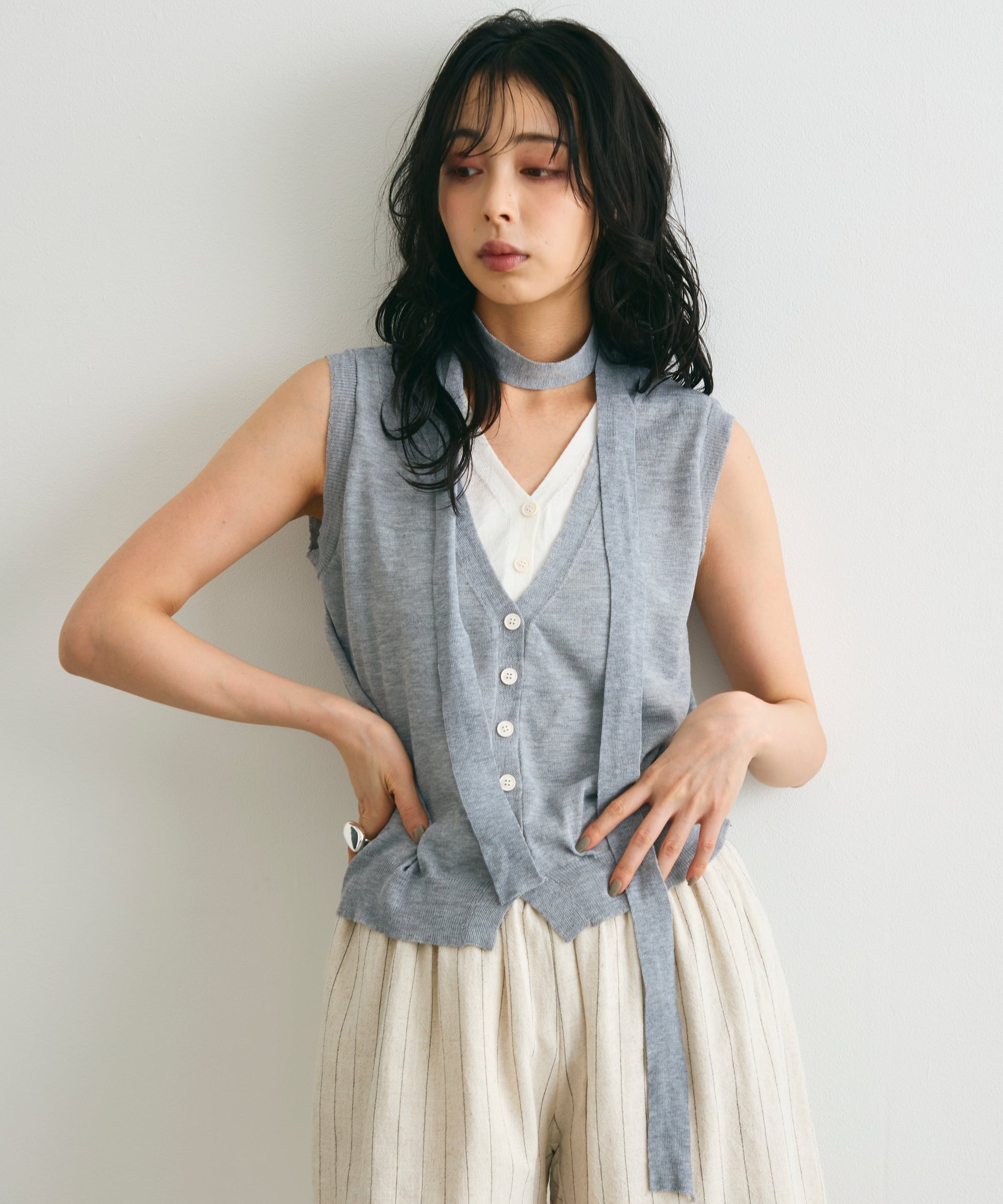 重ね着しているように見えるデザインがポイントのレイヤードライクジレ。