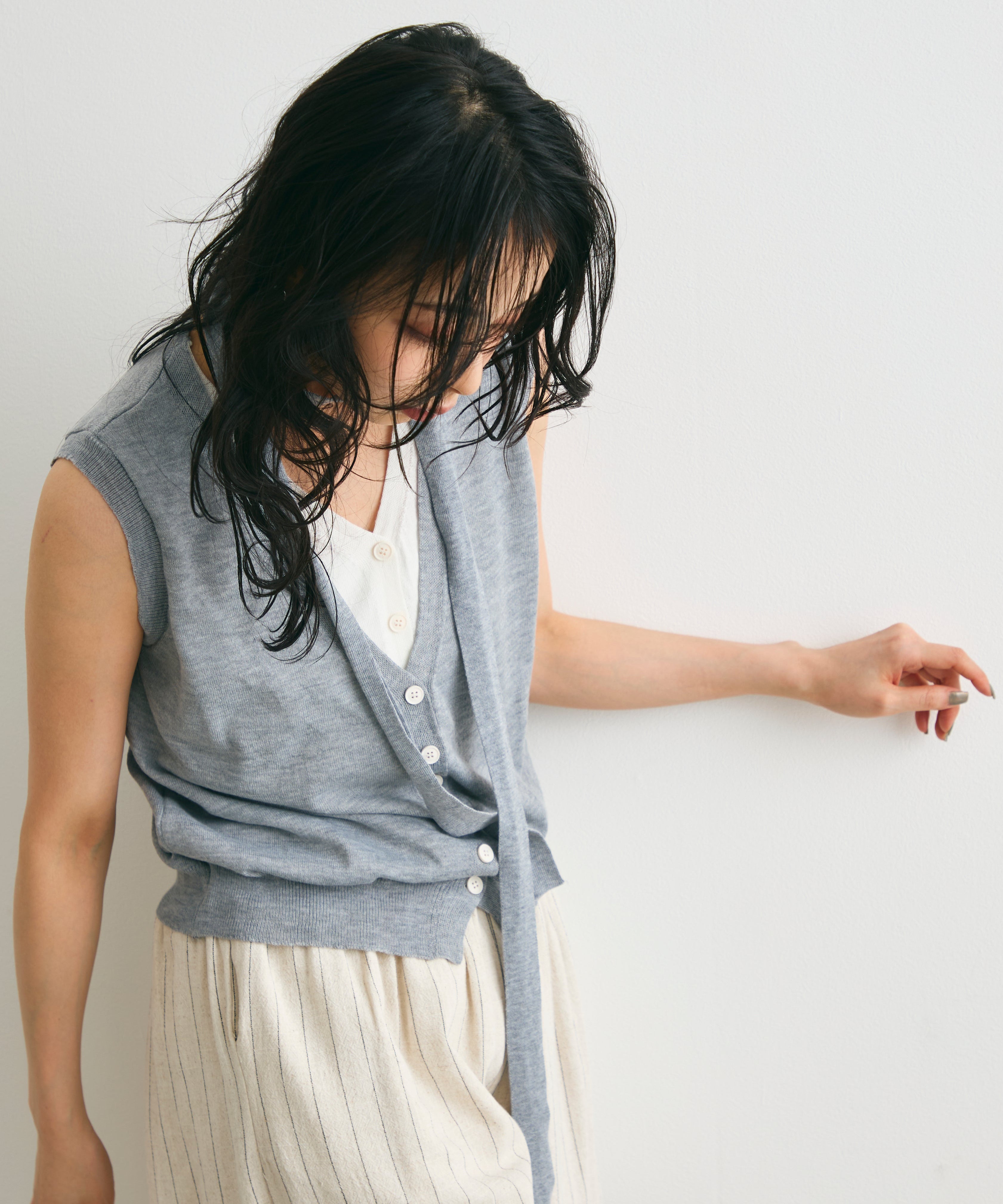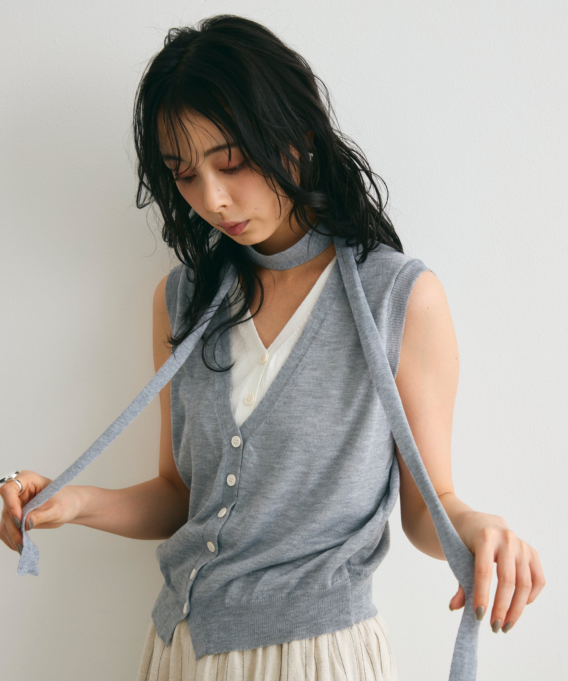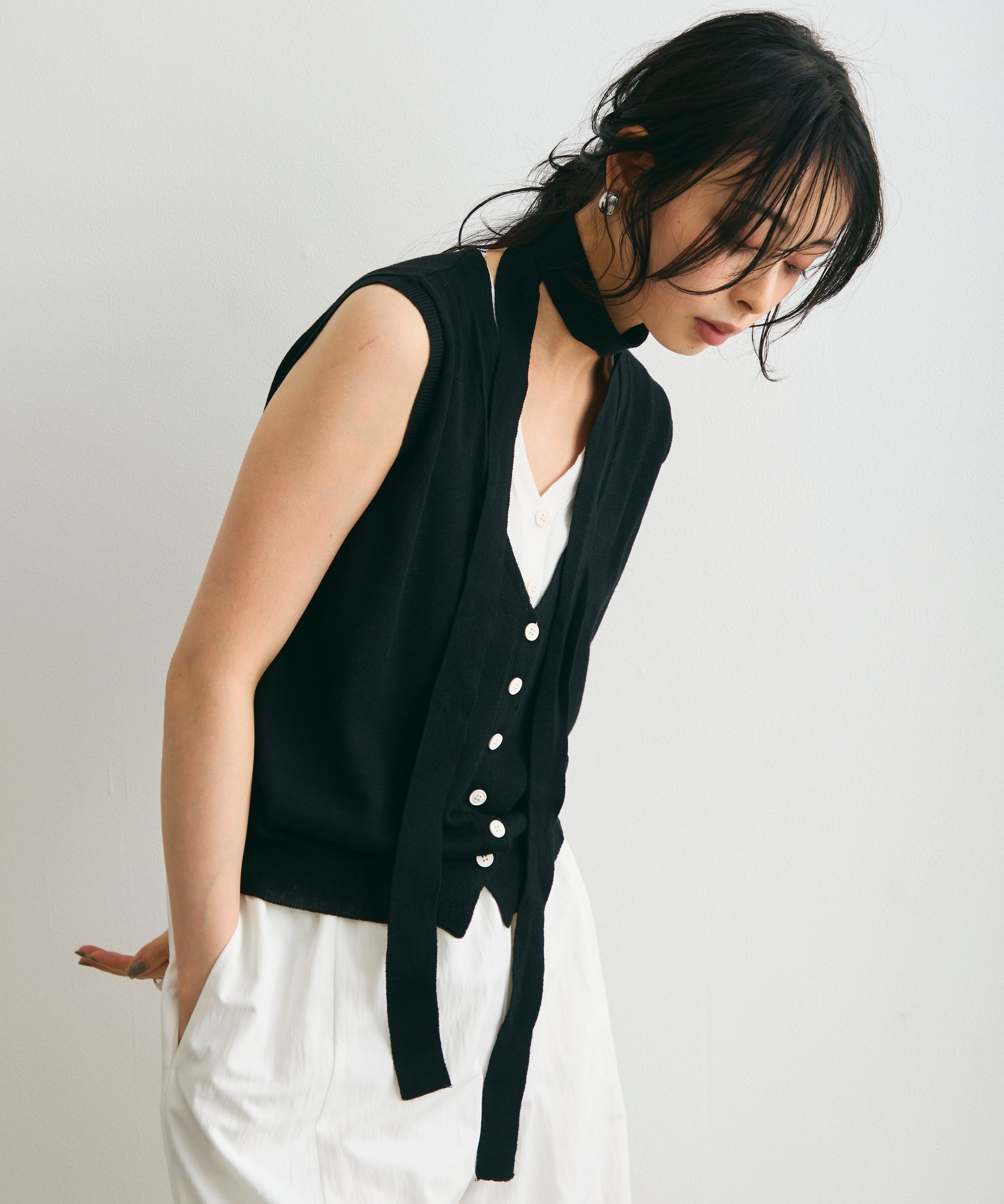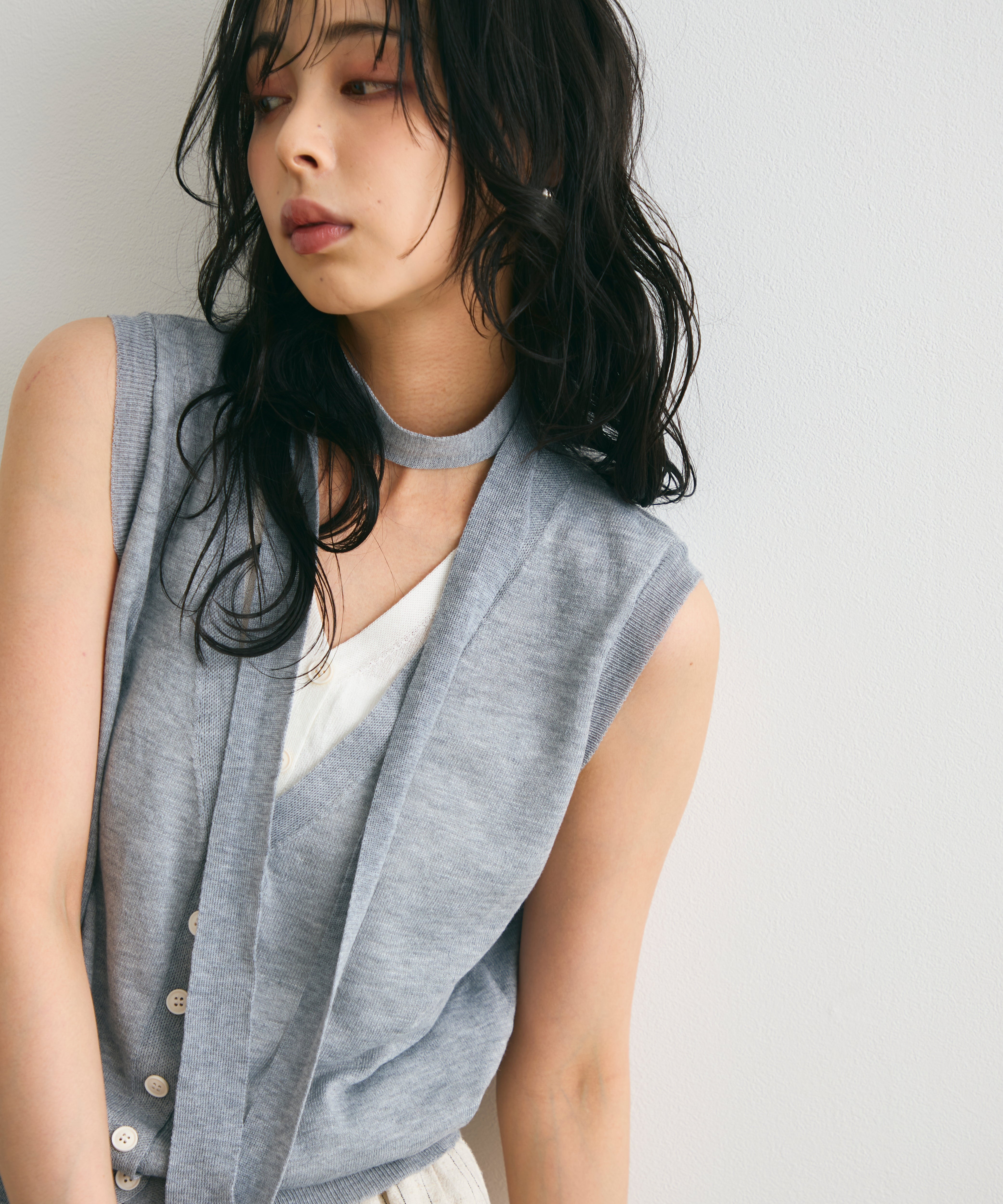 重ね着しているように見えるデザインがポイントのレイヤードライクジレ。