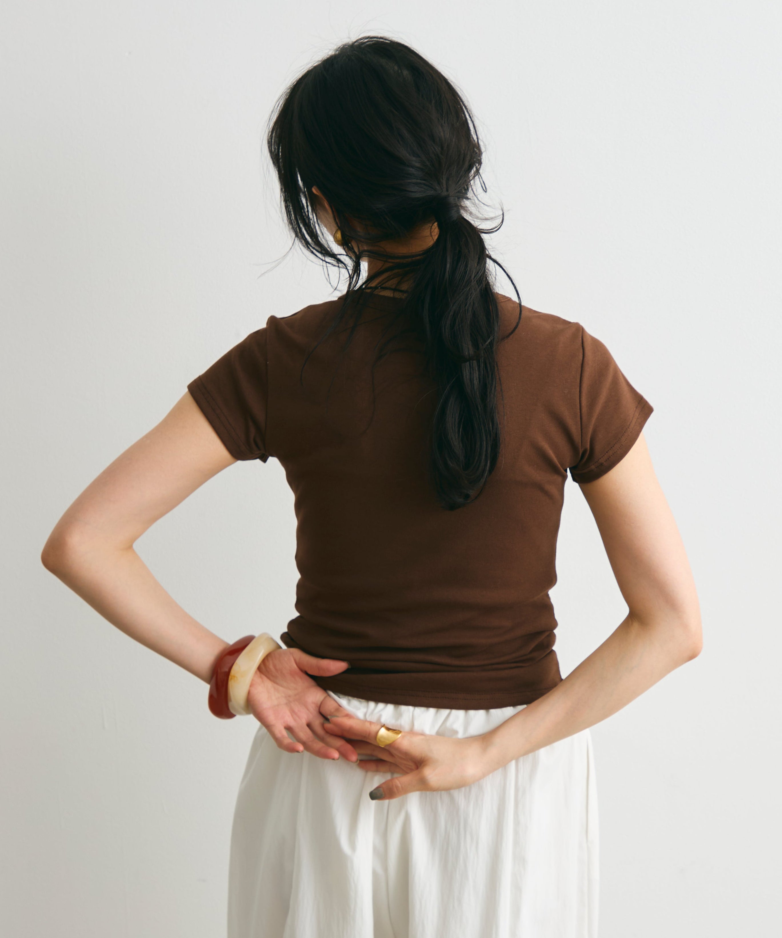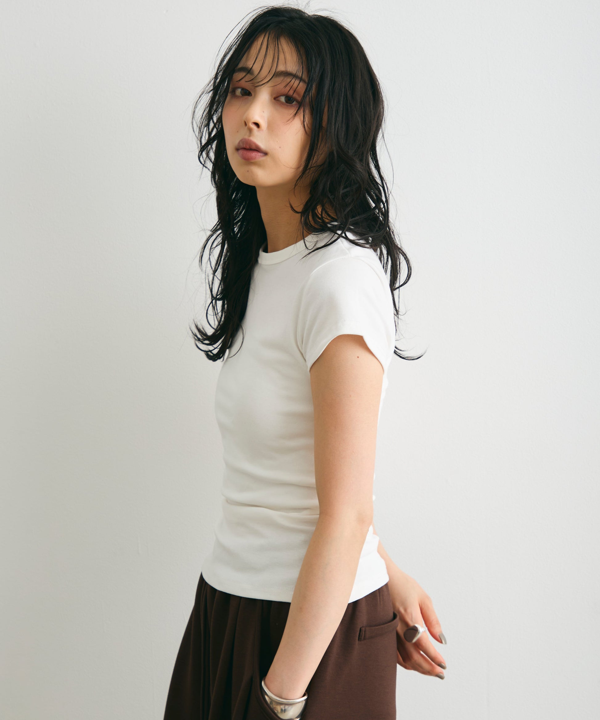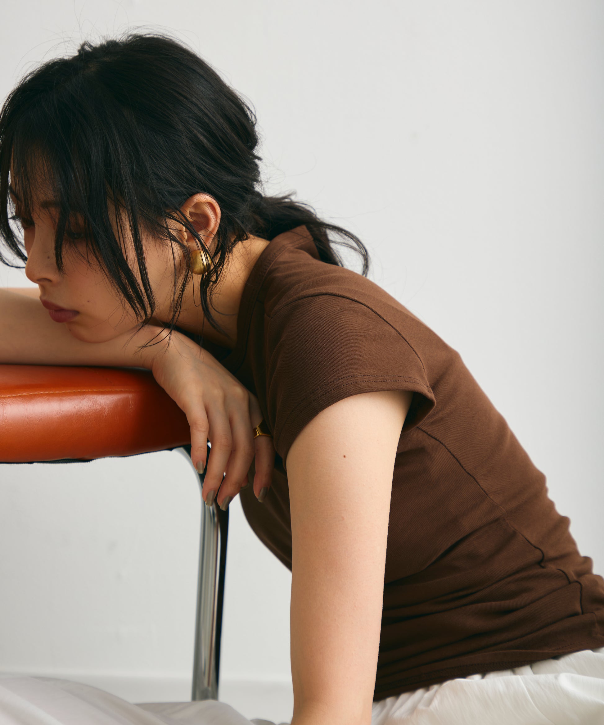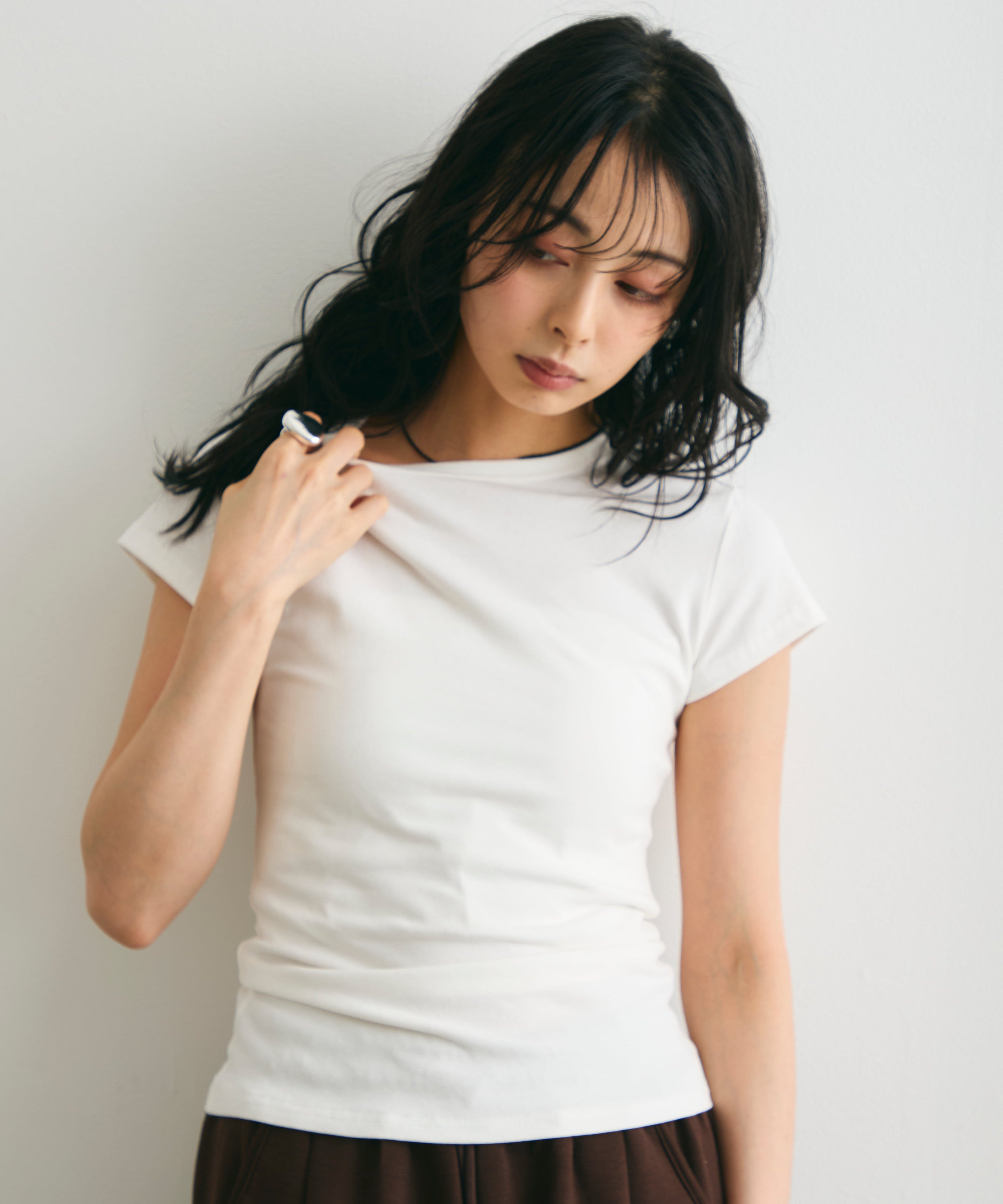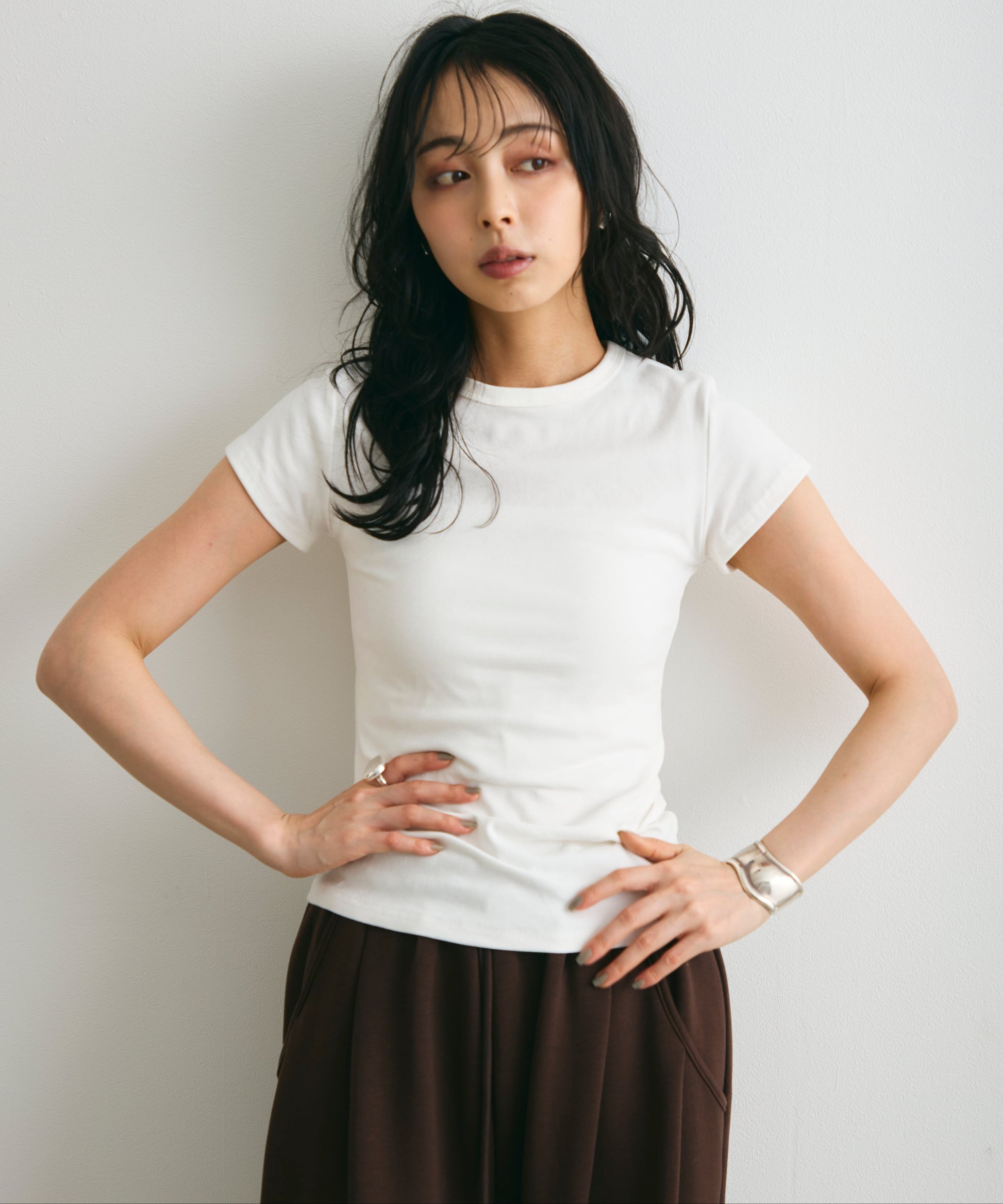 シンプルながら女性らしいシルエットが魅力のクルーネックフレンチTシャツ。