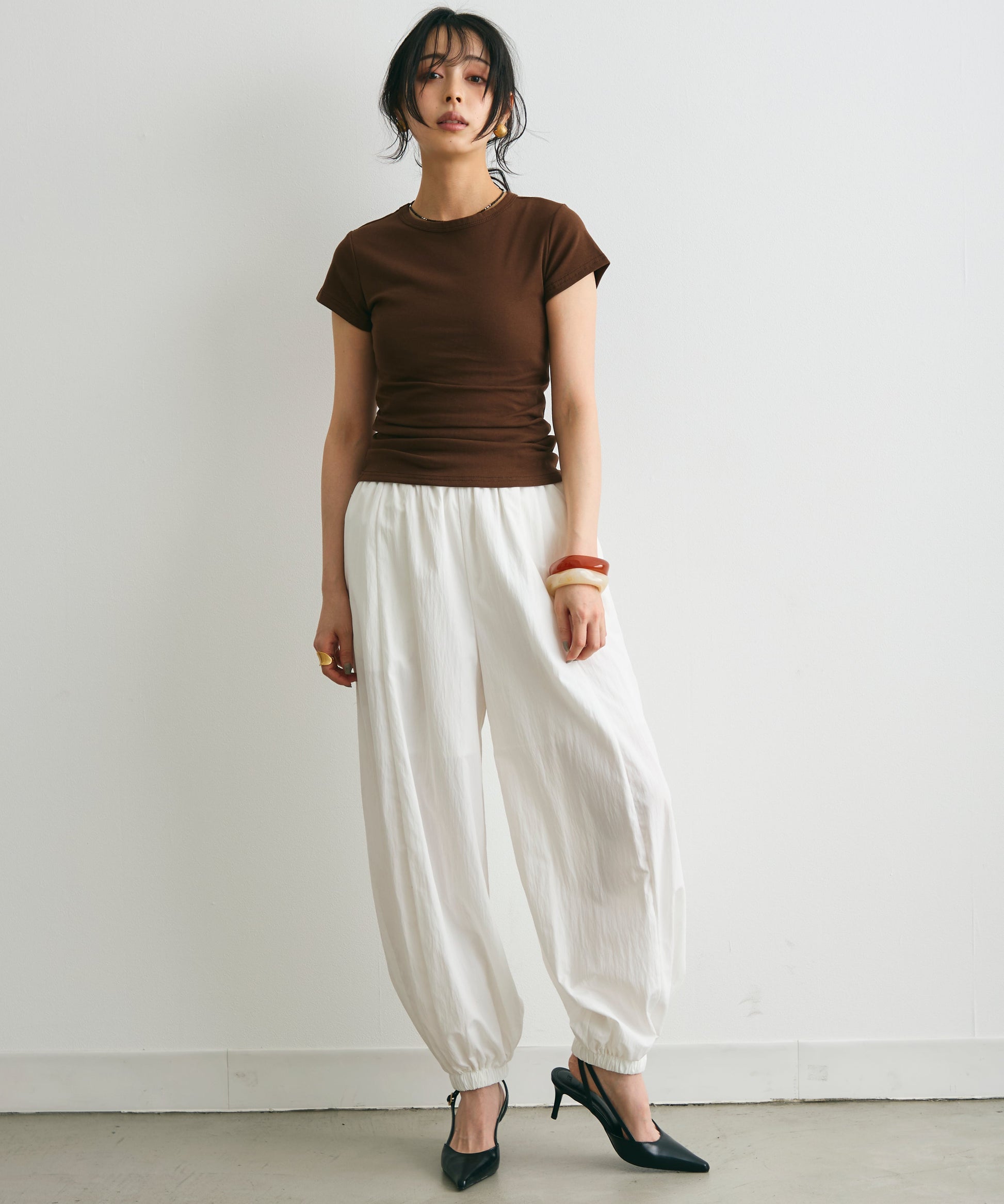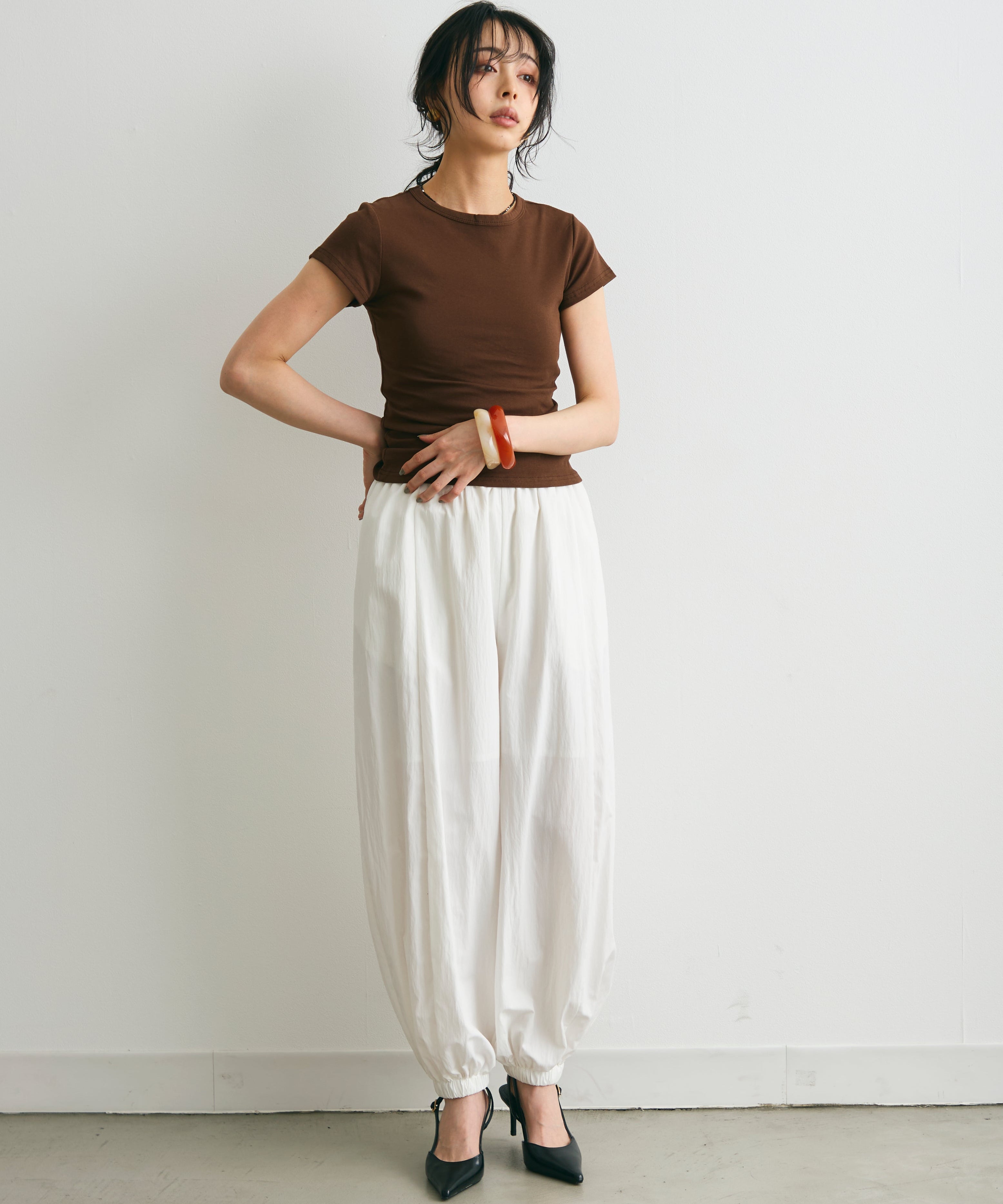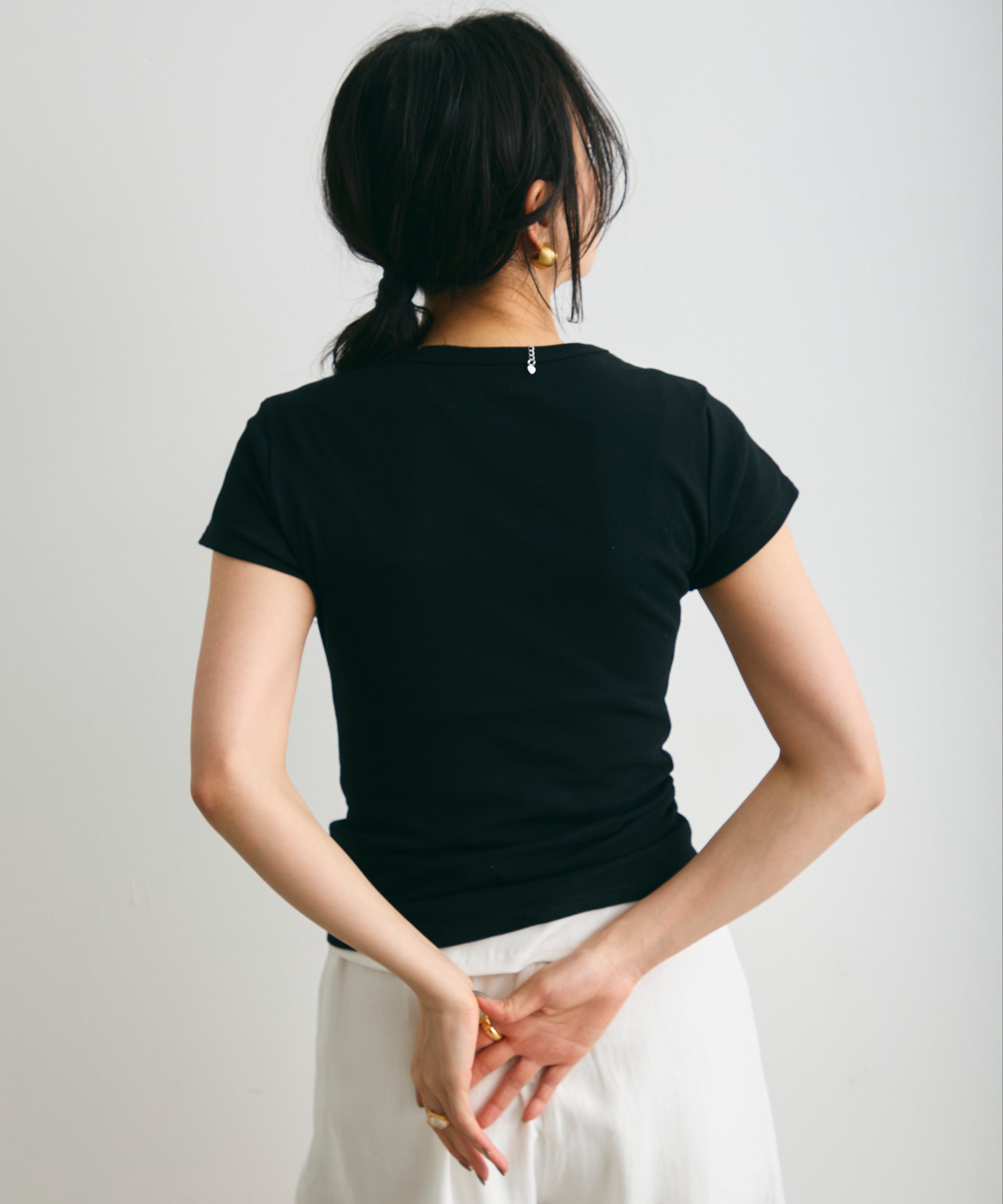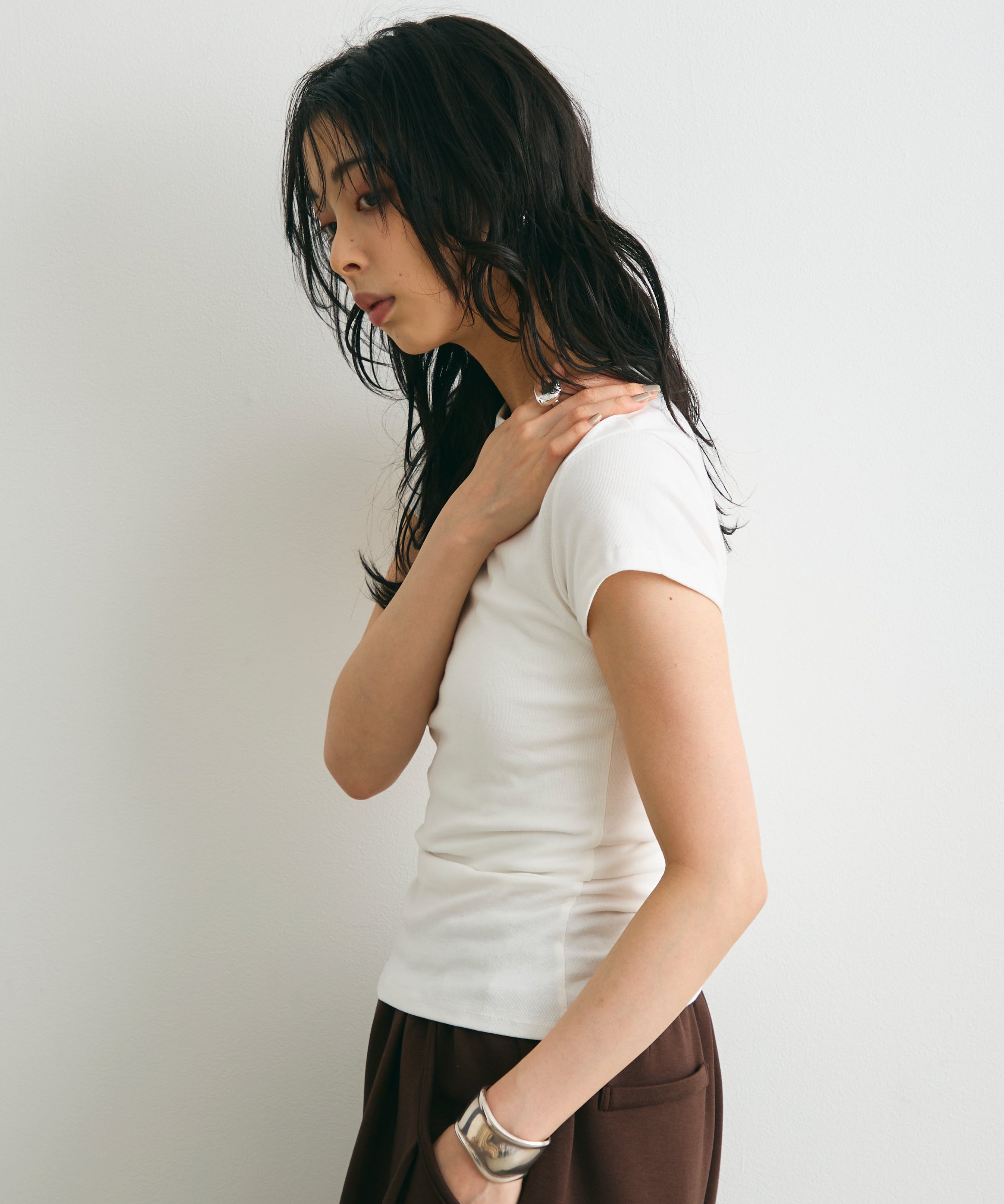 シンプルながら女性らしいシルエットが魅力のクルーネックフレンチTシャツ。