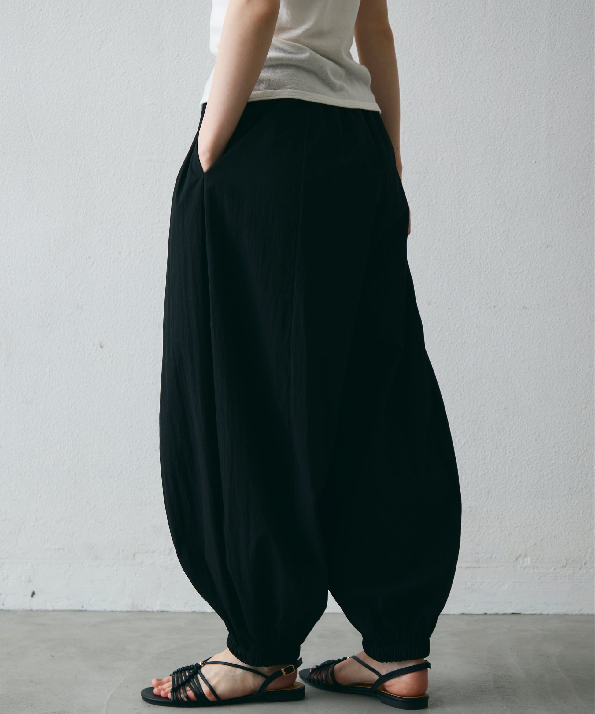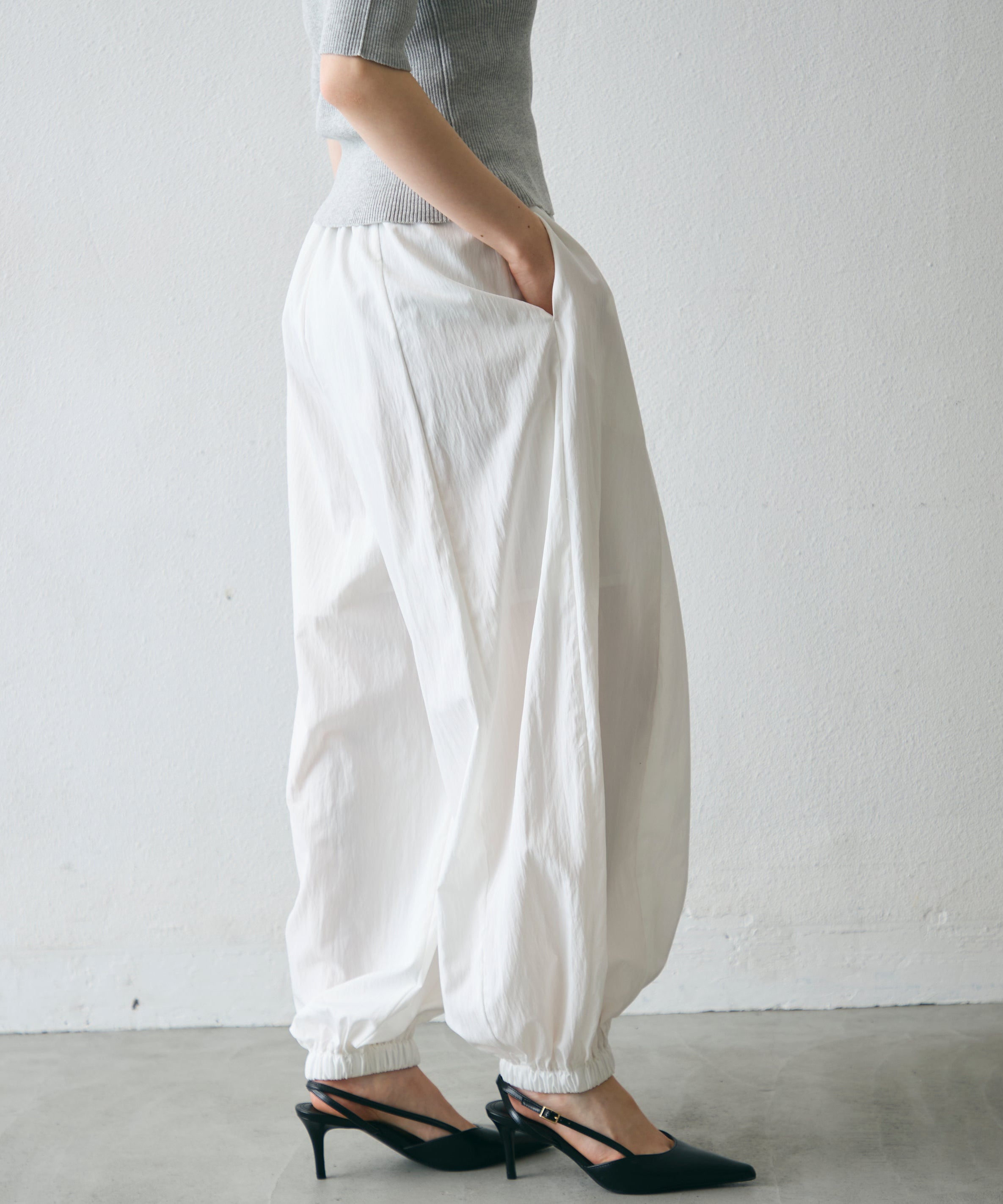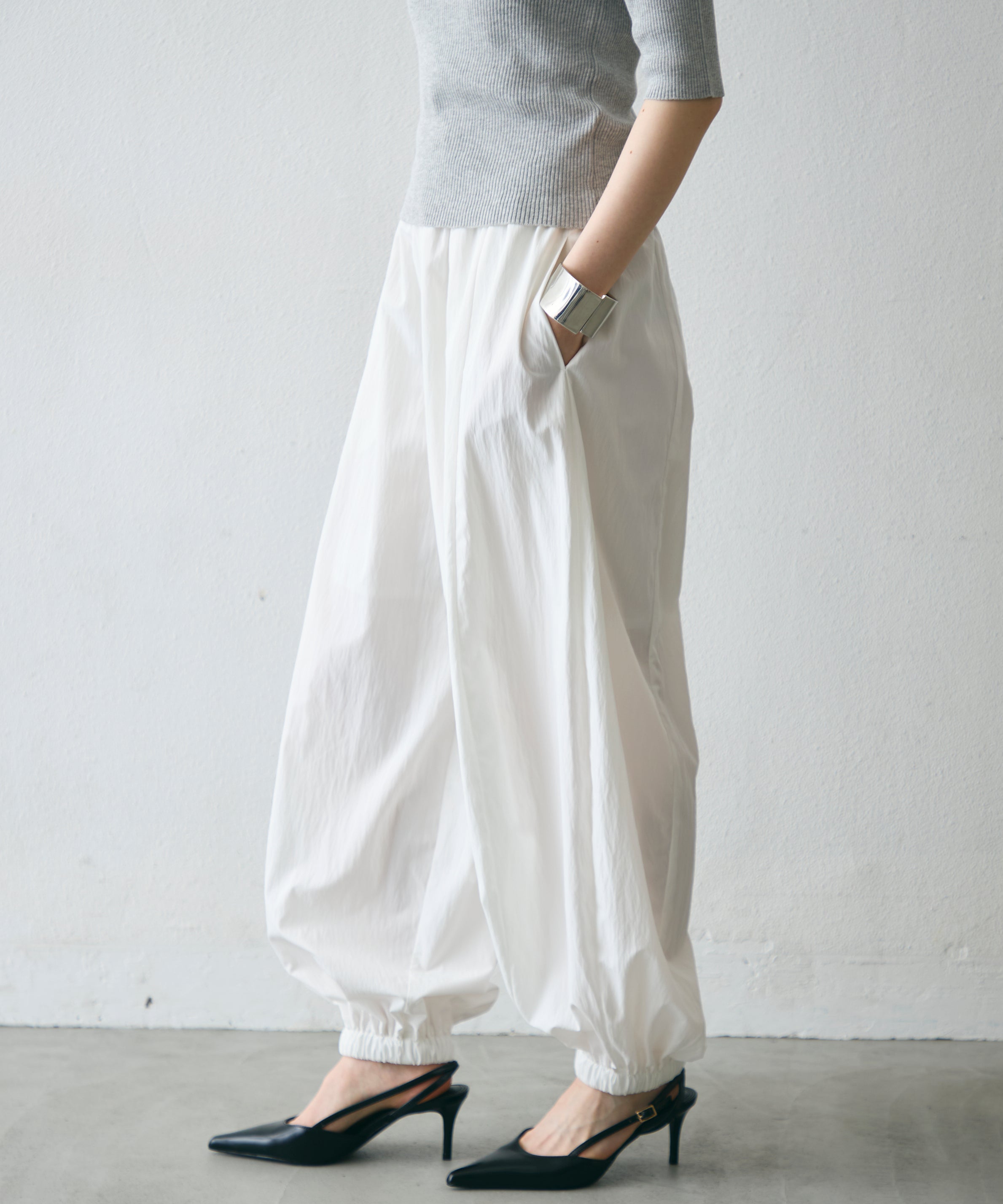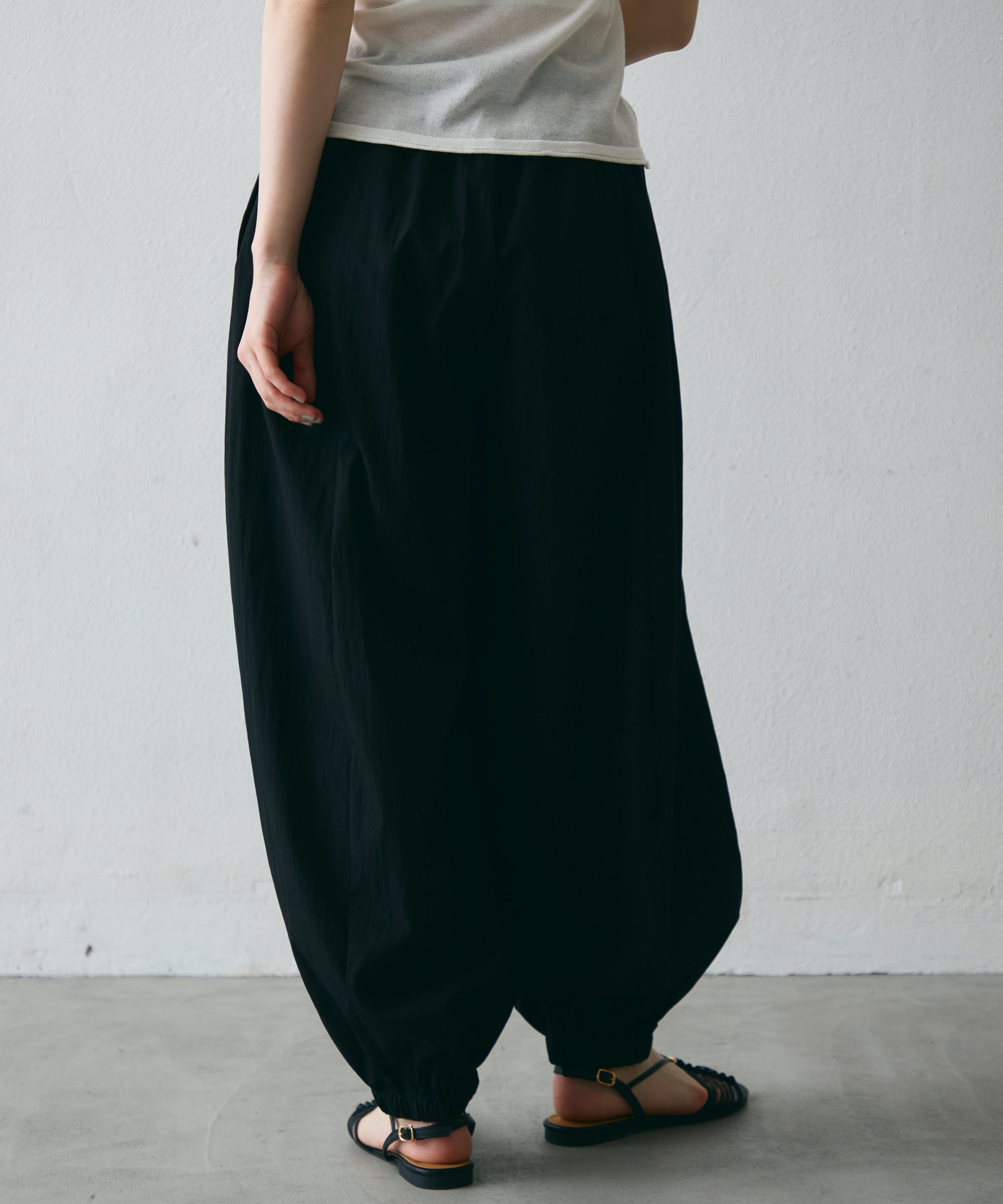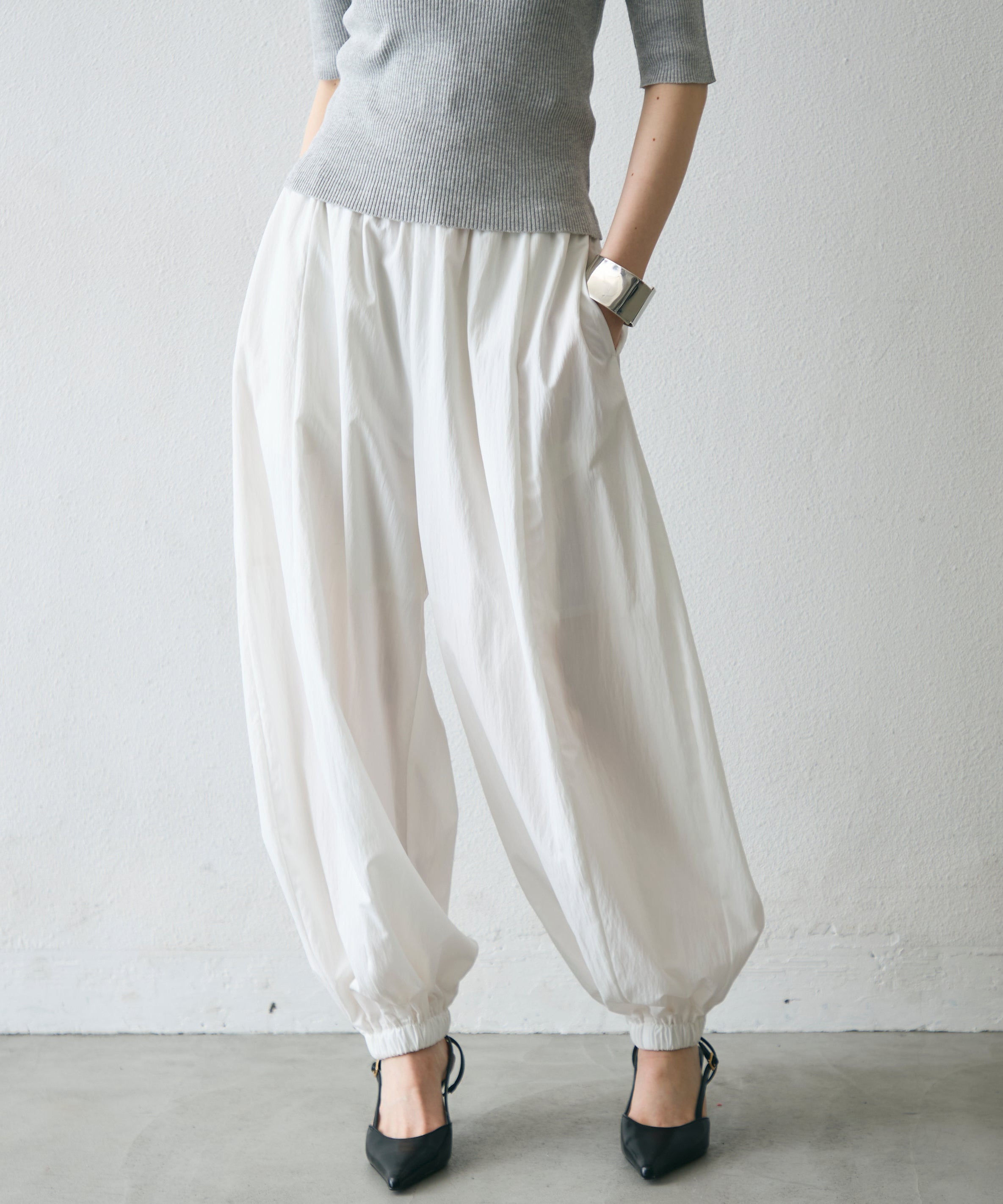 ワッシャー加工の表情感と、バルーンシルエットの落ち感が上品に映えるロングパンツ。軽やかな素材が動くたびに揺れ、1枚で洗練されたスタイルが完成。シンプルなトップスと合わせるだけで大人のきれいめコーデに。
