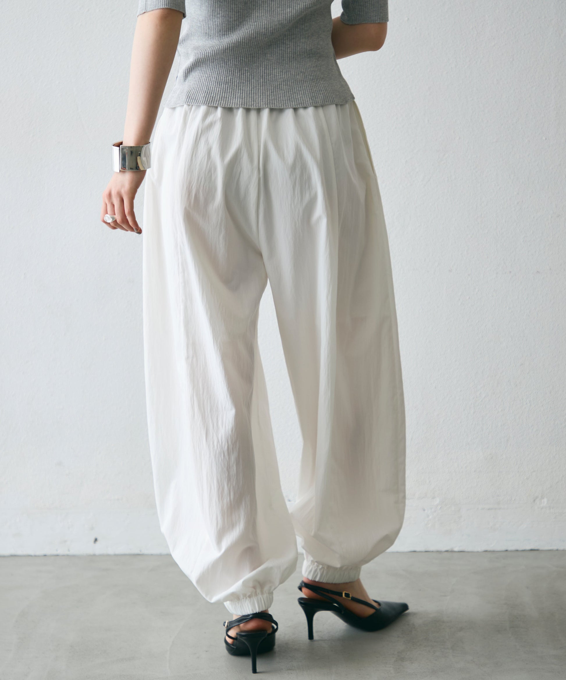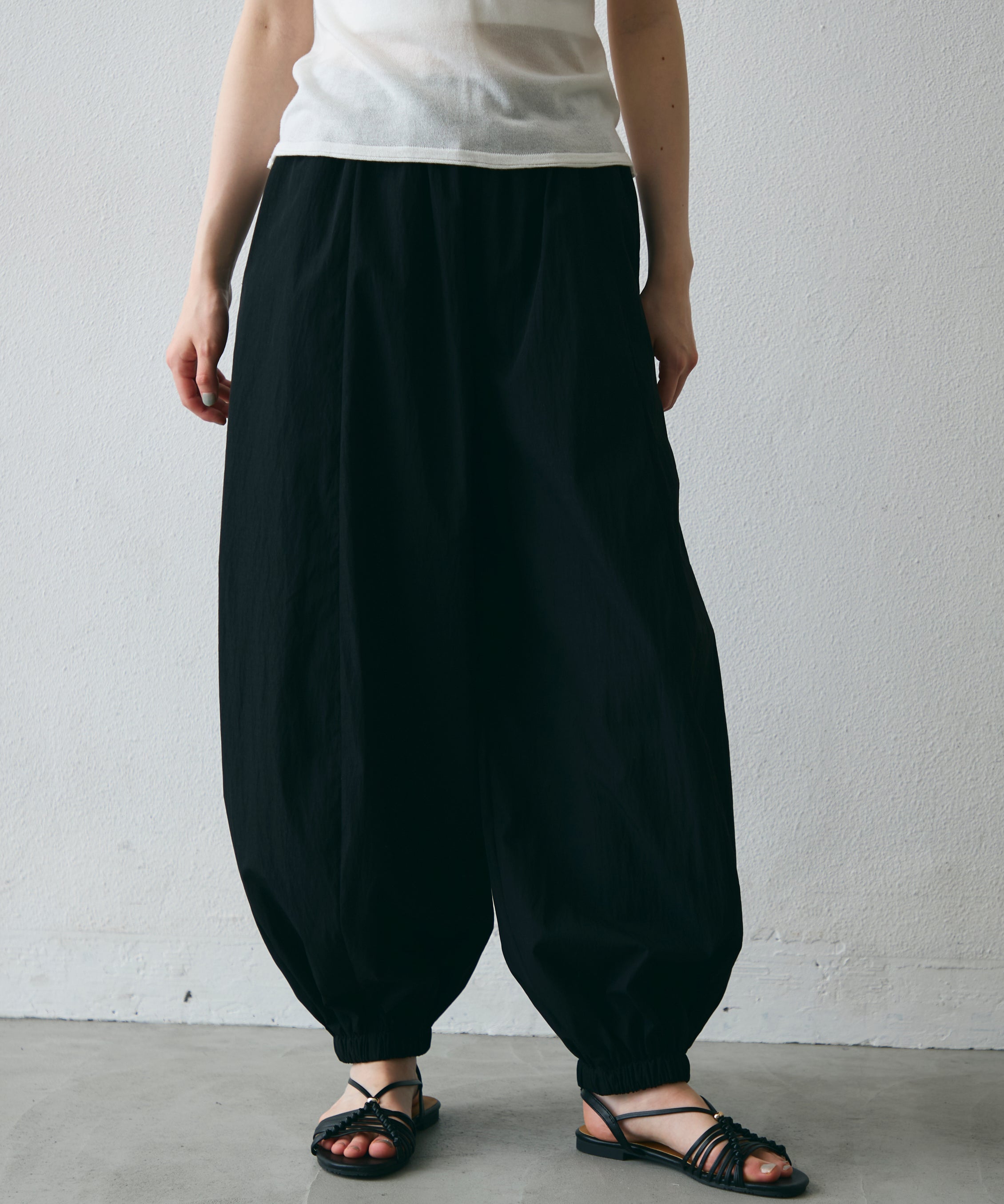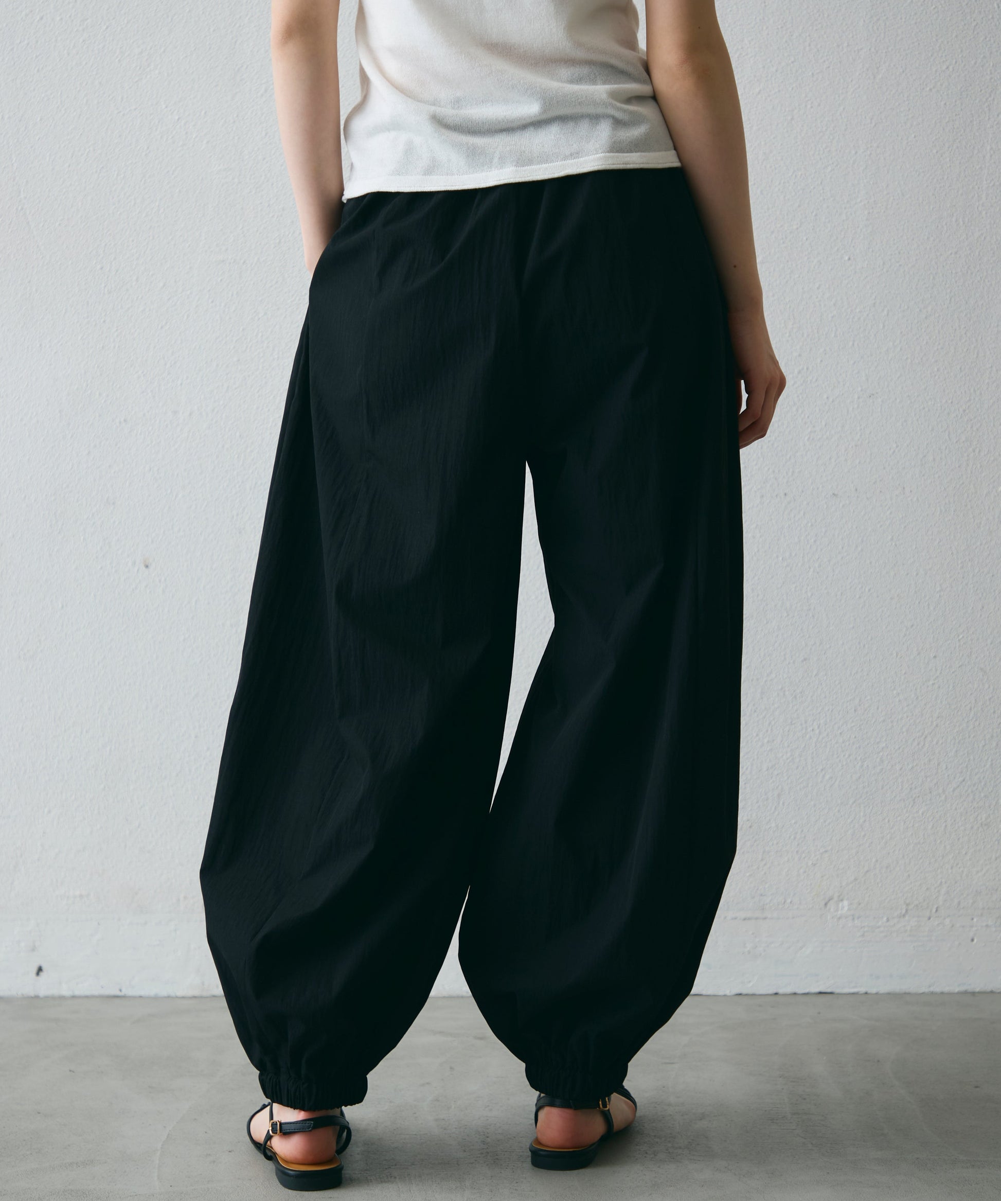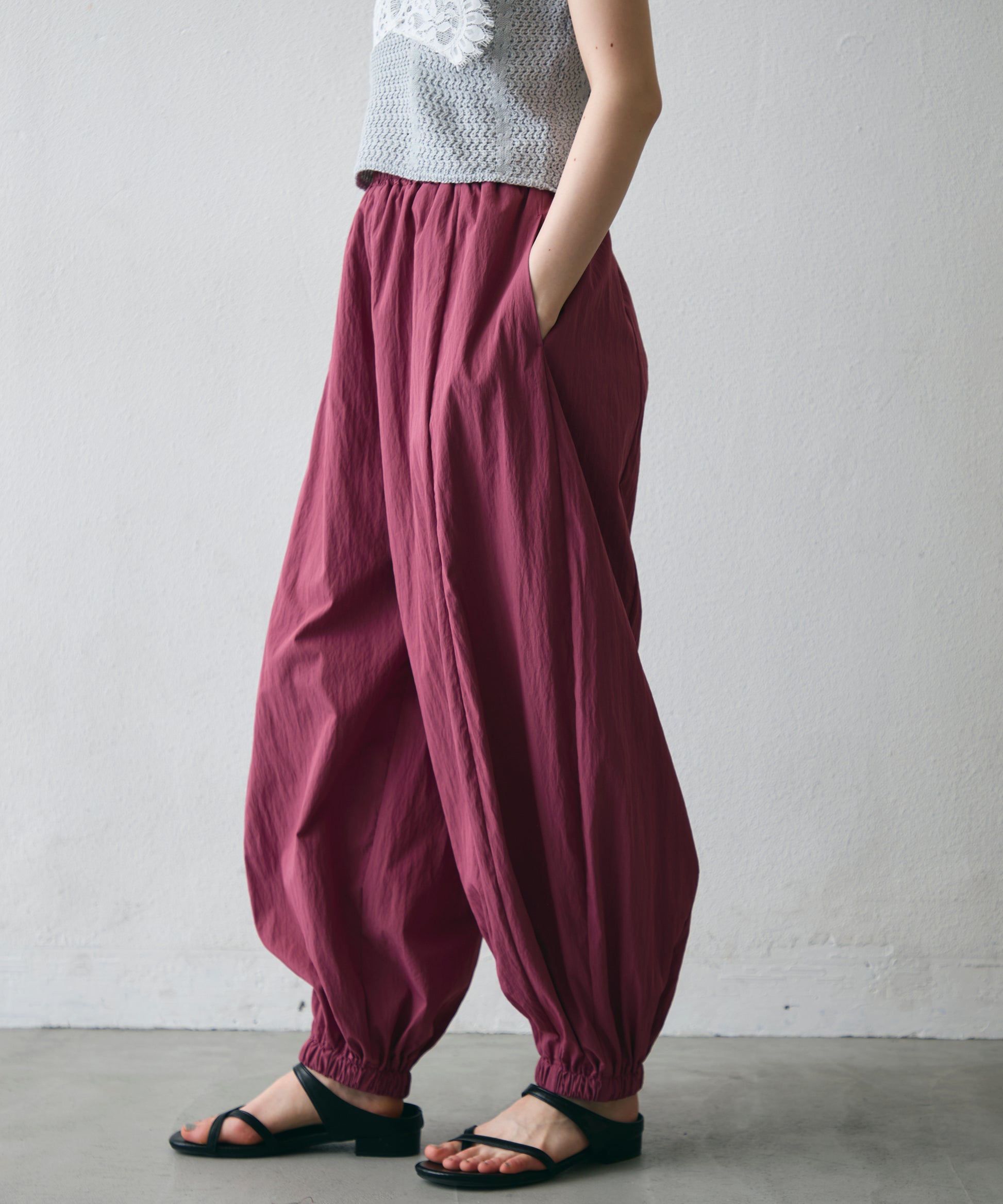 ワッシャー加工の表情感と、バルーンシルエットの落ち感が上品に映えるロングパンツ。軽やかな素材が動くたびに揺れ、1枚で洗練されたスタイルが完成。シンプルなトップスと合わせるだけで大人のきれいめコーデに。