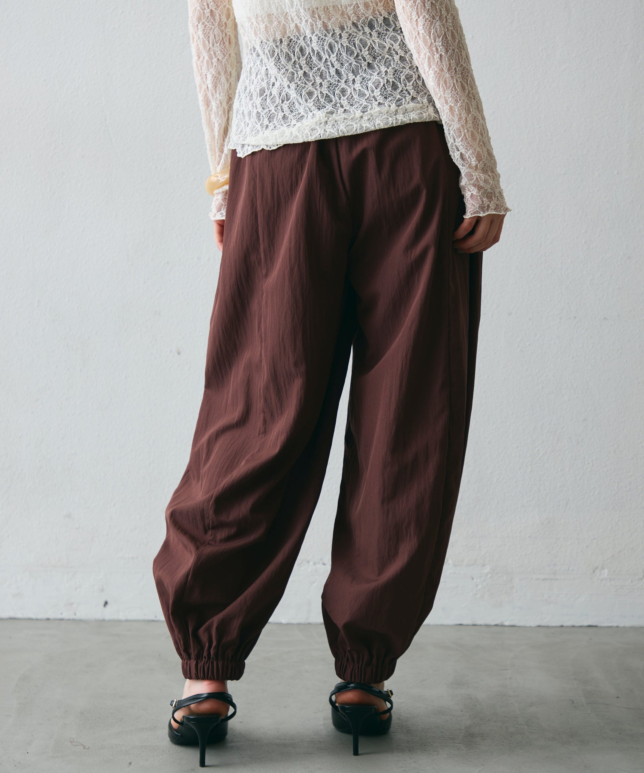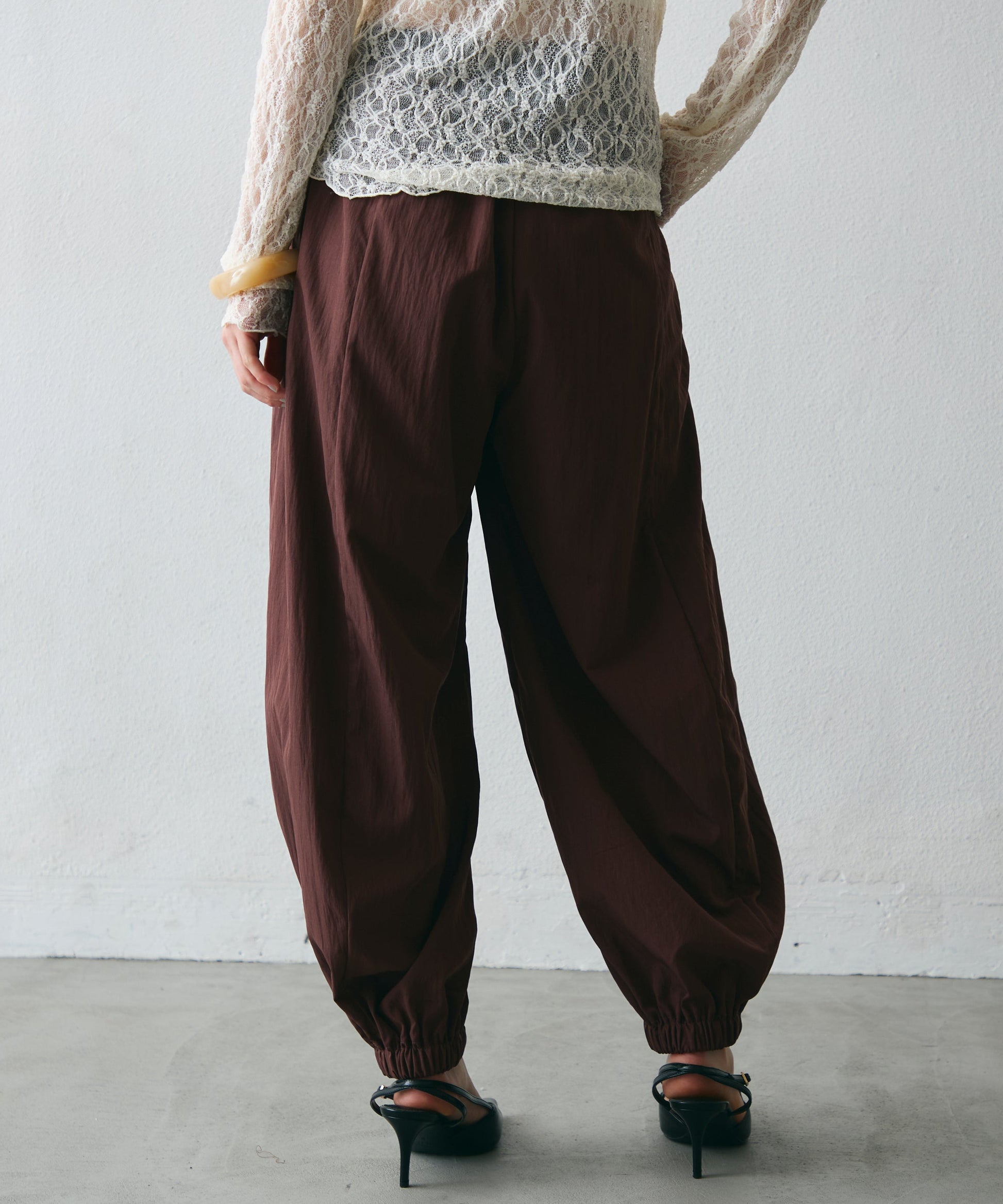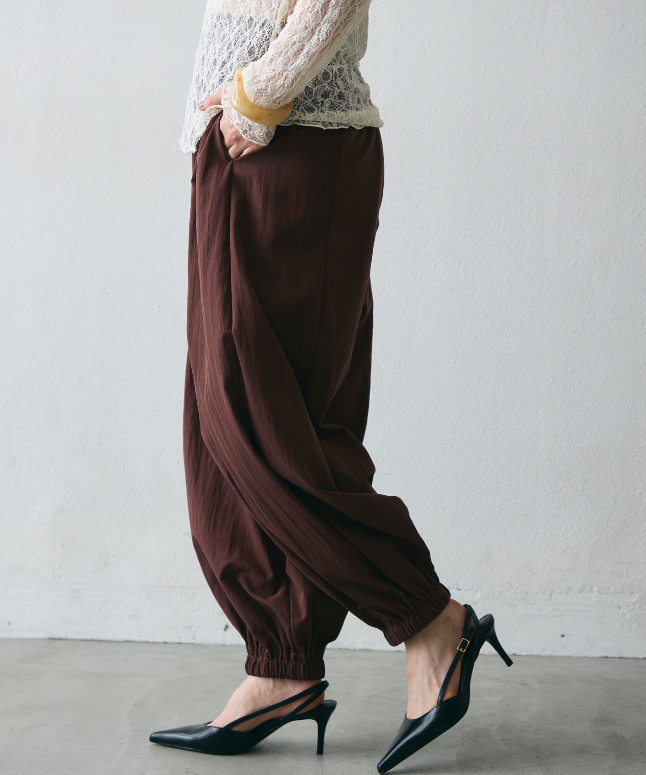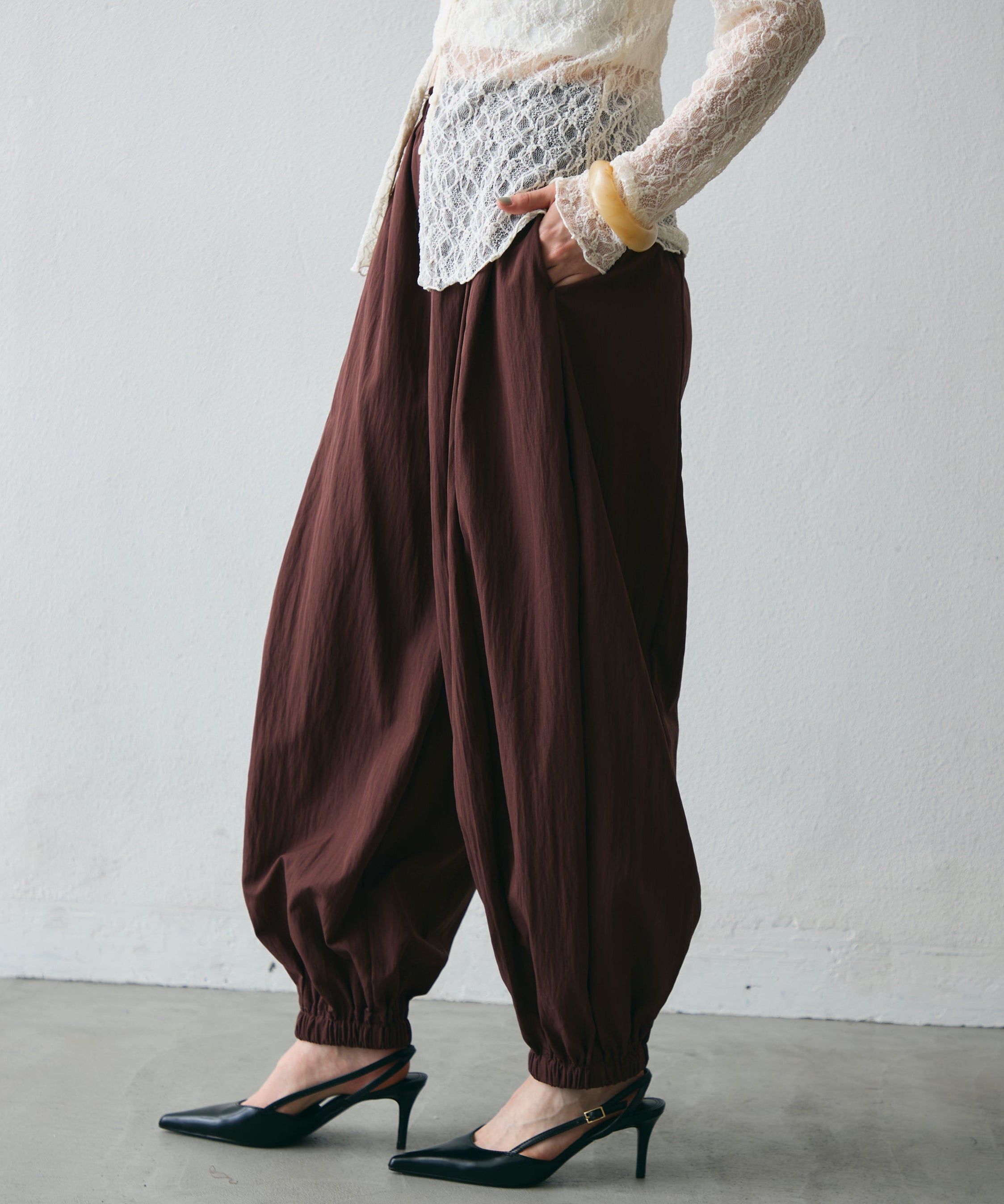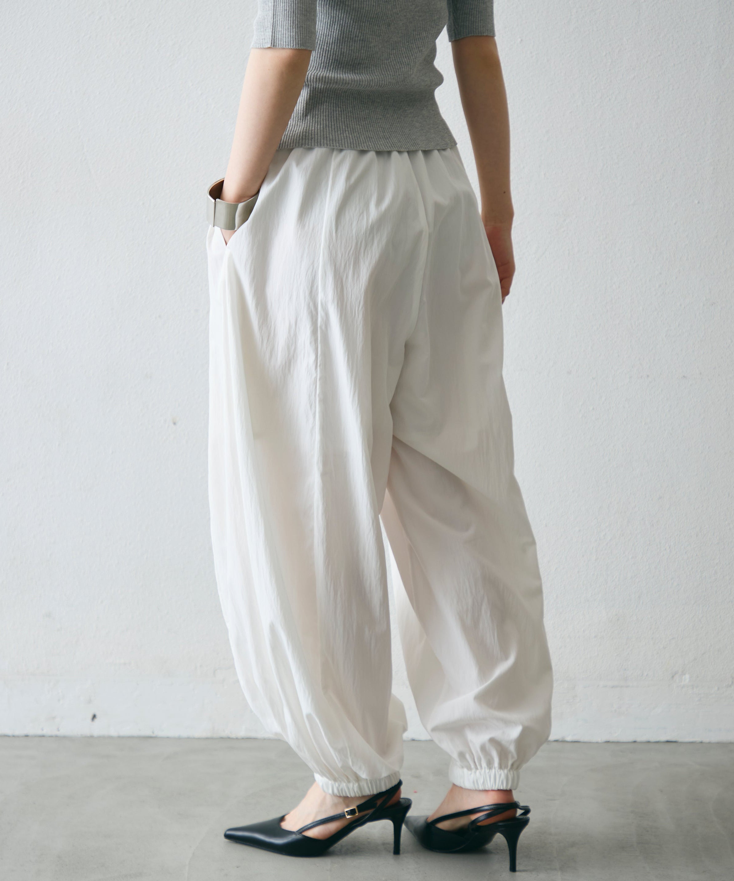 ワッシャー加工の表情感と、バルーンシルエットの落ち感が上品に映えるロングパンツ。軽やかな素材が動くたびに揺れ、1枚で洗練されたスタイルが完成。シンプルなトップスと合わせるだけで大人のきれいめコーデに。