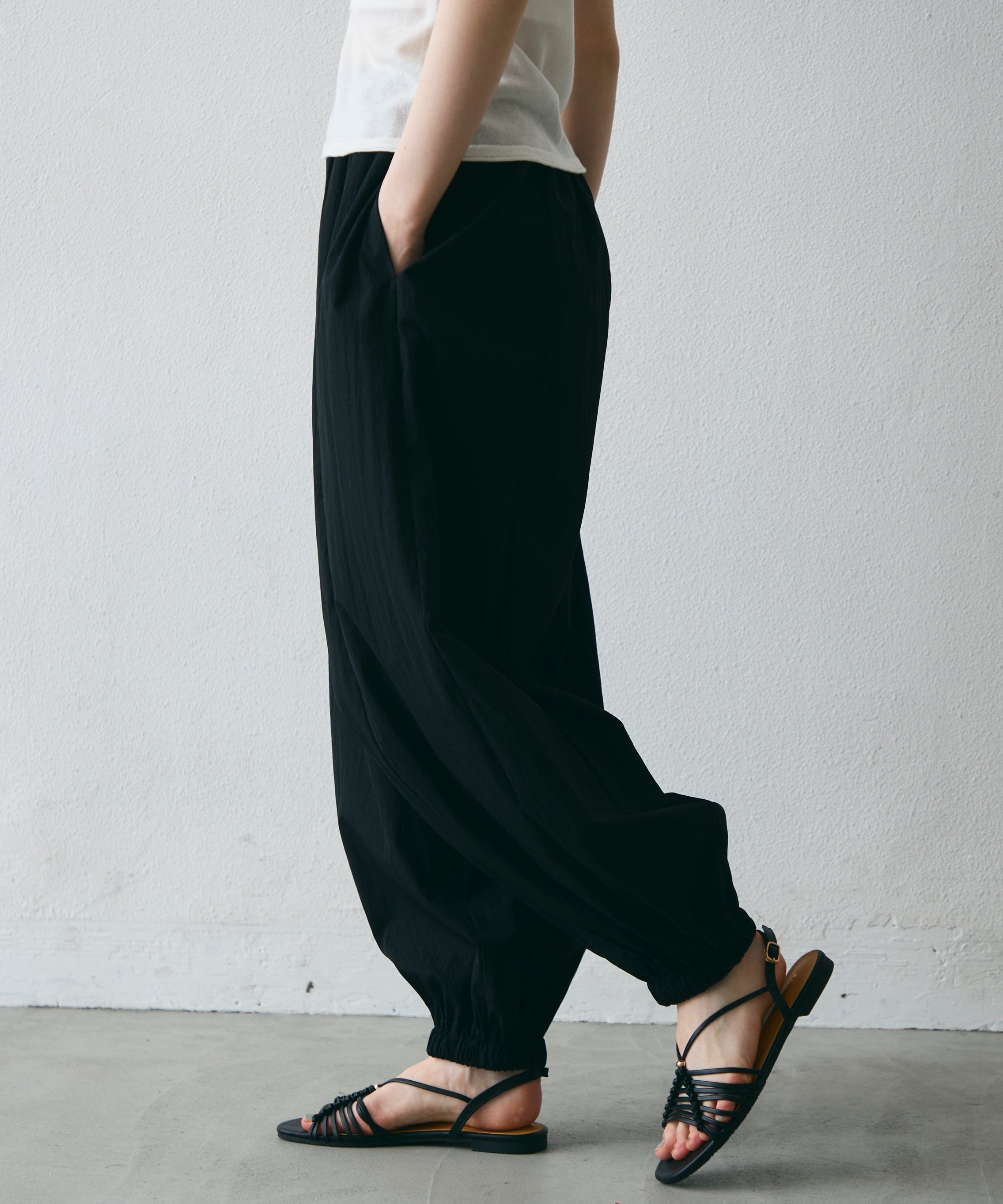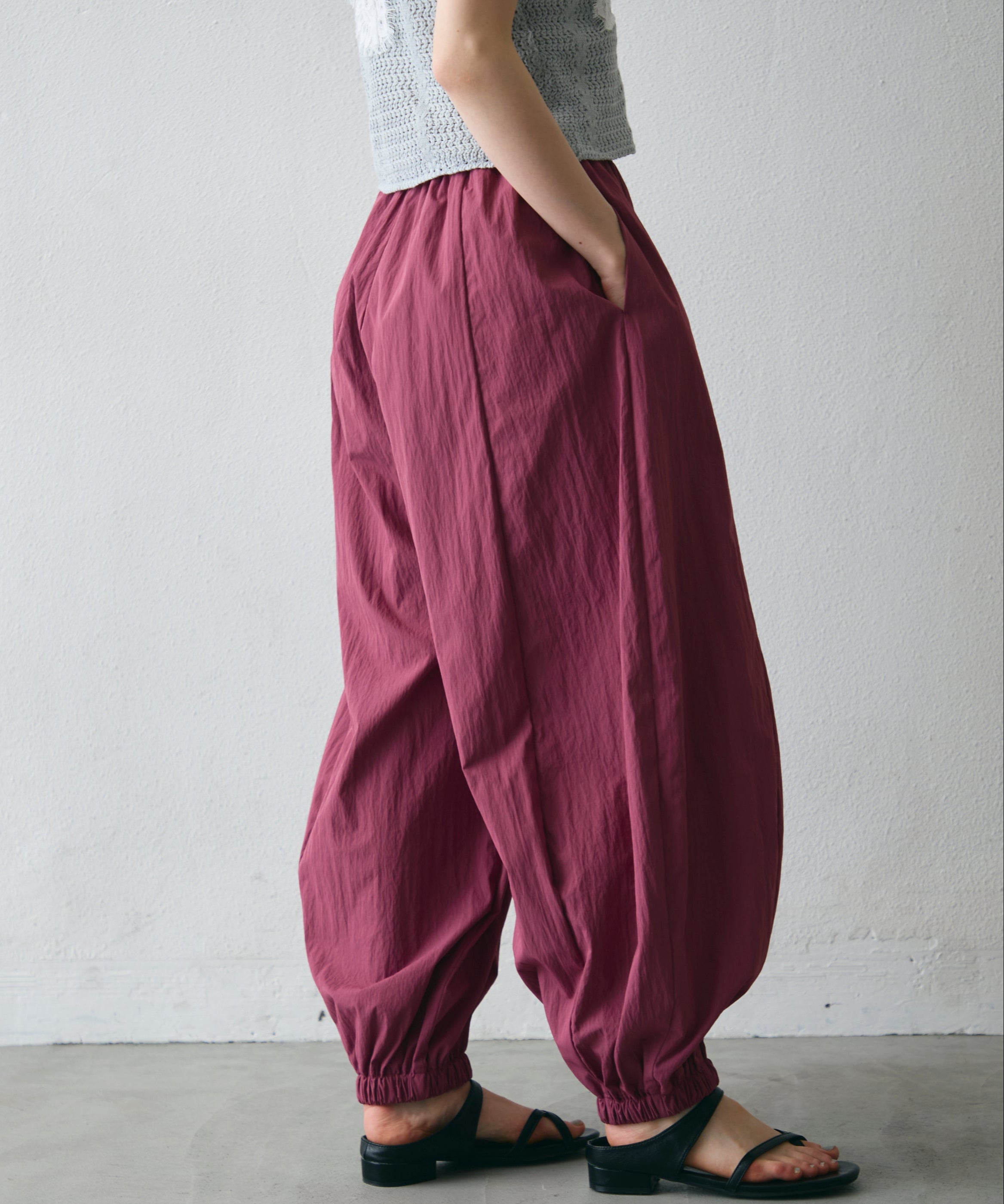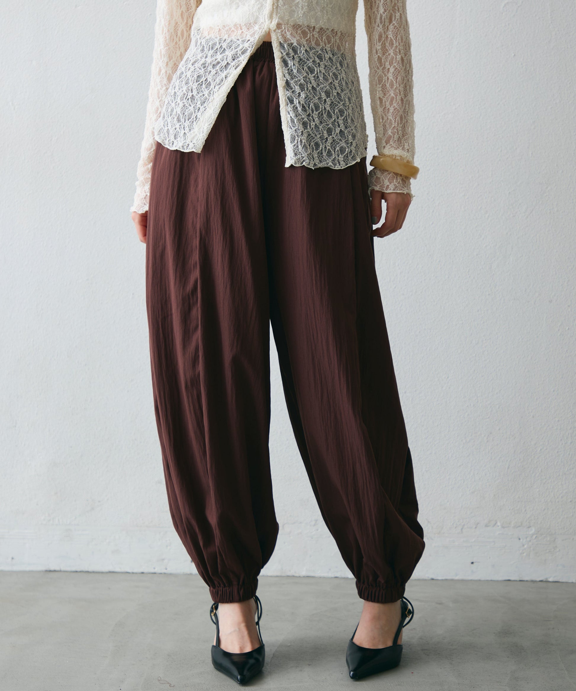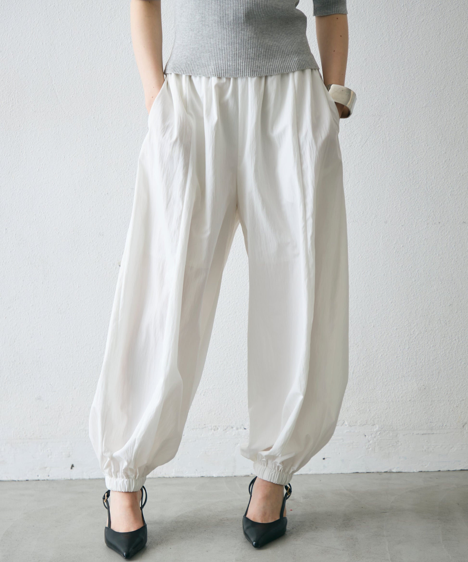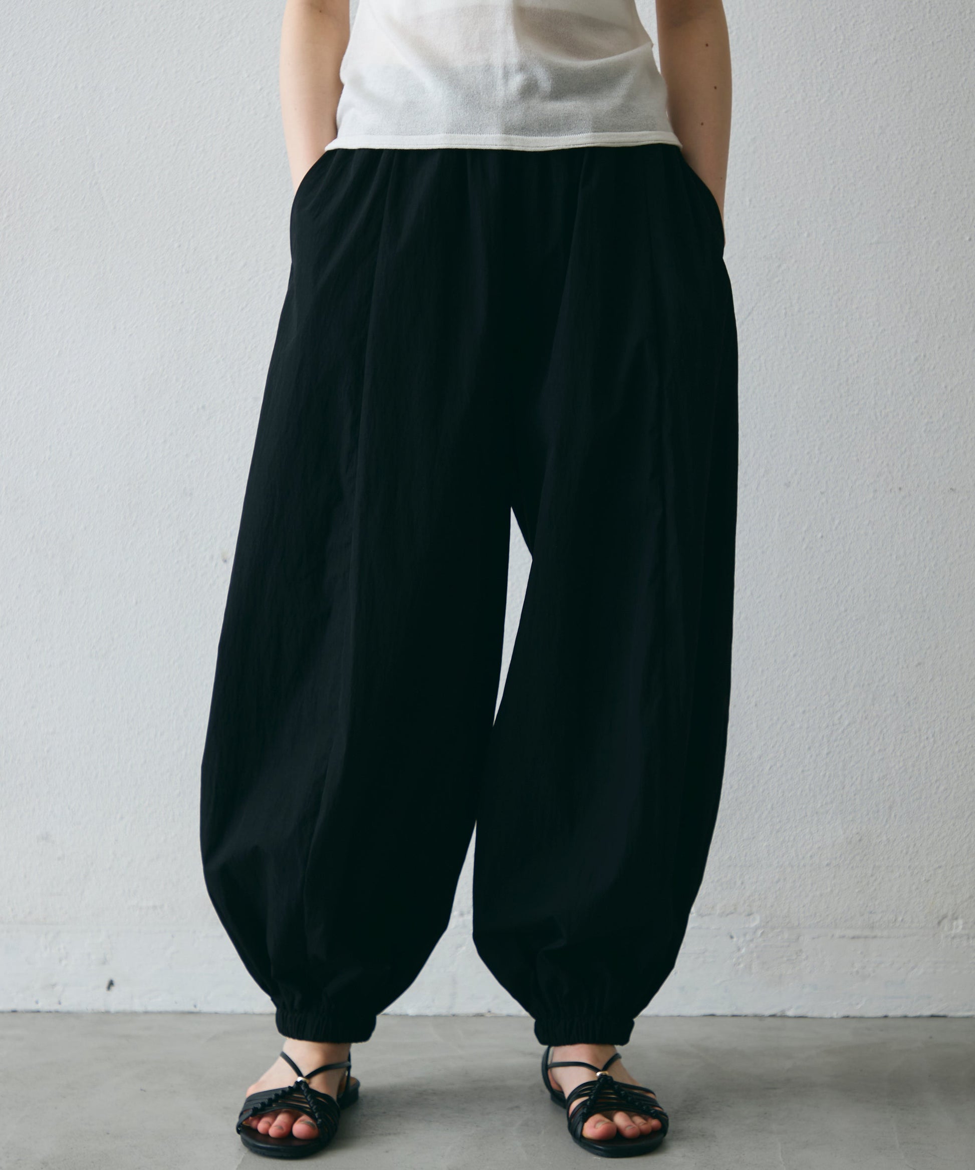 ワッシャー加工の表情感と、バルーンシルエットの落ち感が上品に映えるロングパンツ。軽やかな素材が動くたびに揺れ、1枚で洗練されたスタイルが完成。シンプルなトップスと合わせるだけで大人のきれいめコーデに。