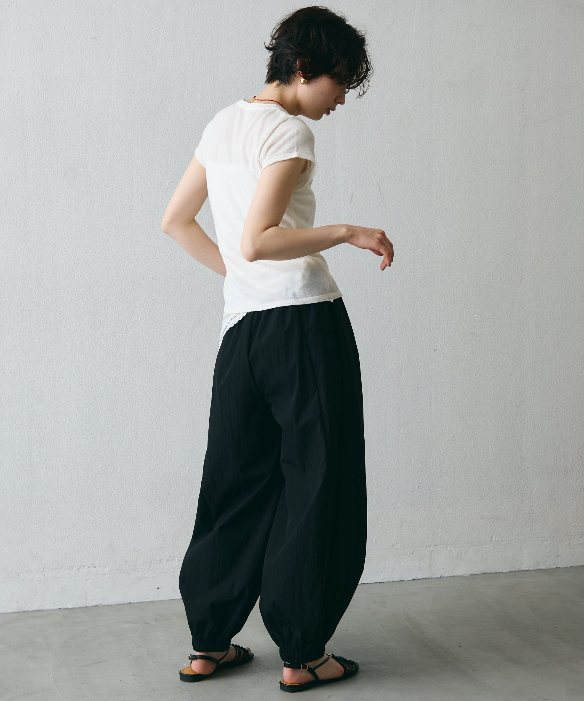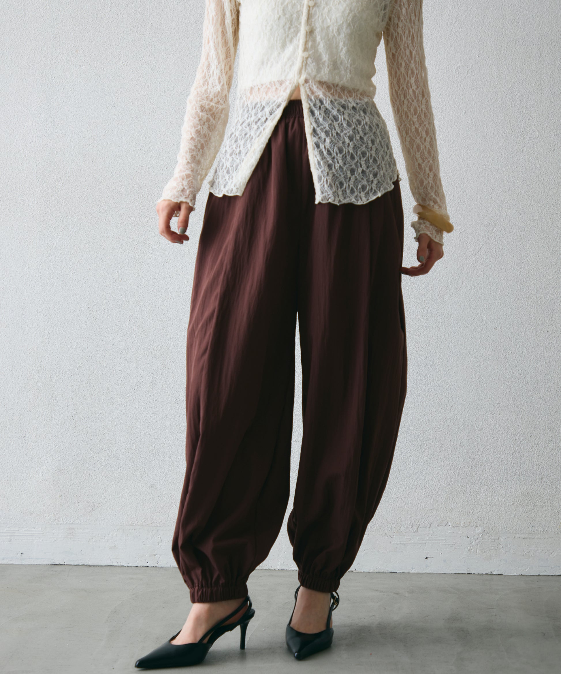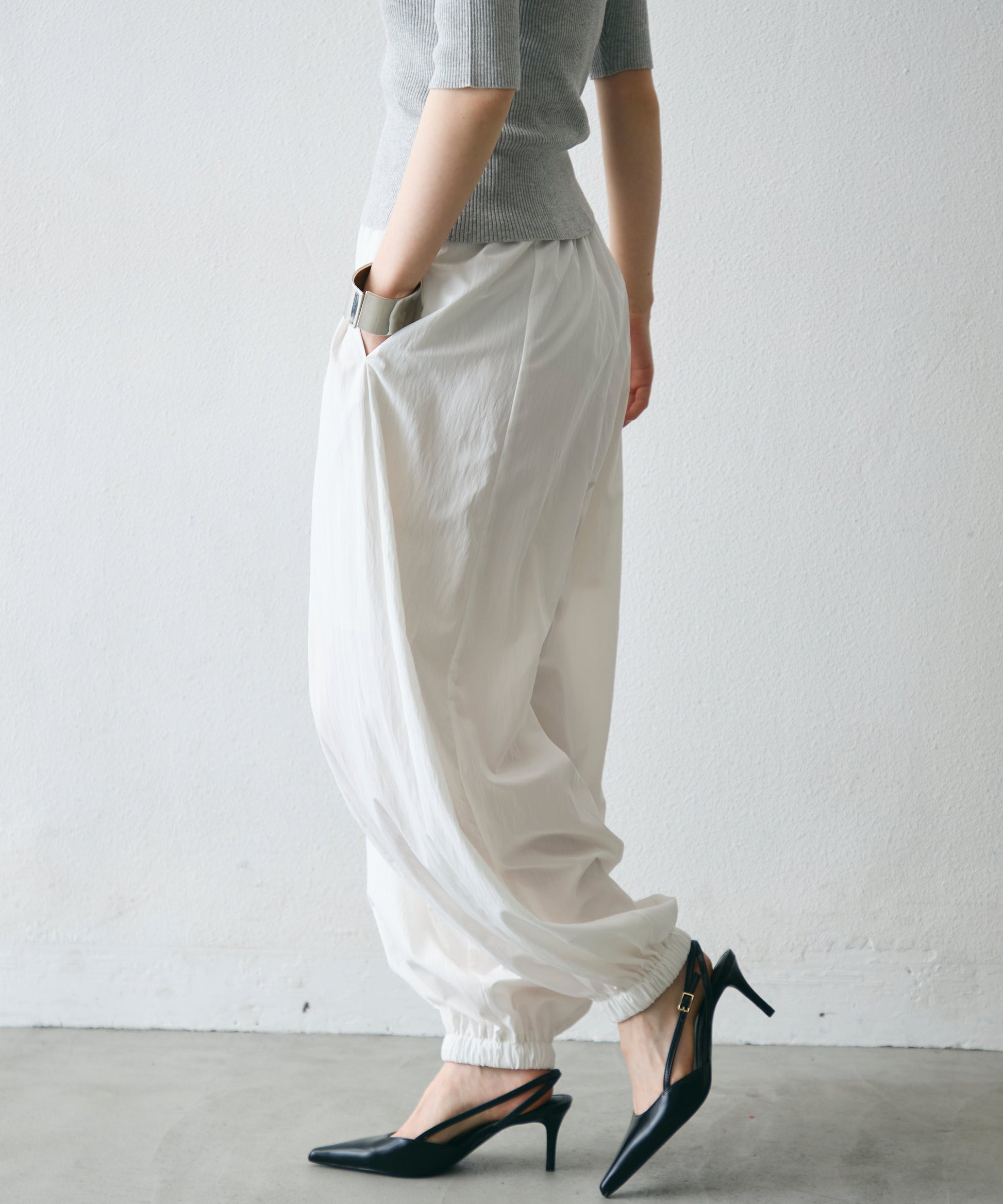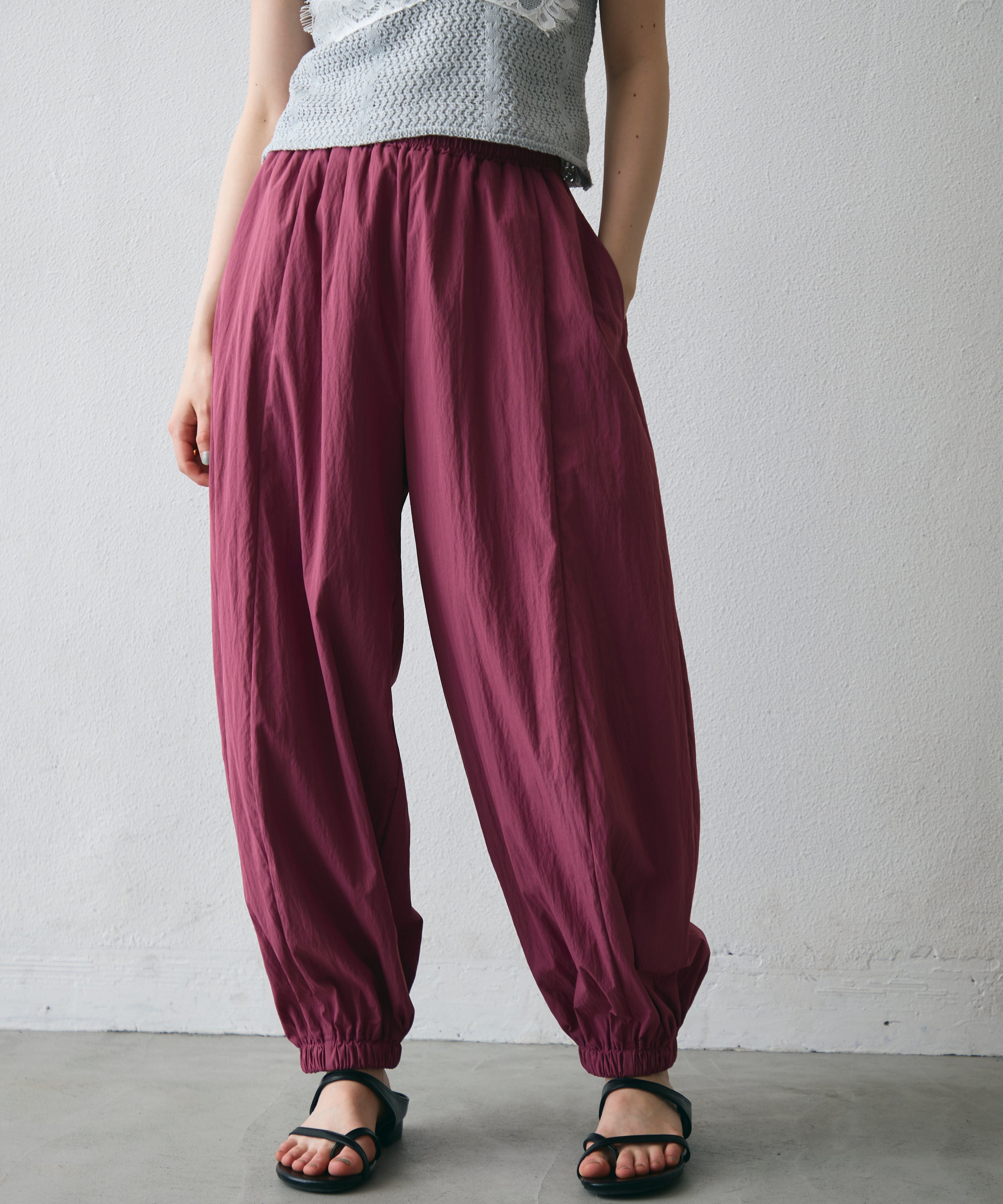 ワッシャー加工の表情感と、バルーンシルエットの落ち感が上品に映えるロングパンツ。軽やかな素材が動くたびに揺れ、1枚で洗練されたスタイルが完成。シンプルなトップスと合わせるだけで大人のきれいめコーデに。