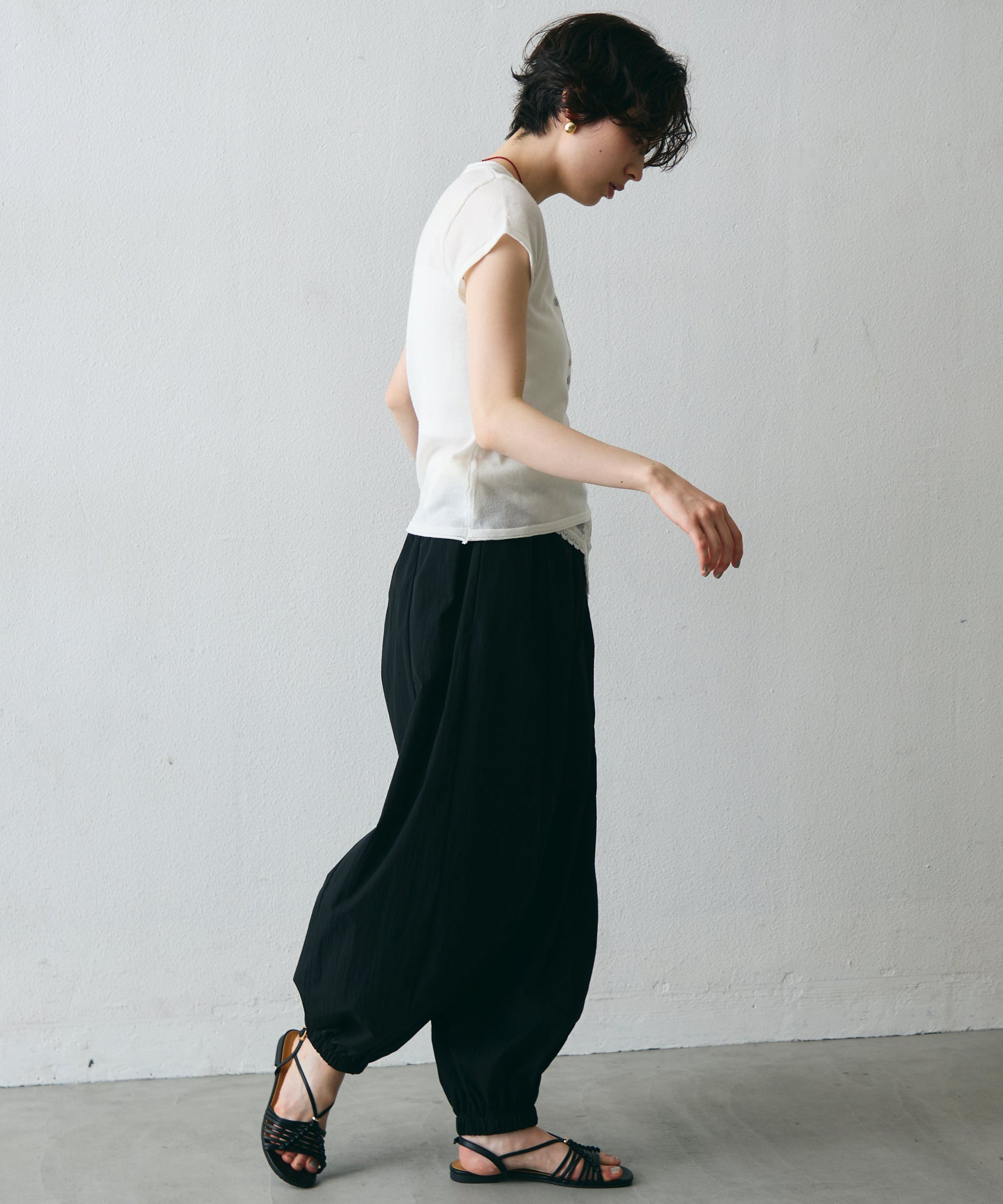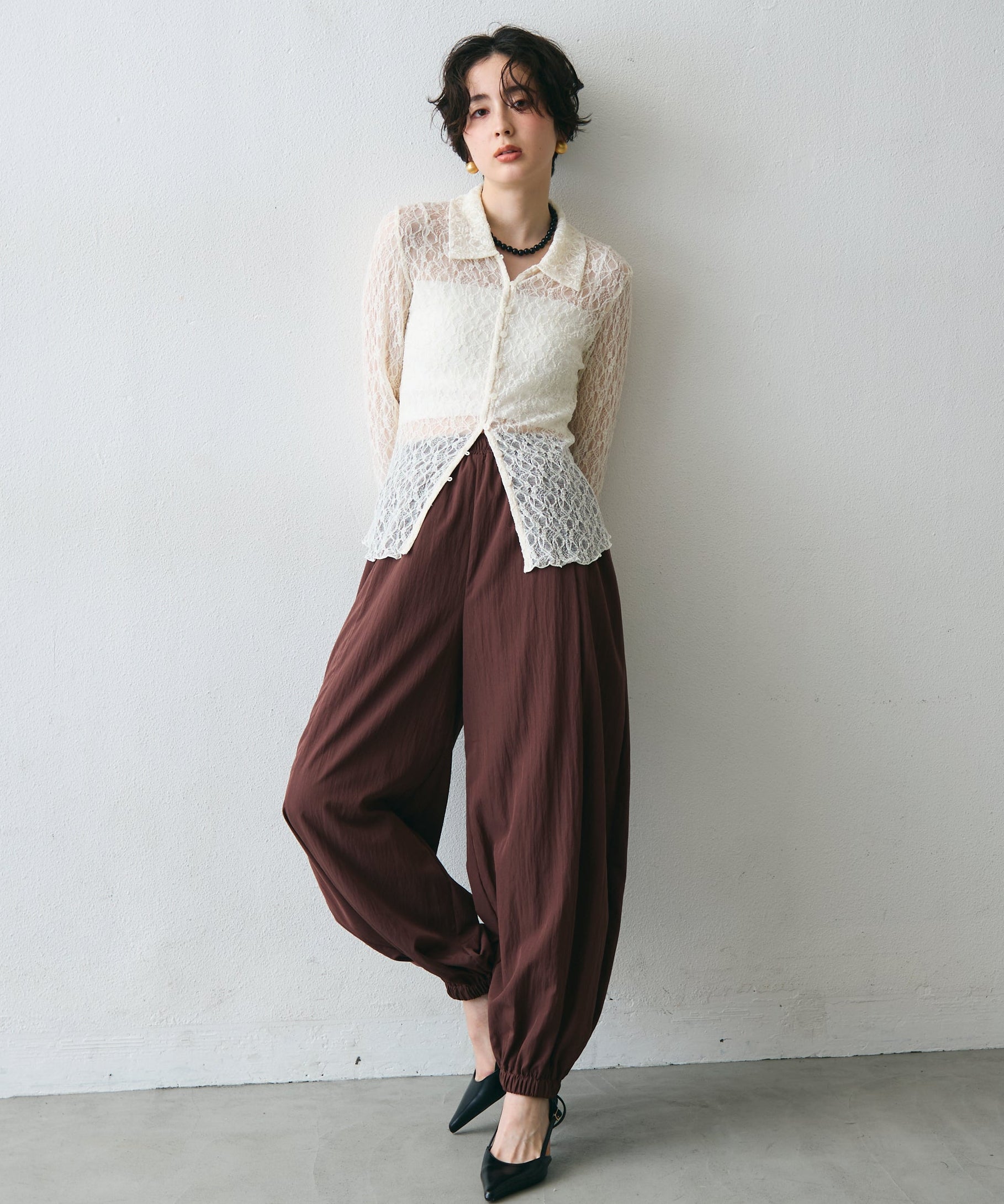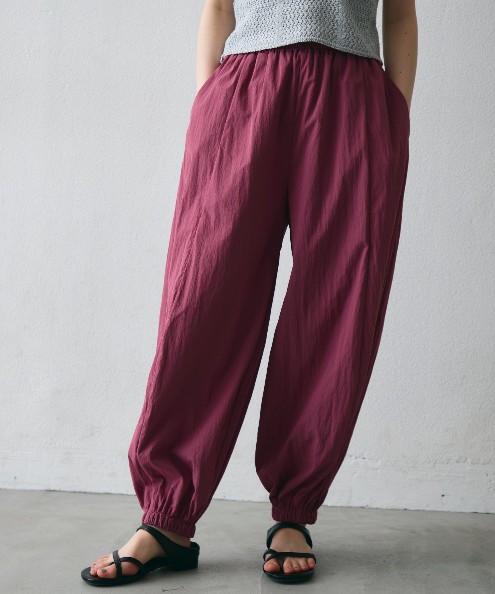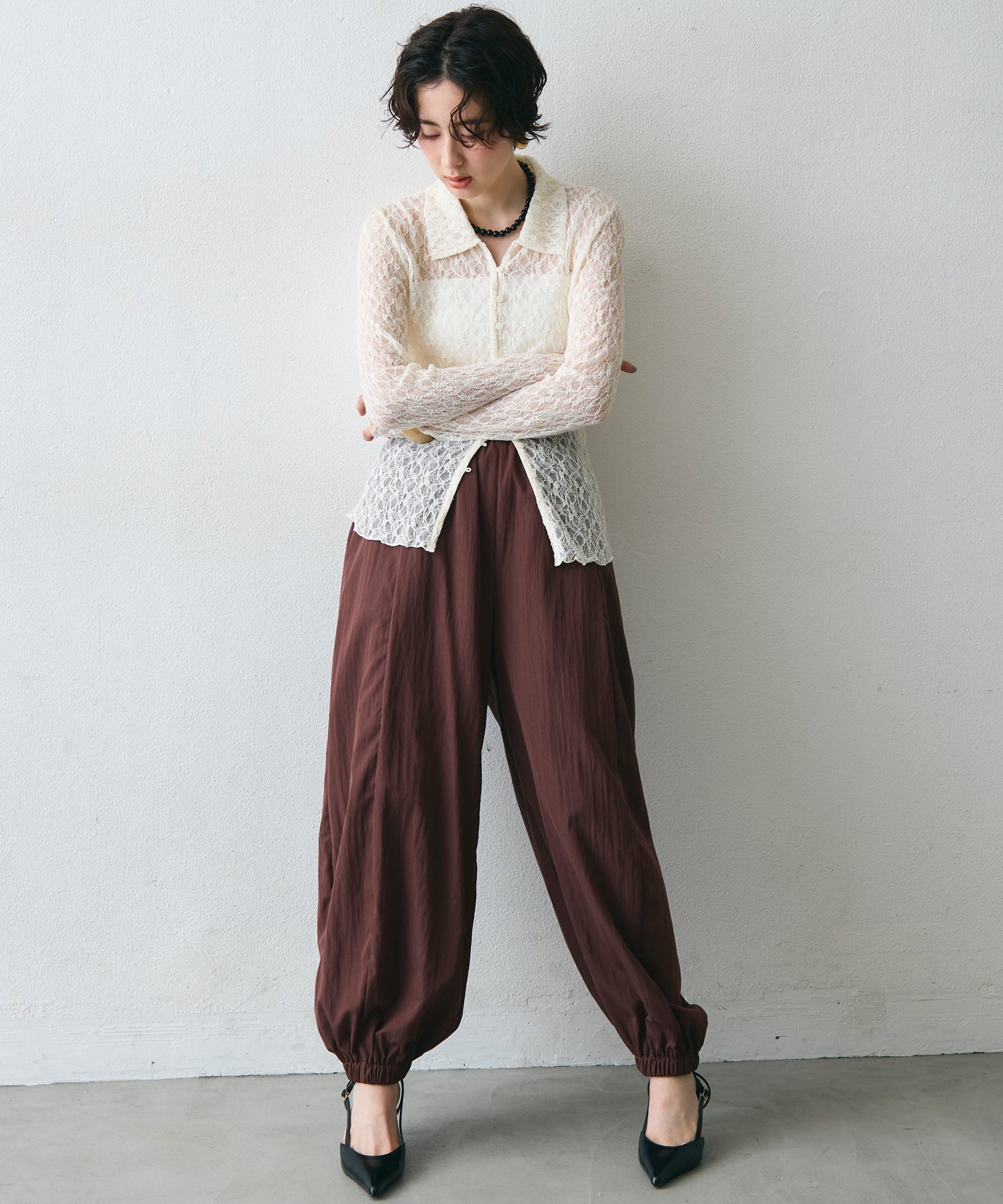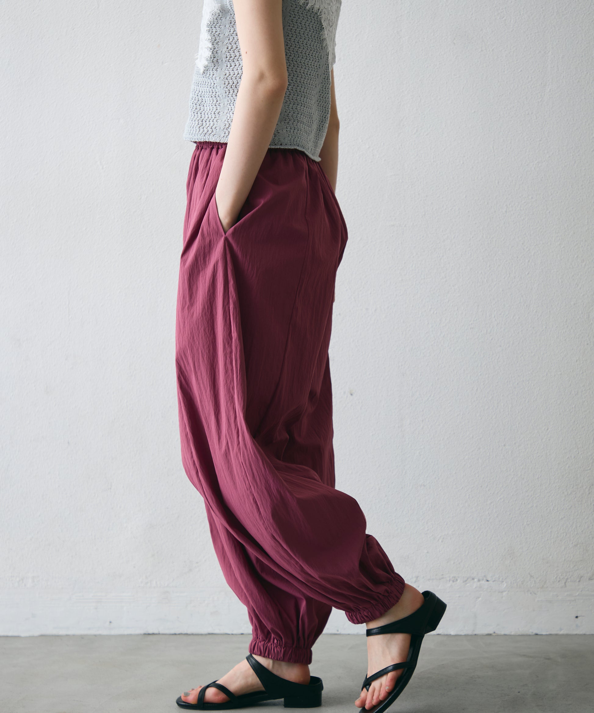 ワッシャー加工の表情感と、バルーンシルエットの落ち感が上品に映えるロングパンツ。軽やかな素材が動くたびに揺れ、1枚で洗練されたスタイルが完成。シンプルなトップスと合わせるだけで大人のきれいめコーデに。