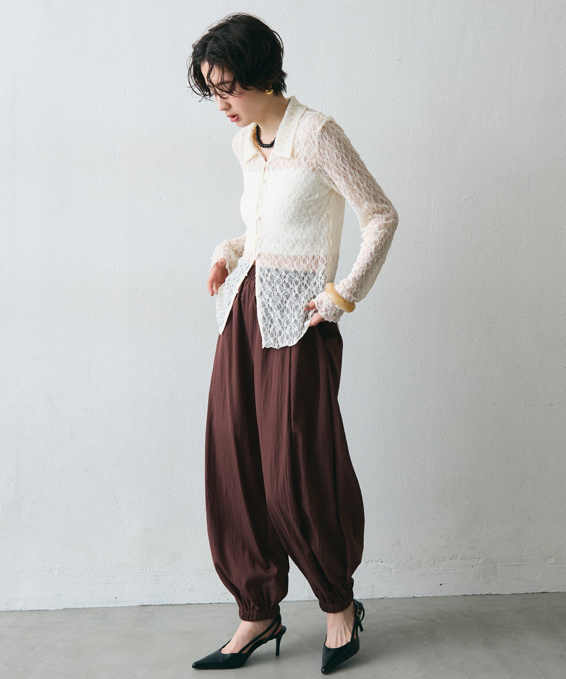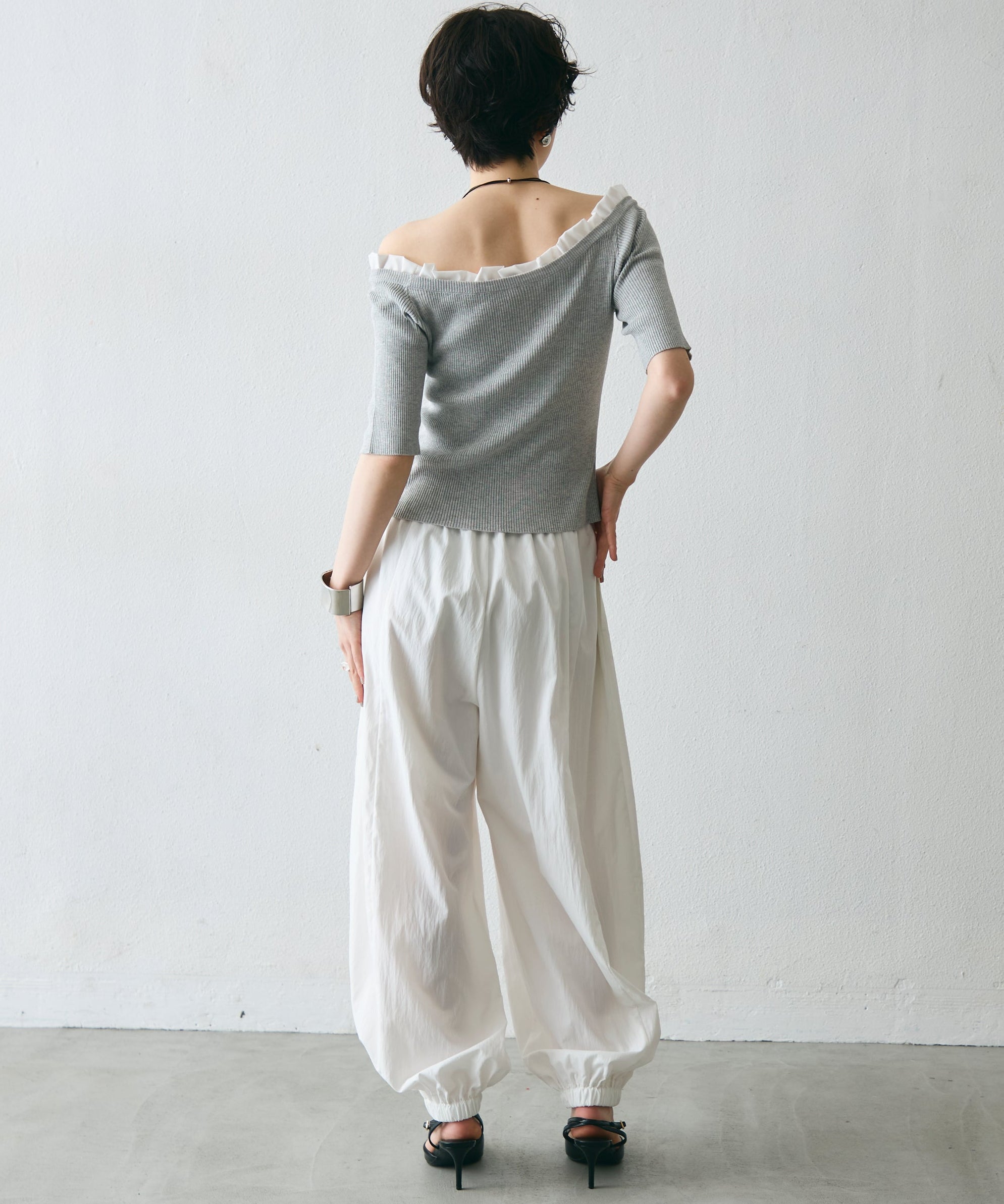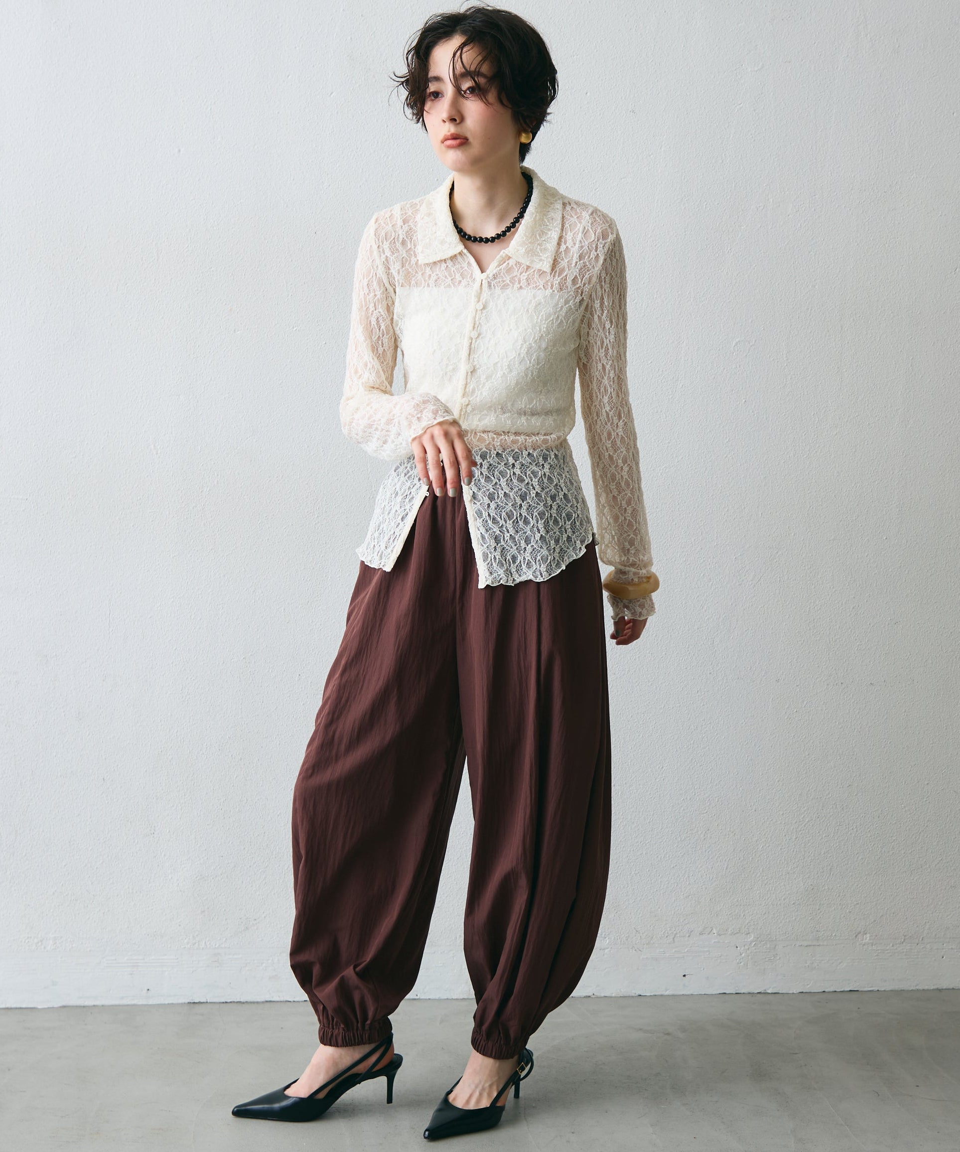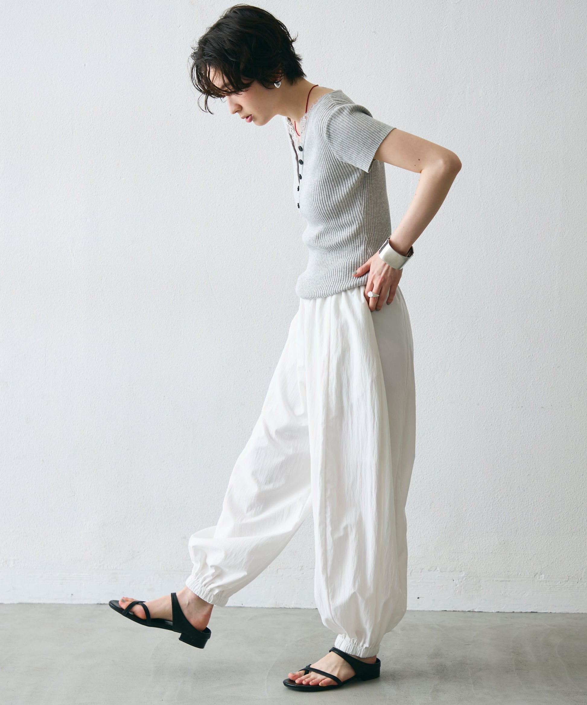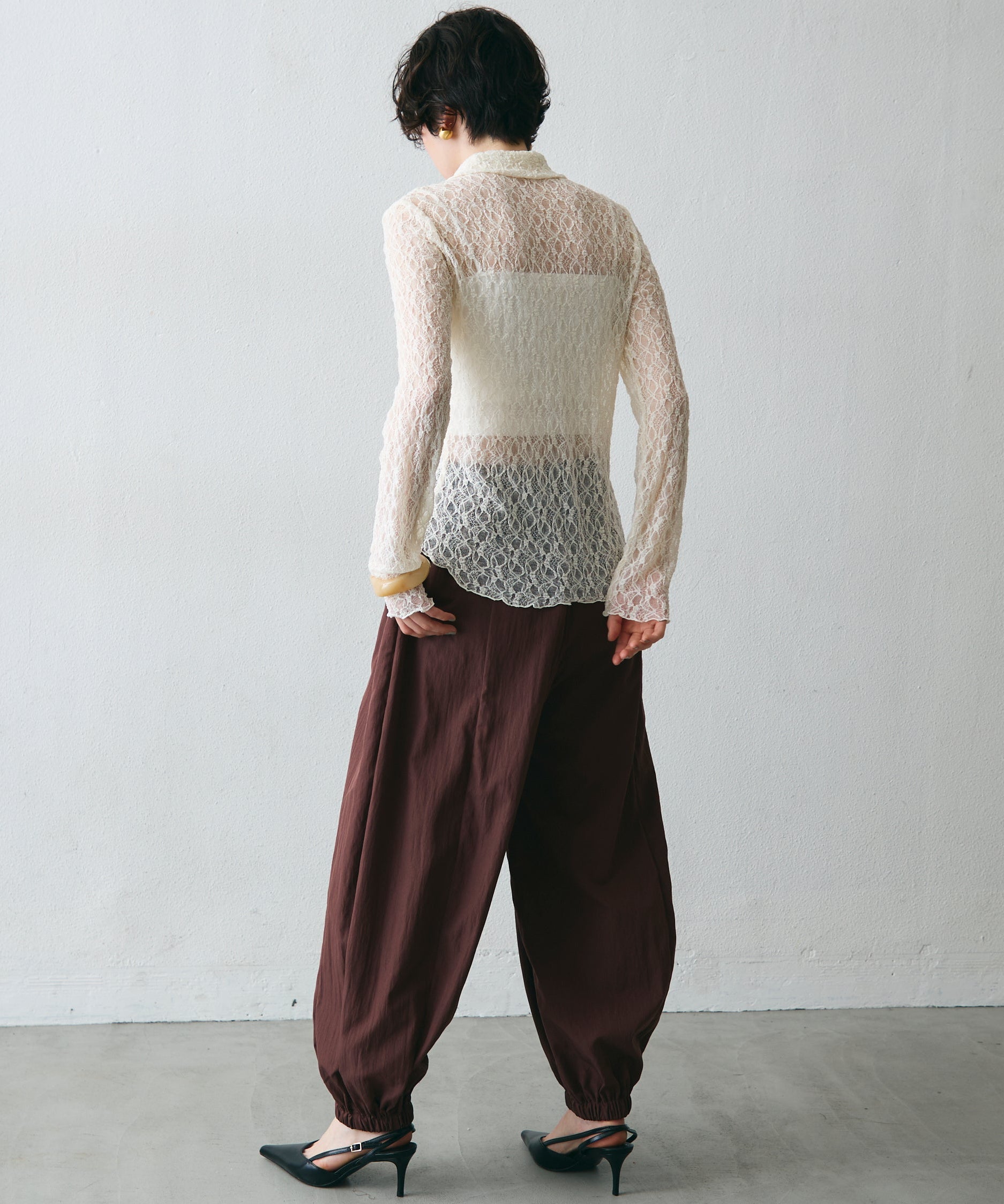 ワッシャー加工の表情感と、バルーンシルエットの落ち感が上品に映えるロングパンツ。軽やかな素材が動くたびに揺れ、1枚で洗練されたスタイルが完成。シンプルなトップスと合わせるだけで大人のきれいめコーデに。
