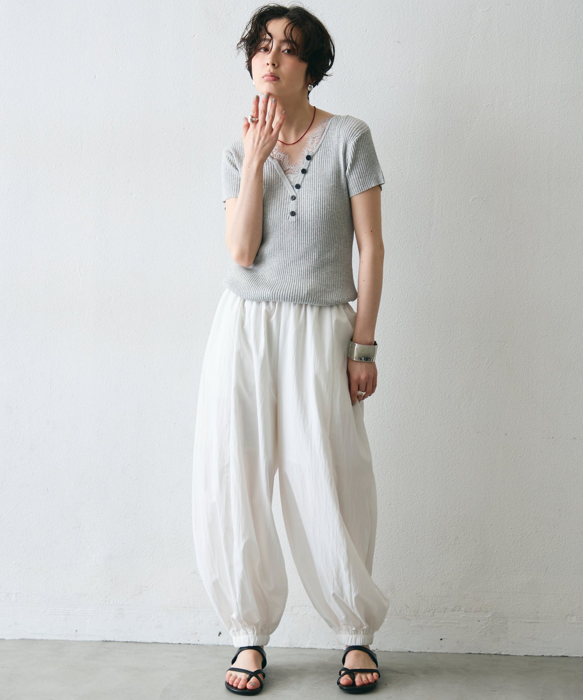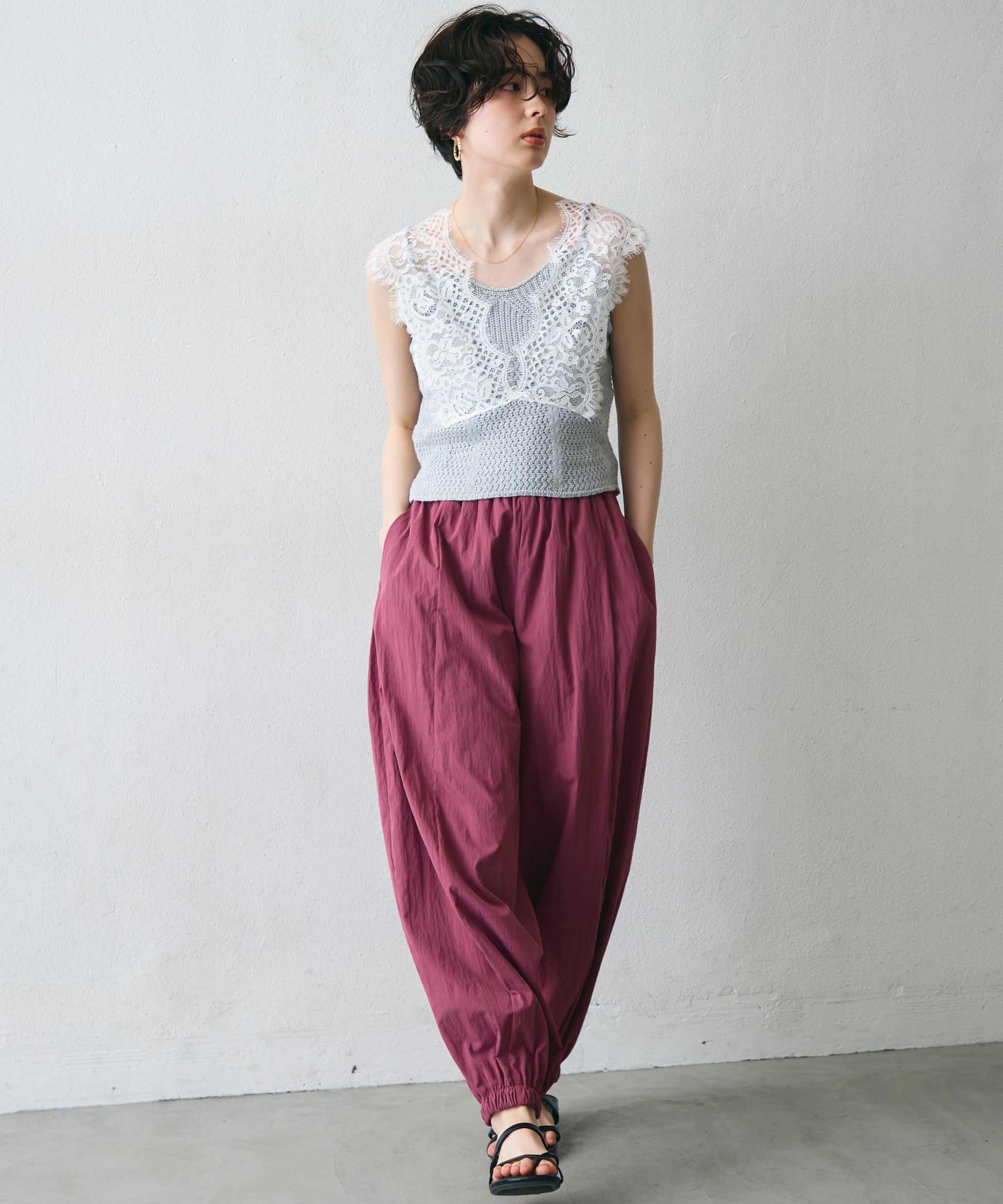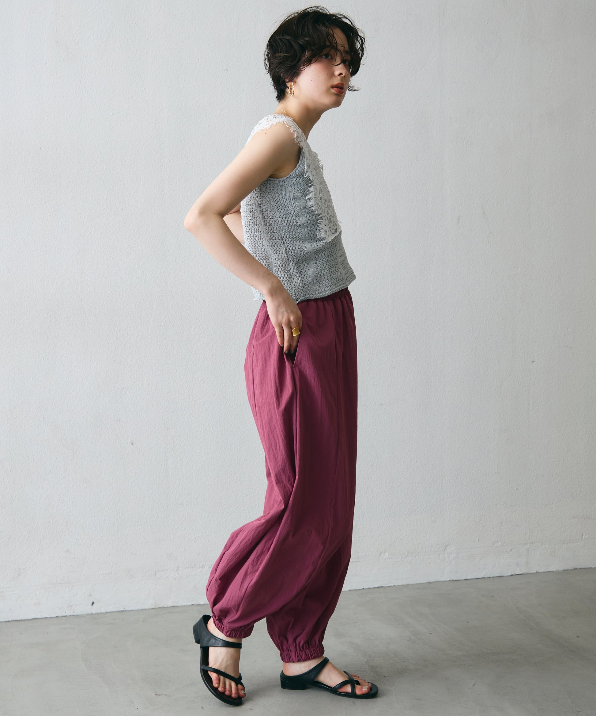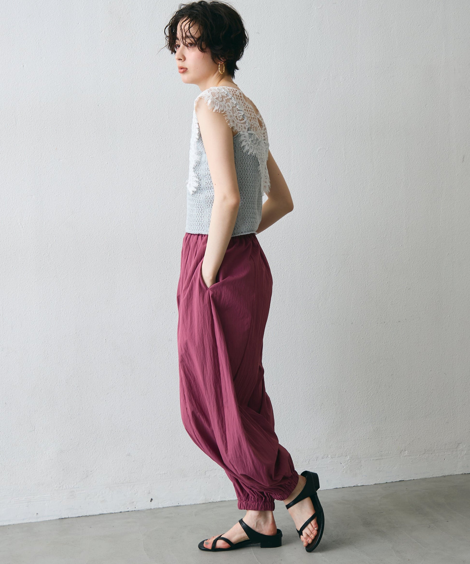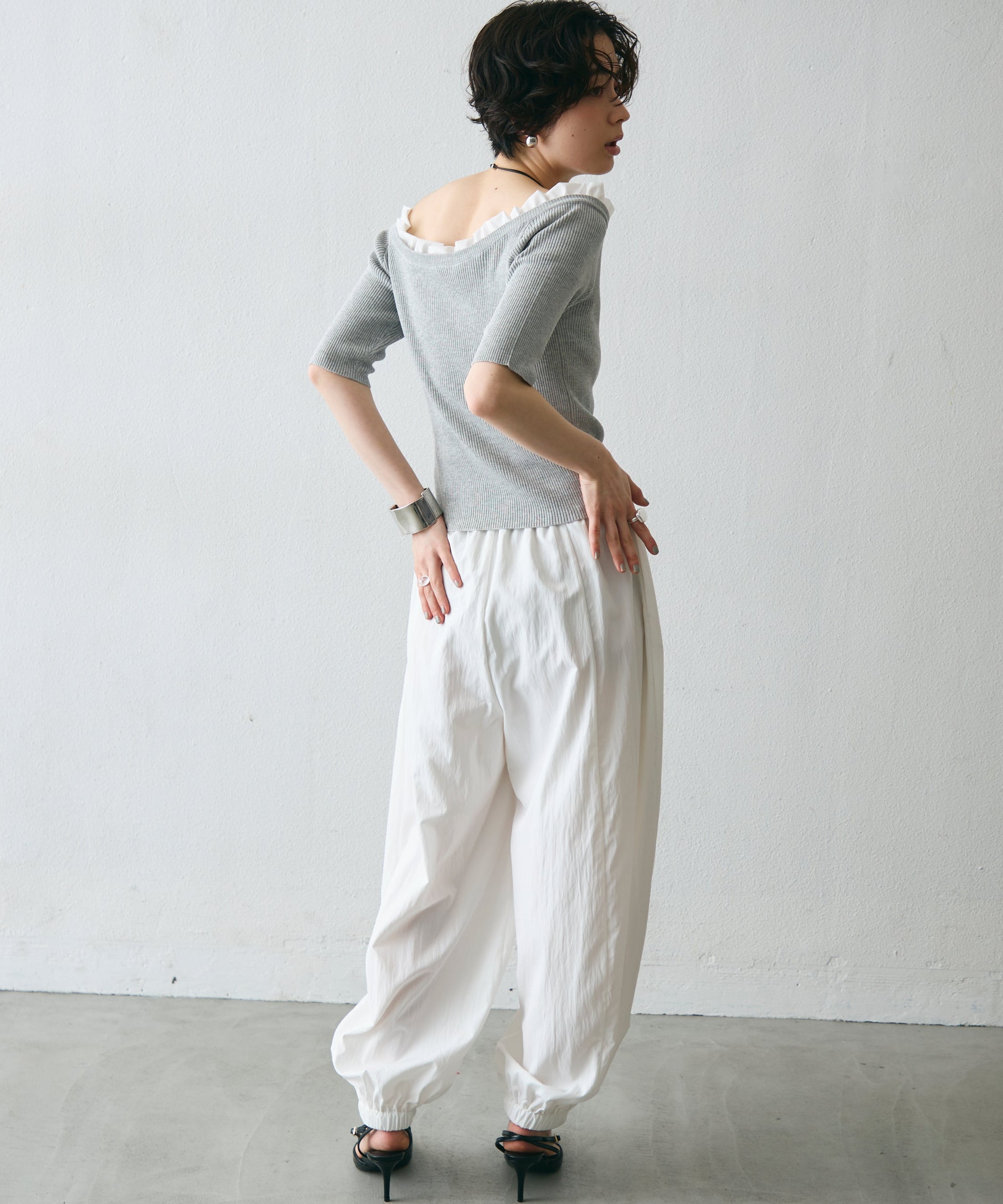 ワッシャー加工の表情感と、バルーンシルエットの落ち感が上品に映えるロングパンツ。軽やかな素材が動くたびに揺れ、1枚で洗練されたスタイルが完成。シンプルなトップスと合わせるだけで大人のきれいめコーデに。
