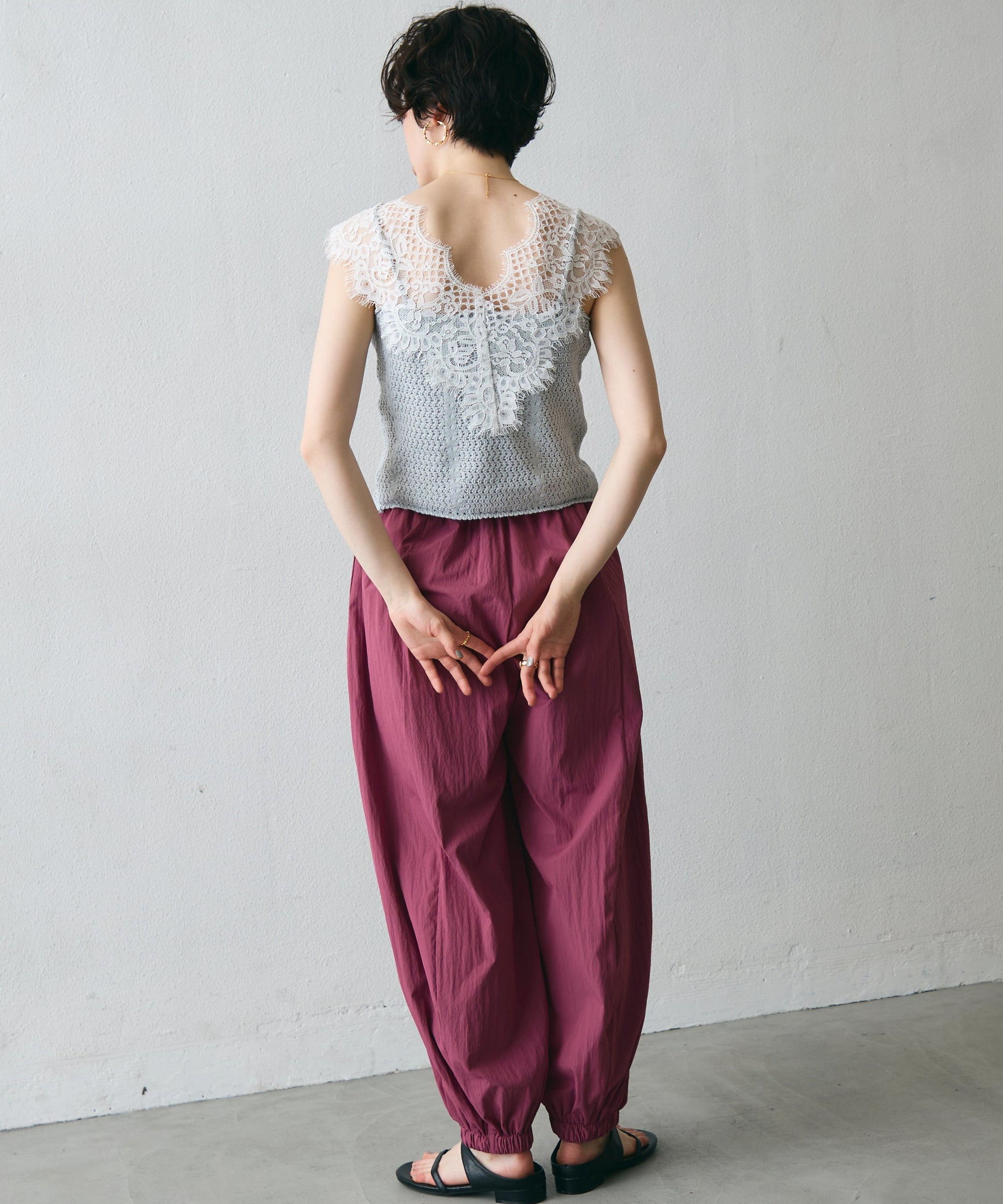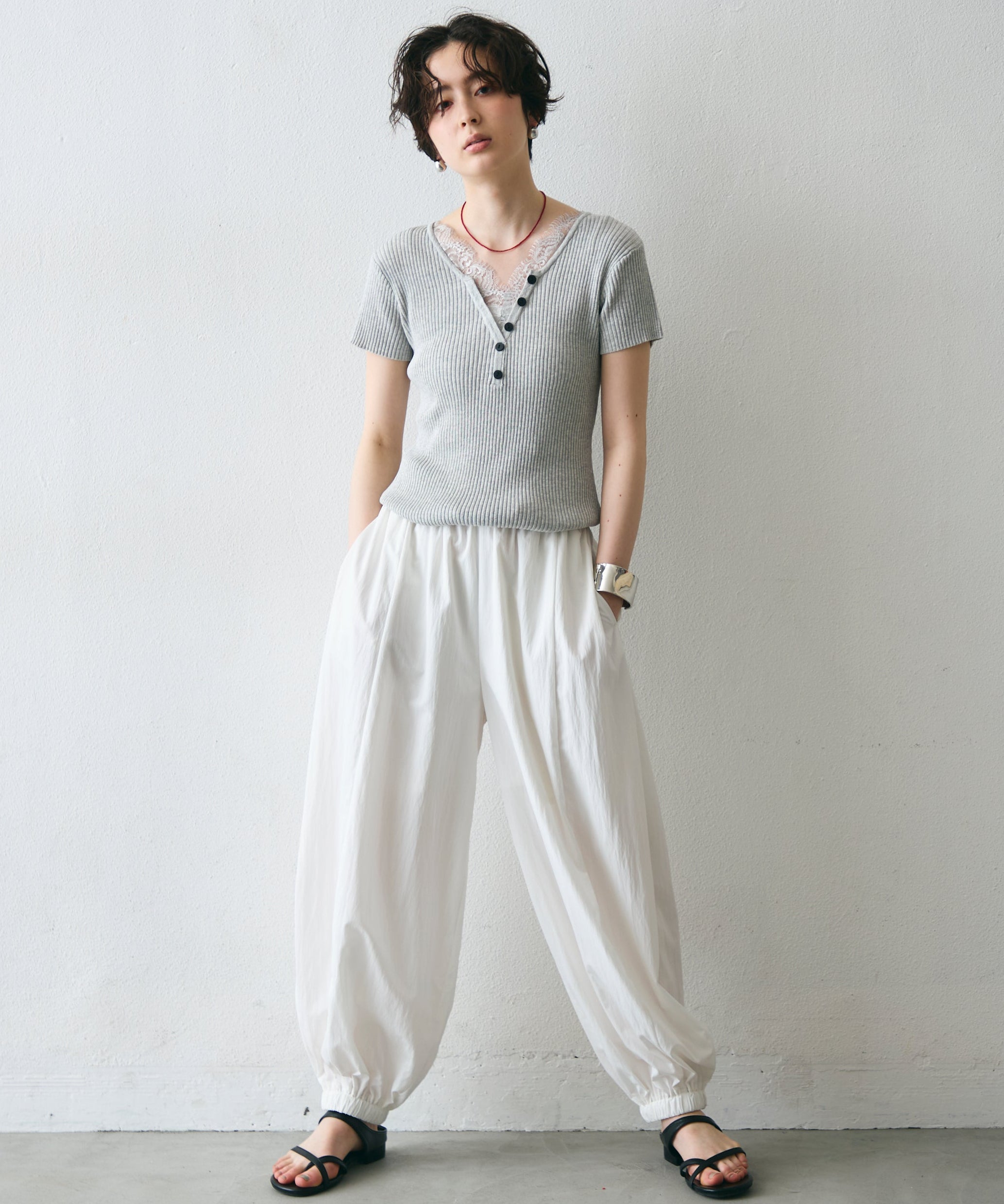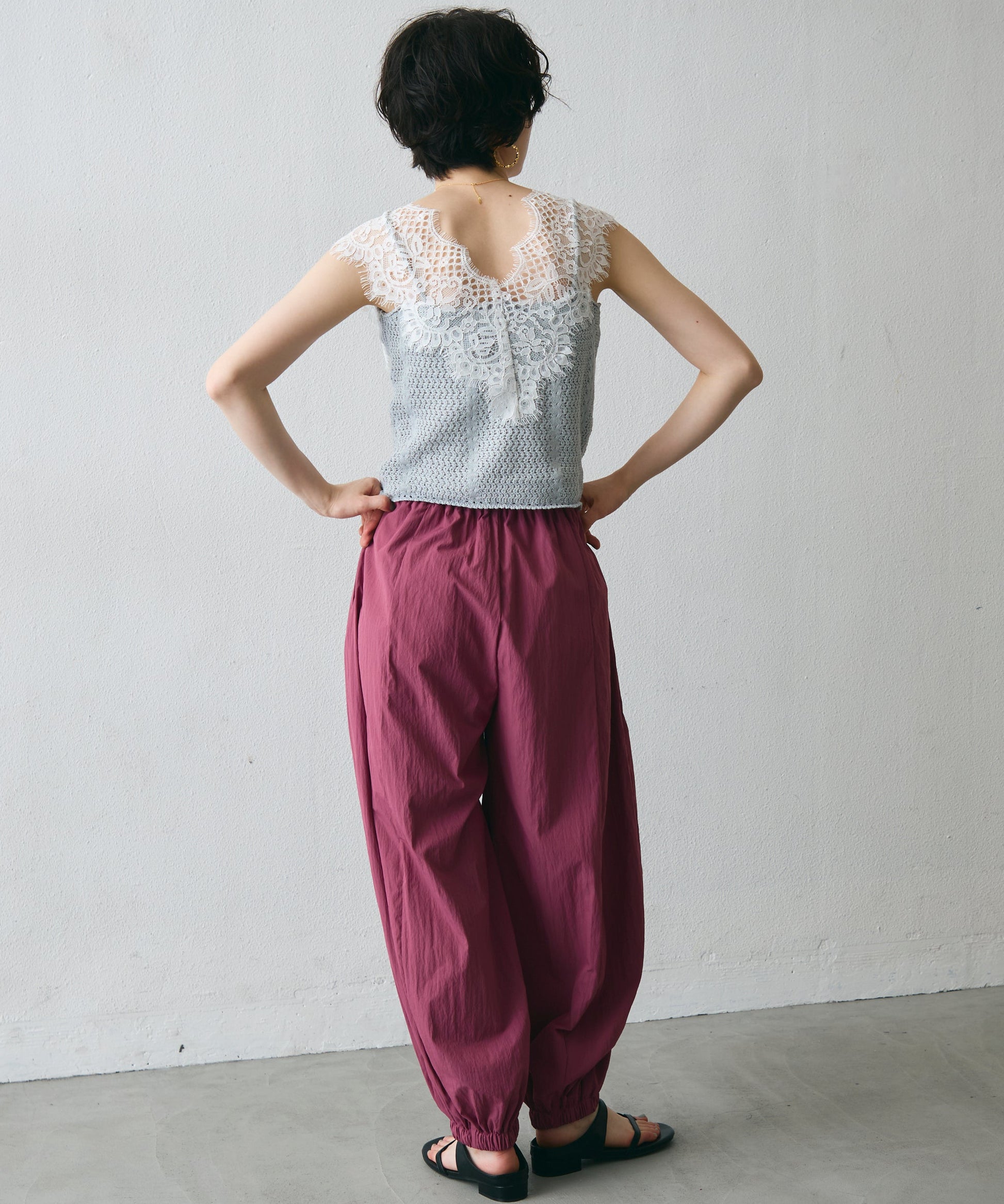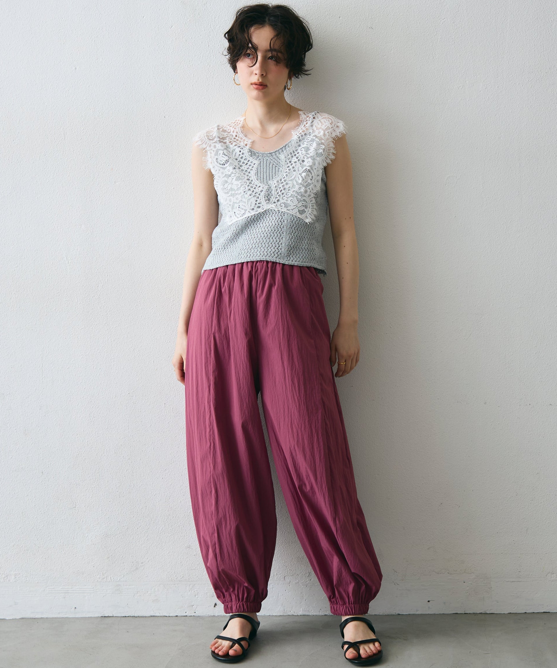 ワッシャー加工の表情感と、バルーンシルエットの落ち感が上品に映えるロングパンツ。軽やかな素材が動くたびに揺れ、1枚で洗練されたスタイルが完成。シンプルなトップスと合わせるだけで大人のきれいめコーデに。