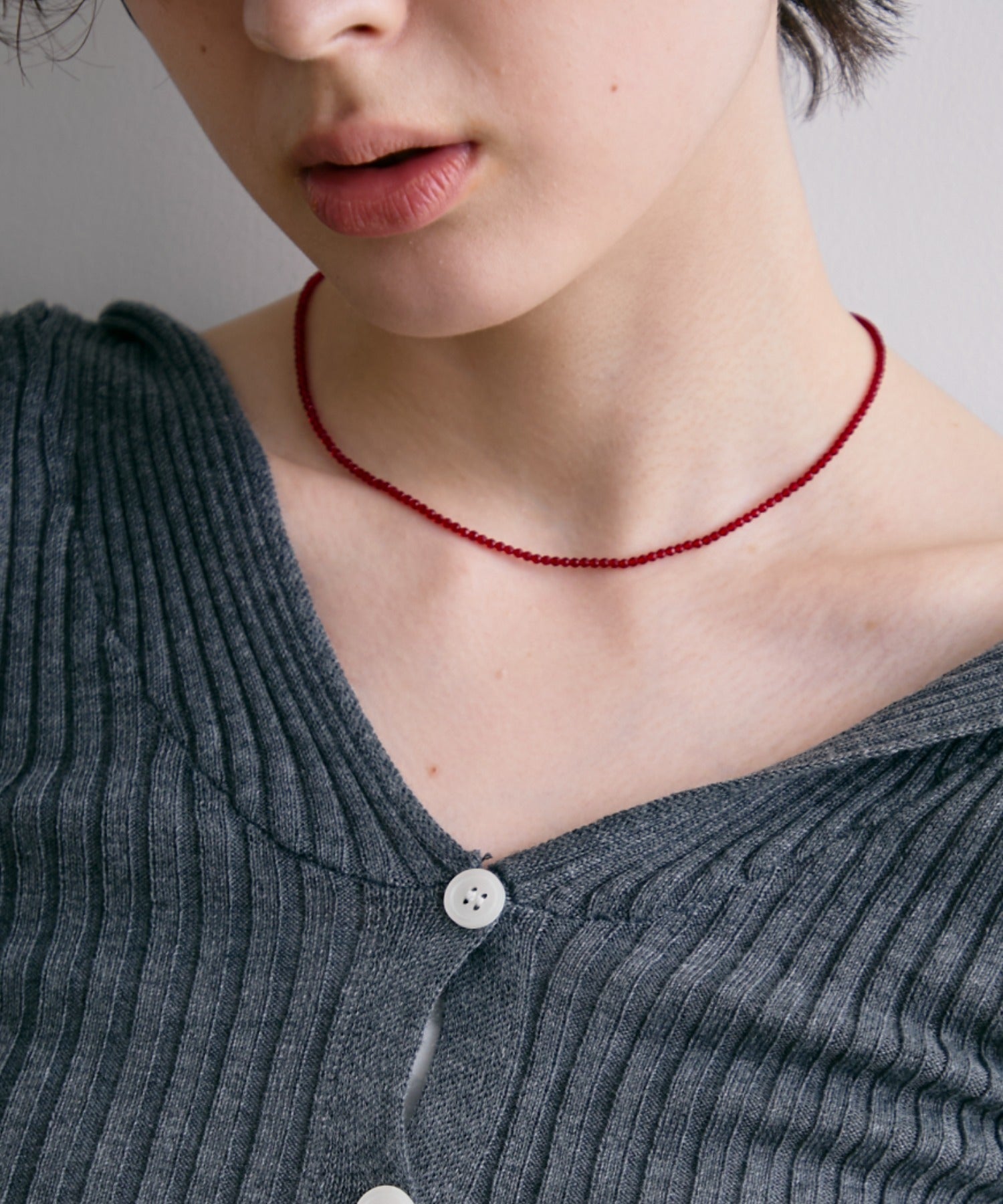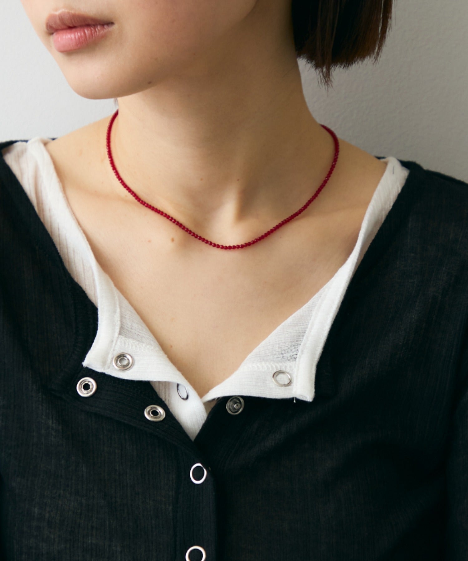 光を受けてきらめくビーズが、首元を華やかに彩るネックレス。