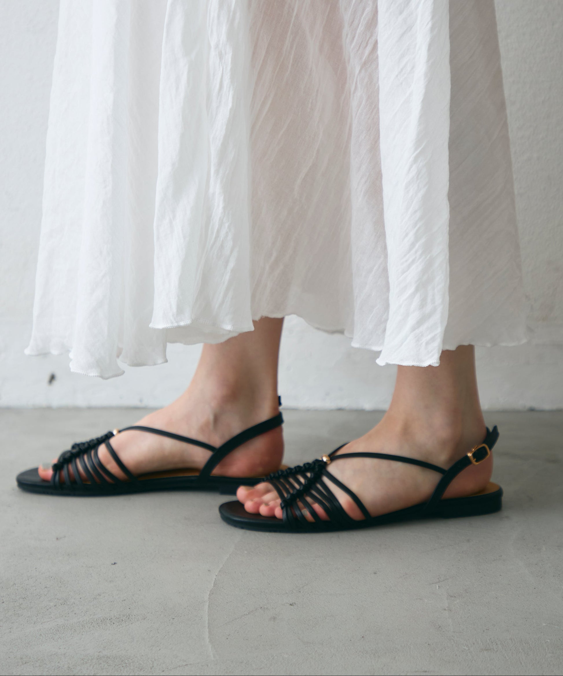足元をすっきり見せる細めストラップと、柔らかくフィットするアッパーで、長時間歩いても疲れにくい一足です。