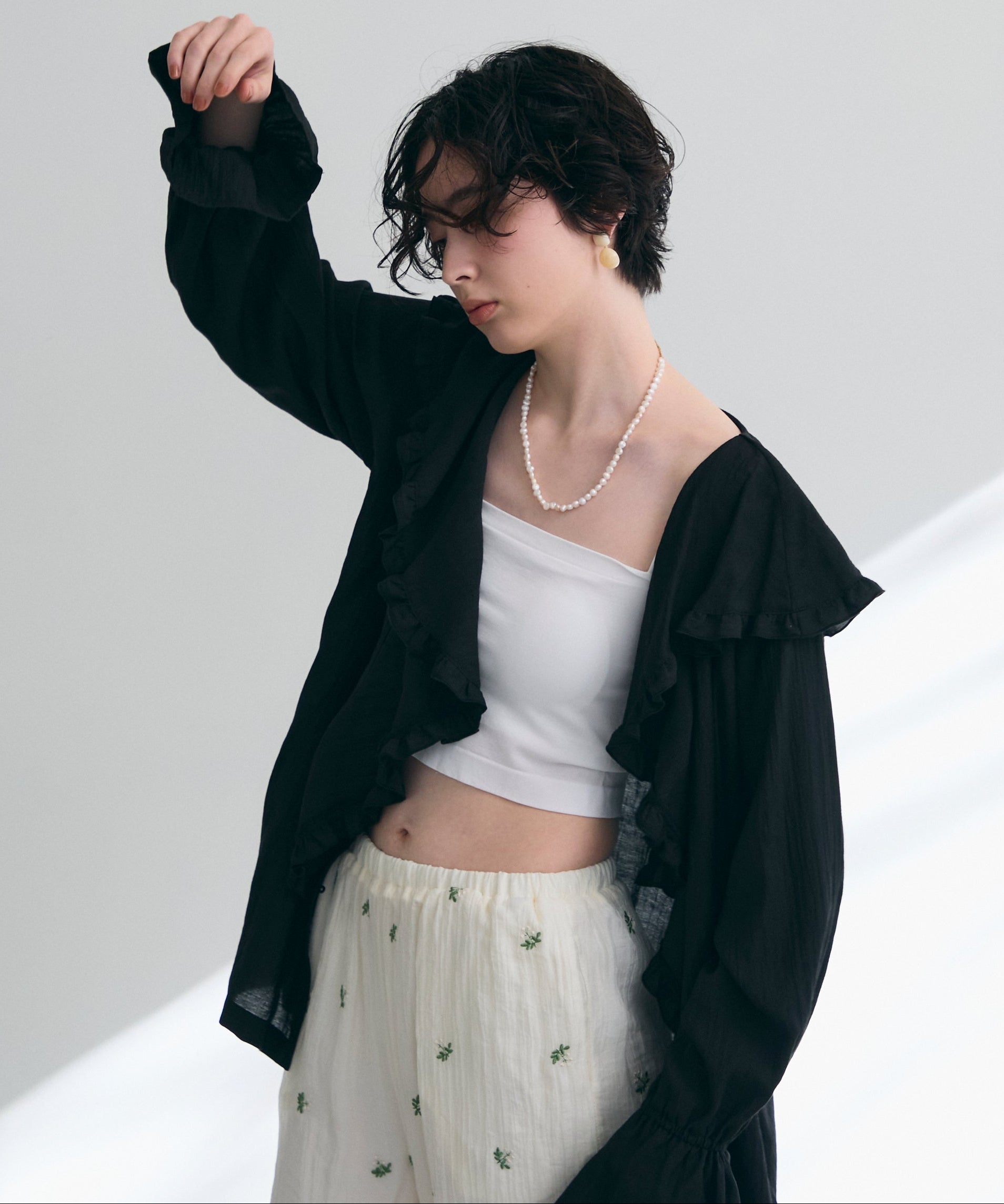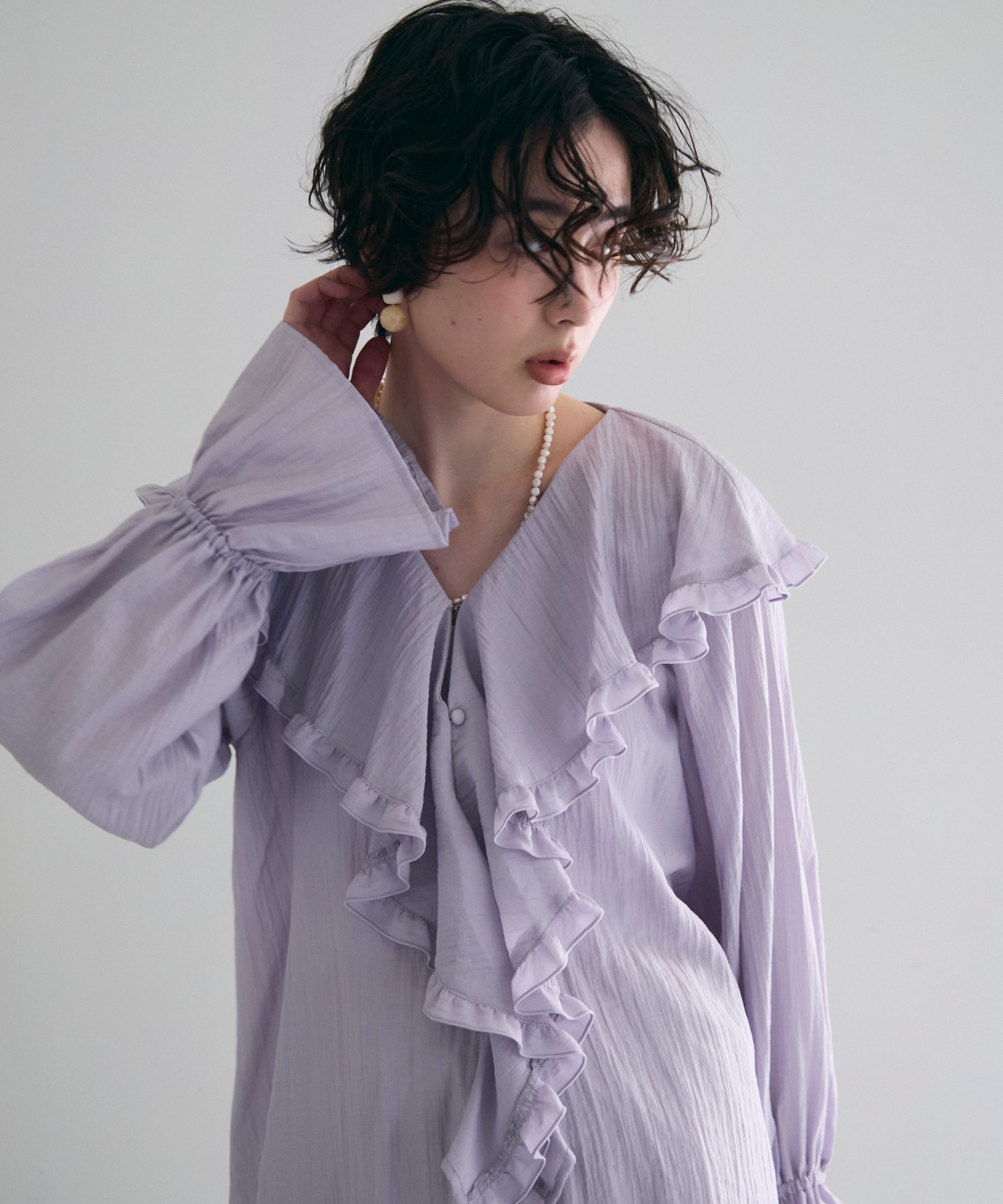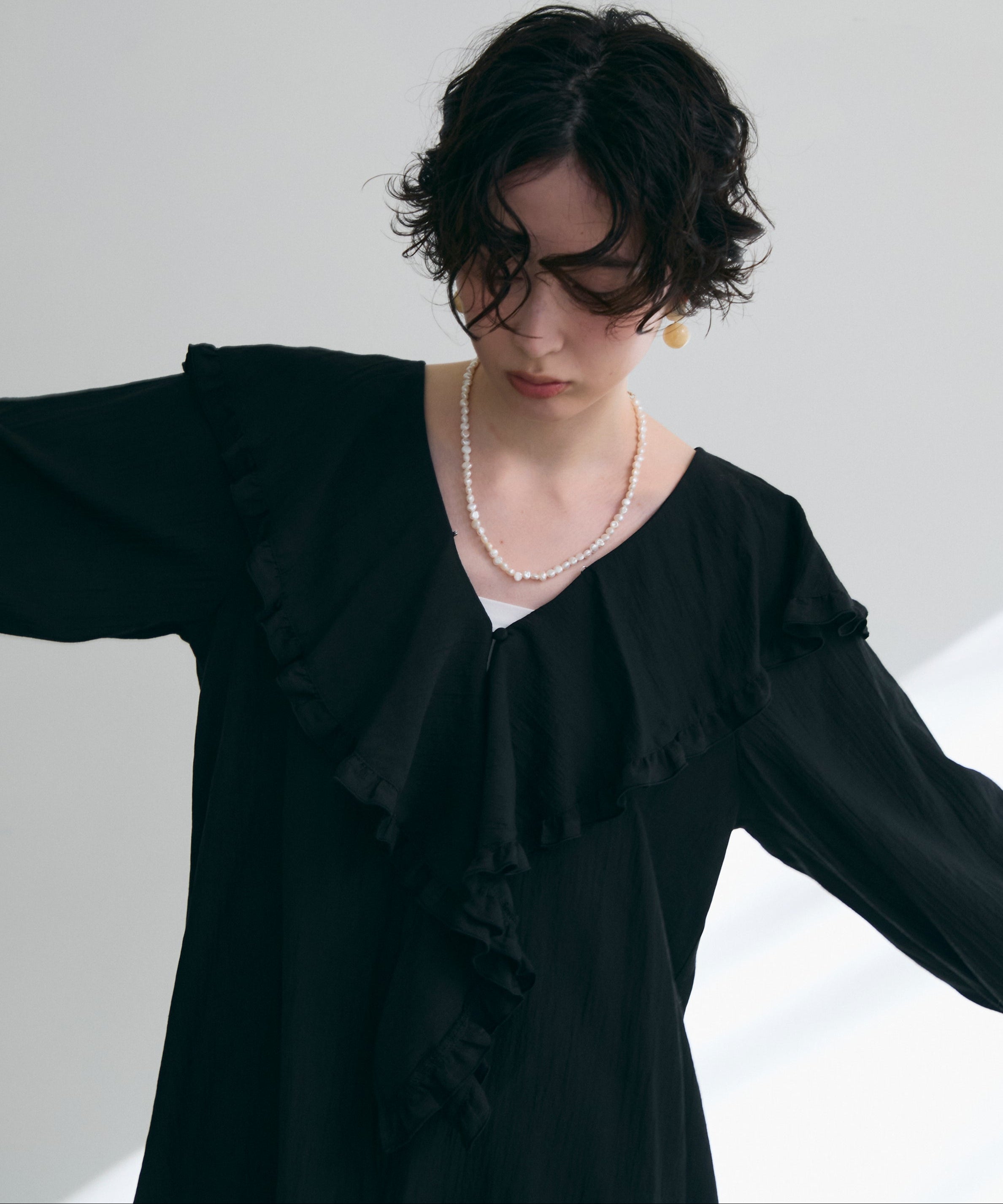 フロントから襟元にかけて流れるように施されたフリルが、女性らしい柔らかさと立体感を演出します。