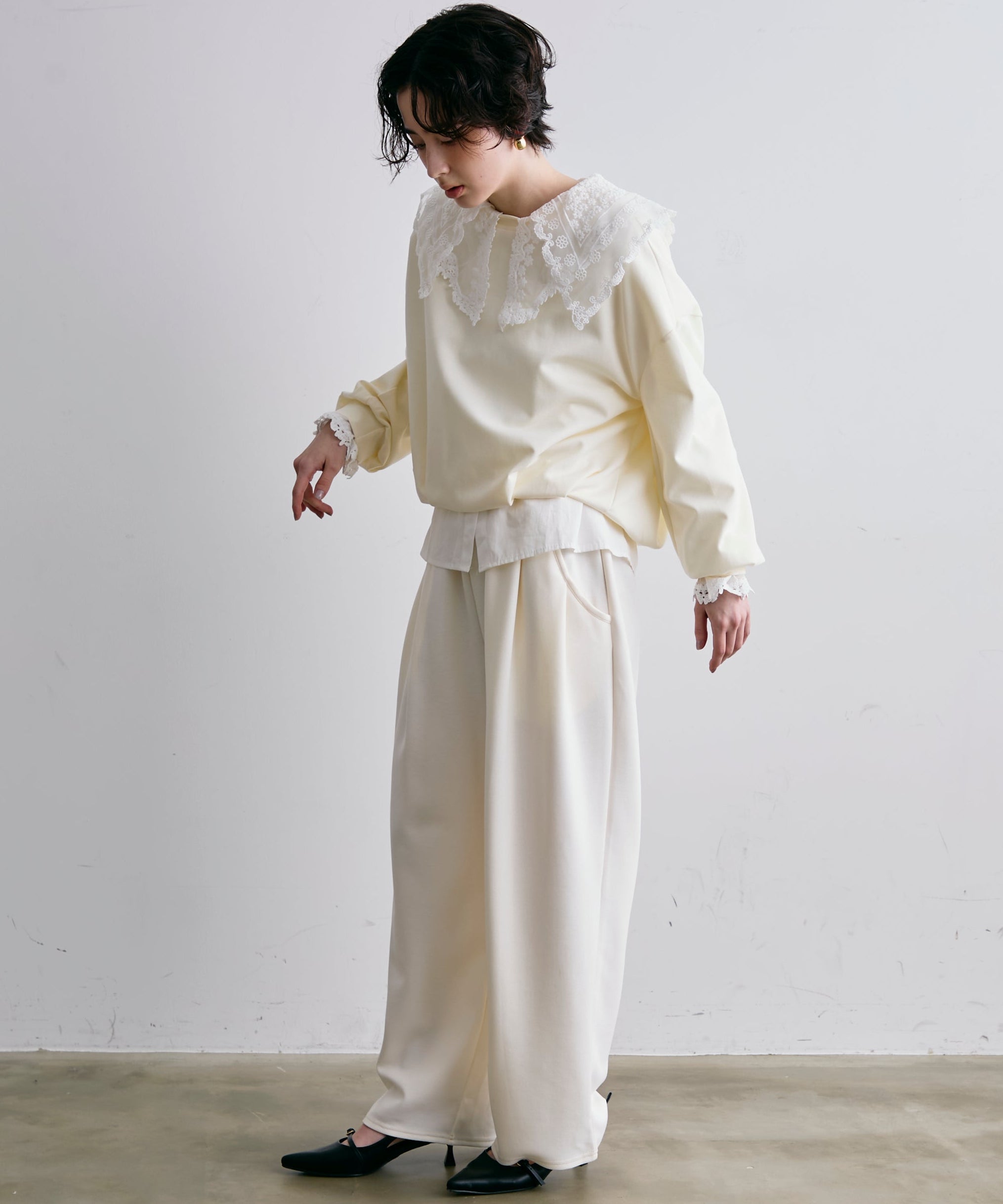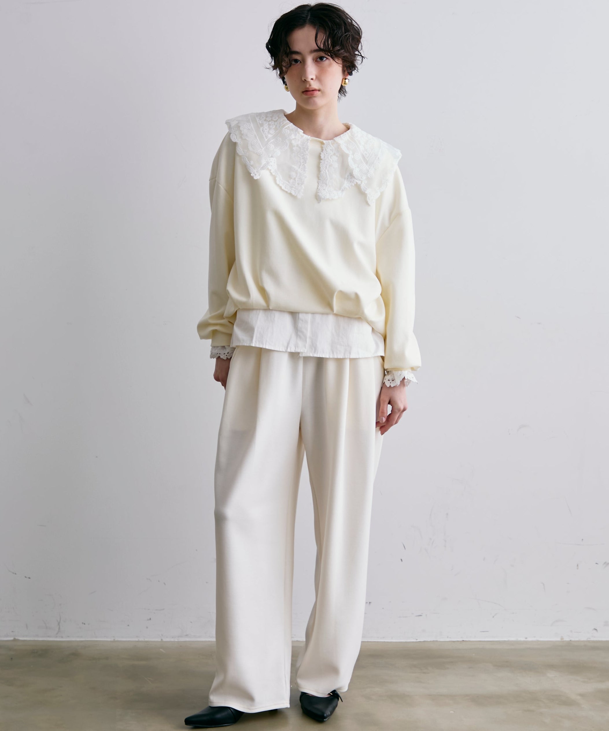 顔まわりを華やかに演出するデザインで、シンプルなボトムスと合わせるだけでコーディネートが完成します。